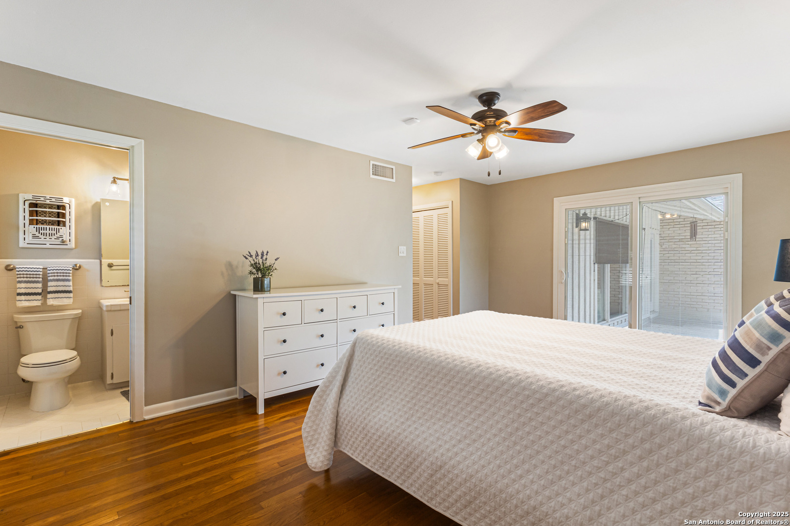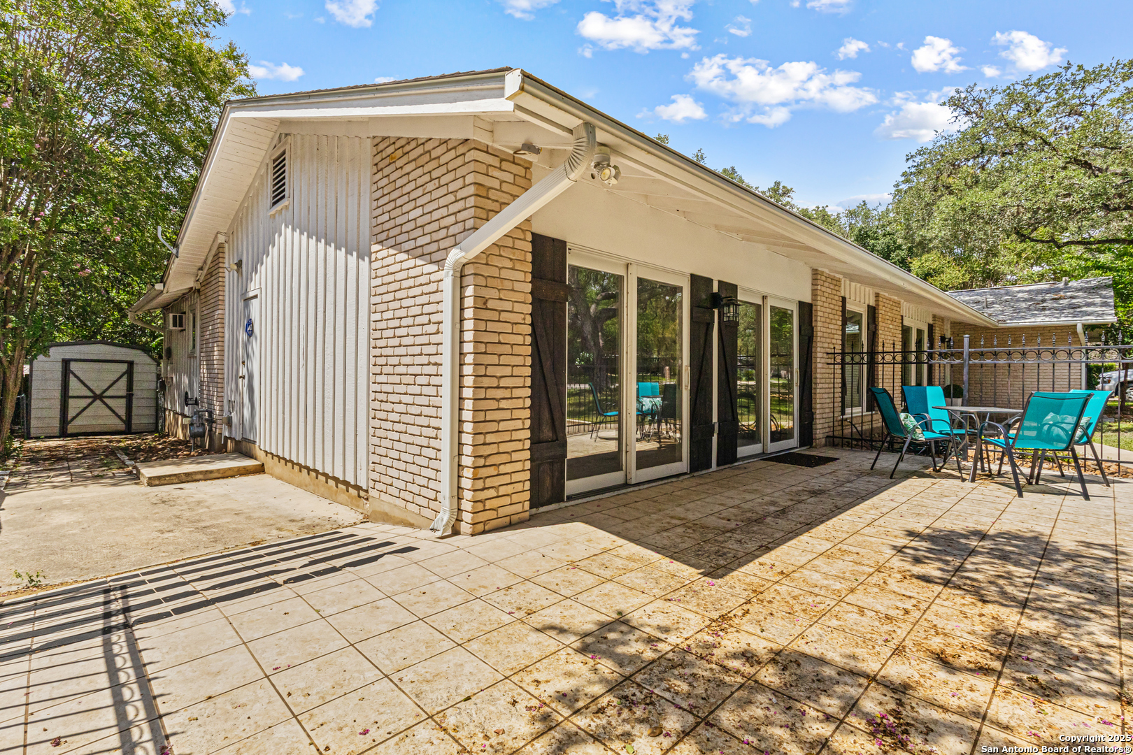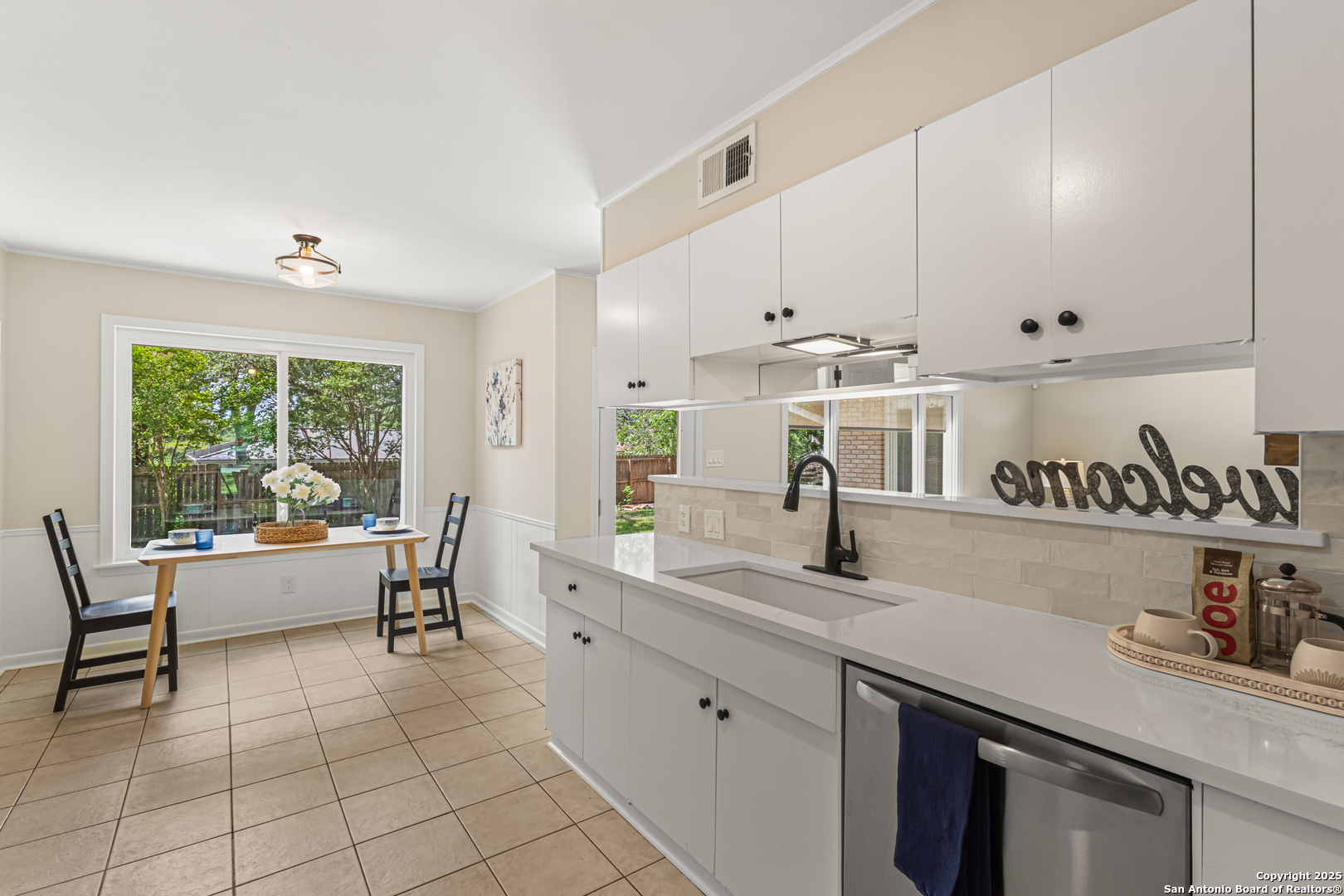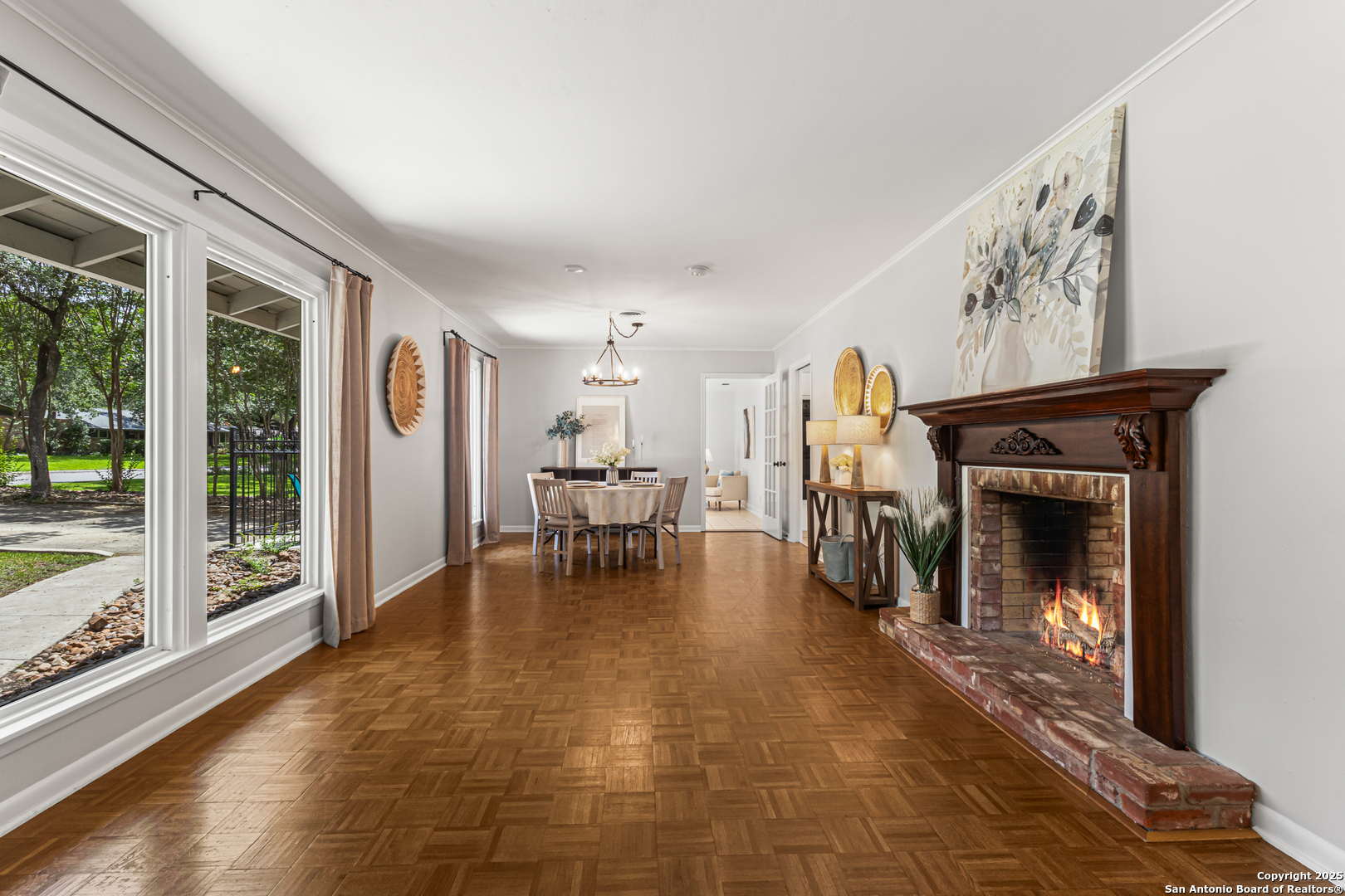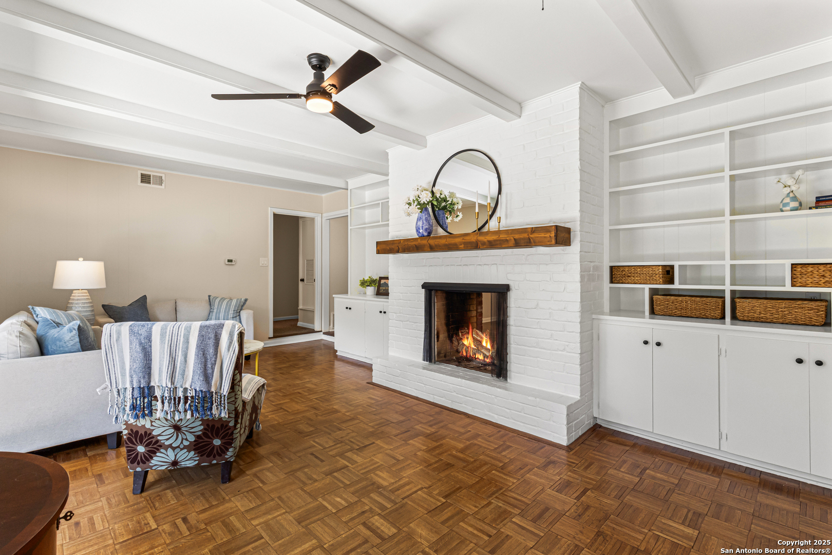 This Midcentury Modern 1-story home with Pella windows throughout offers serene views and natural light. The thoughtfully designed residence features clean architectural lines, a dual-sided wood-burning fireplace, and two patios perfect for outdoor relaxation or entertaining. Freshly painted interior and double-pane windows add to the comfort and energy efficiency. The home includes three flexible living areas, including a large bonus room ideal as a game room, media space, office, or home gym. The updated kitchen boasts quartz countertops, subway tile backsplash, stainless steel vent hood, dishwasher, and gas cooktop. Layout offers privacy with 3 bedrooms and 2 bathrooms on one side, and a separate guest suite with its own entrance and private bath-ideal for visitors, multigenerational living, or potential income use. Converted garage offers additional storage or workshop space. Conveniently located near Fort Sam Houston/SAMMC, Loop 410, and the airport. Discover comfort, style, and versatility in this well-maintained home!
