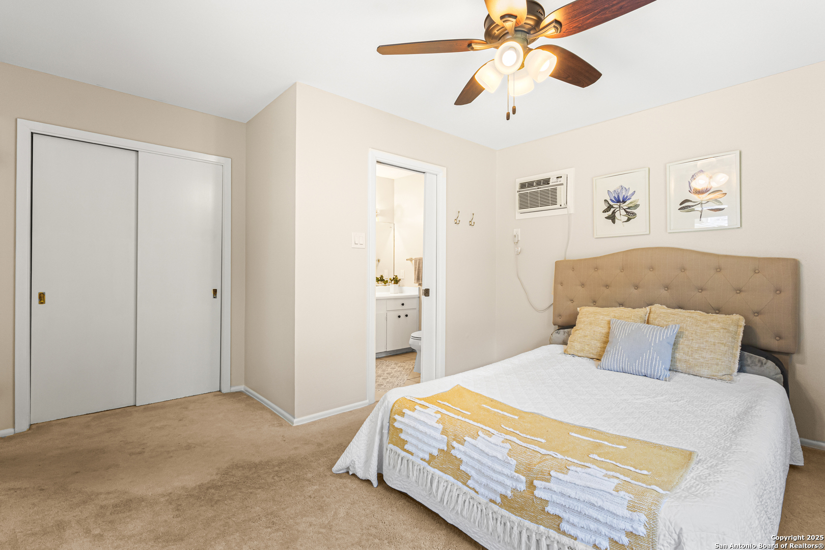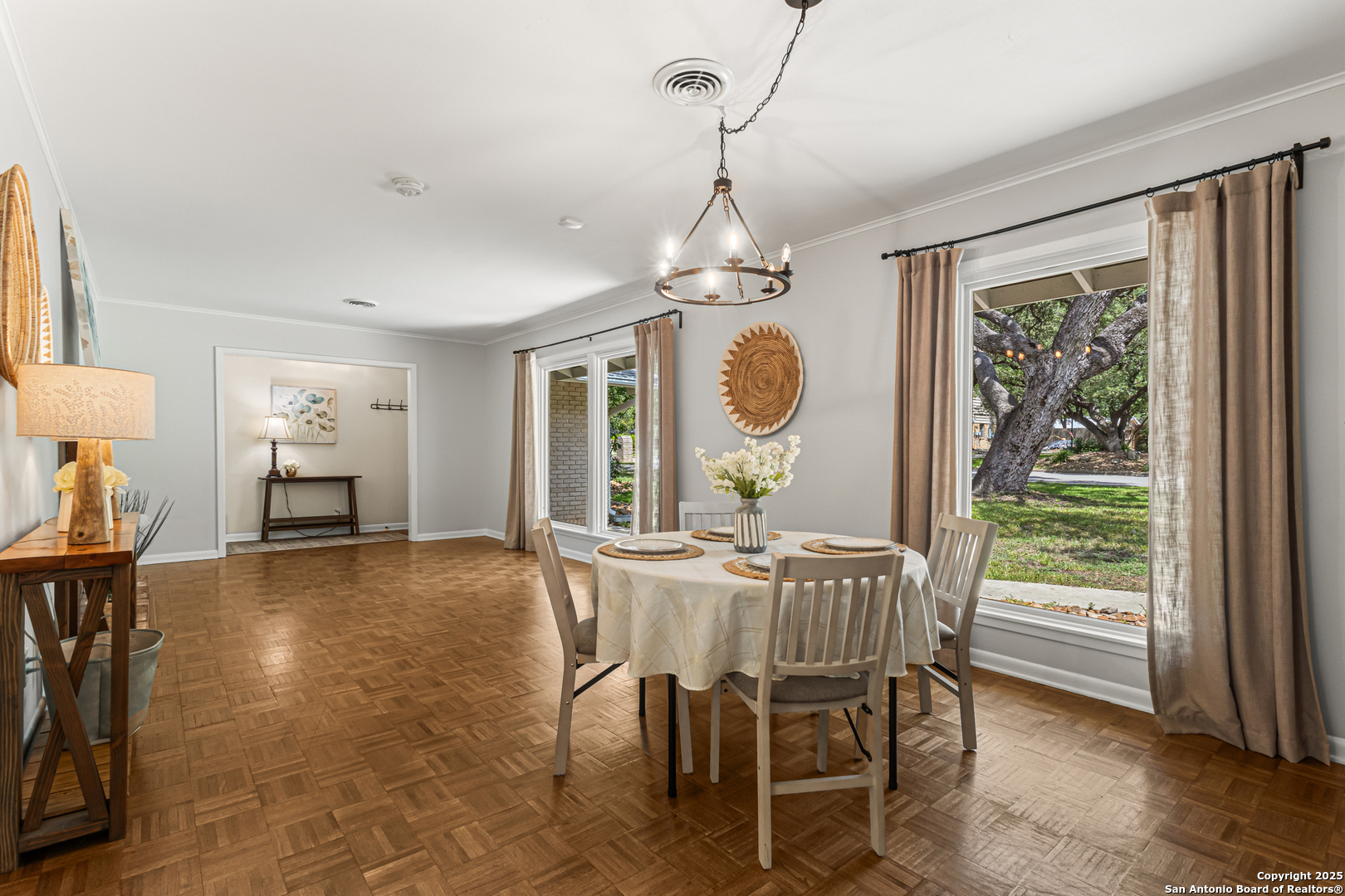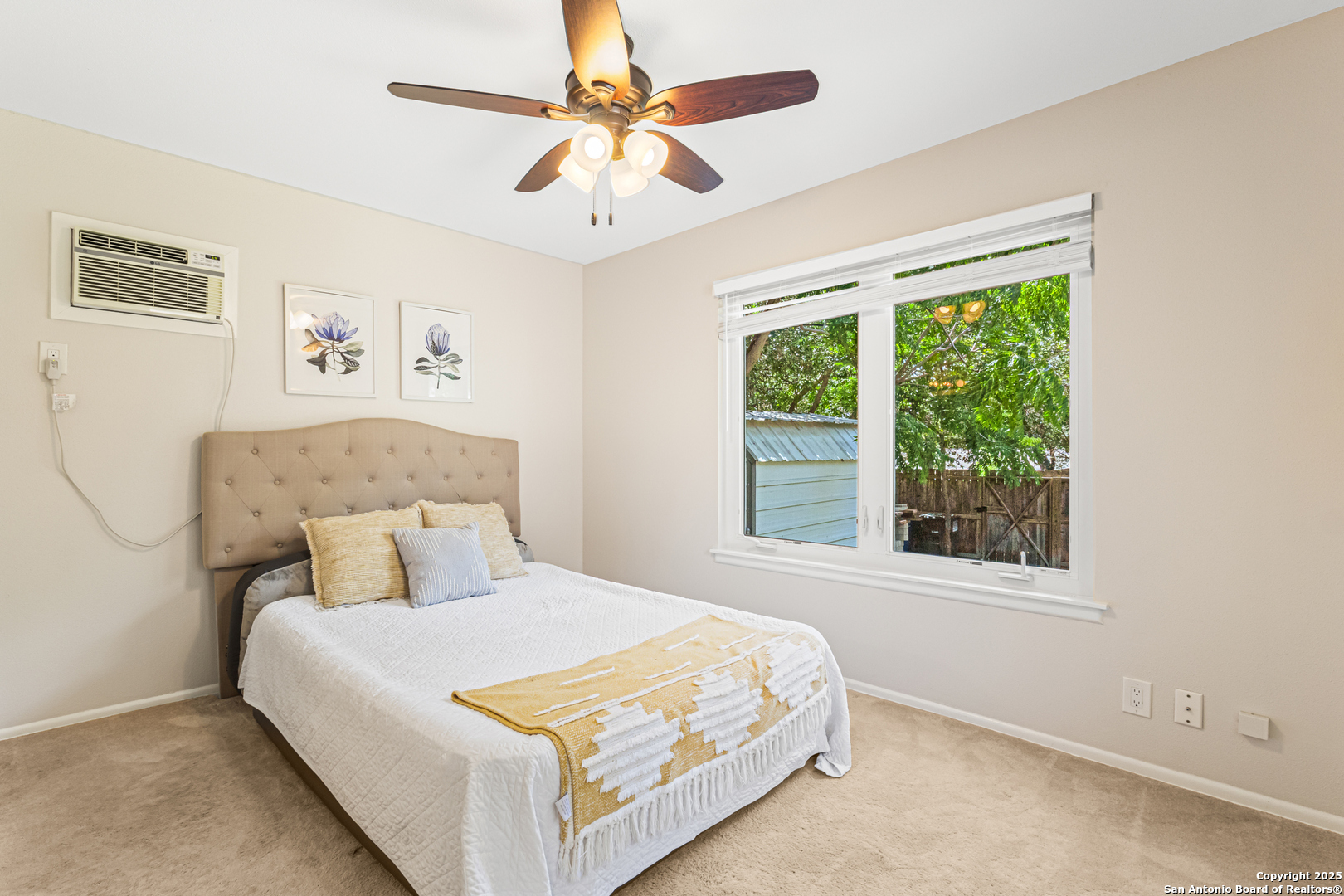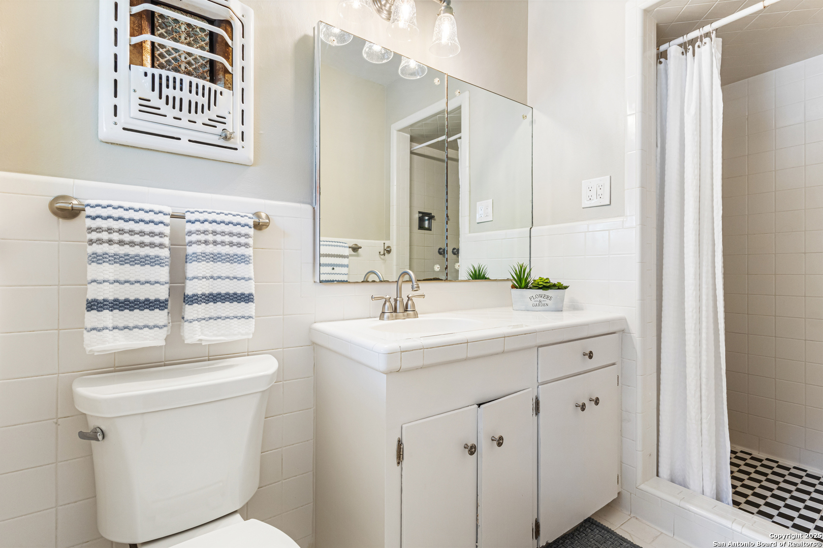 This Midcentury Modern 1-story home with Pella windows throughout offers serene views and natural light. The thoughtfully designed residence features clean architectural lines, a dual-sided wood-burning fireplace, and two patios perfect for outdoor relaxation or entertaining. Freshly painted interior and double-pane windows add to the comfort and energy efficiency. The home includes three flexible living areas, including a large bonus room ideal as a game room, media space, office, or home gym. The updated kitchen boasts quartz countertops, subway tile backsplash, stainless steel vent hood, dishwasher, and gas cooktop. Layout offers privacy with 3 bedrooms and 2 bathrooms on one side, and a separate guest suite with its own entrance and private bath-ideal for visitors, multigenerational living, or potential income use. Converted garage offers additional storage or workshop space. Conveniently located near Fort Sam Houston/SAMMC, Loop 410, and the airport. Discover comfort, style, and versatility in this well-maintained home!