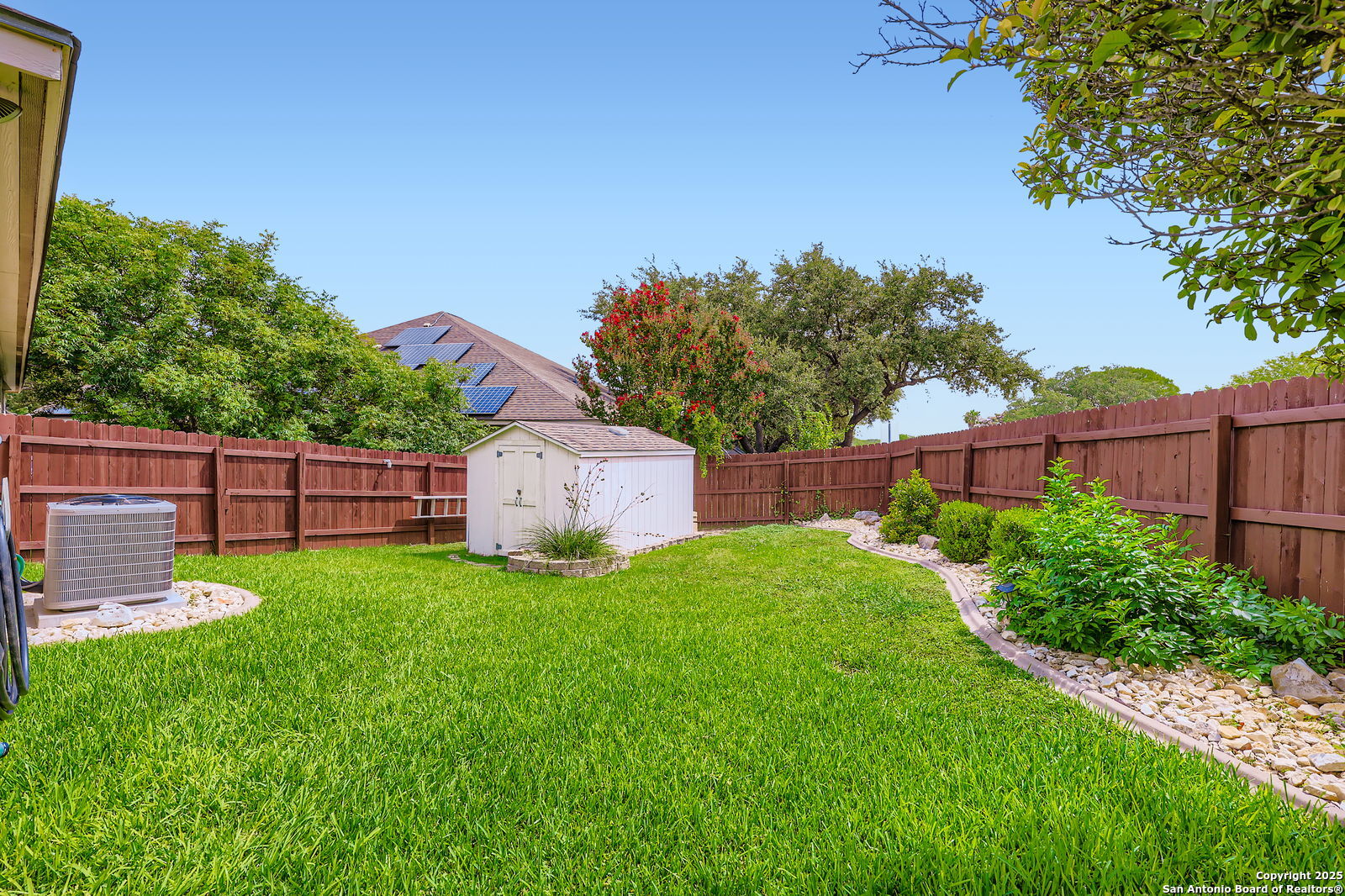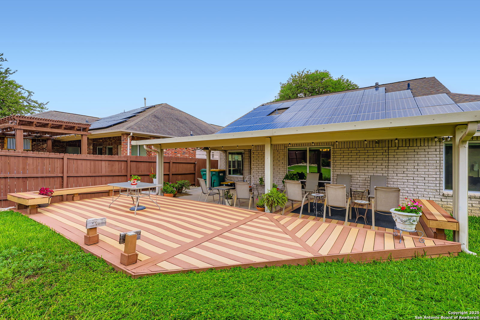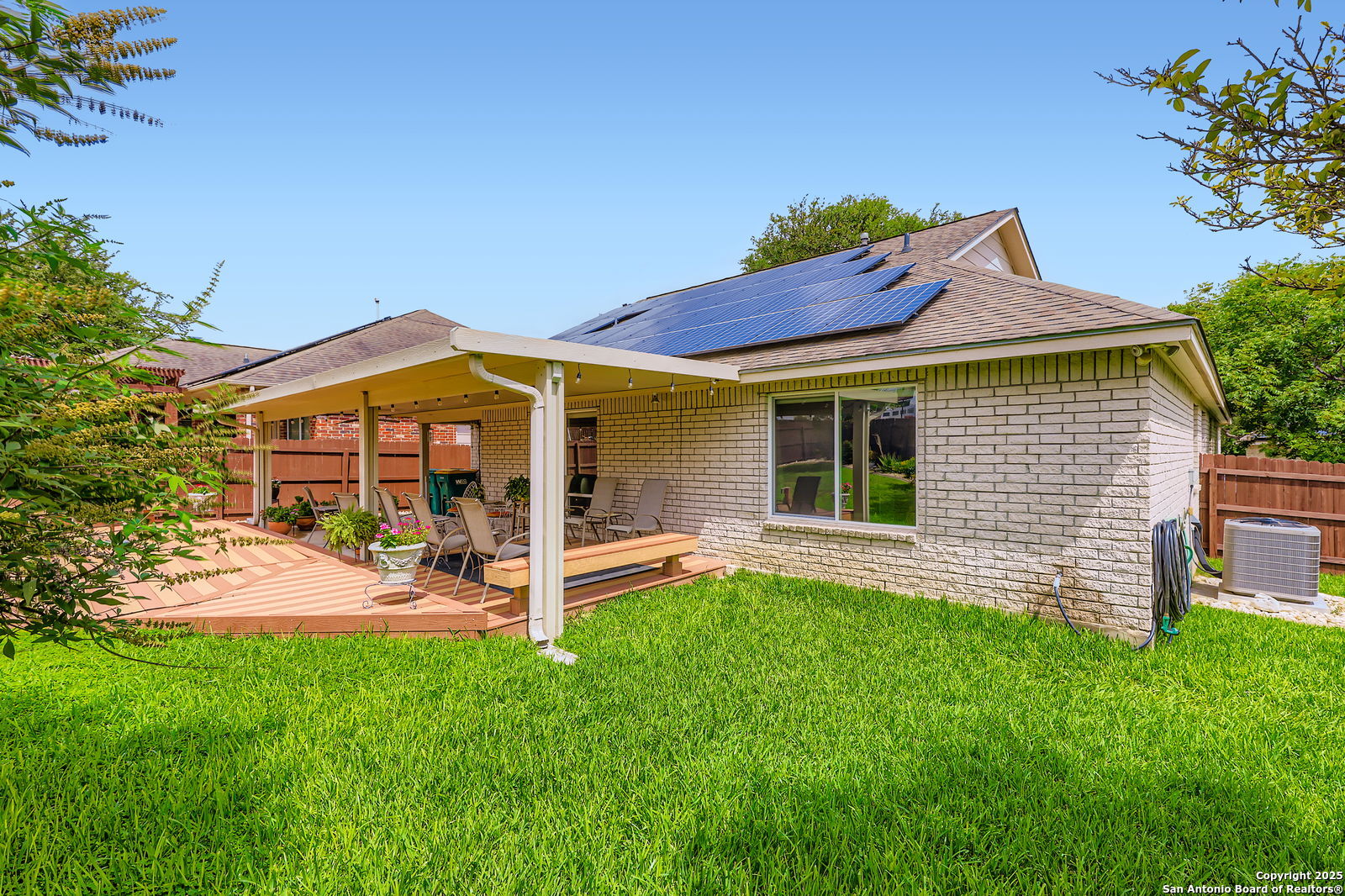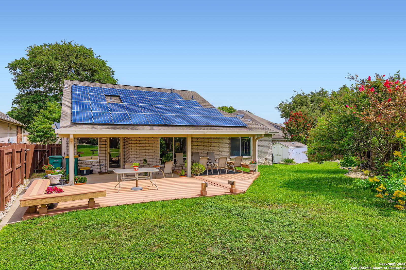 SELLER WILL PAY UP TO $10,000 towards closing costs and updates. This beautifully maintained all brick single story home is located in the desirable Olympia Hills area in Universal City. The home is situated on a corner and cul-de-sac lot on nearly 1/4 of an acre. This charming property comes with PAID OFF solar panels, keeping energy bills as low as $5.00! You will also enjoy the benefits of brand new windows and shades (2024). New A/C heating units and water heater (2022), and a water softner system for added home comfort. Master bedroom walk in closet boosts custom shelves and drawers. Relax in the most peaceful backyard setting with a large partially covered deck. Home also has a large storage shed in the back yard. Close to shopping, restaurants, Olympia Hills golf course, and military bases.
