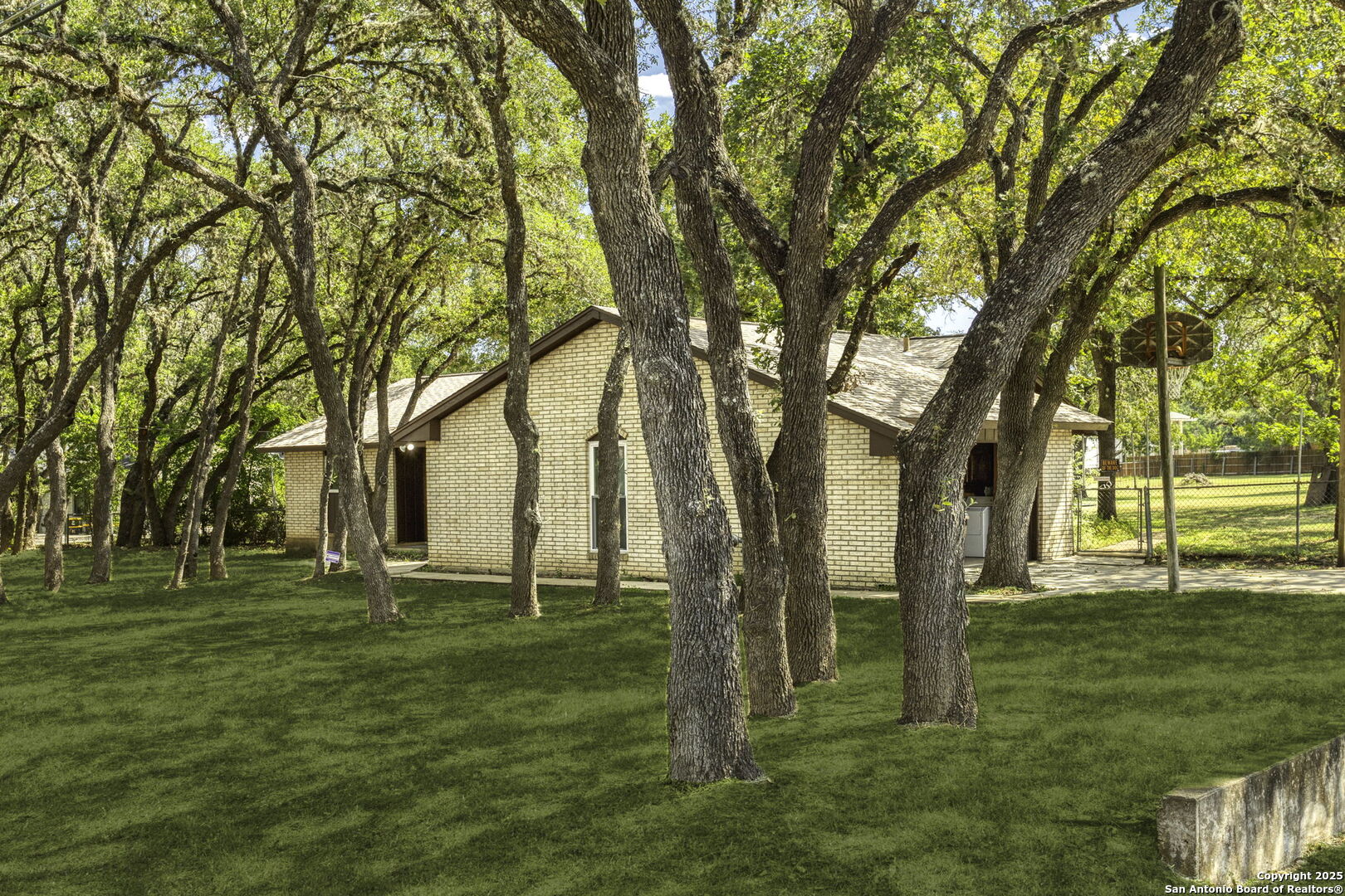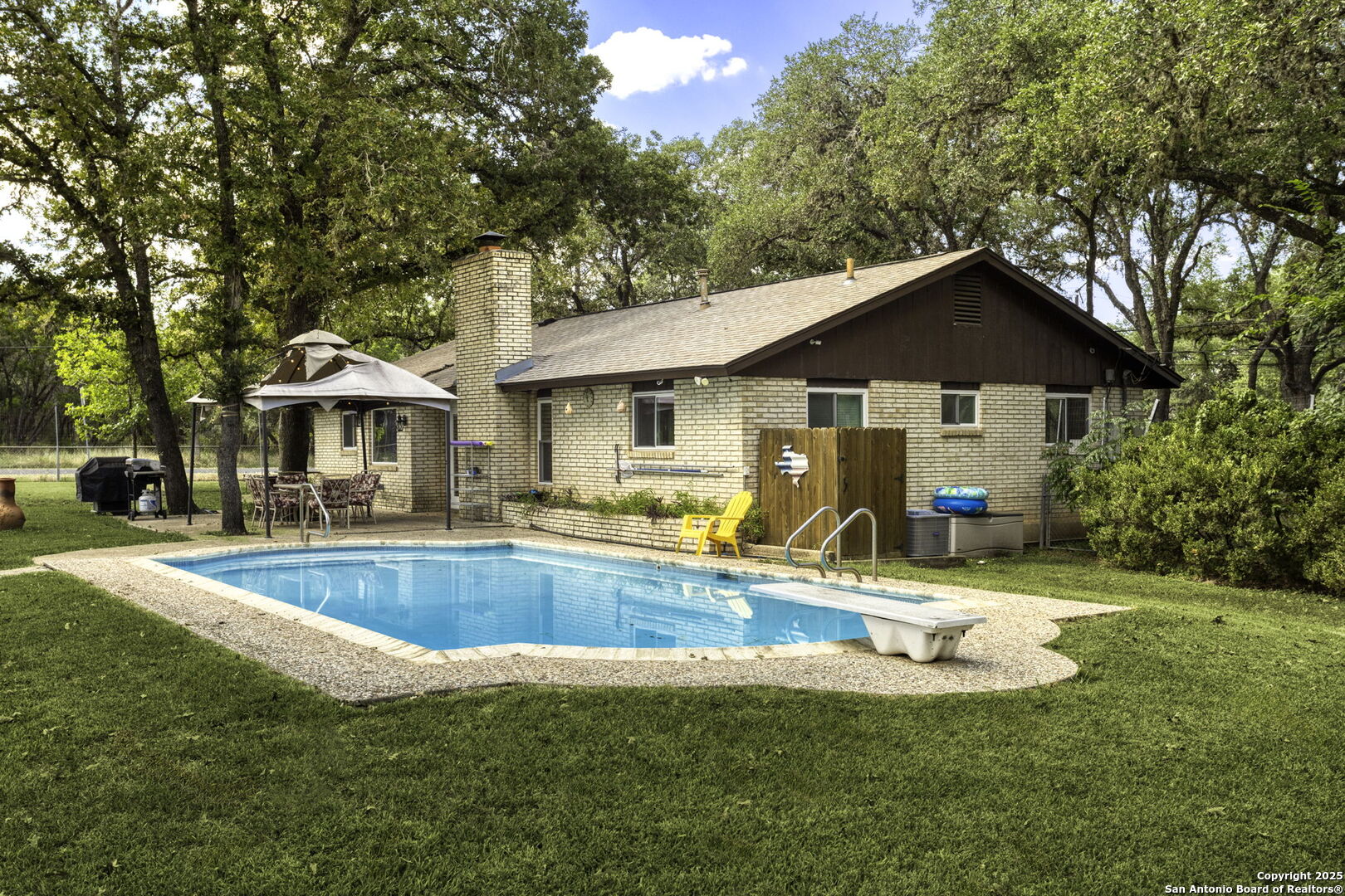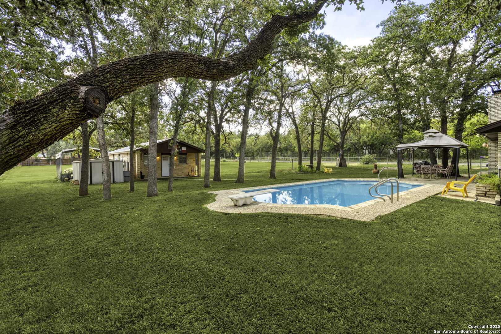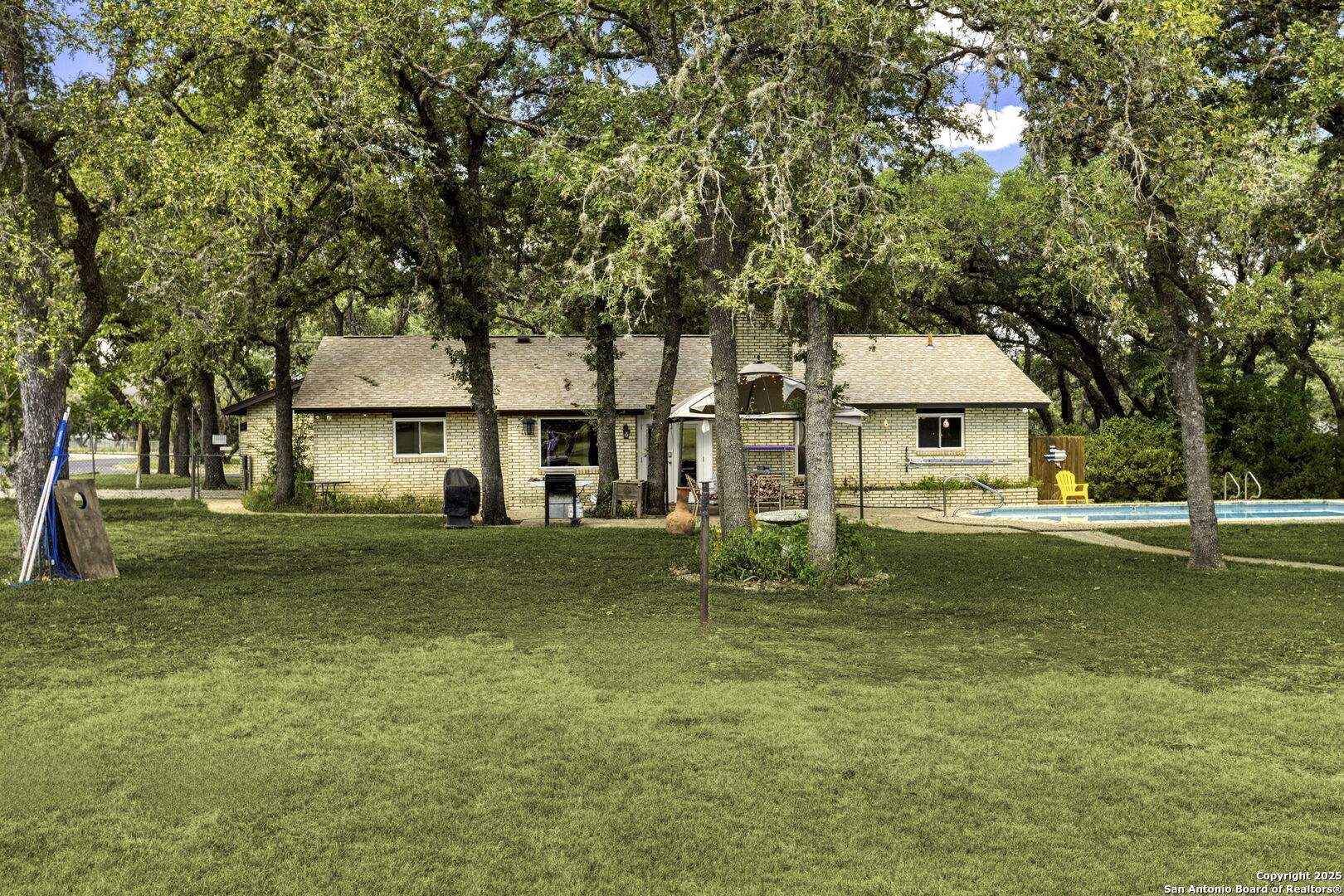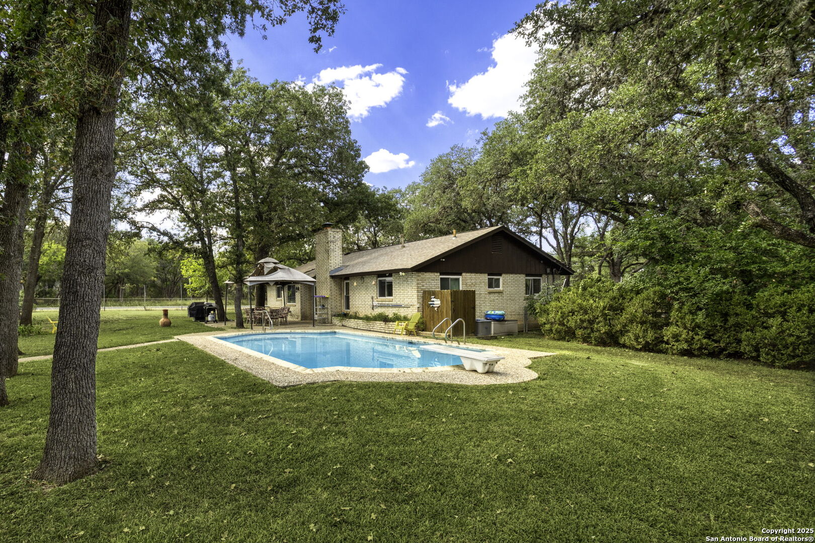 Tucked away in the highly desirable Stagecoach Hills neighborhood, 8818 Apache Trail is more than just a home, it's a retreat designed for both everyday living and unforgettable gatherings. Sitting on almost three-quarters of an acre surrounded by mature oak trees, this property blends Hill Country charm with modern updates. The main home (1,579 sqft) offers 3 bedrooms and 2 full bathrooms, all beautifully remodeled. At its heart, a wood-burning fireplace creates a warm and inviting centerpiece, while the fully updated kitchen shines with stylish finishes, modern appliances, and an open flow to the living and dining areas. The attached 2-car side-entry garage adds convenience, and every detail, from the new flooring to the updated lighting, reflects thoughtful care. Step outside, and the story continues. A sparkling in-ground pool is perfectly placed between the main home and the guest house, creating a resort-like atmosphere. The detached guest home (704 sqft) includes its own full bath and separate entrance, making it ideal for extended family, a private office, or an income-producing short-term rental investment. The outdoor space is built for entertaining, with plenty of room for grilling, lounging, or games under the shade of mature trees. Smart features like exterior security cameras, WiFi-enabled sprinklers, and a water softener add peace of mind. Best of all, the home is fully furnished and move-in ready, including all appliances - refrigerator, washer, and dryer. With no HOA, top-rated schools, and a location that's just minutes to I-10, Loop 1604, and a short drive to Boerne, this home offers both freedom and convenience. Whether you're searching for your forever home, a place to entertain, or a property with income potential, 8818 Apache Trail delivers it all.