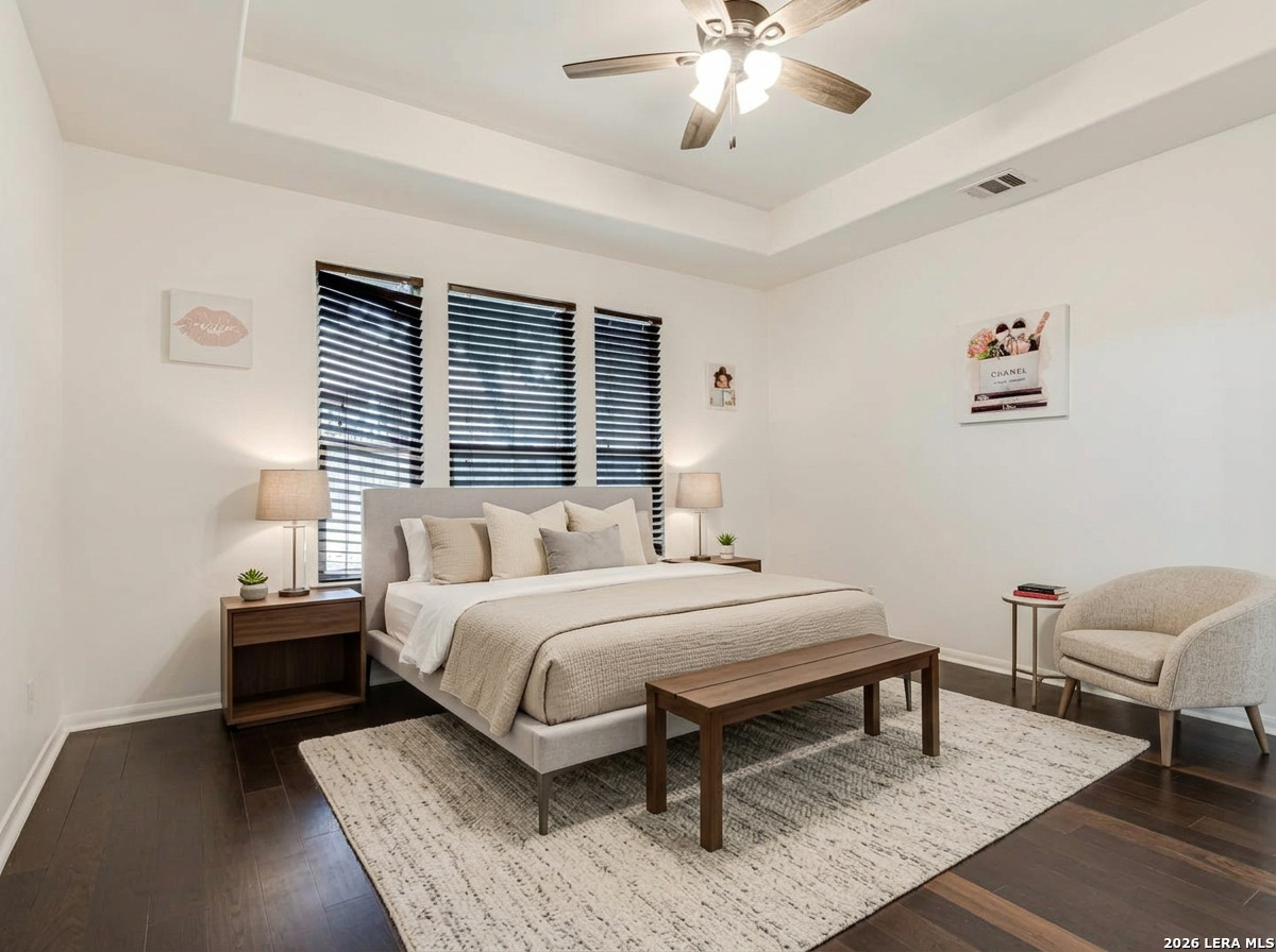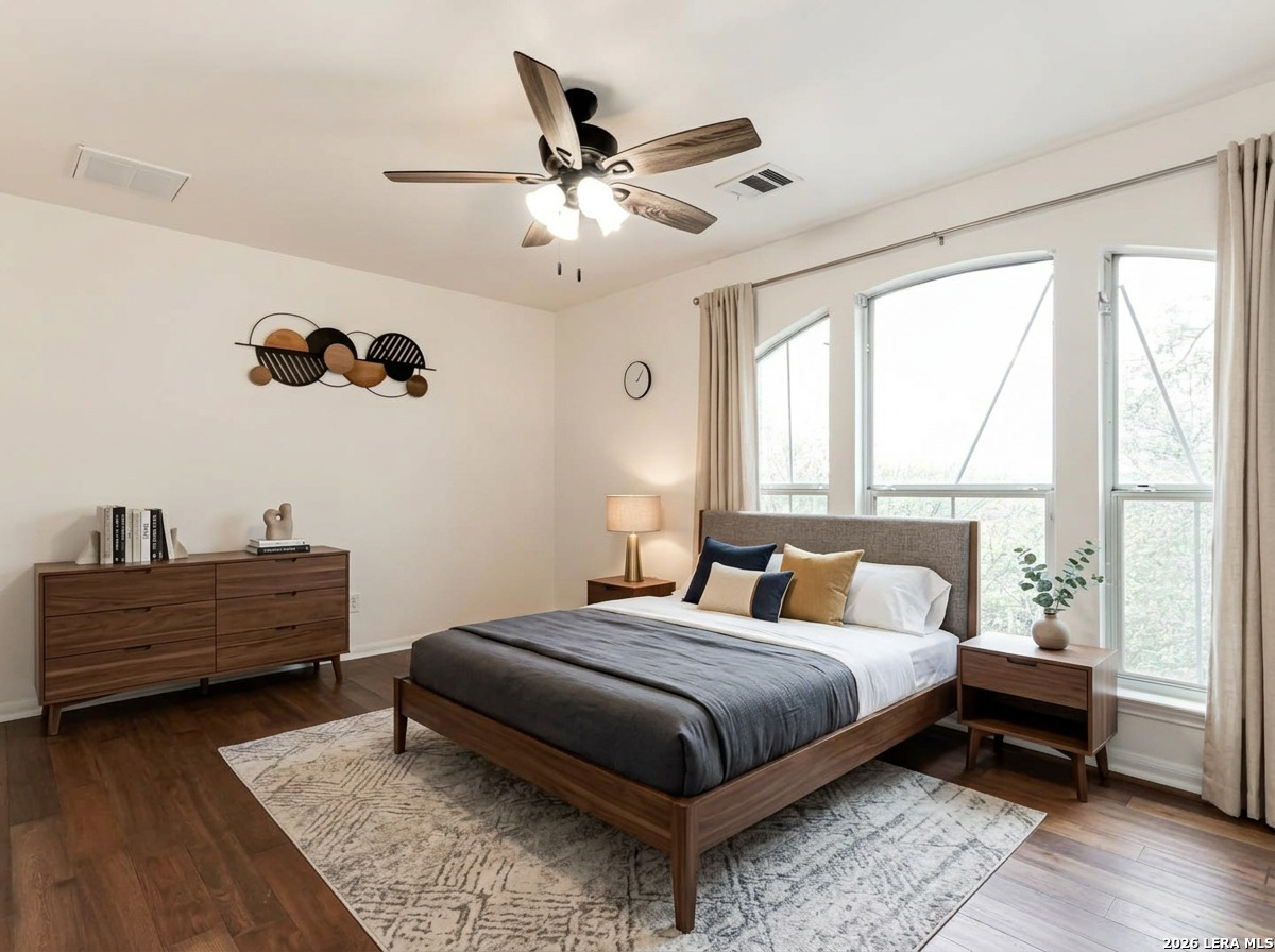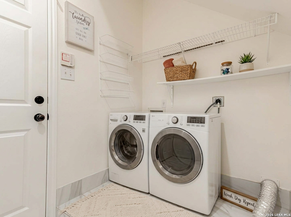 Step into this inviting home in the established Olympia Oaks neighborhood. This two-story property offers an open layout with soaring ceilings in the main living area, creating a bright and spacious feel the moment you walk in. The kitchen overlooks the living space and features an eat-in dining area along with a large walk-in pantry, making it perfect for both everyday living and entertaining. Downstairs you will also find an oversized flex room that can easily serve as a home office, game room, media space, or even a fifth bedroom depending on your needs. The primary suite is conveniently located on the main level and includes a full bathroom and generous walk-in closet. Upstairs are three additional bedrooms, including one with its own private balcony, offering a unique space to relax and enjoy the outdoors. The home is ideally located near Randolph Brooks Air Force Base, Fort Sam Houston, and SAMMC, with quick access to IH-35 and shopping and dining at The Forum. Homes in this area move fast, so come take a look before it's gone!