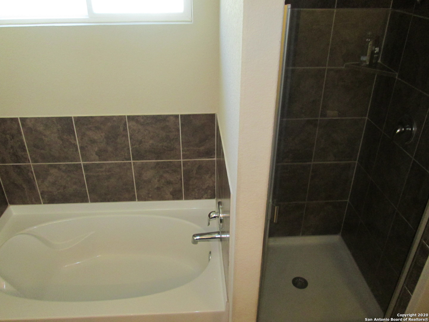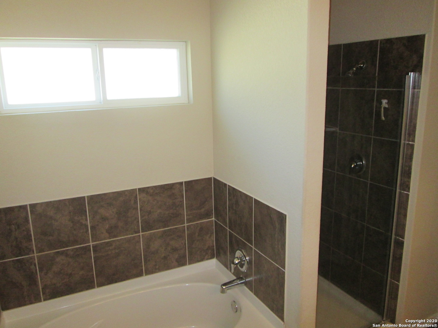 Single story 3 bedroom, 2 bath 1442 adsq. With large open kitchen and dinning room. Large Master bedroom with walk in closet, separate tub and shower, double vanity, 9ft ceilings and a large covered patio. This home has all new carpets in the bedrooms and fresh coat of interior paint. Located in the Northside school district this would make a great back to school move. Photos taken before last tenant. Lets get your application started.