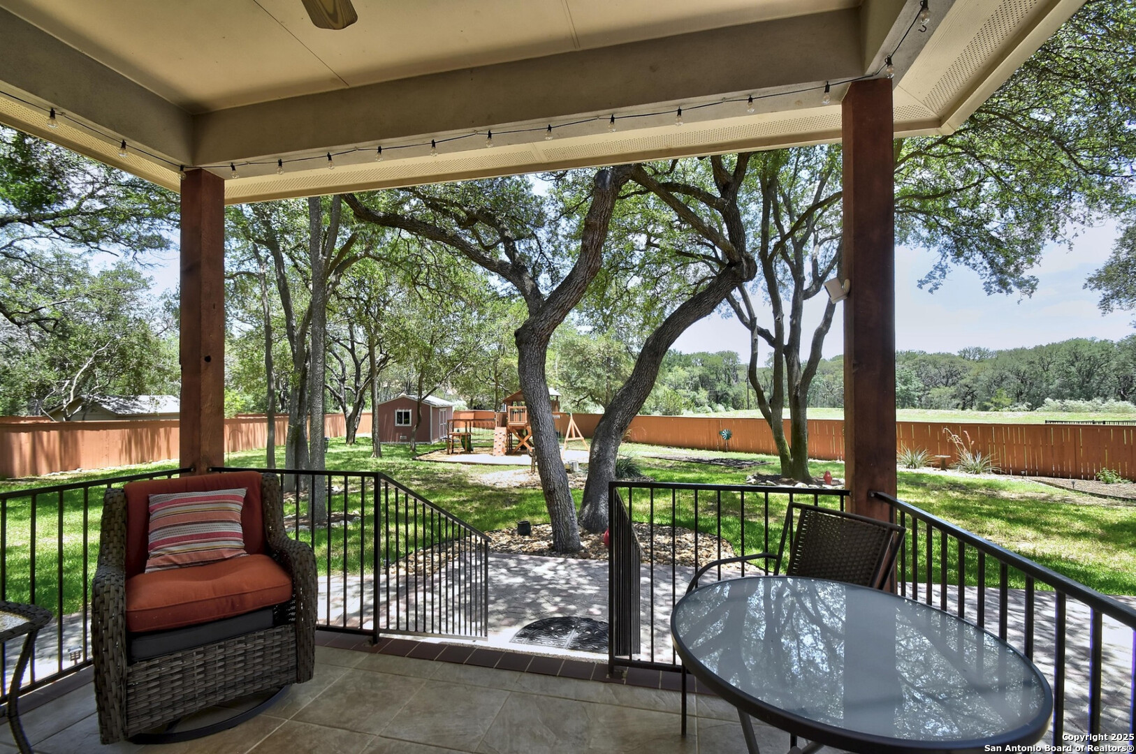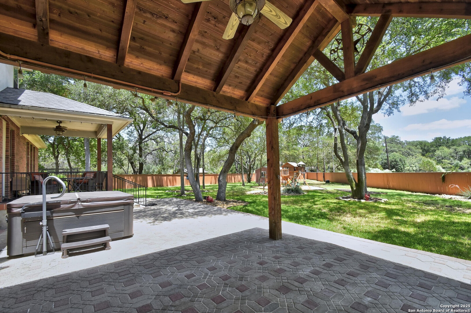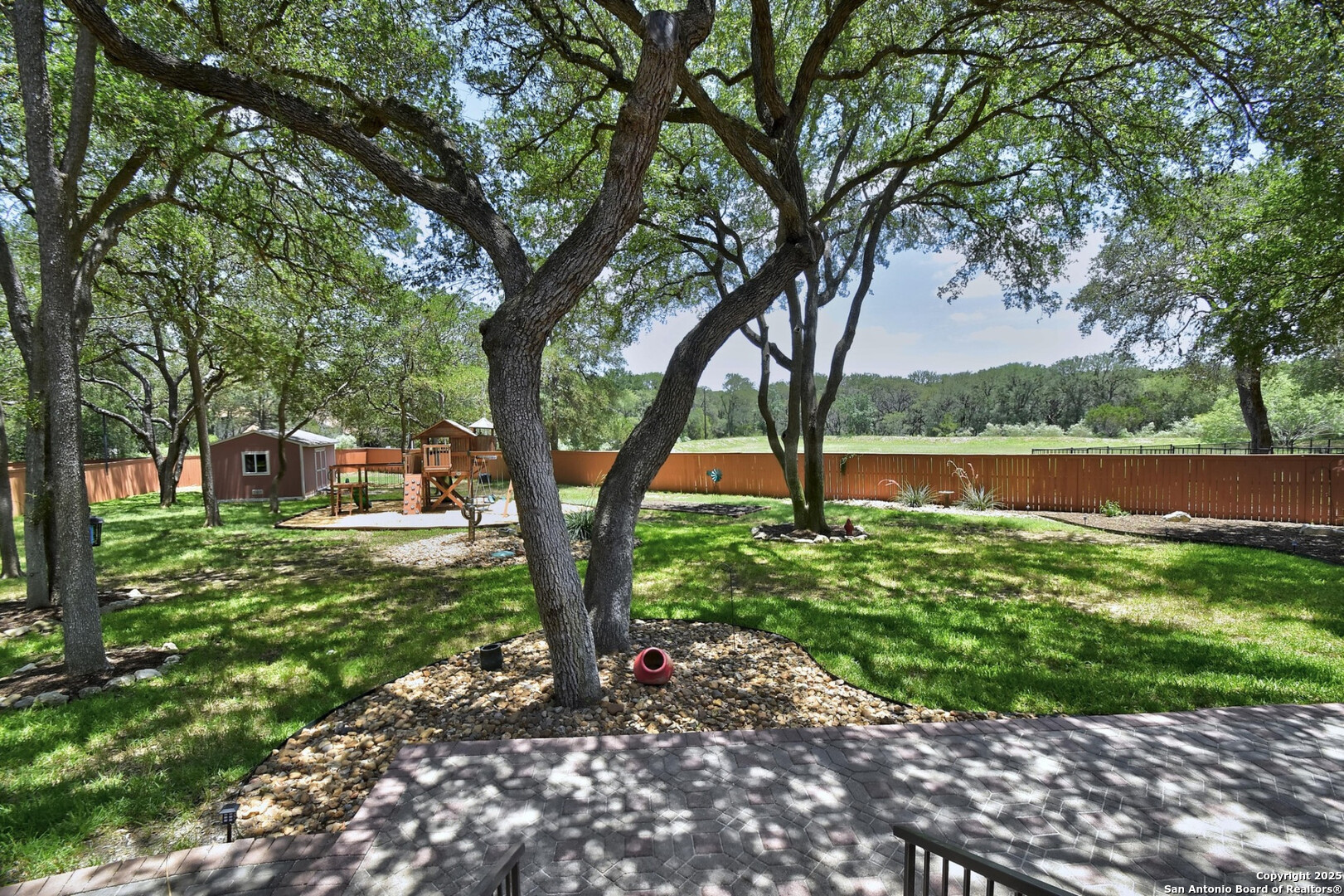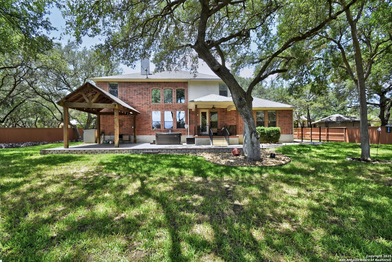 This home is an Executive Series Design with aspects that truly make it stand out. It has the Master Bedroom and all main living areas downstairs, while the upstairs provide bedrooms and entertainment areas for family and guests. It combines the convenience of a single-story home for the owners with the efficiency of a 2-story. This is a beautiful well-maintained brick and stone home nestled among mature oak trees in the Forest of Garden Ridge subdivision. It sits on a premium cul-de-sac lot. Its orientation is an ideal southeast exposure for gorgeous morning sun and cool afternoon shade. You'll really like how the backyard provides excellent privacy with a pleasant view of a 4-acre tree lined deer grazing meadow. Overall, the location provides a perfect balance of serene country living with easy access to city amenities. This home has had extensive updates in the past few years: new roof, A/C, water heaters, all kitchen appliances (including a 36" induction cooktop), 20,000W standby generator, and Caldera Seychelles Spa. Downstairs are the master bedroom suite, formal living and dining rooms, a butler's pantry, executive office, powder room, spacious kitchen, and family room with fireplace. Upstairs are 3 bedrooms, 2 baths, game room, and media room (all large). The game room with wet bar conveys an $8K Peter Vitale pool table, lighting, and bench. The back porch steps on to a large pavestone patio and an impressive pavilion shelter. The entire back yard is enclosed with a 6' cedar fence that includes a grand swing and slide playset, and a 12'X20' well-built shed and workshop with electricity. An added convenience in the backyard is a large 12' sliding fenced gate that leads out to a private access road.