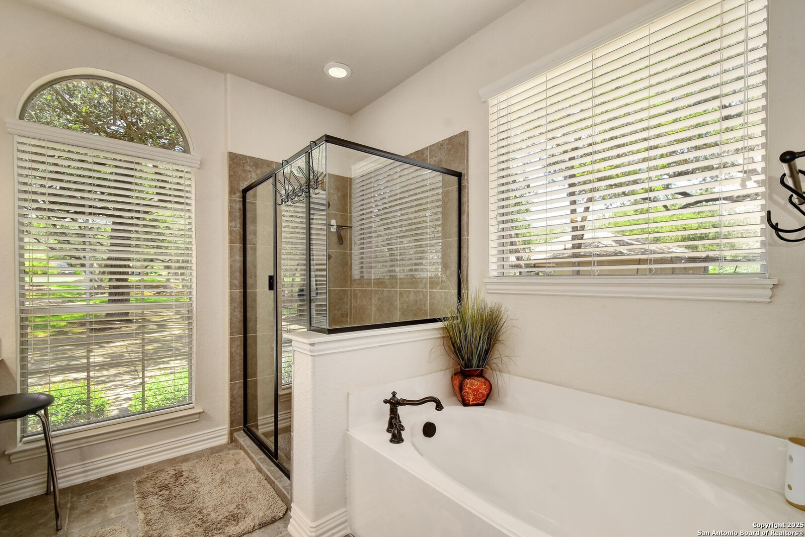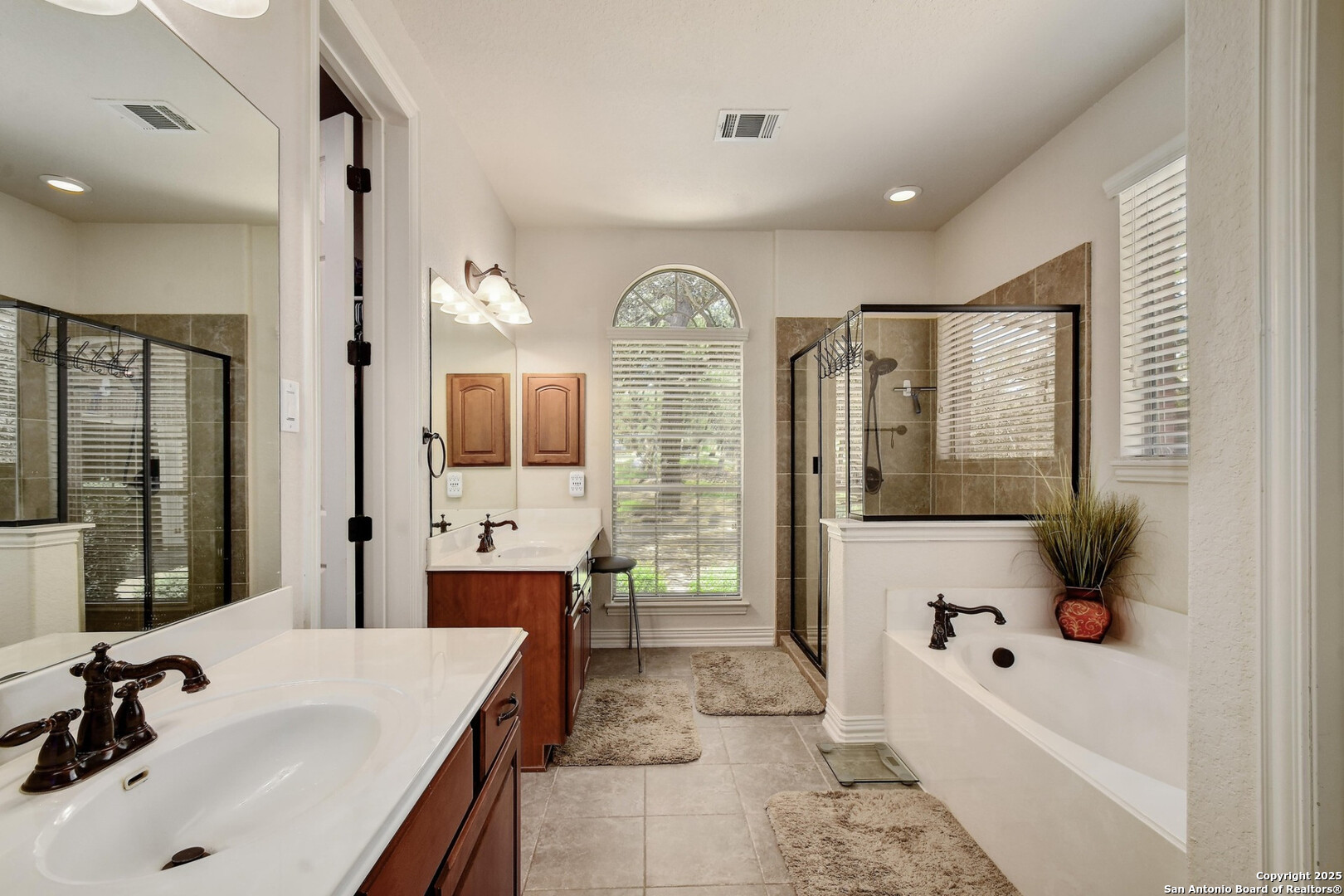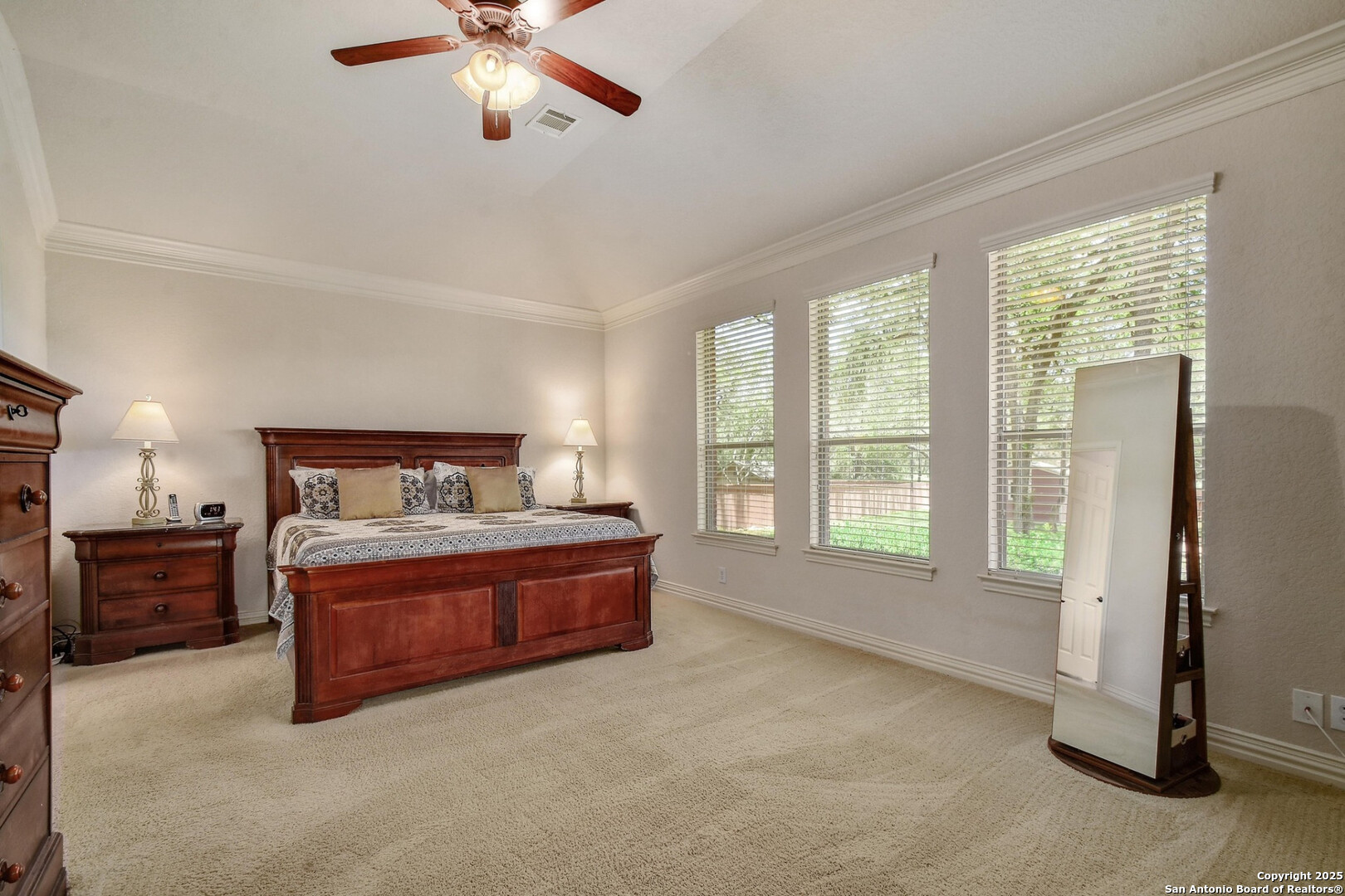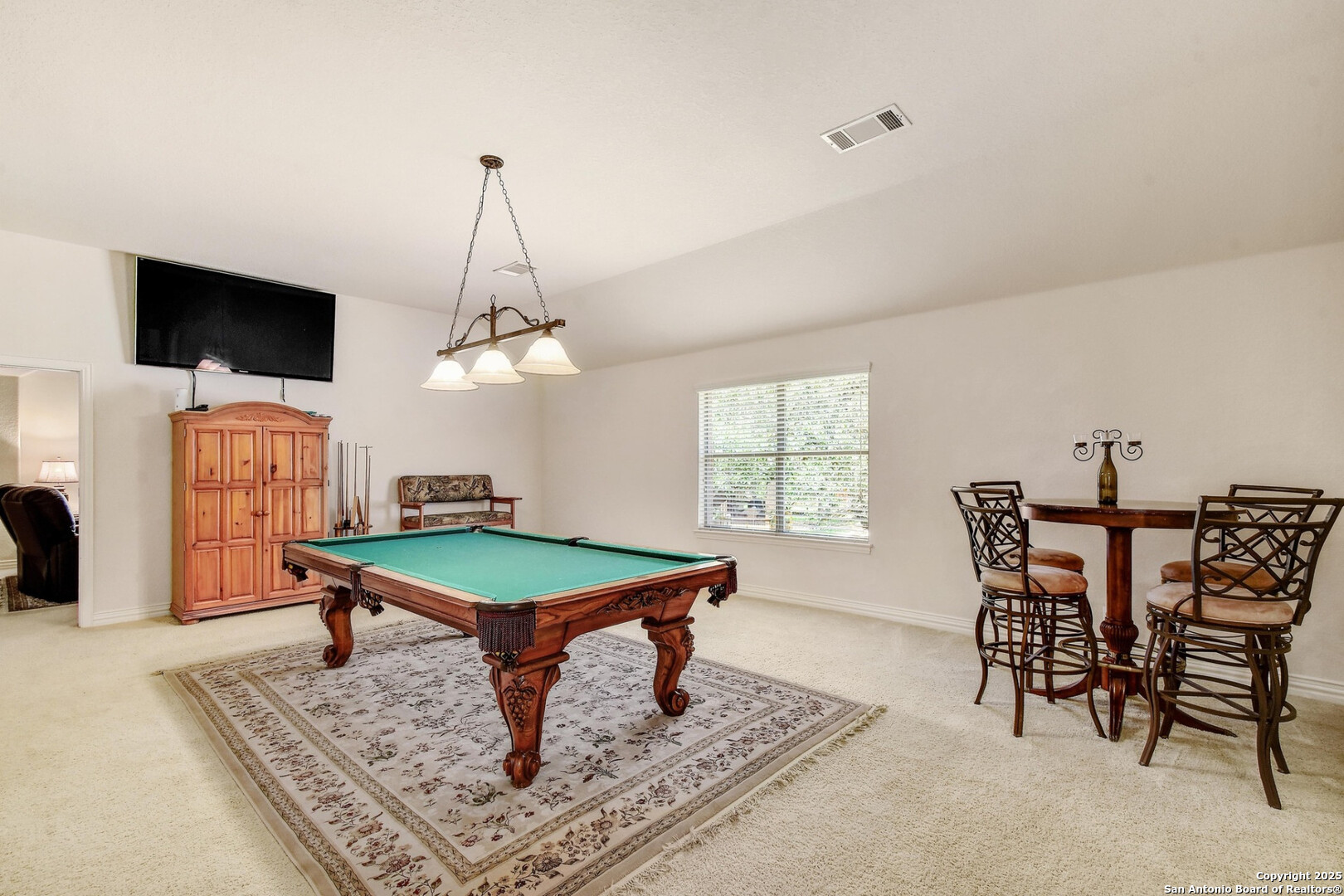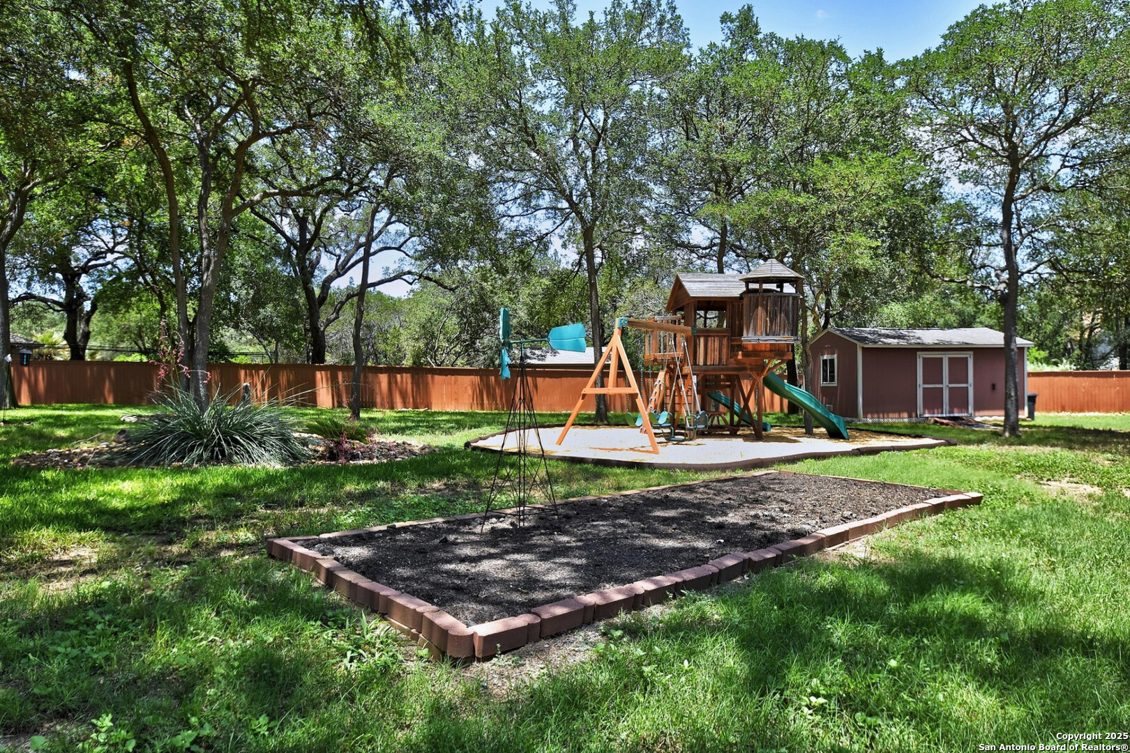 This home is an Executive Series Design with aspects that truly make it stand out. It has the Master Bedroom and all main living areas downstairs, while the upstairs provide bedrooms and entertainment areas for family and guests. It combines the convenience of a single-story home for the owners with the efficiency of a 2-story. This is a beautiful well-maintained brick and stone home nestled among mature oak trees in the Forest of Garden Ridge subdivision. It sits on a premium cul-de-sac lot. Its orientation is an ideal southeast exposure for gorgeous morning sun and cool afternoon shade. You'll really like how the backyard provides excellent privacy with a pleasant view of a 4-acre tree lined deer grazing meadow. Overall, the location provides a perfect balance of serene country living with easy access to city amenities. This home has had extensive updates in the past few years: new roof, A/C, water heaters, all kitchen appliances (including a 36" induction cooktop), 20,000W standby generator, and Caldera Seychelles Spa. Downstairs are the master bedroom suite, formal living and dining rooms, a butler's pantry, executive office, powder room, spacious kitchen, and family room with fireplace. Upstairs are 3 bedrooms, 2 baths, game room, and media room (all large). The game room with wet bar conveys an $8K Peter Vitale pool table, lighting, and bench. The back porch steps on to a large pavestone patio and an impressive pavilion shelter. The entire back yard is enclosed with a 6' cedar fence that includes a grand swing and slide playset, and a 12'X20' well-built shed and workshop with electricity. An added convenience in the backyard is a large 12' sliding fenced gate that leads out to a private access road.