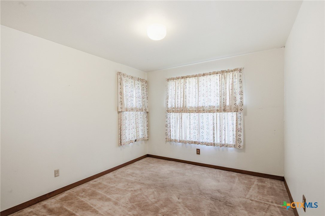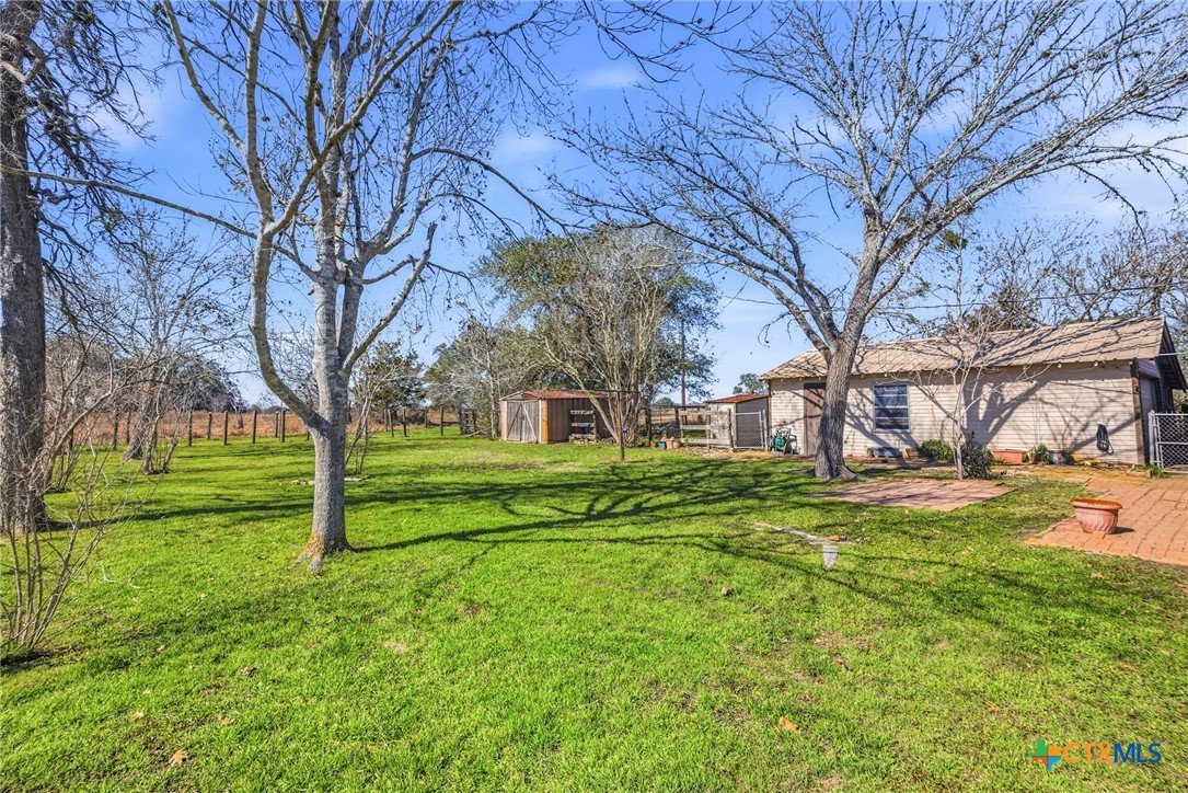 Welcome to this charming 3-bedroom, 2-bath ranch-style home situated on approximately 2 acres just outside the Yoakum city limits and only minutes from Shiner, TX. A rustic flagstone walkway leads to the inviting covered front porch, setting the tone for the warmth found throughout the home. The spacious living room, filled with natural light and offering views of the enclosed back porch, creates a comfortable gathering space for family and friends. The kitchen features a mid-century modern feel with clean lines, warm wood cabinetry, and light countertops that brighten the space, flowing seamlessly into the dining area. Adjacent to the kitchen is a breakfast nook, ideal for casual meals and everyday dining. A wood-paneled home office with built-ins and two closets offers flexible use and could serve as a fourth bedroom if desired. The primary suite offers generous closet space and a private bath with a built-in vanity and separate shower, creating a comfortable retreat at the end of the day. A conjoining door in the primary bathroom offers easy access to the second bathroom & soaking tub. Additionally, a two-car garage, a covered patio ideal for outdoor gatherings, a second enclosed porch just off the breakfast nook, and a second detached workshop highlight this home. With open space, charm, and versatile rooms, this property offers peaceful country living with convenient access to town.