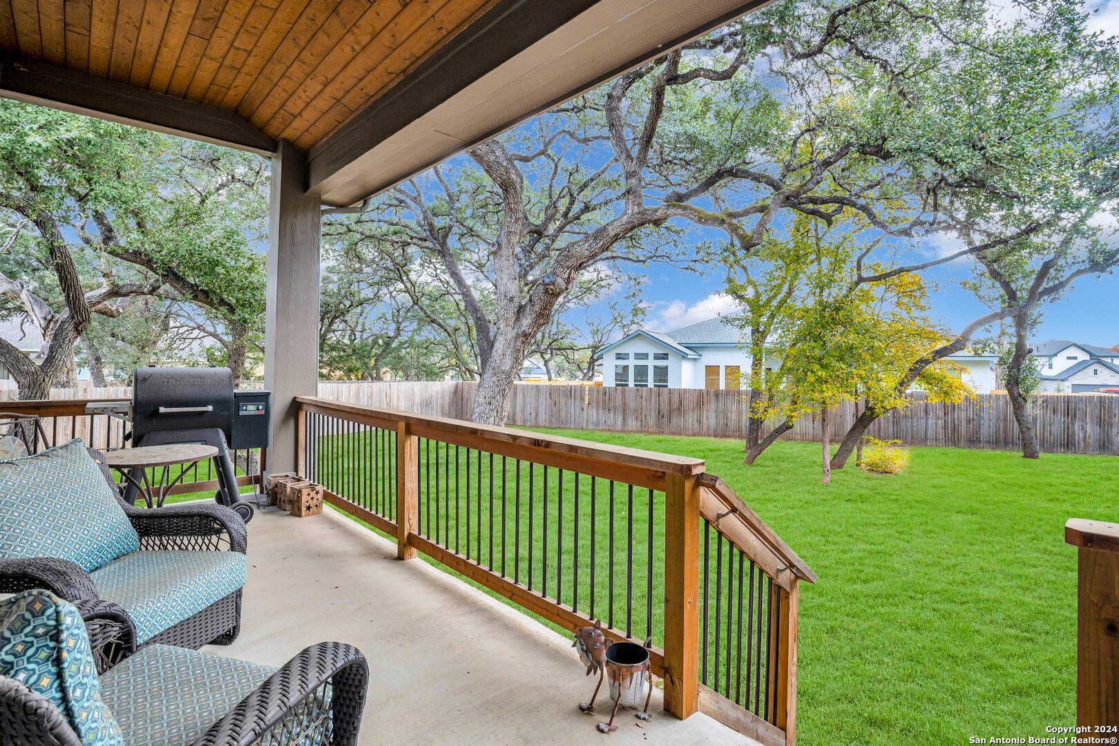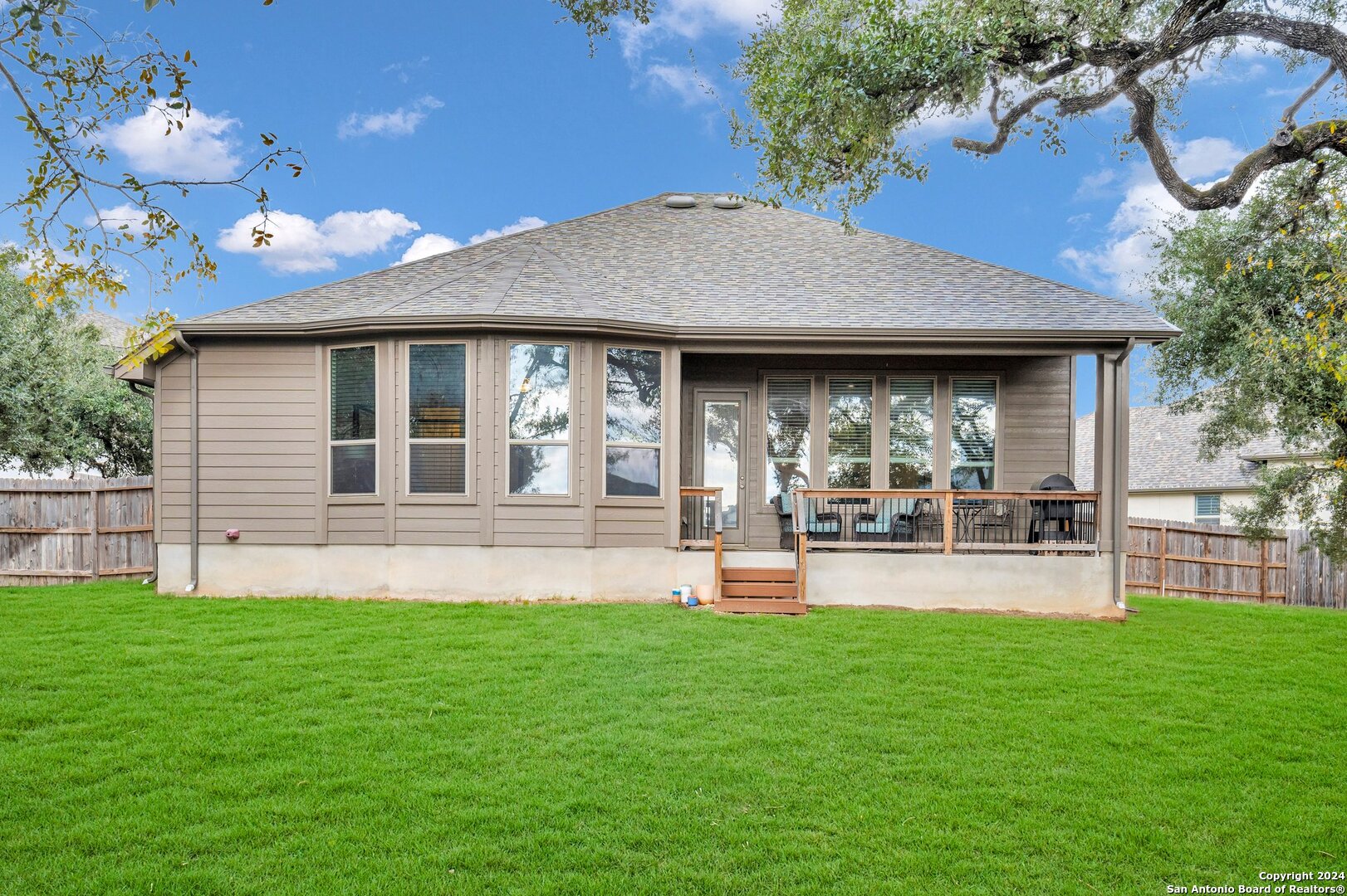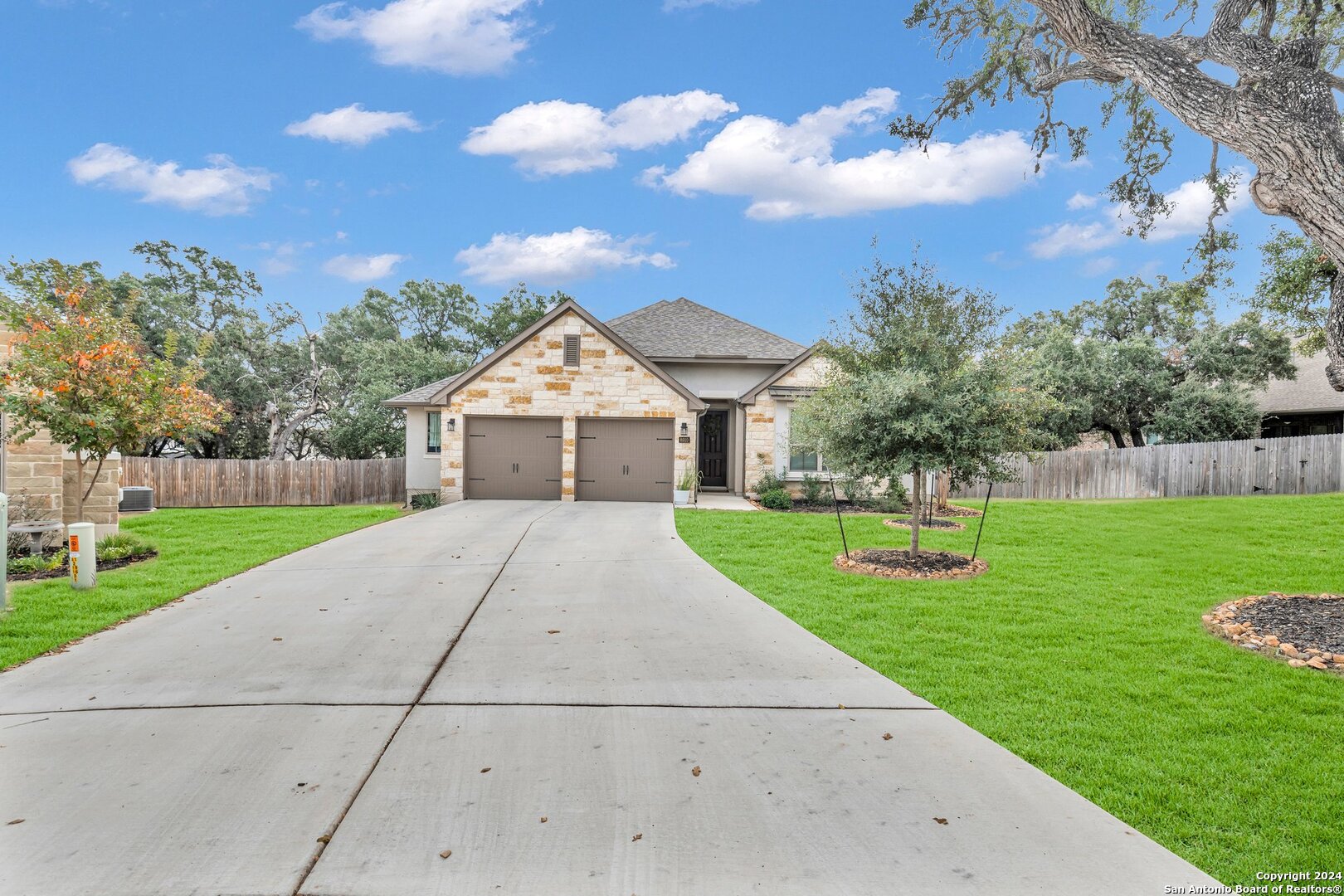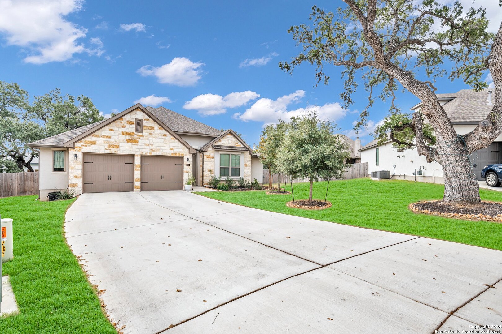 Experience Luxury Hill Country Living! Located in the prestigious Elkhorn Ridge community of Fair Oaks Ranch and Boerne, Texas, this beautiful residence, built by Monticello Homes, offers an exquisite blend of elegance and comfort. Step inside this 3 bedroom, 2.5 bath, 2351 sqft home sitting on a large .35 acre lot in a cul-de-sac. As you walk inside, be greeted by high ceilings and an open floor plan that seamlessly connects the living spaces. The heart of the home is the stunning living area, featuring a magnificent stone fireplace that adds warmth and character. The gourmet kitchen is a chef's delight, boasting granite countertops with a large island, stainless steel appliances, and plenty of counter space and cabinetry for all your culinary needs. The primary bedroom is a private retreat featuring bay windows. Enjoy the luxurious bathroom and large walk-in closet. A dedicated study offers the perfect space for a home office, library, or 4th bedroom. Outside, the covered patio, with tongue & groove ceiling, is ideal for entertaining or simply enjoying the serene surroundings. The expansive yard, adorned with mature trees, provides a peaceful oasis for relaxation and outdoor activities. The home also features a long driveway and a 2.5-car garage. Elkhorn Ridge is a community known for its upscale living and convenient location. Easily drive your golf cart to the Fair Oaks Ranch Golf & Country Club. HEB and the new Lemon Creek development are within 1.5 miles. Enjoy easy access to nearby attractions and parks with trails for jogging and biking, shopping, and dining options in both Fair Oaks Ranch, Boerne, and San Antonio. This home was built with plenty of upgrades, don't miss the opportunity to make this your forever home!