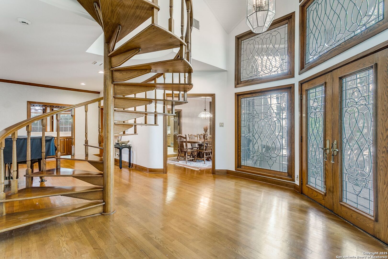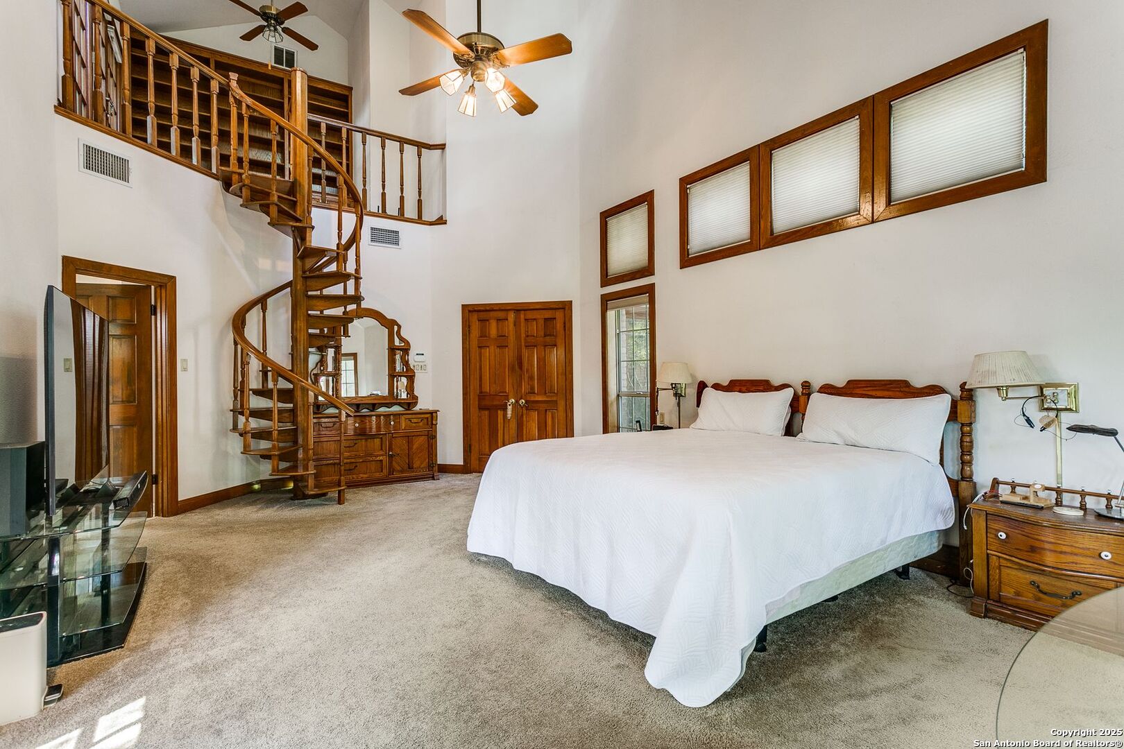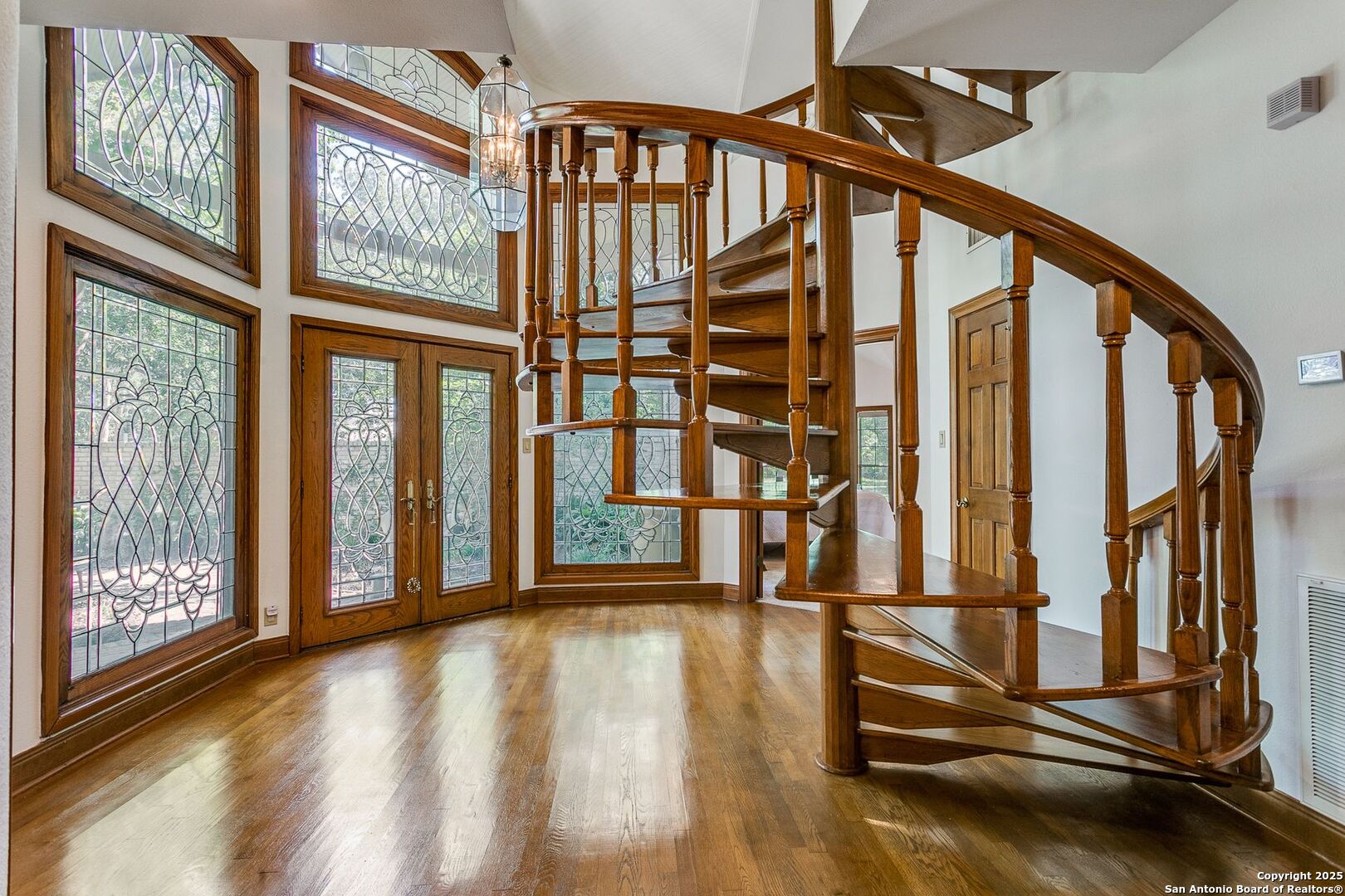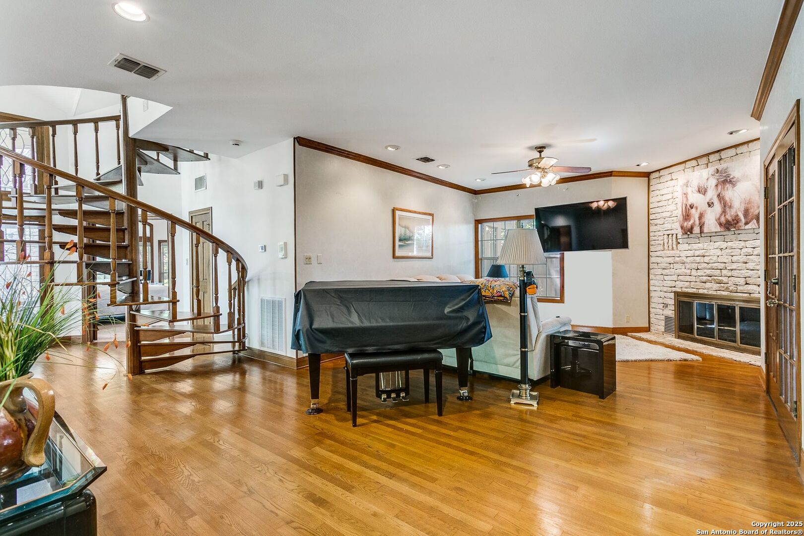 Custom-built one-owner home in coveted Oakwell Farms! Many unique architectural features, with a custom spiral staircase leading to upstairs bedrooms. Huge master bed suite is downstairs with a second spiral staircase leading to an upstairs library loft. Wood floors downstairs, and fire fireplace in living. There is a center island gourmet kitchen with large pantry. Community pool, clubhouse, tennis and pickleball courts, kids' playground, basketball court, and miles of jogging trails with a guard at the guard gate entrance. The sellers own the lot next door, which can be purchased for $305,000.