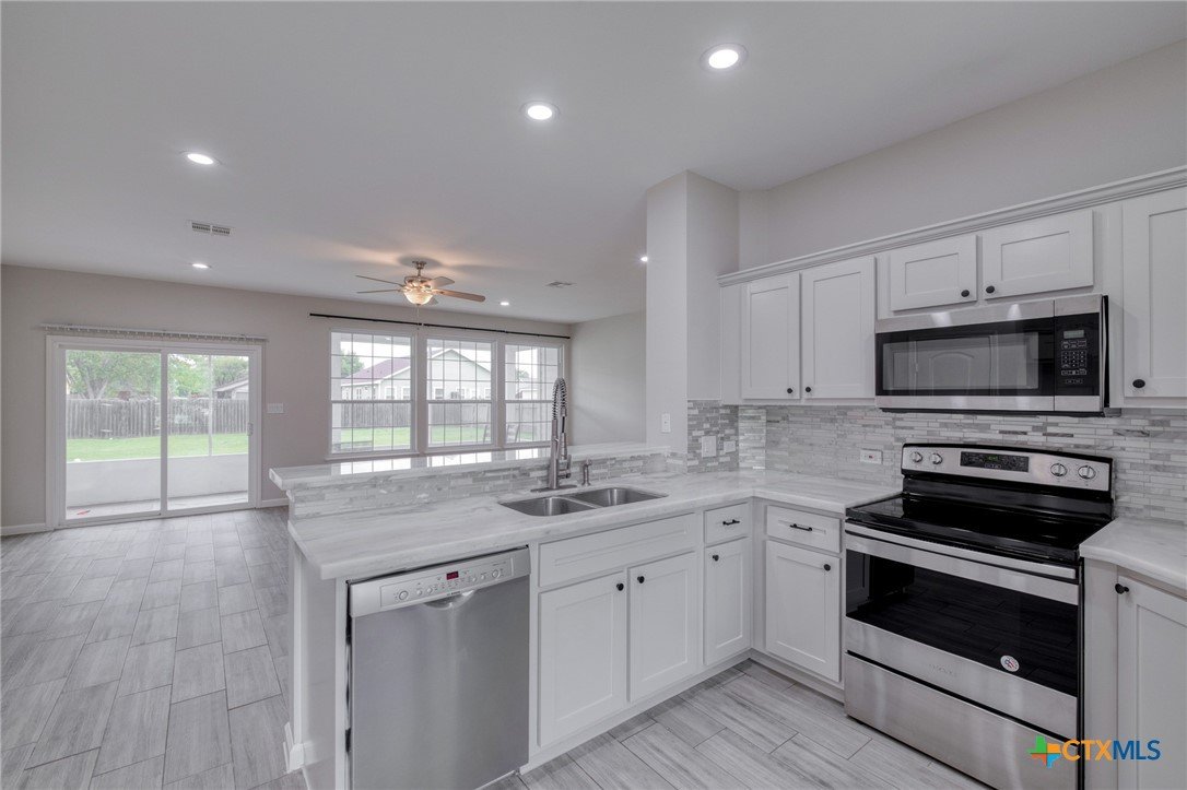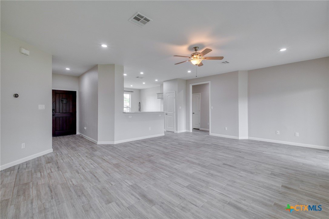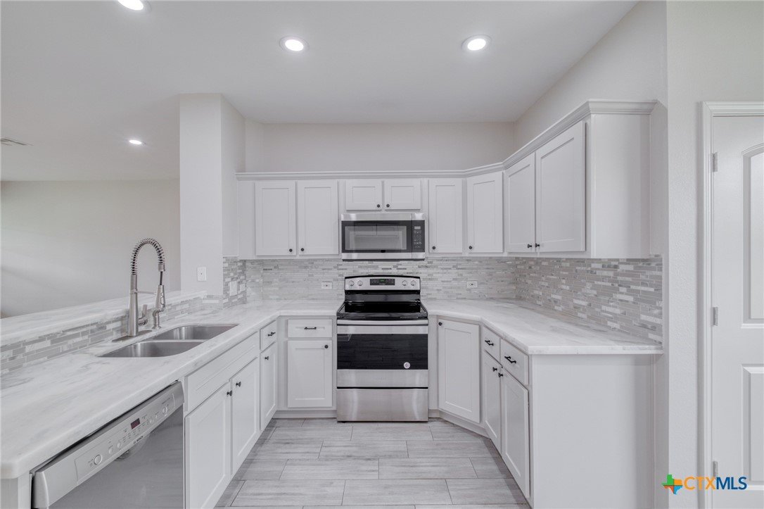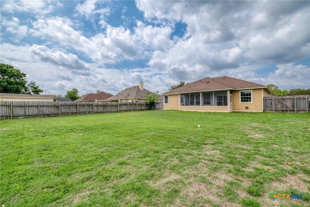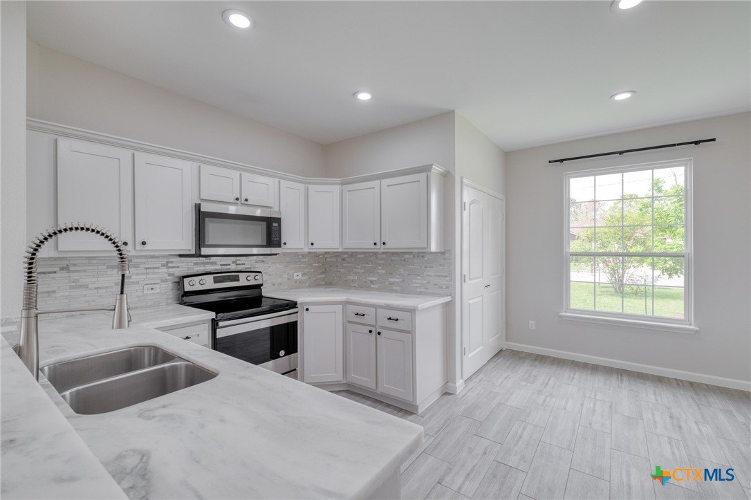 Welcome to 902 Fannin Street in the heart of Lockhart — where small-town charm meets modern comfort and an unbeatable location puts Austin, Kyle, and Buda all within easy reach. This beautifully updated one-story home offers three bedrooms, two bathrooms, and a thoughtfully designed open floor plan with soaring high ceilings and wood-look tile flooring throughout the main living areas. Fresh paint throughout gives the home a crisp, clean feel that is truly move-in ready. The kitchen has been freshly refreshed with neutral painted cabinets, marble countertops, and a classic tile backsplash, opening seamlessly to the living and dining spaces — perfect for everyday living and entertaining alike. The split floor plan places the primary suite privately on one side of the home, featuring an en suite bath with a walk-in shower and a generous walk-in closet. Two spacious secondary bedrooms share a well-appointed hall bathroom on the opposite side. Brand new carpet in all bedrooms completes the pristine, move-in ready feel you will notice the moment you walk through the door. Step outside to a screened-in covered porch and a privacy-fenced backyard, ideal for relaxing or letting pets roam freely. The stone and stucco exterior gives the home standout curb appeal, and a two-car garage adds everyday convenience. With no HOA restrictions and Lockhart's growing dining scene, local character, and quick access to major corridors, this home is the perfect blend of value, lifestyle, and location.