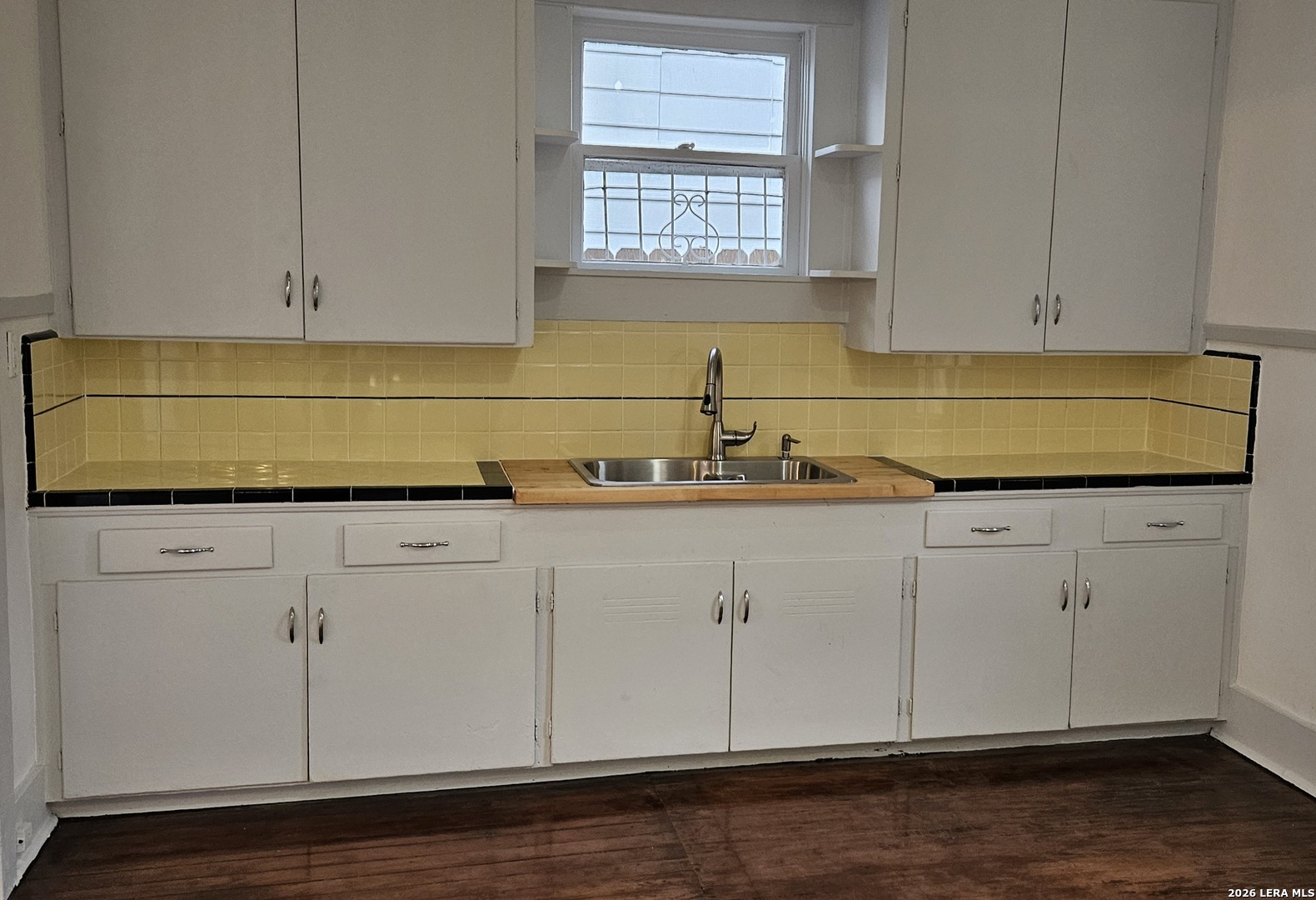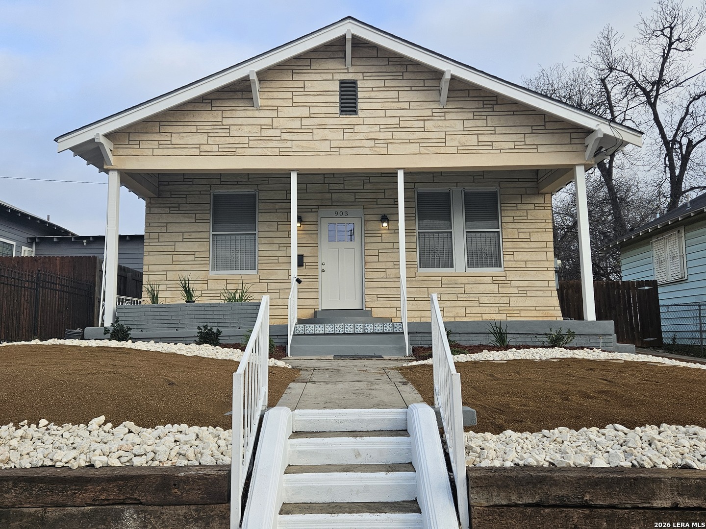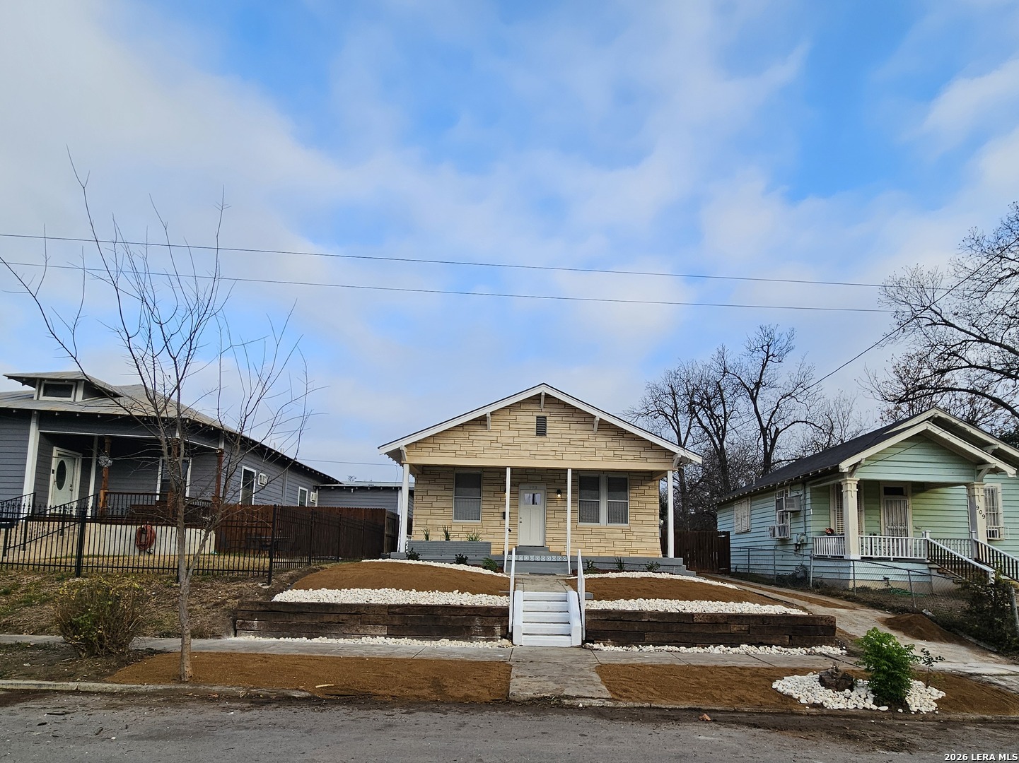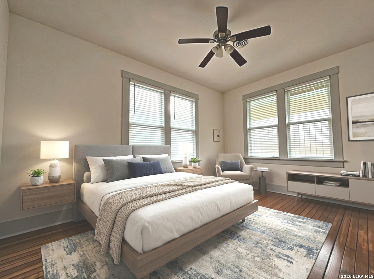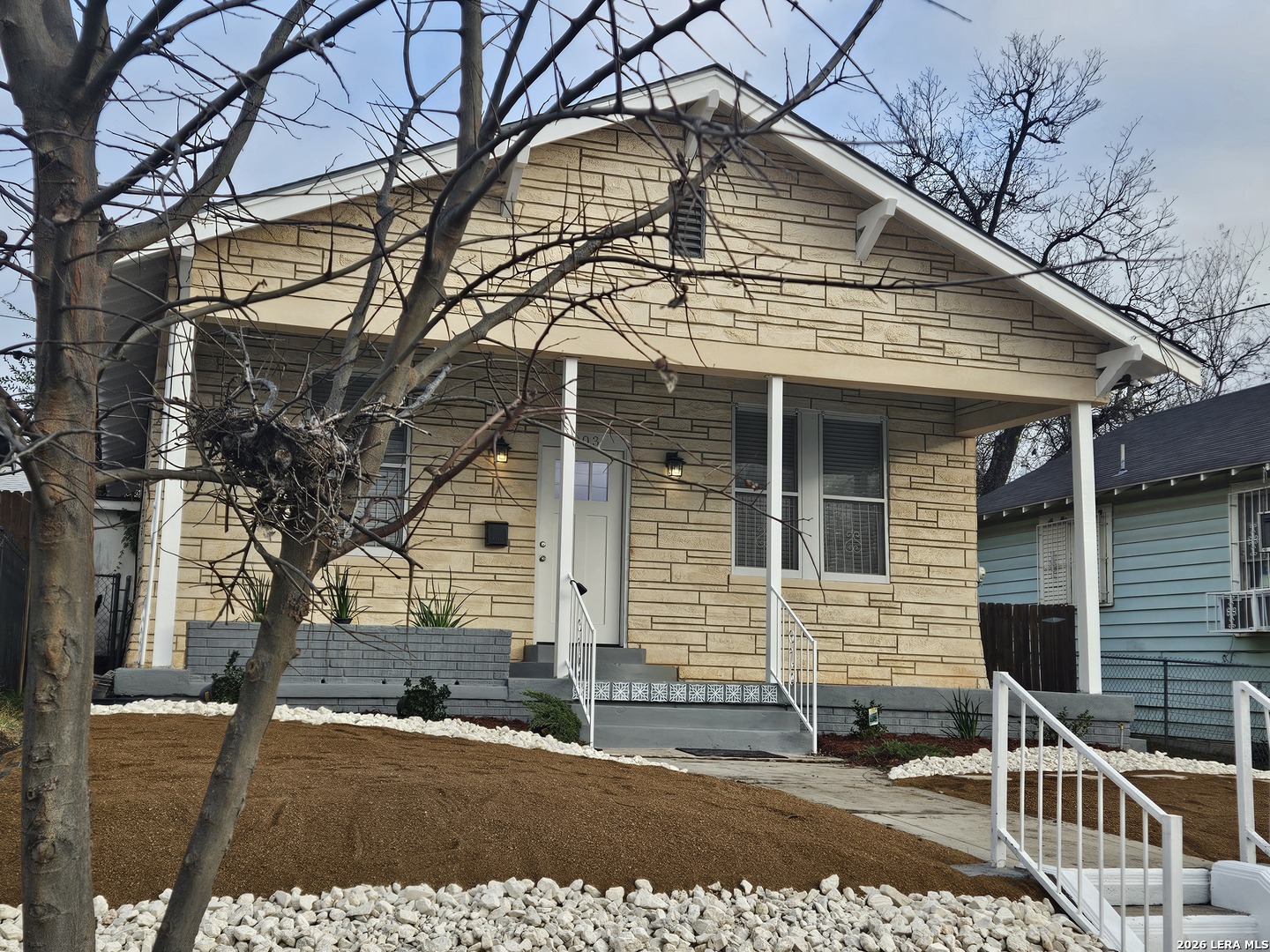 Lovely home has been refreshed and landscaped. Enter into living/dining area with lots of windows, high ceilings and gleaming wood floors. Kitchen has original features with beautiful tile counters and double sink with hardwood cutting board surround. Home features two nice sized bedrooms with connecting bath. Bathroom has a tub/shower combination, single vanity and lots of storage cabinets and linen shelves. There are hardwood floors throughout, a covered front porch and tiered landscaped front yard with easy care crushed granite and rock design. Eastside of downtown San Antonio-the Alamo Dome side.
