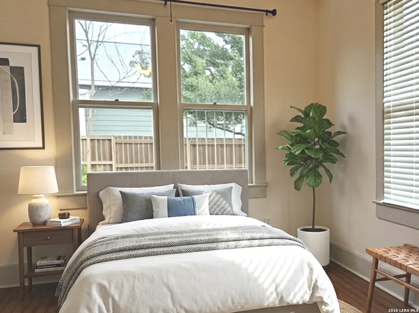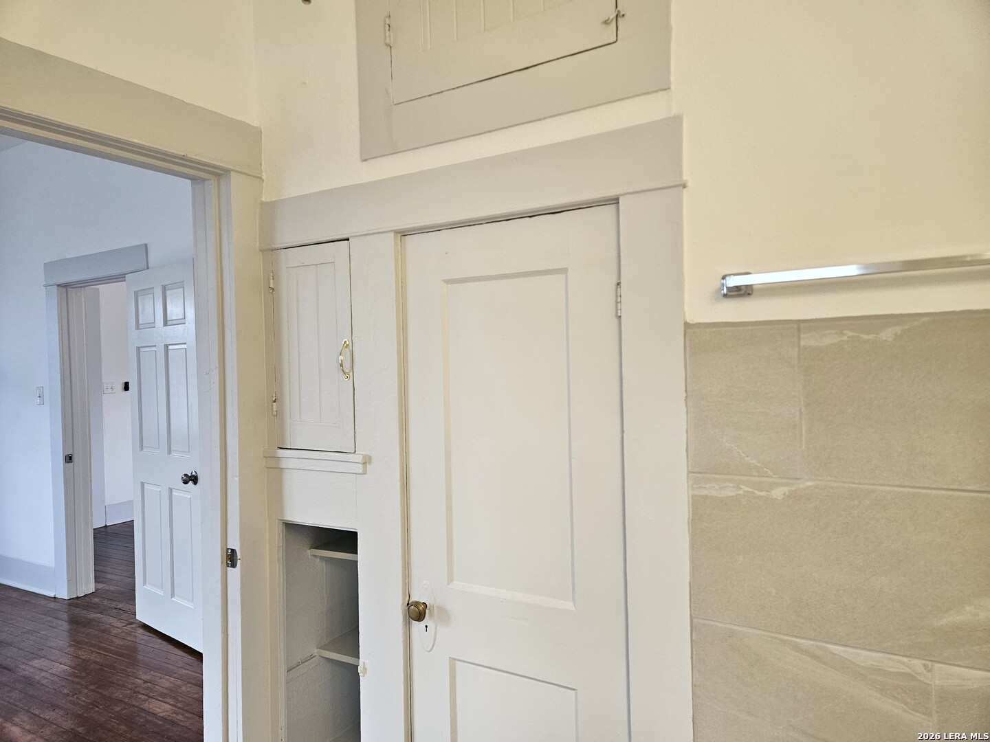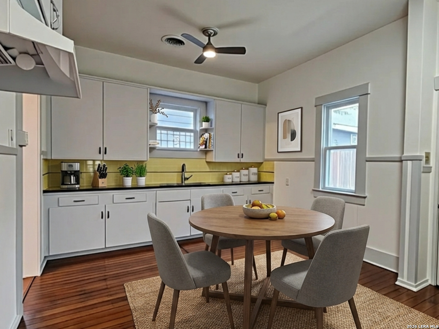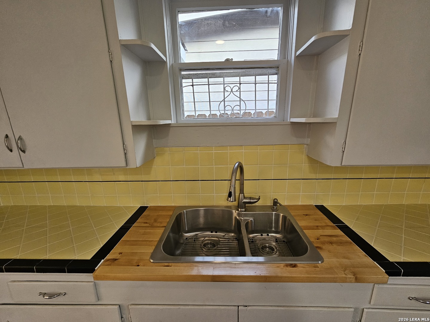 Lovely home has been refreshed and landscaped. Enter into living/dining area with lots of windows, high ceilings and gleaming wood floors. Kitchen has original features with beautiful tile counters and double sink with hardwood cutting board surround. Home features two nice sized bedrooms with connecting bath. Bathroom has a tub/shower combination, single vanity and lots of storage cabinets and linen shelves. There are hardwood floors throughout, a covered front porch and tiered landscaped front yard with easy care crushed granite and rock design. Eastside of downtown San Antonio-the Alamo Dome side.