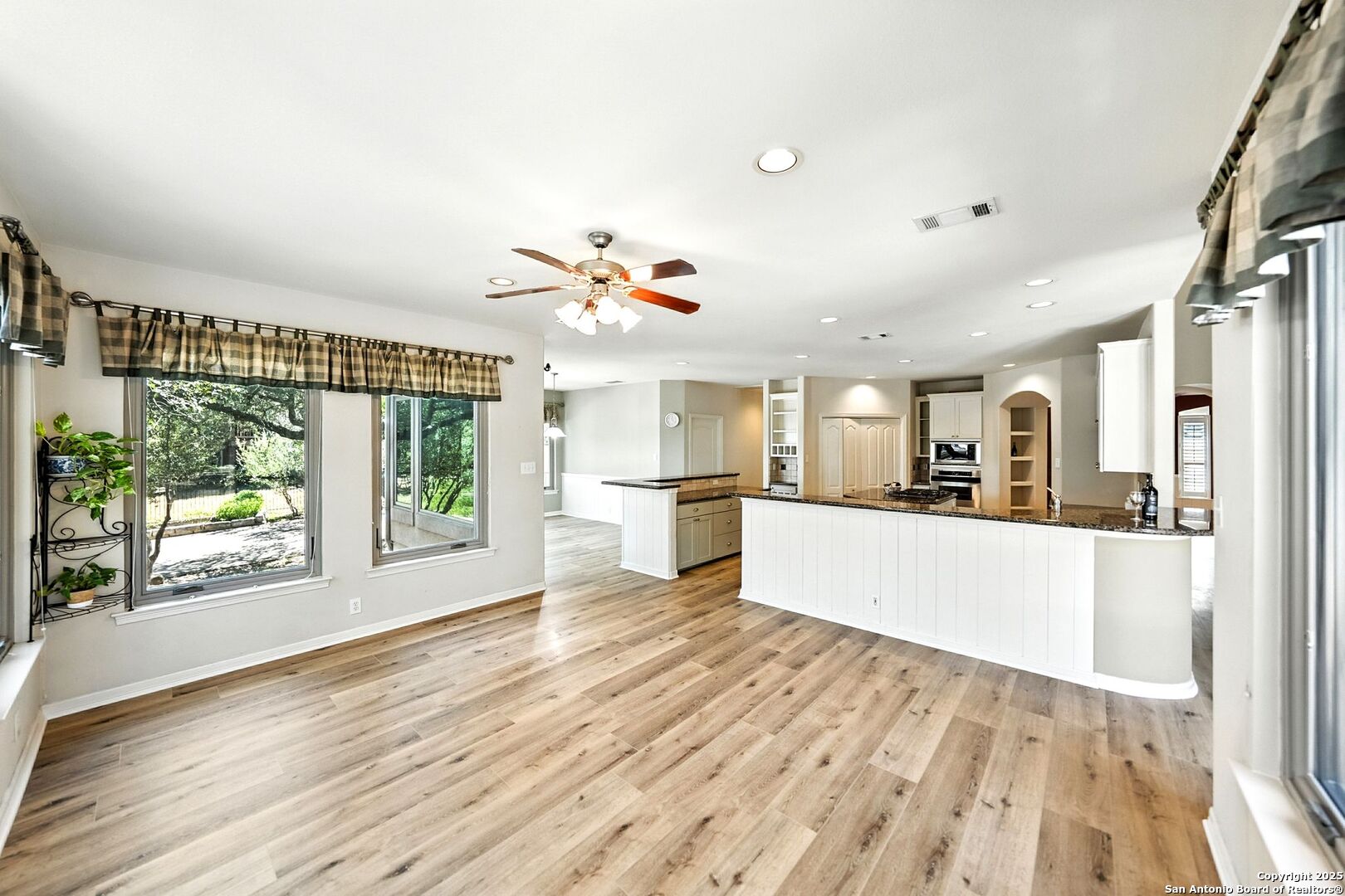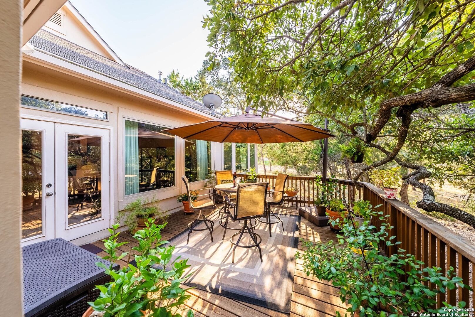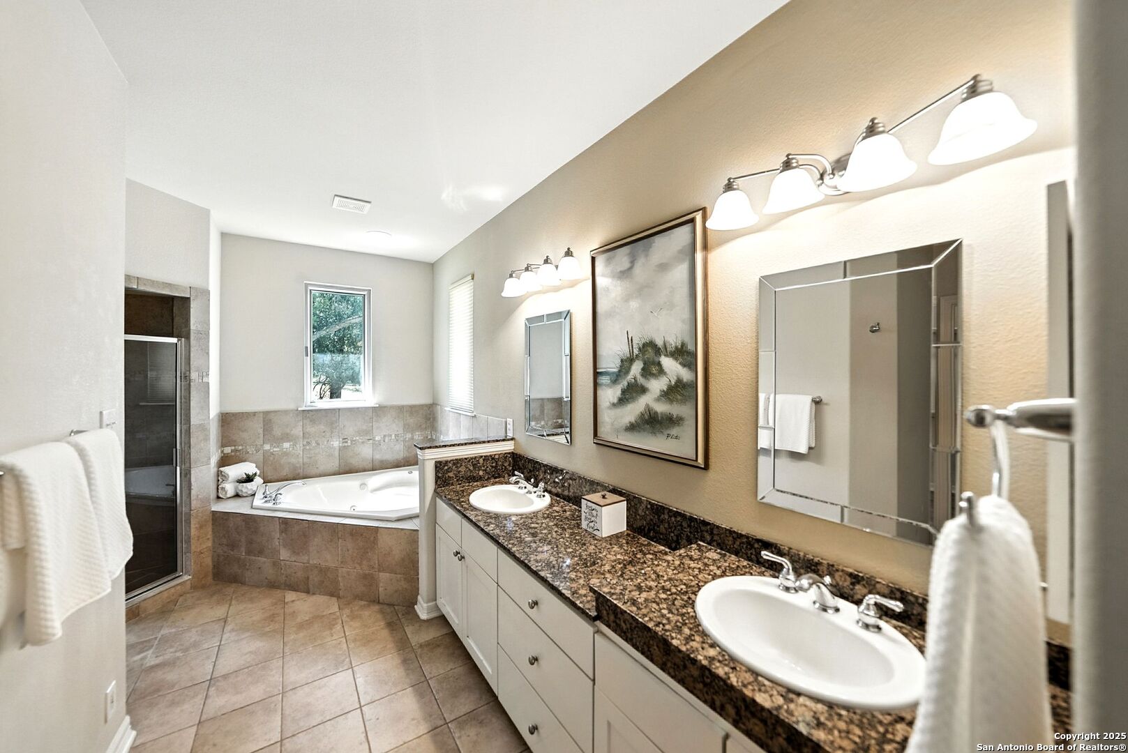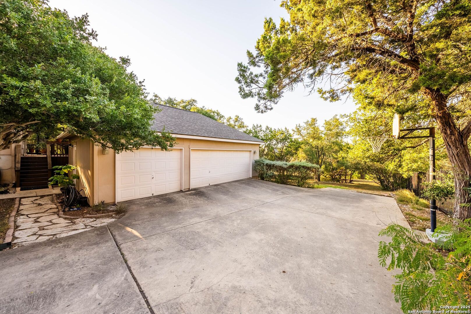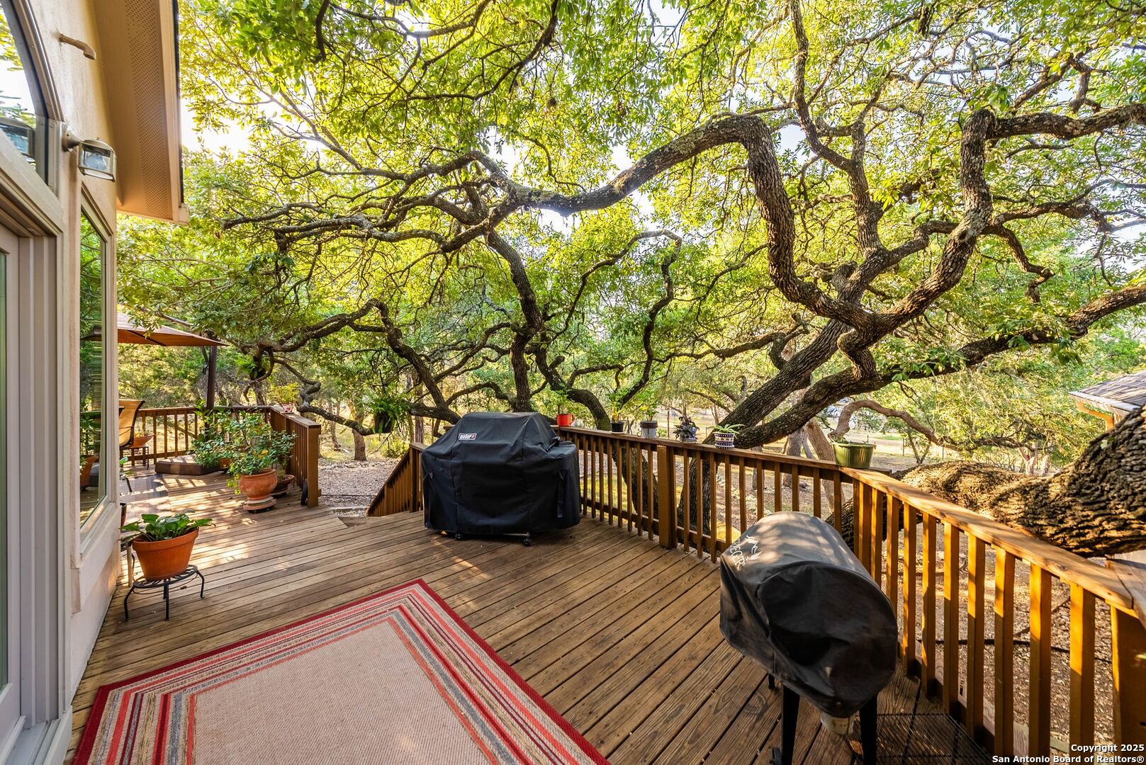 WOW! OPEN HOUSE SUN 11-4. BACK ON MARKET AFTER RENOVATION WITH NEW LUXURY FLOORING WITH NEWER ANDERSON WINDOWS. COME AND SEE AMAZING NEW LUXURY WOOD PLANK FLOORING THROUGHOUT DOWNSTAIRS! STUNNING & TIMELESS! Beautifully updated 4BD/4BA custom home with 3-car garage on a gated .75-acre lot in coveted Georg Ranch. Newly installed luxury vinyl wood planking throughout the downstairs living areas adds a timeless modern Texas Hill Country Style plus durability that is perfect for gatherings and entertaining. Multiple living areas include an open great room floor plan featuring soaring ceilings, floor-to-ceiling stone fireplace, and new Anderson floor to ceiling windows showcasing the beauty of your outdoor deck and the majestic oaks in your private countryside backyard. Chef's kitchen boasts granite counters, custom cabinetry with drawer and pullouts, endless counterspace, large pantry, gas range, and island for gathering. Step into your Spa-like owner's suite offering a coffee bar and amazing views of your mature oaks; And there is a guest ensuite downstairs plus two guest ensuites upstairs, plus an office/media room that could be a 5th bedroom. Lots of storage and walk-in closets in all bedrooms. The oversized garage with workshop provide flexibility & parking for RV/Boat on long driveway, plus ample front parking for guests. And enjoy the private Georg Ranch community park, playground, and sports courts. Minutes to San Antonio, airport, HEB, dining, lakes, wineries and all the Hill Country attractions as well as military bases. Easy Texas Hill Country living is found here today in Georg Ranch in this stunning custom home.