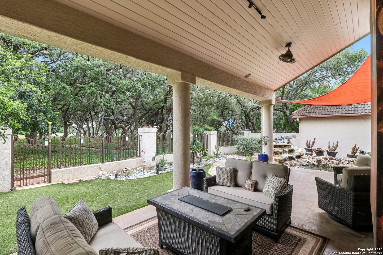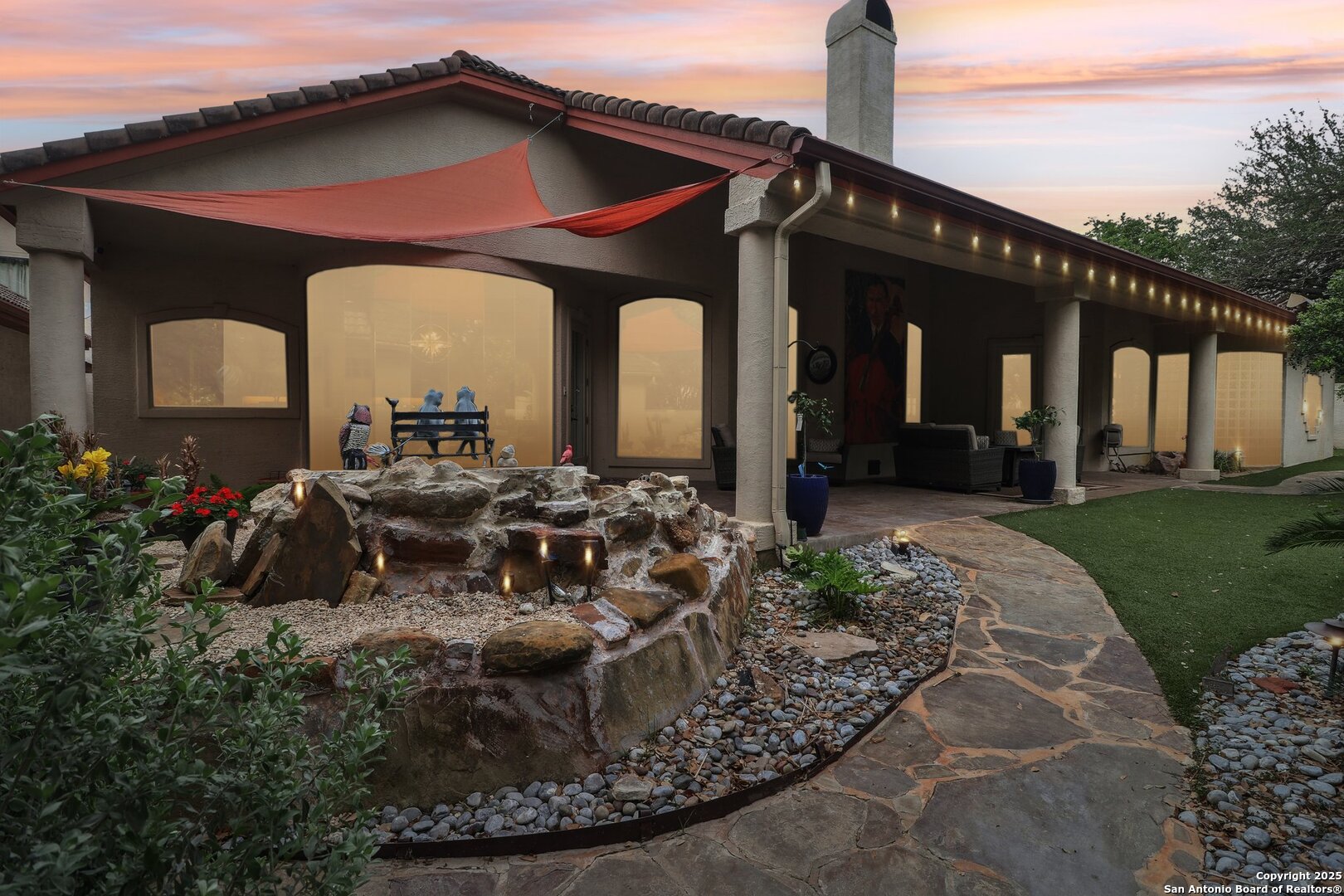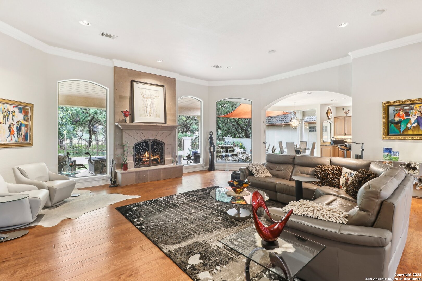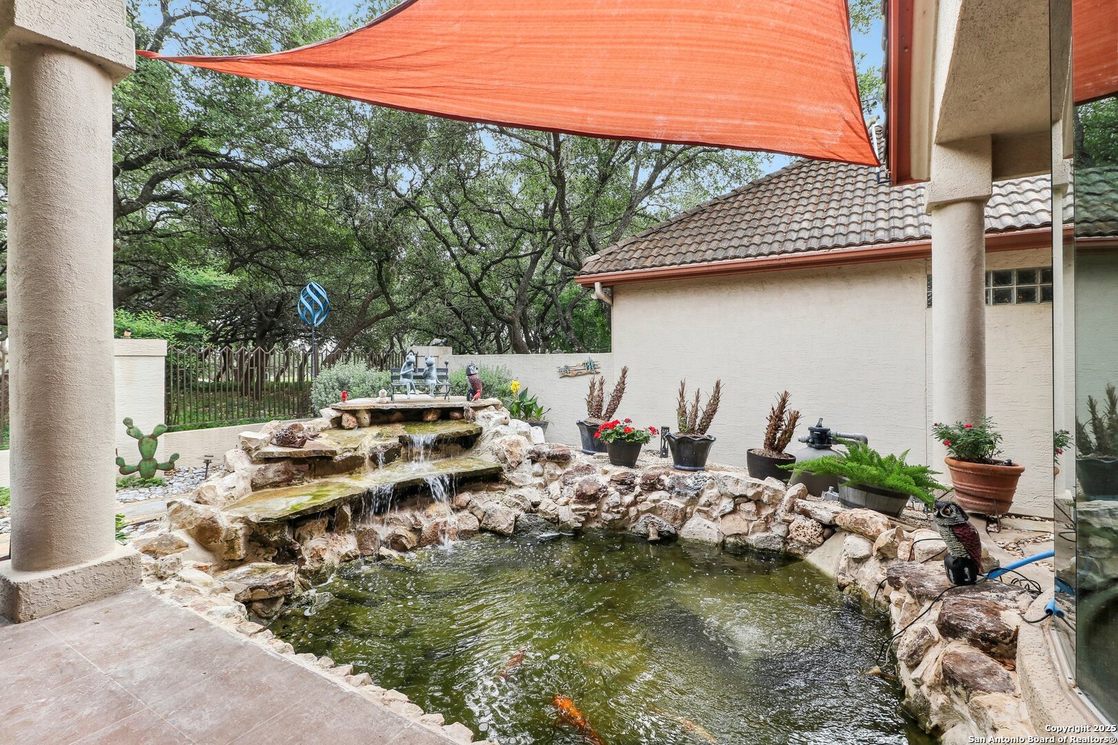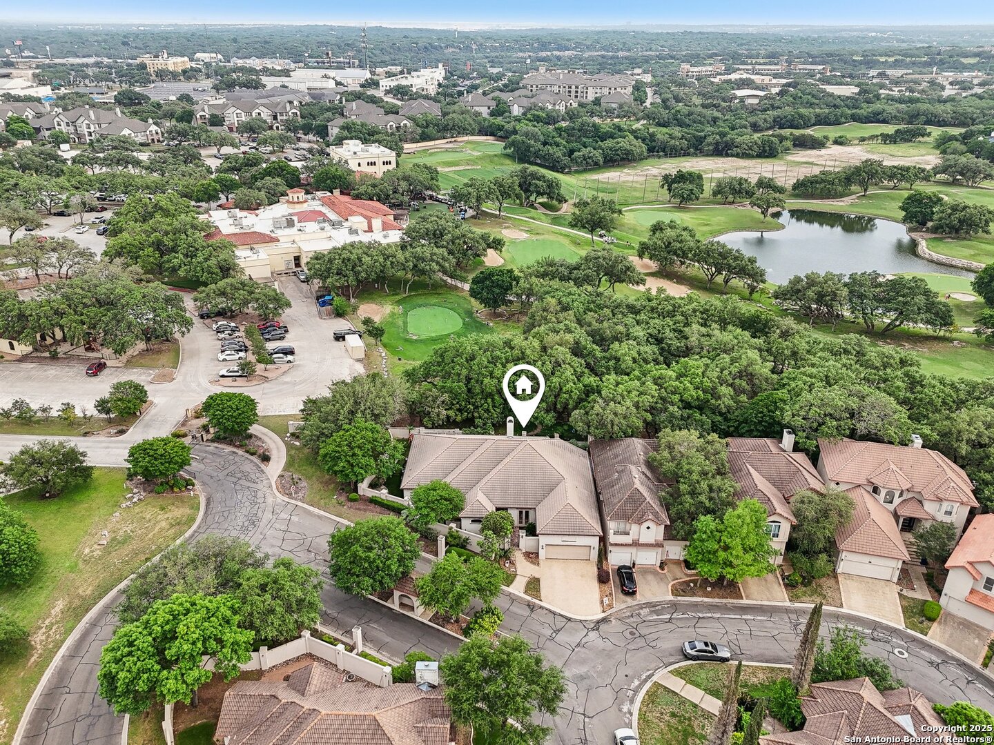 Located within the exclusive gates of The Club at Sonterra, this elegant single-story home offers over 3,300 sq ft of living space. With 3 bedrooms, 2.5 baths, a dedicated home office, dining room, oversized family room, wine bar, and a large walk-in storage area, this home offers something for everyone. Designed for entertaining, the kitchen is outfitted with high-end appliances, including a convection cooktop, a built-in refrigerator, and a large wine fridge. Step outside to a backyard oasis featuring a tranquil koi pond and direct golf course views- all just a short walk to the main clubhouse for dining, golf, and events. Inside, you'll find a light-filled open layout, a cozy fireplace, and timeless finishes. Located in the Waters at Sonterra neighborhood, surrounded by mature landscaping and access to top-rated NEISD schools, this home offers the perfect balance of luxury and lifestyle.
