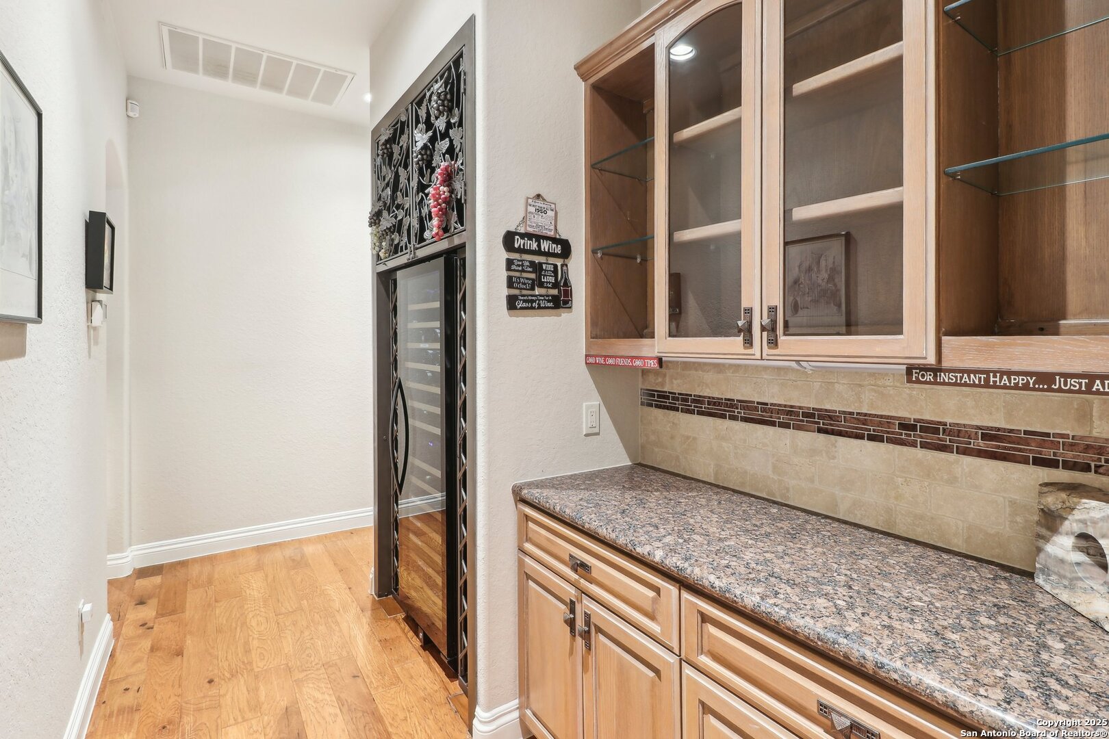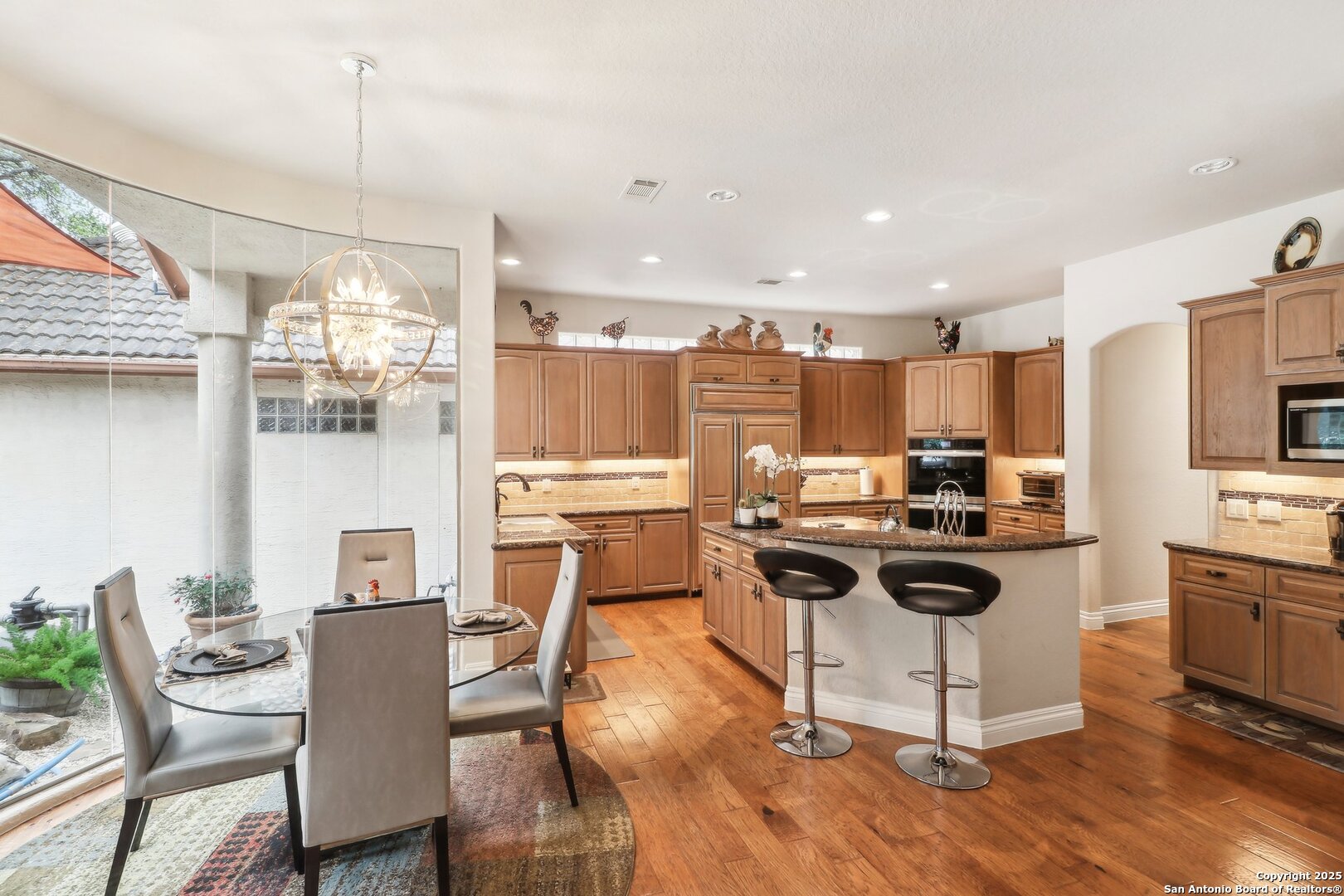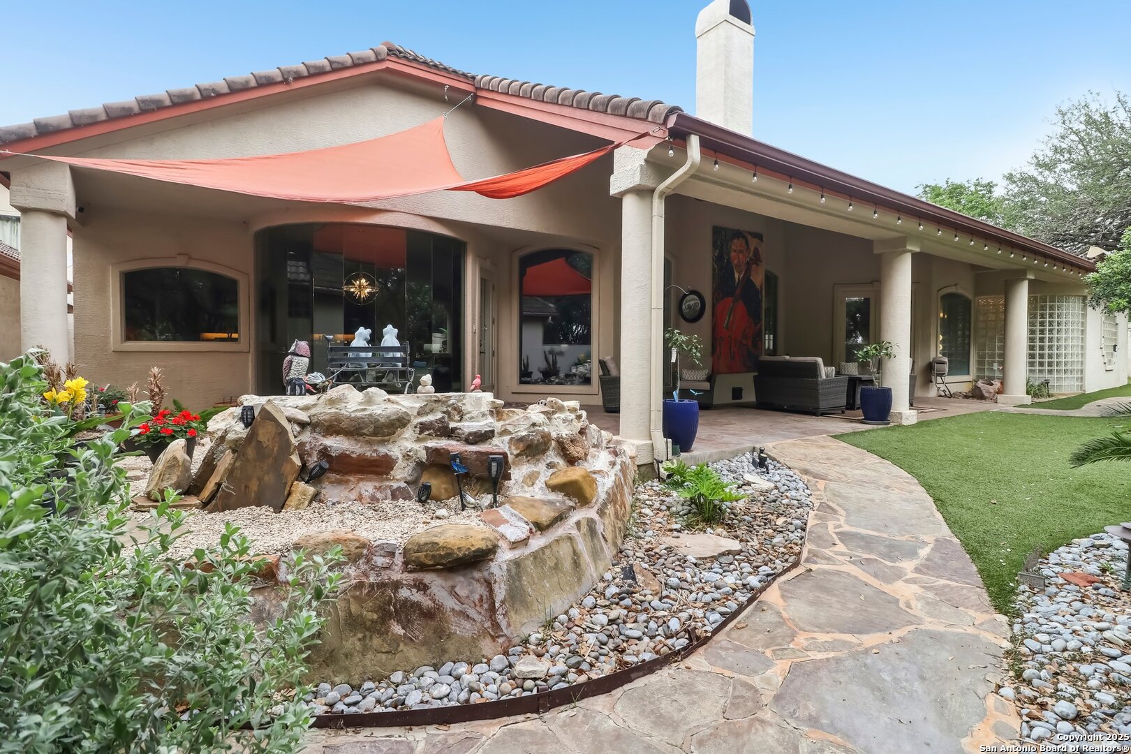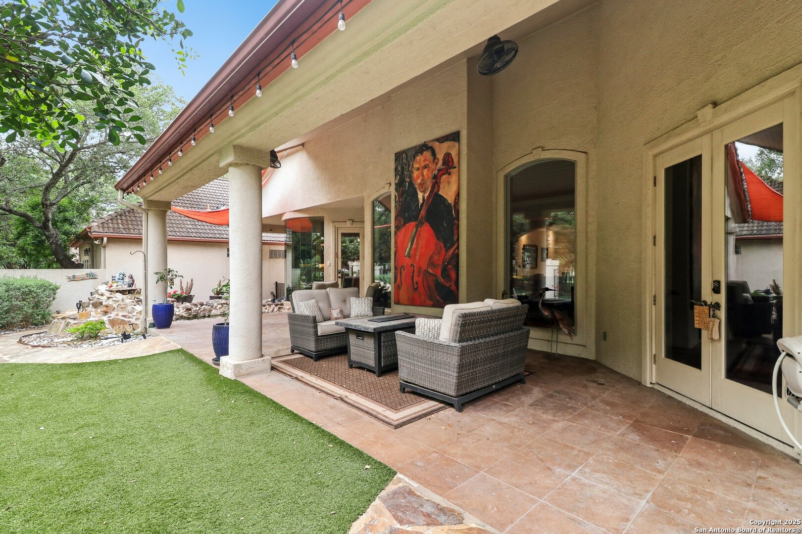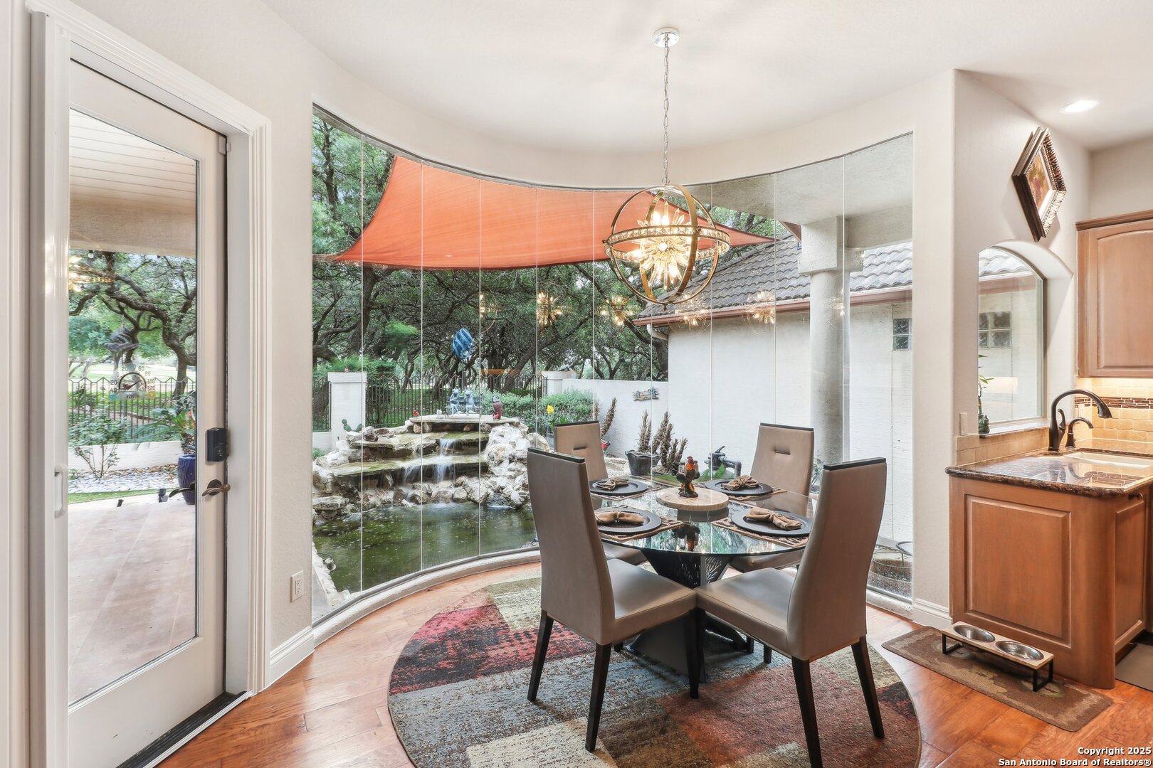 Located within the exclusive gates of The Club at Sonterra, this elegant single-story home offers over 3,300 sq ft of living space. With 3 bedrooms, 2.5 baths, a dedicated home office, dining room, oversized family room, wine bar, and a large walk-in storage area, this home offers something for everyone. Designed for entertaining, the kitchen is outfitted with high-end appliances, including a convection cooktop, a built-in refrigerator, and a large wine fridge. Step outside to a backyard oasis featuring a tranquil koi pond and direct golf course views- all just a short walk to the main clubhouse for dining, golf, and events. Inside, you'll find a light-filled open layout, a cozy fireplace, and timeless finishes. Located in the Waters at Sonterra neighborhood, surrounded by mature landscaping and access to top-rated NEISD schools, this home offers the perfect balance of luxury and lifestyle.