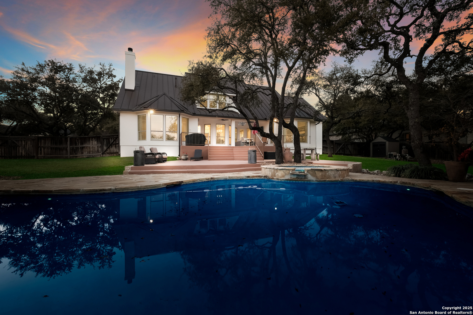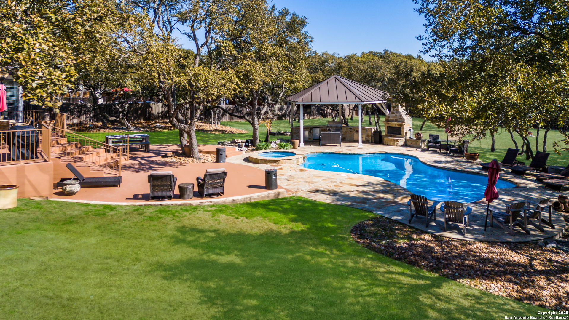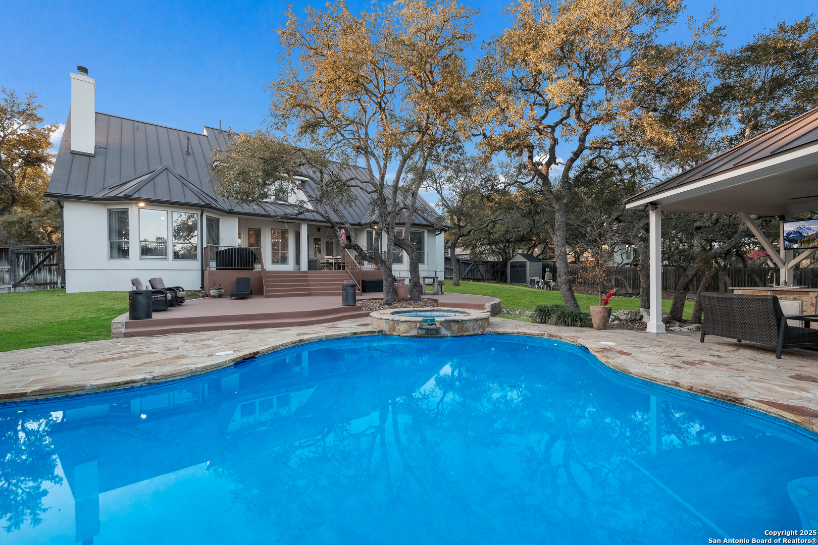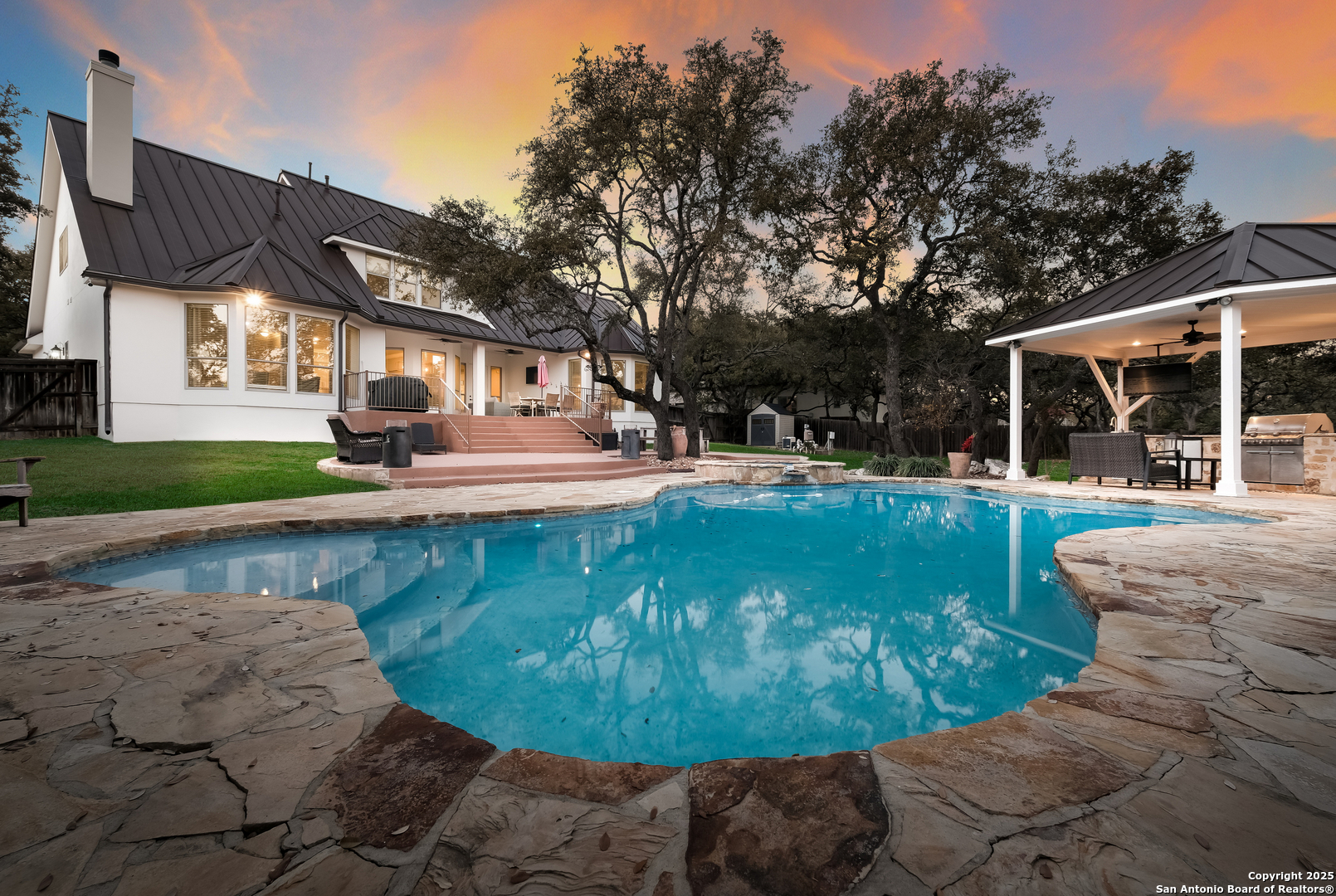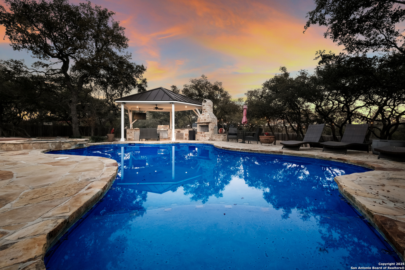 Discover your private hill country retreat set on 1.14 acres right in the heart of Stone Oak! This stunning home offers resort style living with all the conveniences of city life. Step outside to your personal oasis featuring a sparkling pool with an adjoining spa, perfect for relaxing or entertaining. Enjoy summer gatherings under the covered gazebo adjacent to the outdoor kitchen, or unwind on the expansive covered patio and freshly stained concrete patio-ideal for al fresco dining and enjoying those warm San Antonio evenings. Inside, the home boasts 4 spacious bedrooms, 3.5 modern bathrooms, a dedicated study, and a fun gameroom. The fully upgraded kitchen is a chef's dream, featuring high end cabinets, premium appliances with double ovens, gas cooking, a generous island, and a walk-in pantry. Elegant wood and tile flooring flow seamlessly throughout, ensuring a chic, low-maintenance lifestyle-no carpet in sight! The primary bedroom is conveniently located on the main level and offers private access to the outdoor patio and pool. It's a luxurious haven complete with a huge walk-in closet, a spa-like ensuite featuring a separate shower, and a relaxing garden tub. Additional highlights include a durable metal roof, fresh exterior paint, an oversized laundry room with sink and cabinets, and a spacious 3-car garage. Zoned to top-rated NEISD schools, this exceptional home perfectly blends the tranquility of hill country living with modern amenities and convenience.