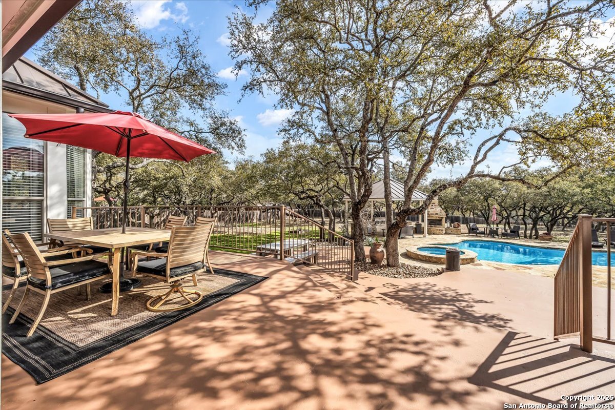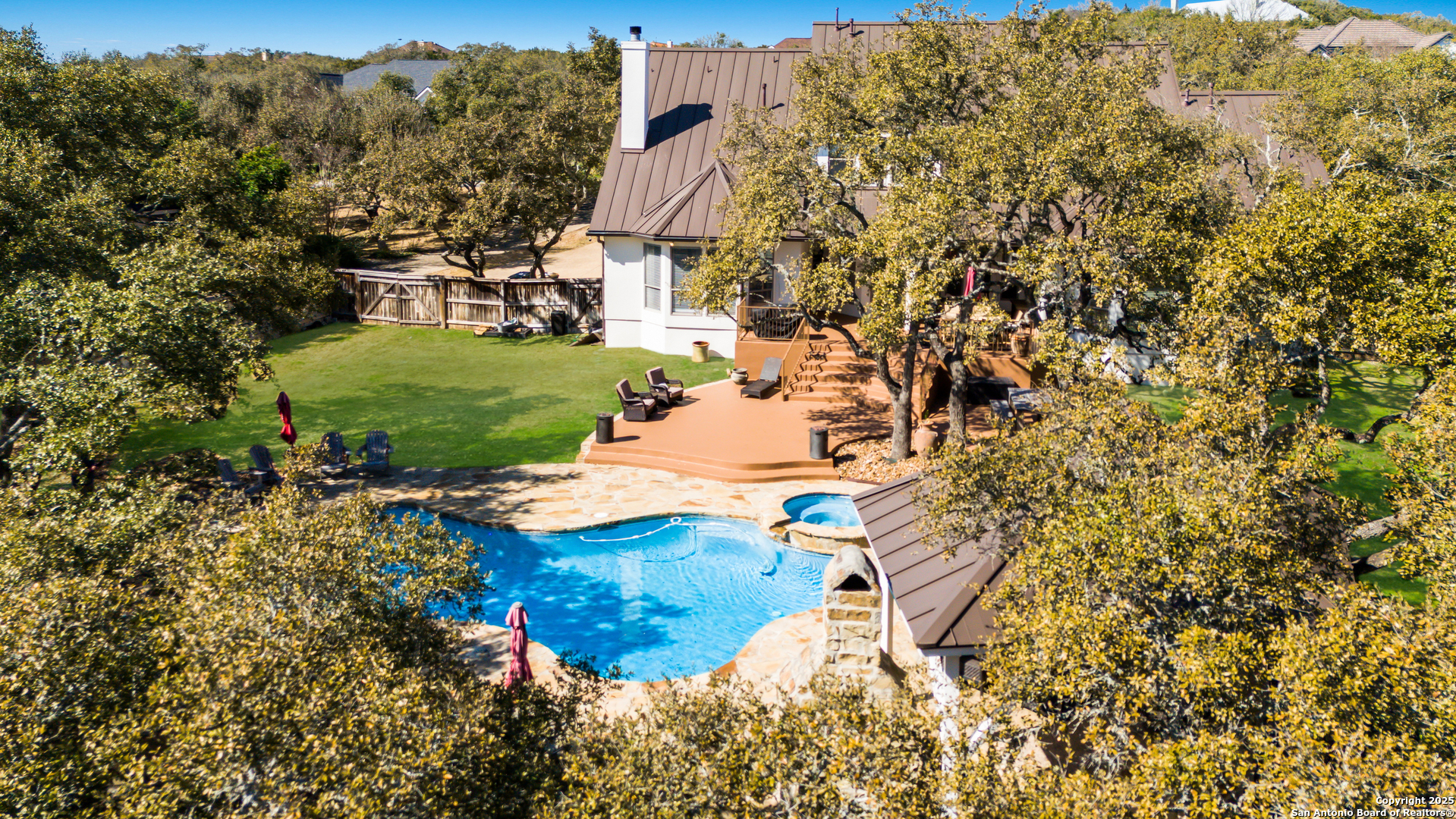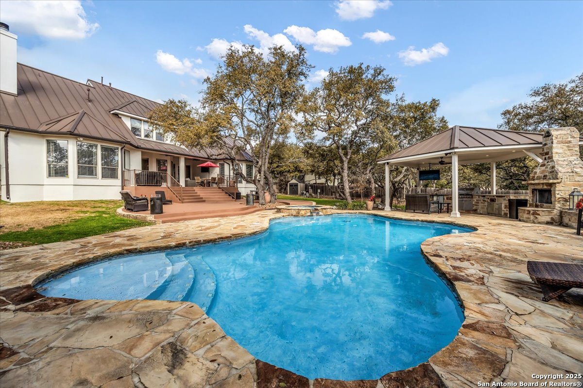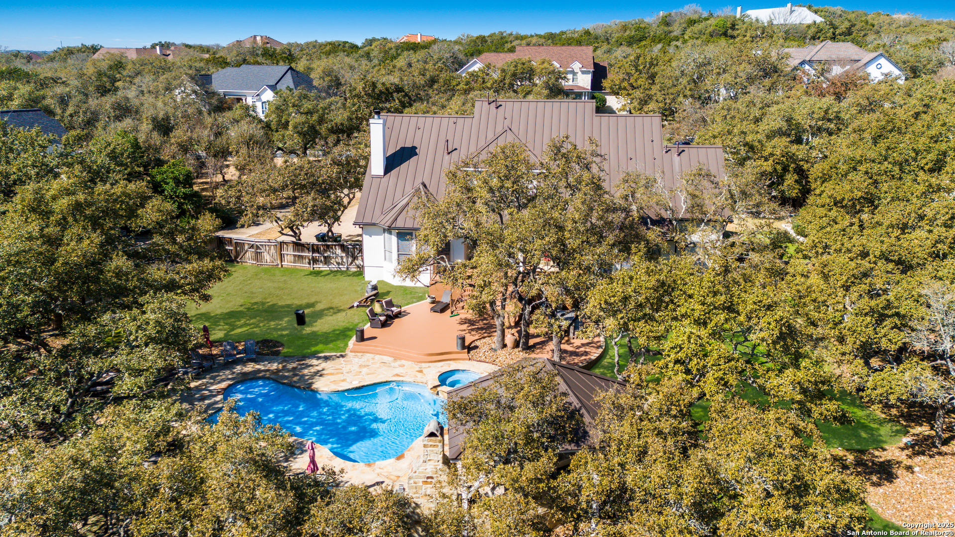 Discover your private hill country retreat set on 1.14 acres right in the heart of Stone Oak! This stunning home offers resort style living with all the conveniences of city life. Step outside to your personal oasis featuring a sparkling pool with an adjoining spa, perfect for relaxing or entertaining. Enjoy summer gatherings under the covered gazebo adjacent to the outdoor kitchen, or unwind on the expansive covered patio and freshly stained concrete patio-ideal for al fresco dining and enjoying those warm San Antonio evenings. Inside, the home boasts 4 spacious bedrooms, 3.5 modern bathrooms, a dedicated study, and a fun gameroom. The fully upgraded kitchen is a chef's dream, featuring high end cabinets, premium appliances with double ovens, gas cooking, a generous island, and a walk-in pantry. Elegant wood and tile flooring flow seamlessly throughout, ensuring a chic, low-maintenance lifestyle-no carpet in sight! The primary bedroom is conveniently located on the main level and offers private access to the outdoor patio and pool. It's a luxurious haven complete with a huge walk-in closet, a spa-like ensuite featuring a separate shower, and a relaxing garden tub. Additional highlights include a durable metal roof, fresh exterior paint, an oversized laundry room with sink and cabinets, and a spacious 3-car garage. Zoned to top-rated NEISD schools, this exceptional home perfectly blends the tranquility of hill country living with modern amenities and convenience.
