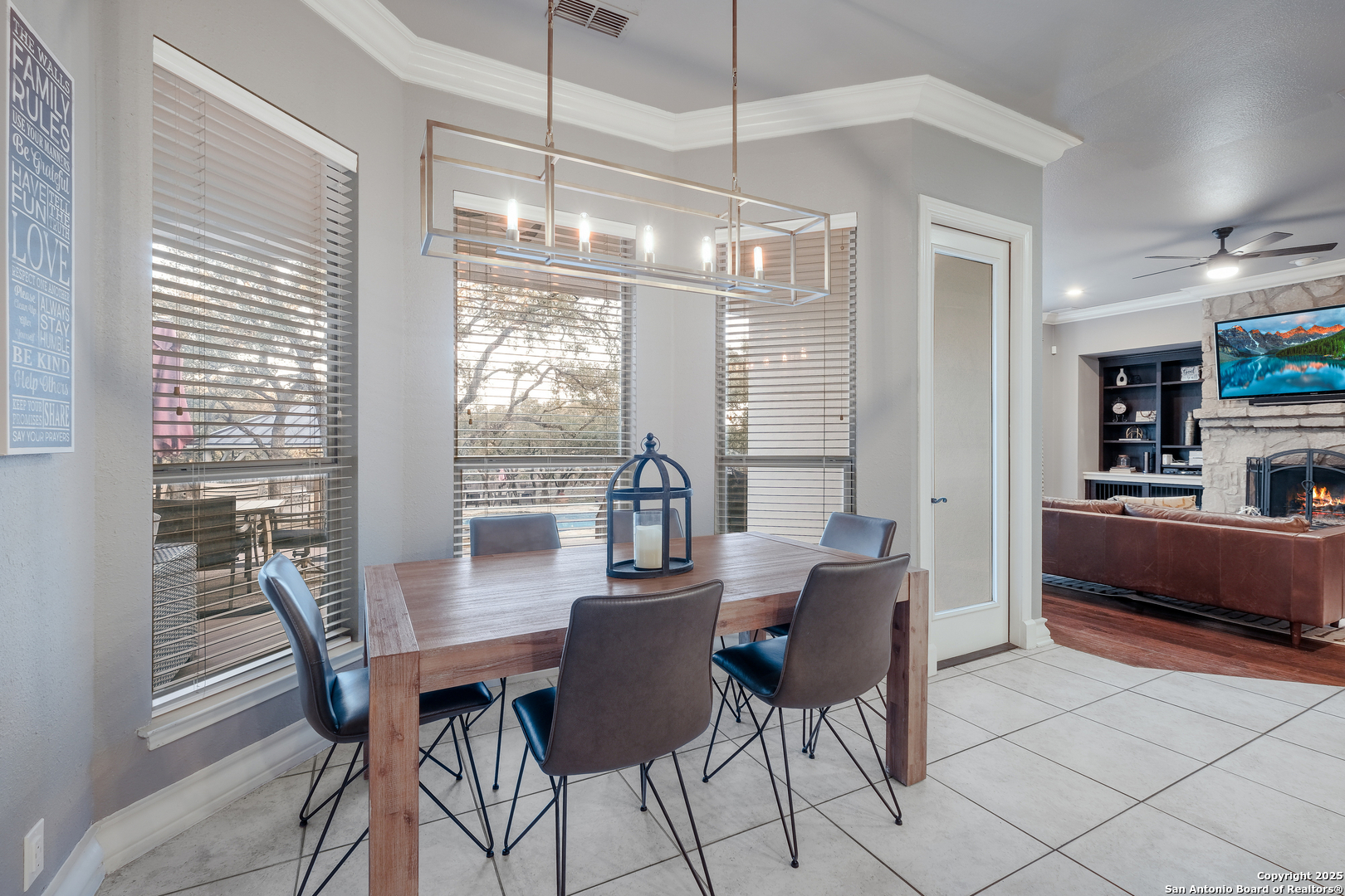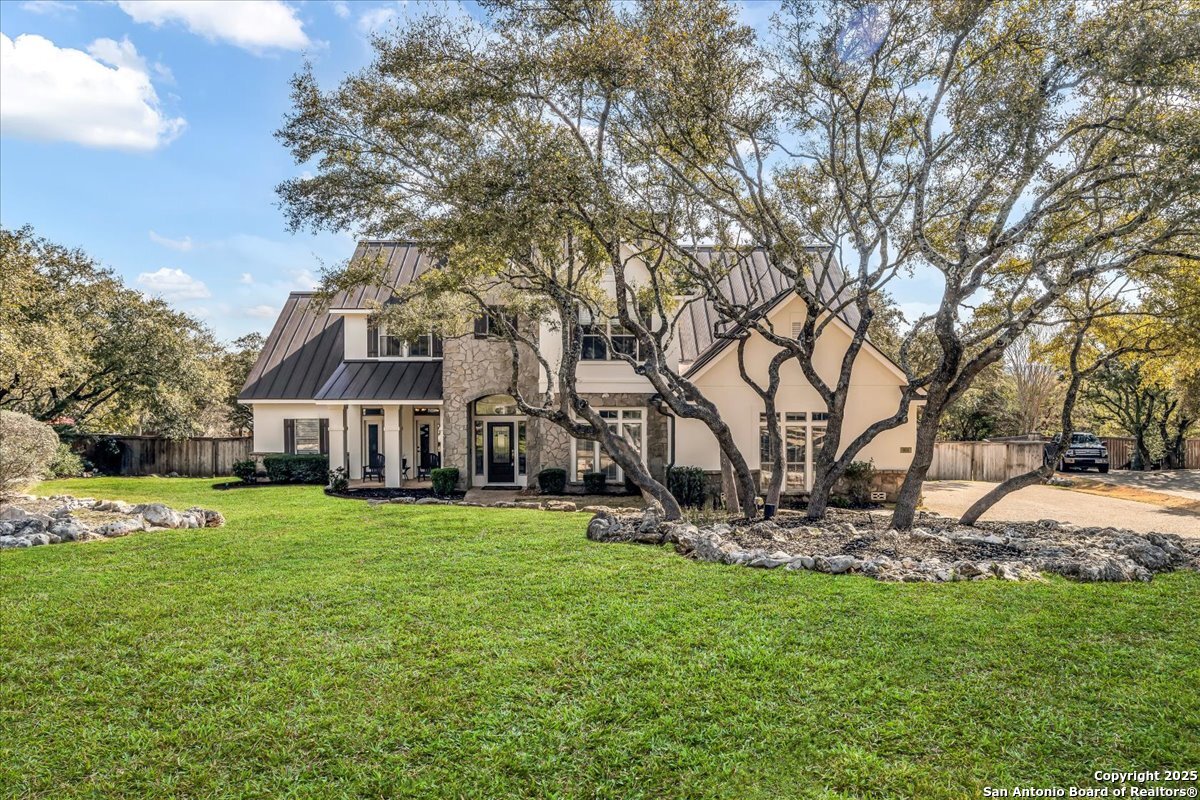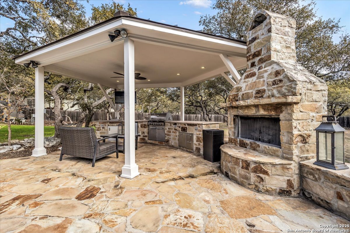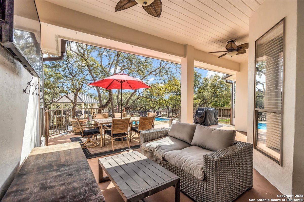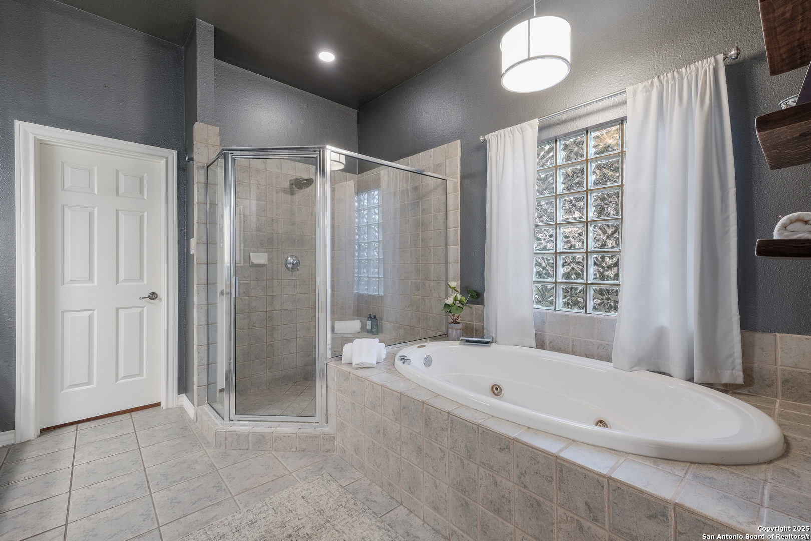 Discover your private hill country retreat set on 1.14 acres right in the heart of Stone Oak! This stunning home offers resort style living with all the conveniences of city life. Step outside to your personal oasis featuring a sparkling pool with an adjoining spa, perfect for relaxing or entertaining. Enjoy summer gatherings under the covered gazebo adjacent to the outdoor kitchen, or unwind on the expansive covered patio and freshly stained concrete patio-ideal for al fresco dining and enjoying those warm San Antonio evenings. Inside, the home boasts 4 spacious bedrooms, 3.5 modern bathrooms, a dedicated study, and a fun gameroom. The fully upgraded kitchen is a chef's dream, featuring high end cabinets, premium appliances with double ovens, gas cooking, a generous island, and a walk-in pantry. Elegant wood and tile flooring flow seamlessly throughout, ensuring a chic, low-maintenance lifestyle-no carpet in sight! The primary bedroom is conveniently located on the main level and offers private access to the outdoor patio and pool. It's a luxurious haven complete with a huge walk-in closet, a spa-like ensuite featuring a separate shower, and a relaxing garden tub. Additional highlights include a durable metal roof, fresh exterior paint, an oversized laundry room with sink and cabinets, and a spacious 3-car garage. Zoned to top-rated NEISD schools, this exceptional home perfectly blends the tranquility of hill country living with modern amenities and convenience.