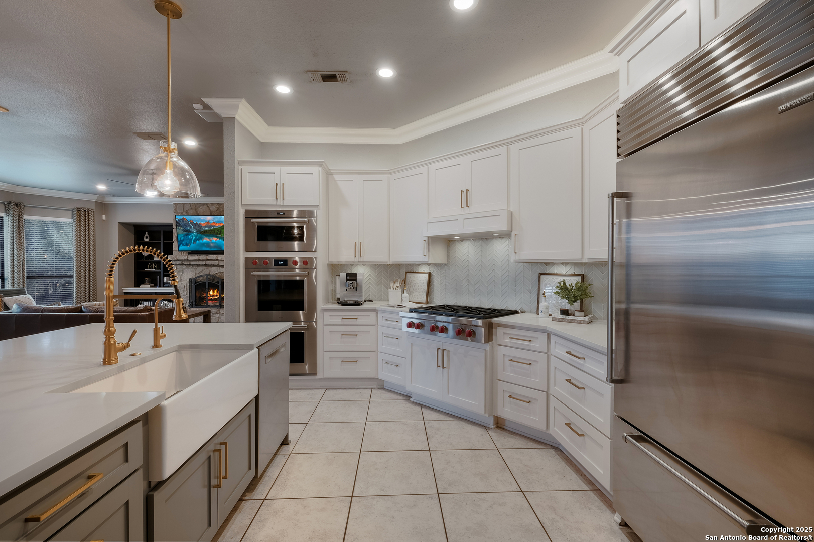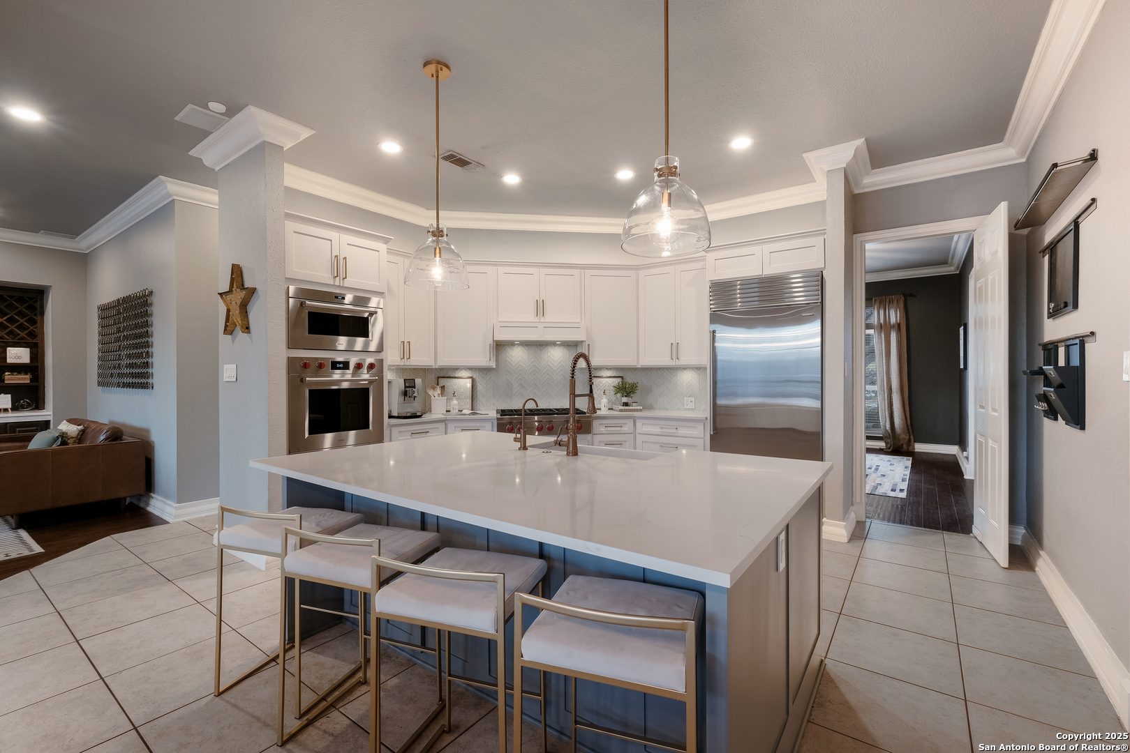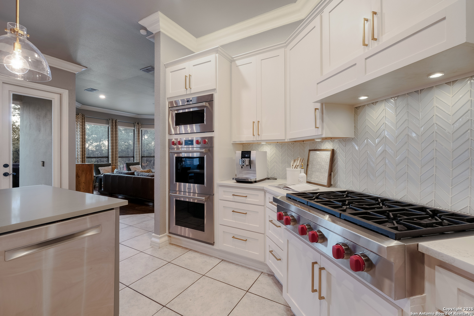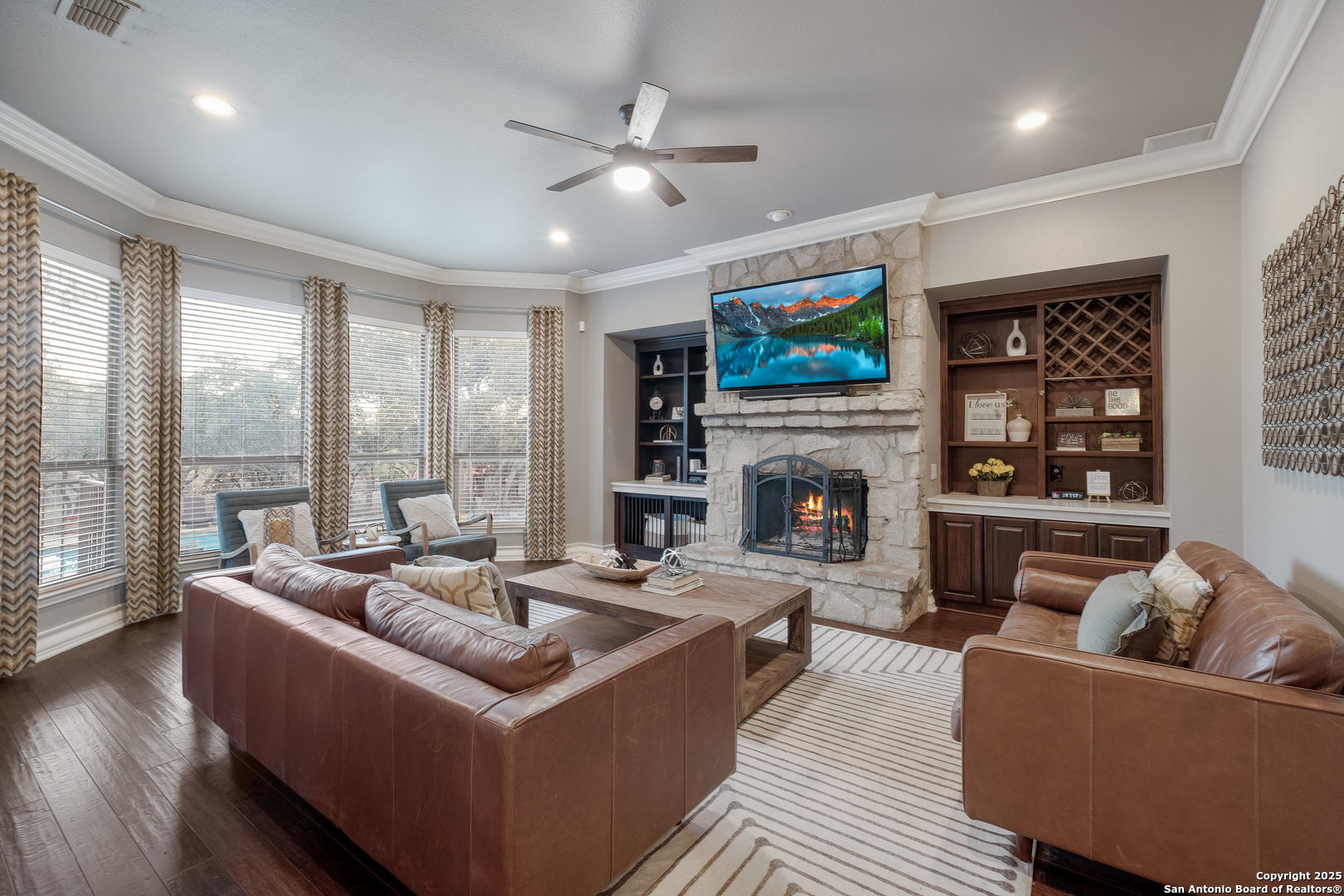 Discover your private hill country retreat set on 1.14 acres right in the heart of Stone Oak! This stunning home offers resort style living with all the conveniences of city life. Step outside to your personal oasis featuring a sparkling pool with an adjoining spa, perfect for relaxing or entertaining. Enjoy summer gatherings under the covered gazebo adjacent to the outdoor kitchen, or unwind on the expansive covered patio and freshly stained concrete patio-ideal for al fresco dining and enjoying those warm San Antonio evenings. Inside, the home boasts 4 spacious bedrooms, 3.5 modern bathrooms, a dedicated study, and a fun gameroom. The fully upgraded kitchen is a chef's dream, featuring high end cabinets, premium appliances with double ovens, gas cooking, a generous island, and a walk-in pantry. Elegant wood and tile flooring flow seamlessly throughout, ensuring a chic, low-maintenance lifestyle-no carpet in sight! The primary bedroom is conveniently located on the main level and offers private access to the outdoor patio and pool. It's a luxurious haven complete with a huge walk-in closet, a spa-like ensuite featuring a separate shower, and a relaxing garden tub. Additional highlights include a durable metal roof, fresh exterior paint, an oversized laundry room with sink and cabinets, and a spacious 3-car garage. Zoned to top-rated NEISD schools, this exceptional home perfectly blends the tranquility of hill country living with modern amenities and convenience.