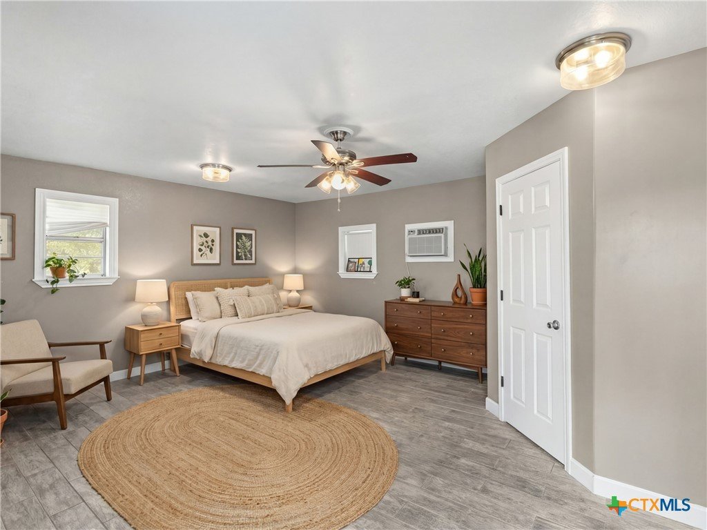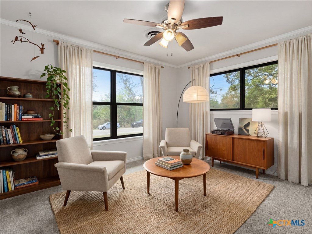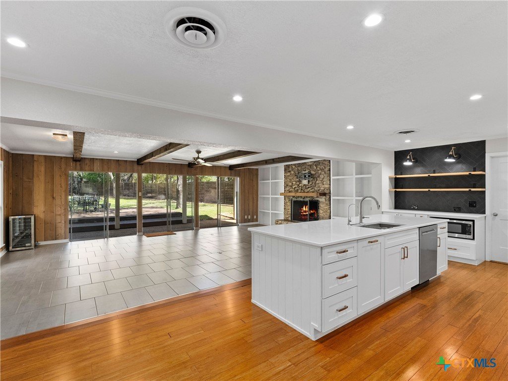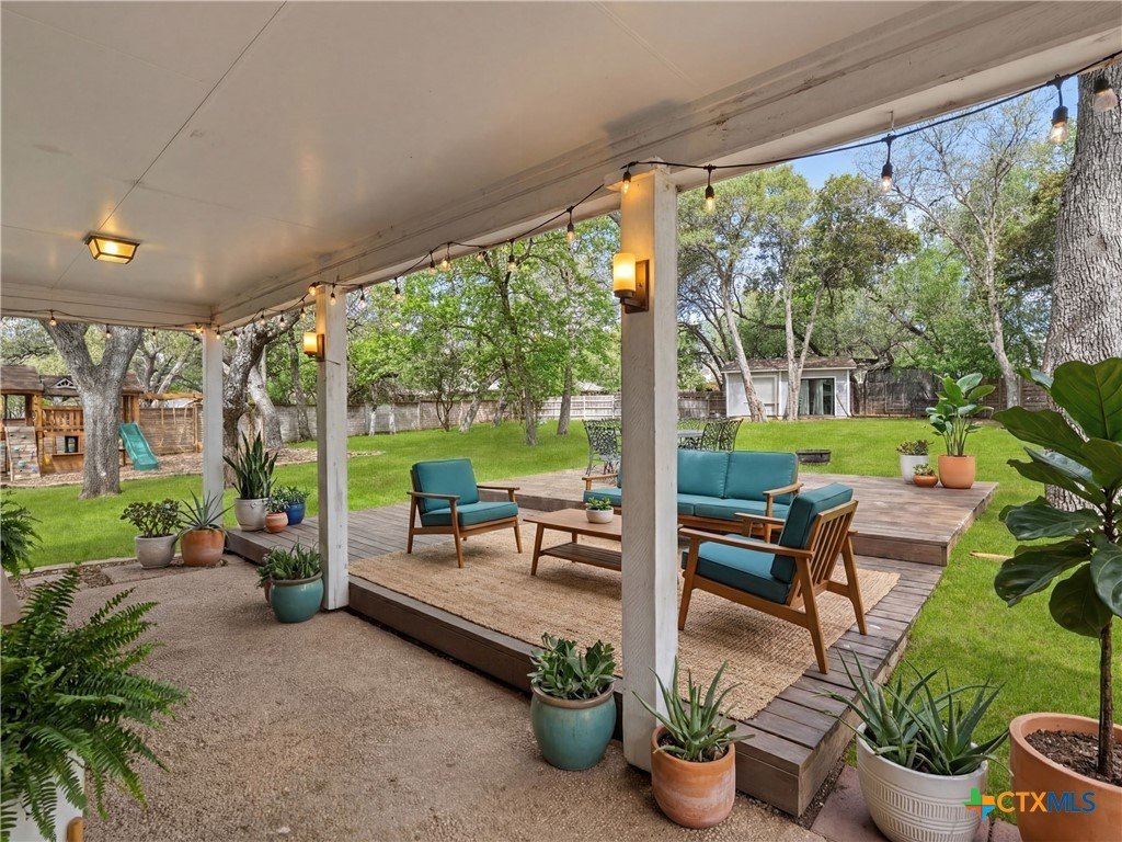 Perched on "The Hill" in coveted Landa Park Highlands, this one-of-a-kind property sits on a private half-acre lot shaded by mature trees. It is just steps from Panther Canyon Trail and a golf cart ride from downtown New Braunfels, Landa Park and Historic Gruene. The main home delivers 3 bedrooms, 2 full baths, and a game room with an open, airy layout anchored by beamed ceilings, crown molding, quartz countertops, and a chef's kitchen featuring a built-in gas range, double oven, kitchen island, and breakfast bar. A fully separate living space with its own bath and kitchenette provides exceptional flexibility perfect for a private home office or guest retreat. Enjoy the warmth of a fireplace, recessed lighting throughout, and 2-car garage. A rare find: private, elevated, and minutes from everything New Braunfels has to offer.