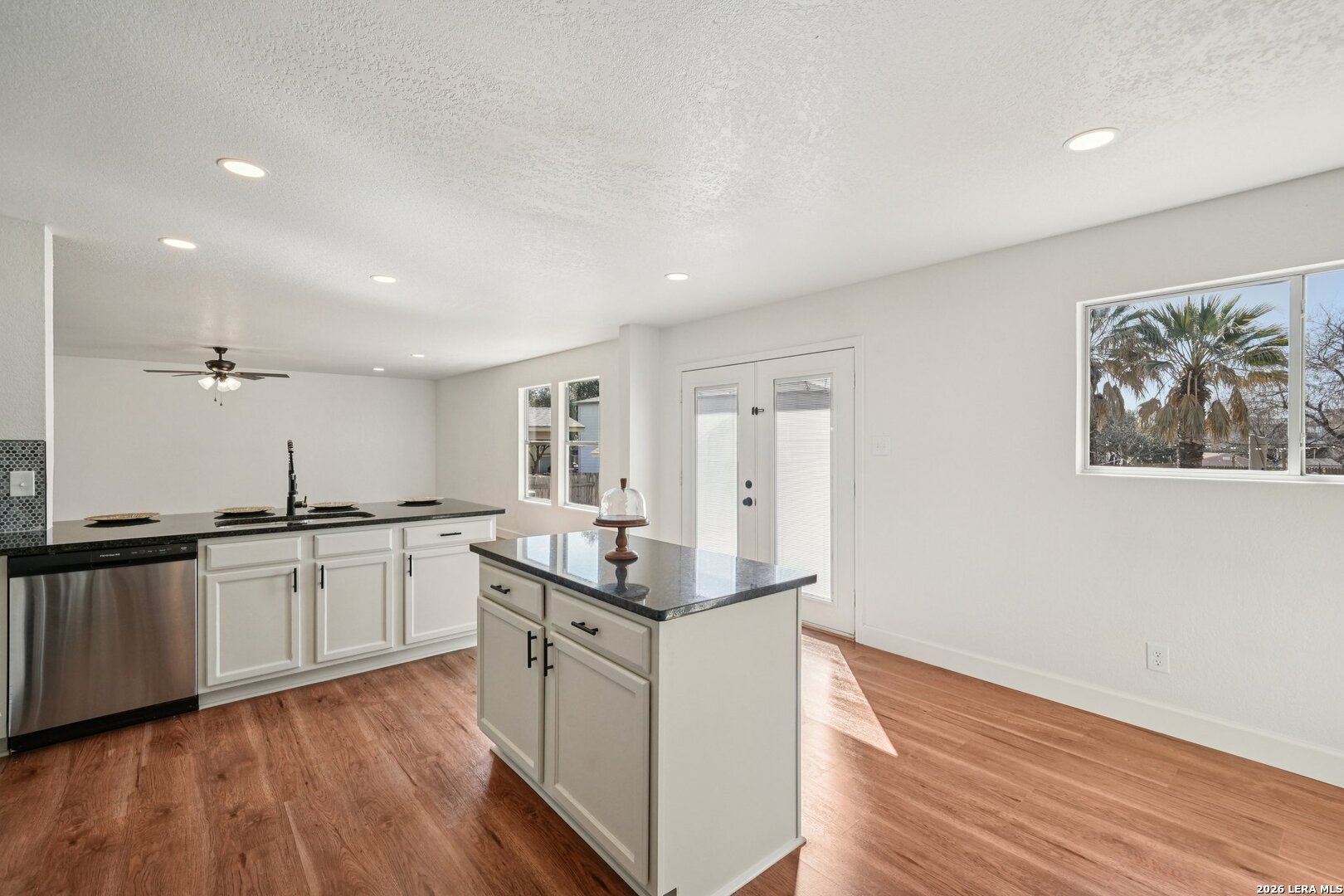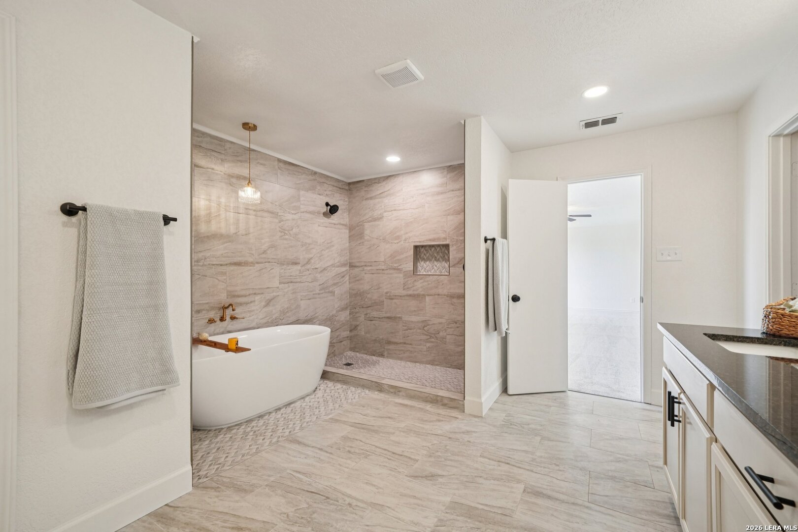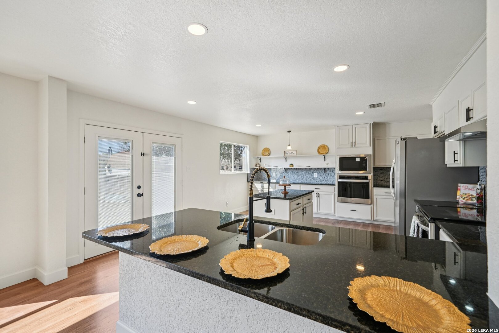 ** OPEN HOUSE on Saturday, 02/14/2026 from 12-2pm and Sunday 02/15/2026 from 12-2pm ** Fully renovated home in San Antonio TX showcasing thoughtful updates and clear pride of ownership throughout. This four bedroom home includes a flex room downstairs suitable for a home office or additional living space. Renovations include new flooring, fresh interior and exterior paint, new appliances, and a new A/C unit, resulting in a truly move in ready home. The open floor plan features multiple living areas and flows into the kitchen, which offers stainless steel appliances, granite countertops, a decorative backsplash, open shelving, ample cabinetry, and a large pantry. Recessed lighting is installed throughout, and a two car garage provides added convenience. The primary suite includes a spa like bathroom with a separate tiled shower, soaking tub, and double vanities. An upstairs guest bathroom also features double vanities. Additional upgrades include recessed lighting throughout and a programmable thermostat. This home reflects quality craftsmanship and careful attention to detail, offering modern comfort and flexible living spaces in a desirable San Antonio location.