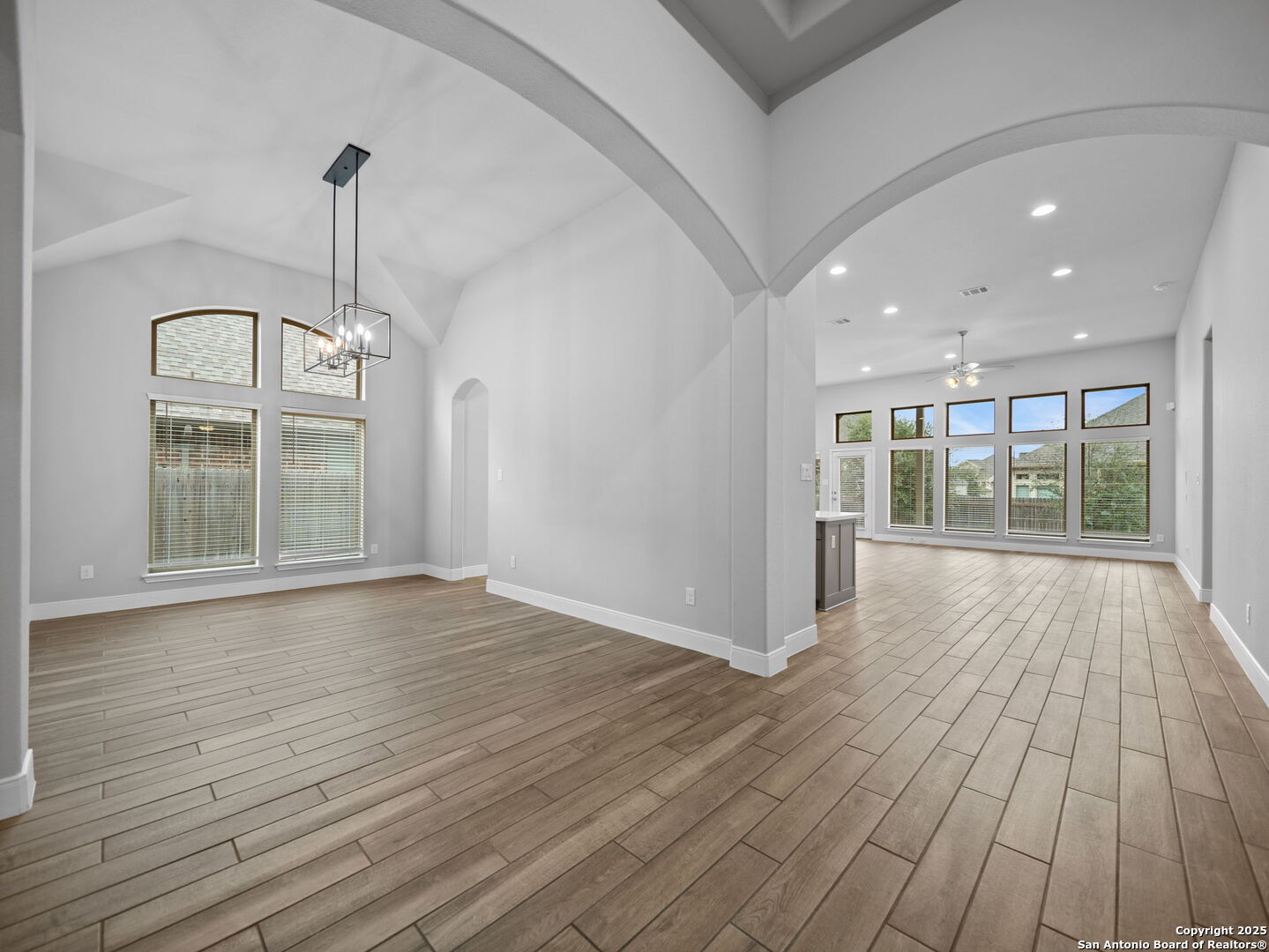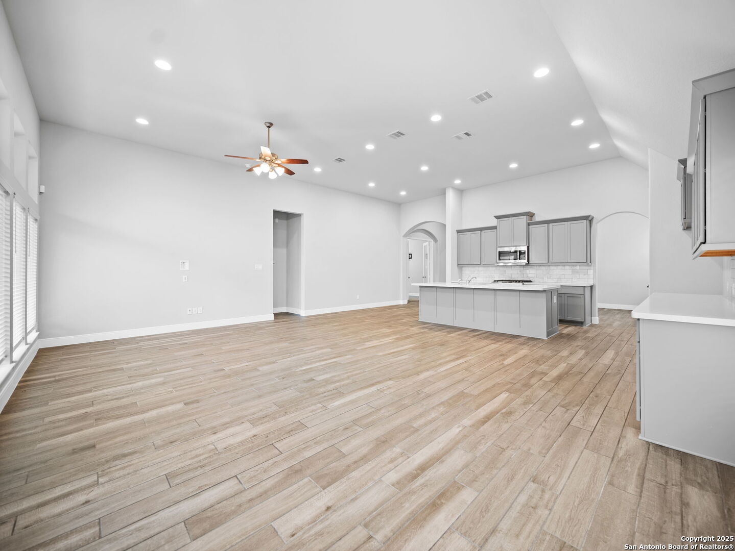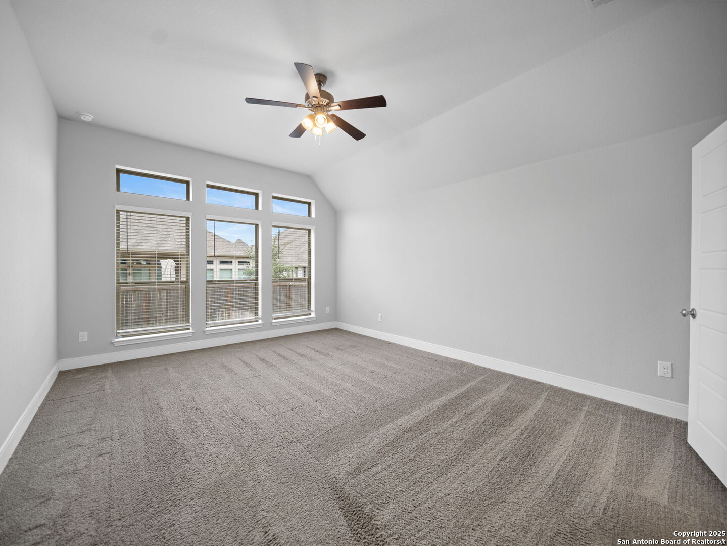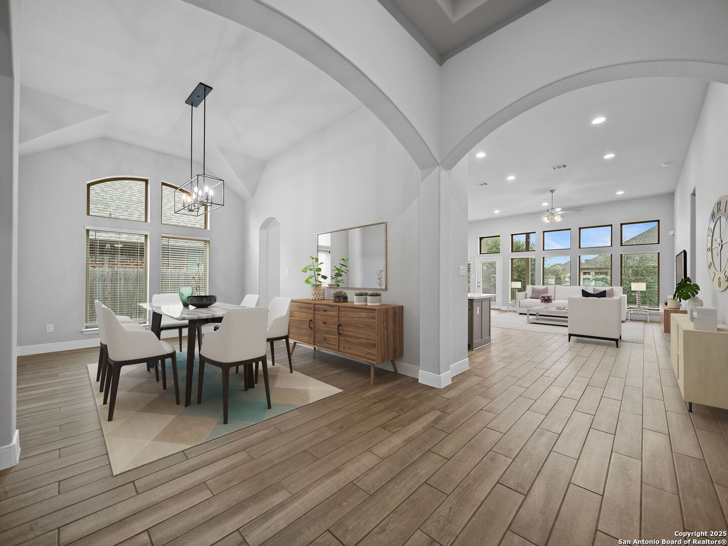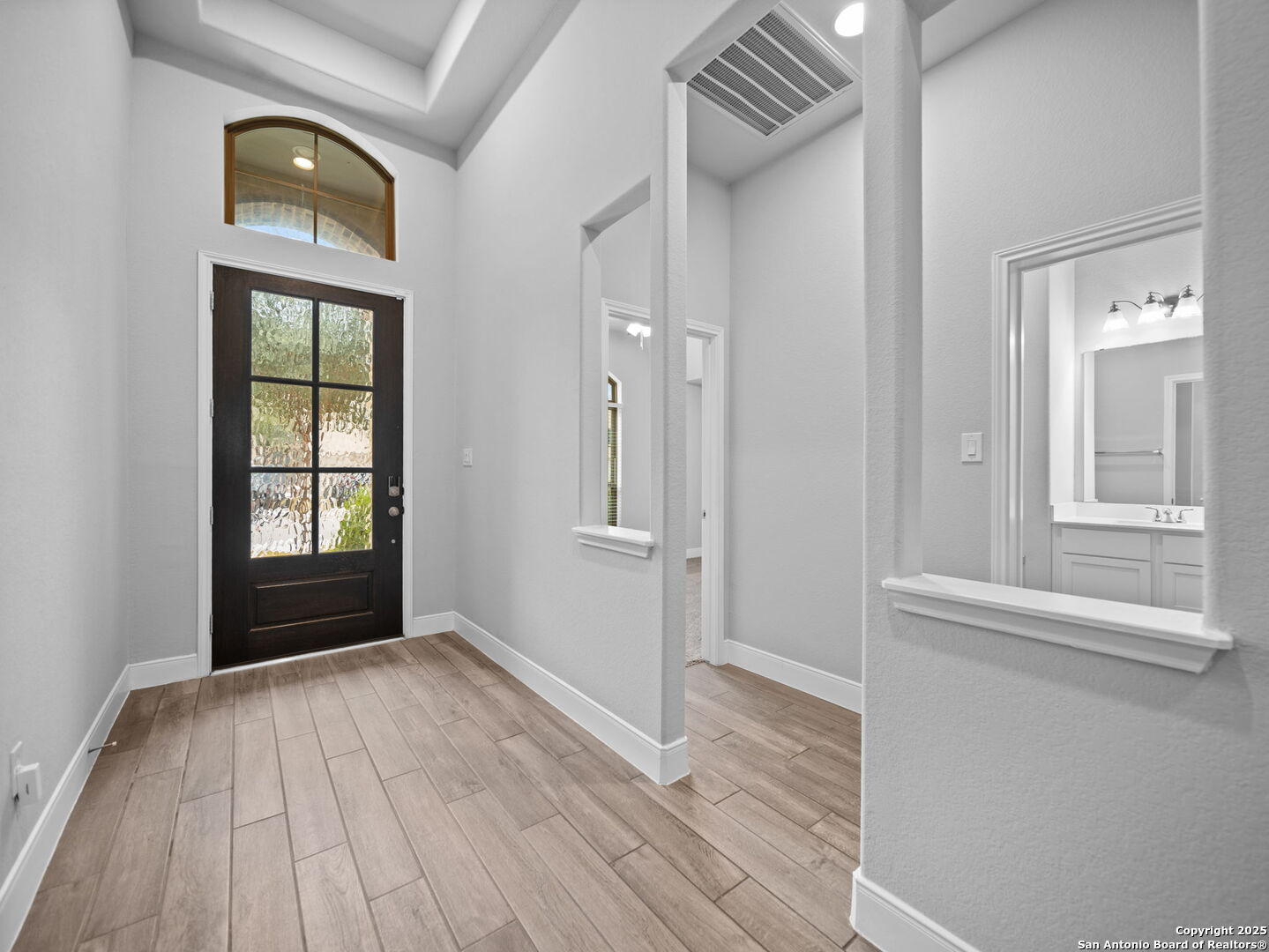 $10,000 in closing costs you don't want to miss! Welcome to this stunning 4-bedroom, 3-bath home located in the desirable Kallison Ranch community. Built in 2019, this well-maintained property offers an open-concept layout with high ceilings, abundant natural light, and modern finishes throughout. The spacious kitchen features a large island with seating, stainless steel appliances, granite countertops, and a walk-in pantry, opening to a bright living area perfect for entertaining. The primary suite includes a garden tub, separate shower, dual vanities, and a large walk-in closet. Additional features include a formal dining room, versatile game room or office with French doors, and a full guest suite. Enjoy outdoor living on the covered patio overlooking the fenced backyard. Community amenities include pools, playgrounds, and walking trails. Conveniently located near shopping, dining, and top-rated NISD schools, this home offers comfort and convenience in one of San Antonio's most sought-after areas. Buyer and Buyer's Rep to verify all information contained herein.