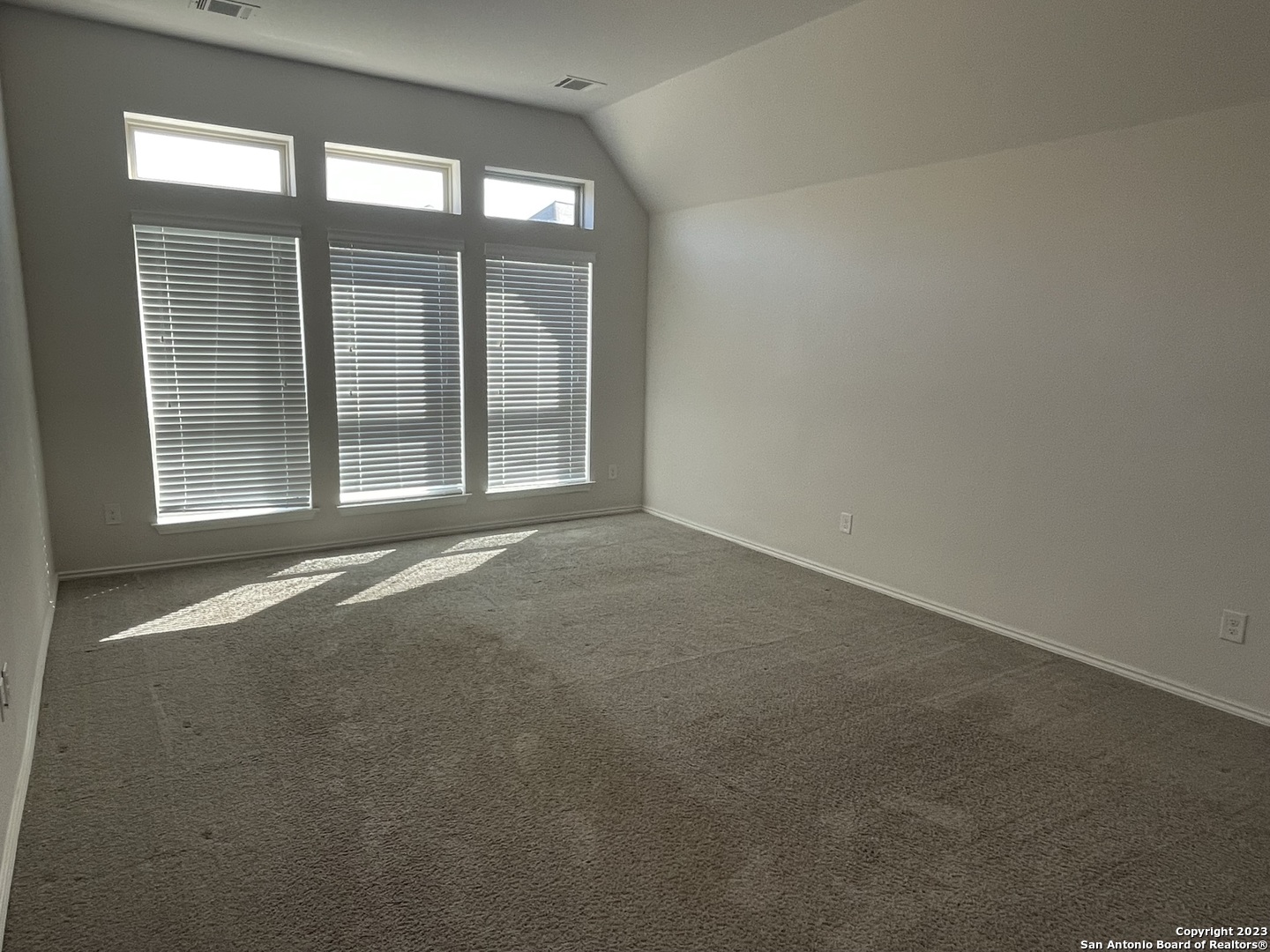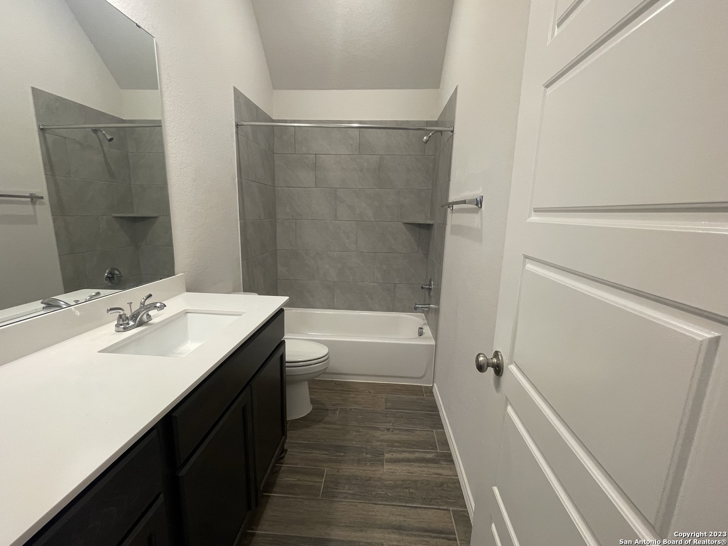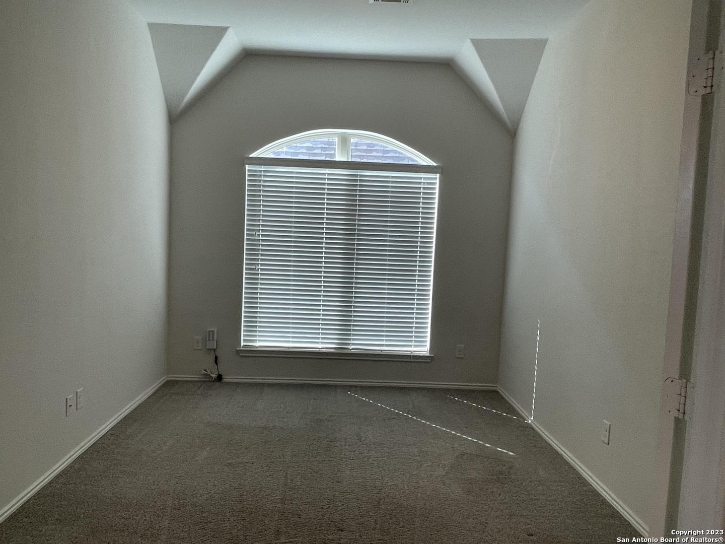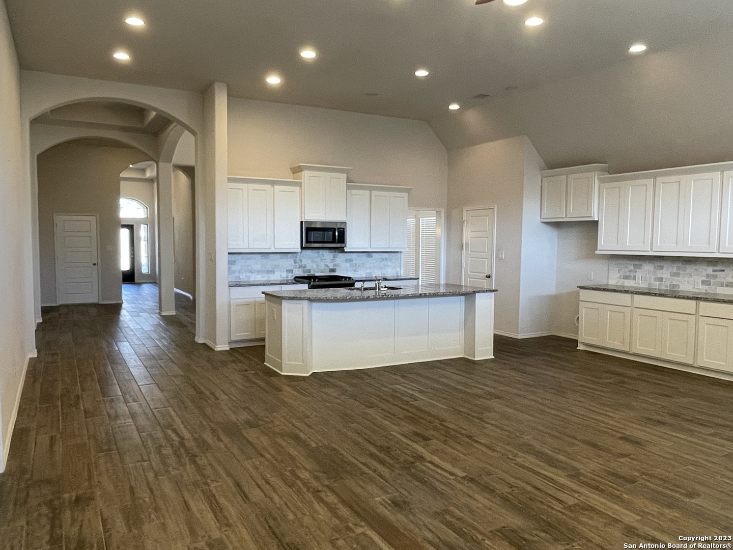 Located in the Kallison Ranch subdivision, this 4-bedroom, 3-bath home offers a spacious layout with high ceilings and abundant natural light throughout. The floor plan includes a dedicated office space suited for working from home or study. The kitchen features white cabinetry, stainless steel appliances including a dishwasher, and a large eat-in island that opens to the main living area. The primary suite continues the high ceilings and includes a walk-in closet and a private bath with a garden tub and separate stand-up shower. Secondary bedrooms provide flexibility for family or guests. The backyard is fully fenced with a privacy fence and covered patio, offering space for outdoor use. Community amenities include a playground and swimming pool. Conveniently located near SeaWorld, Alamo Ranch shopping, theaters, and dining. Make-ready items to be completed.