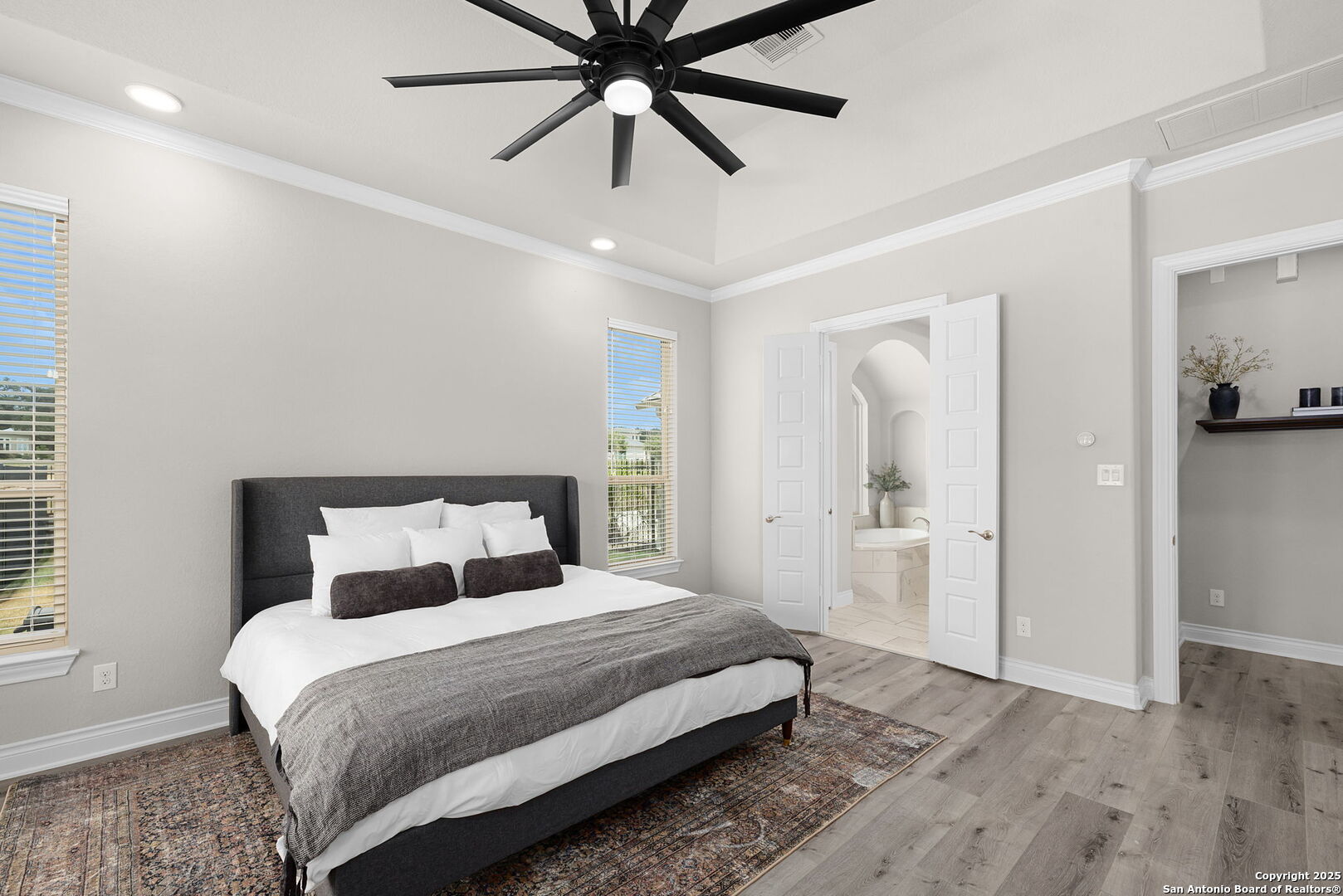 Nestled within the gated Newcombe Estates, this exquisite home welcomes you with double mahogany front doors. Upon entry, you'll find a library adorned with French doors and a formal dining room featuring a rotunda ceiling. The open family room, boasting a wall of windows and a cast stone fireplace, seamlessly transitions into the kitchen and morning area. Elegant ceramic tile floors extend throughout. The kitchen is equipped with an island with built-in seating, a walk-in pantry, and a Butler's pantry. Adjacent to the morning area, discover a game room with double doors. The private master suite offers serene views through a wall of windows. The master bath includes a garden tub, a separate glass-enclosed shower, dual sinks, a linen closet, and a spacious walk-in closet. A guest suite features a full bath and walk-in closet. The design is completed with secondary bedrooms, a mudroom, and additional linen closets. Outside, enjoy the extended covered patio, a resort-style pool and hot tub, along with an attached covered outdoor kitchen featuring a bar area level with the pool. A five hole putt putt adds to the outdoor amenities. Irrigation system and three-car split garage complete this remarkable home. The community features 13 tennis courts, pickle ball courts, fitness center, pro-shop, pool complex, and weekly activities for all.