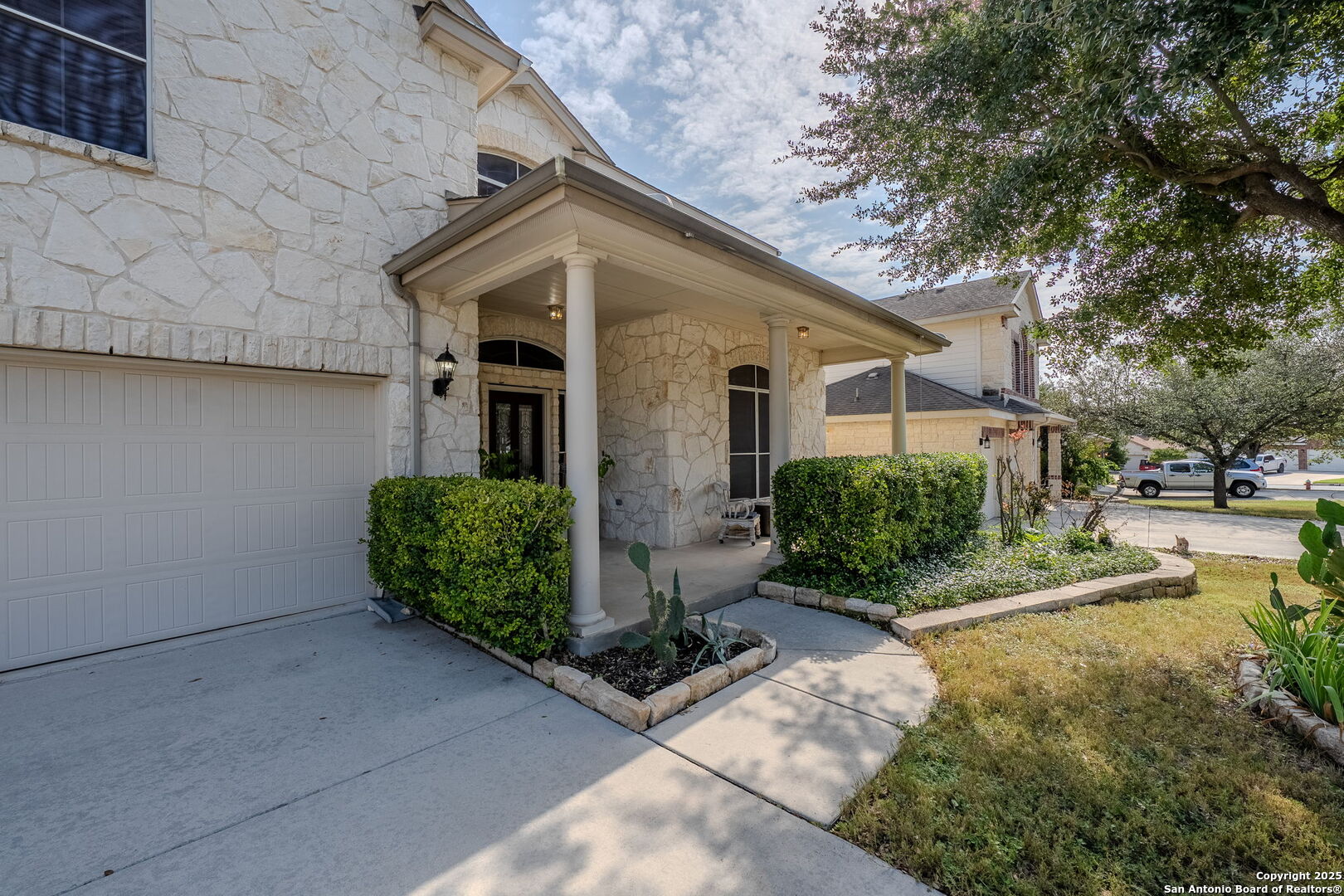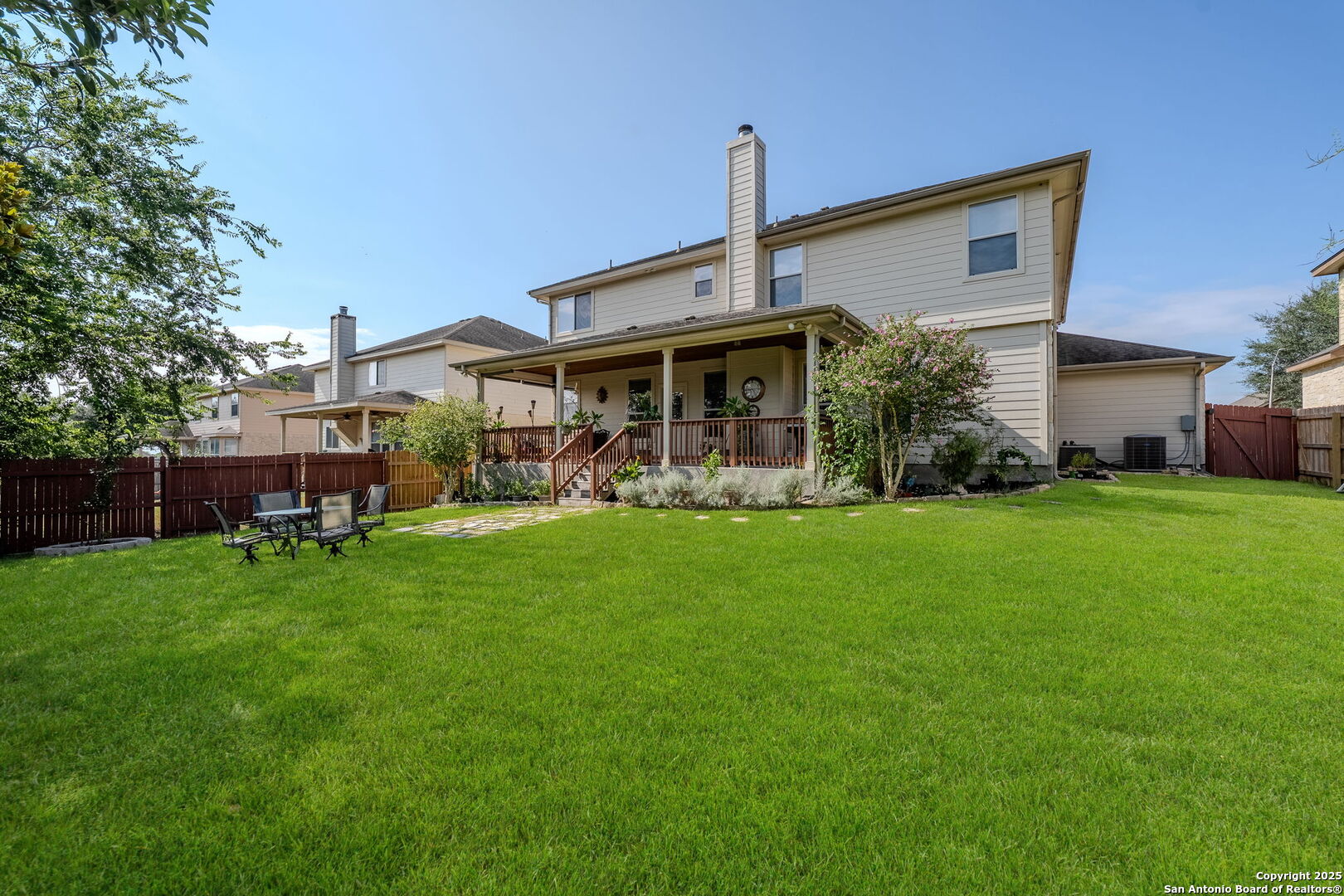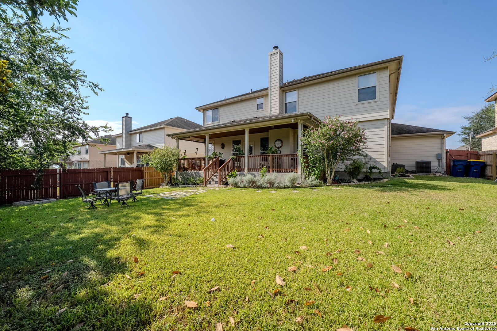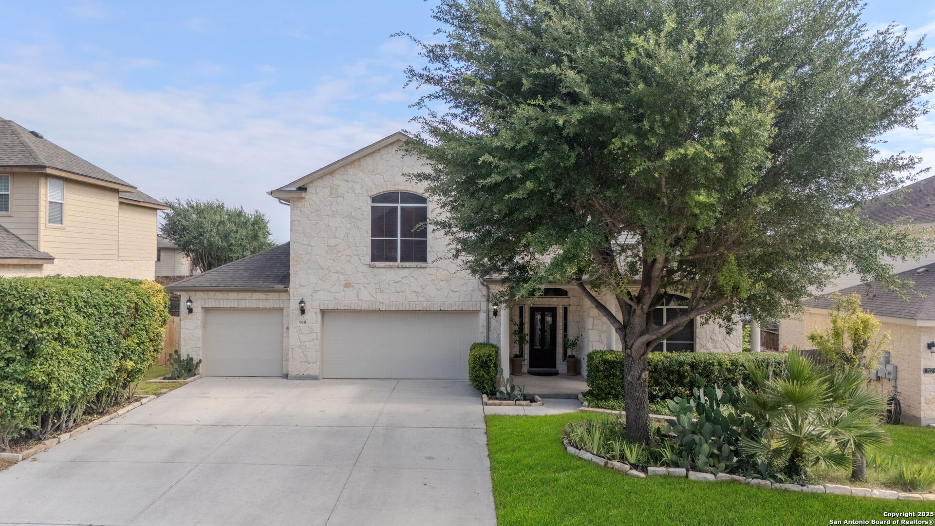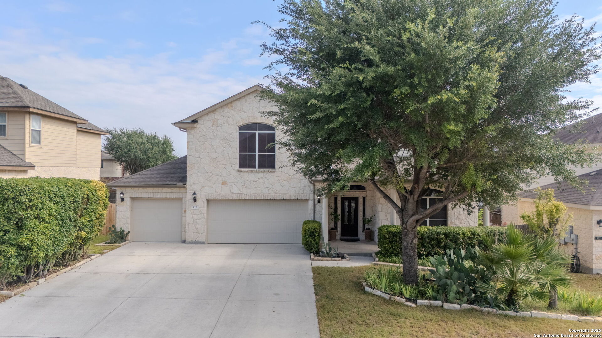Immaculate Cibolo Home with Modern Upgrades and 3-Car Garage! This beautifully maintained two-story features updated finishes, a stylish wet bar, and an owned water softener. The open-concept layout includes granite countertops, 9-ft ceilings, and a spacious family room with fireplace. Upstairs offers a large game room with office nook and an oversized primary suite with double vanities. Enjoy outdoor living on the covered patio, complete with sprinkler system and solar screens.