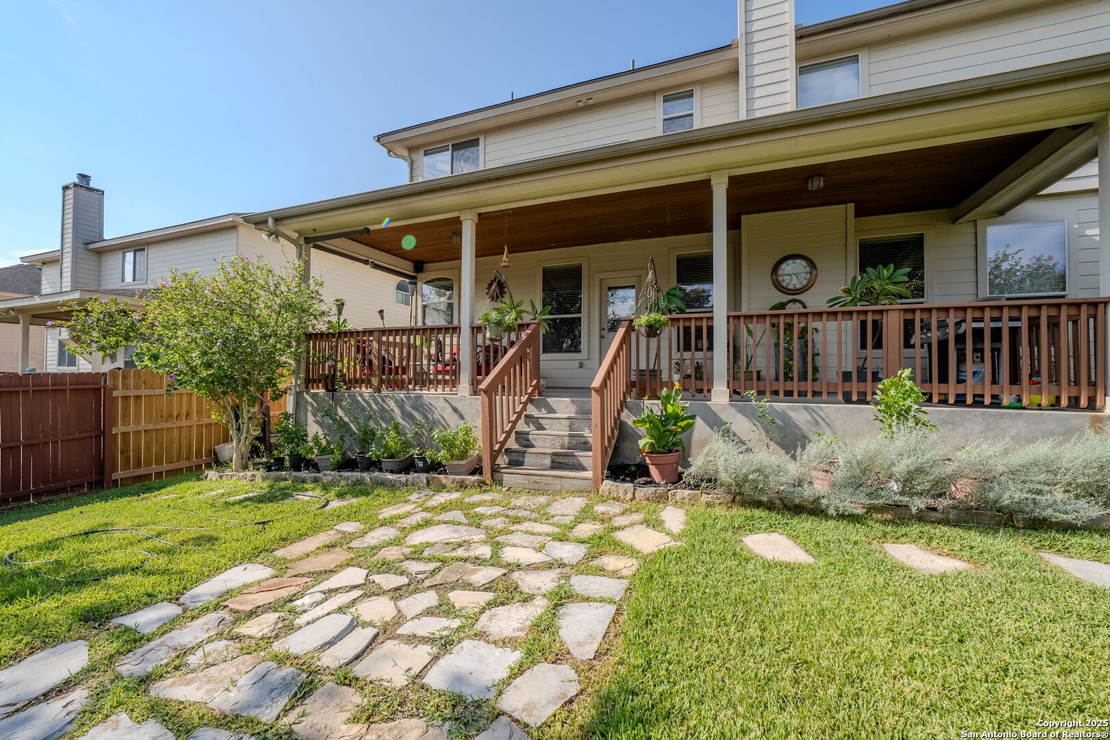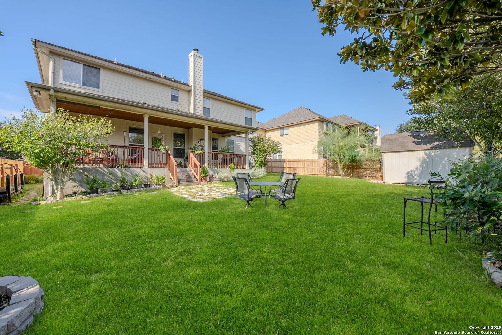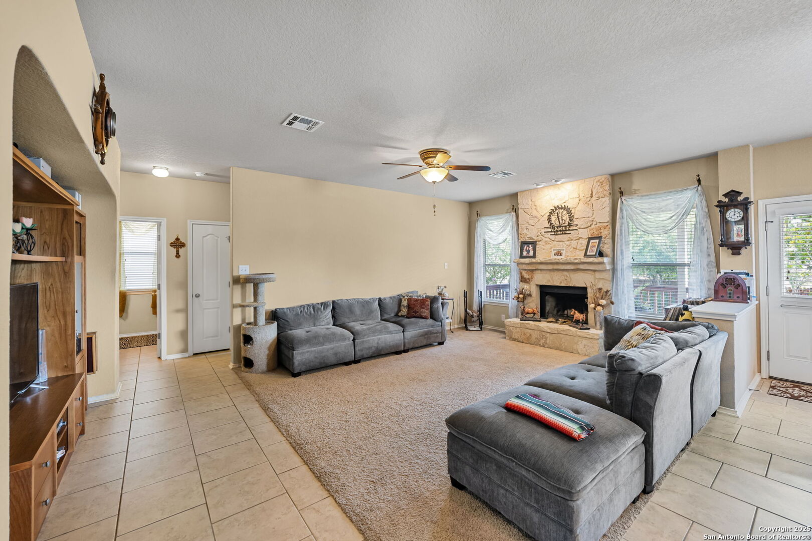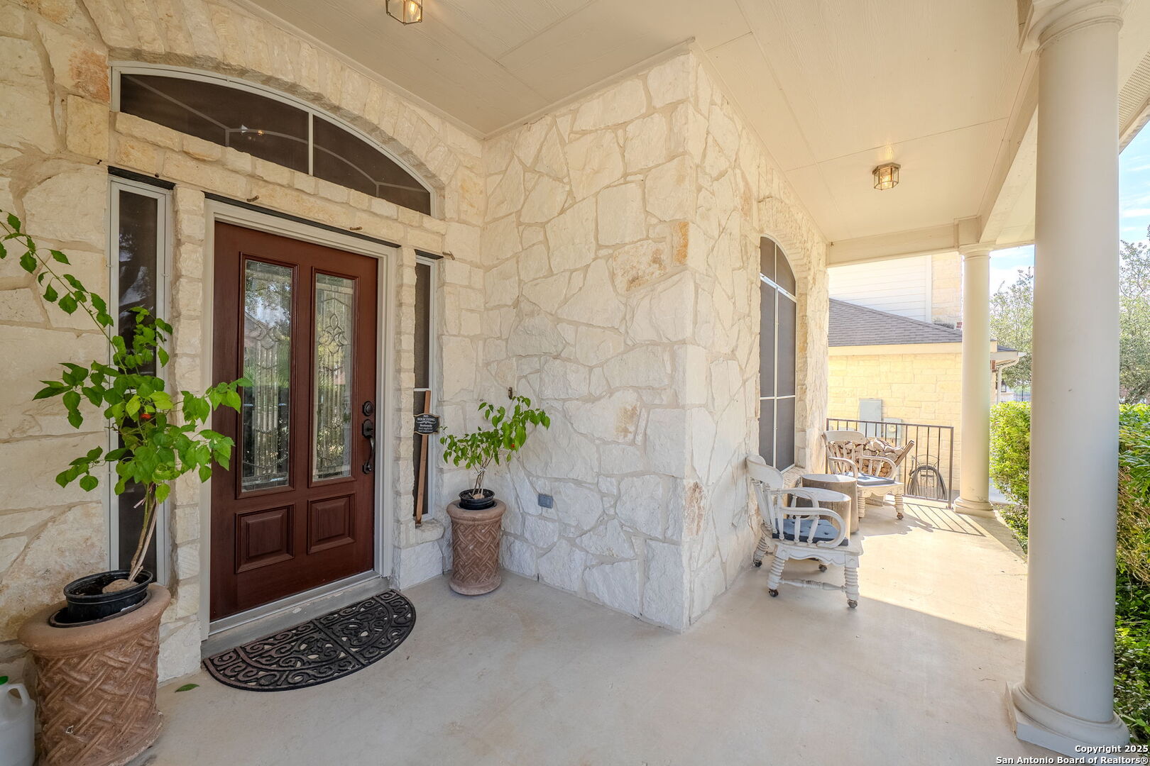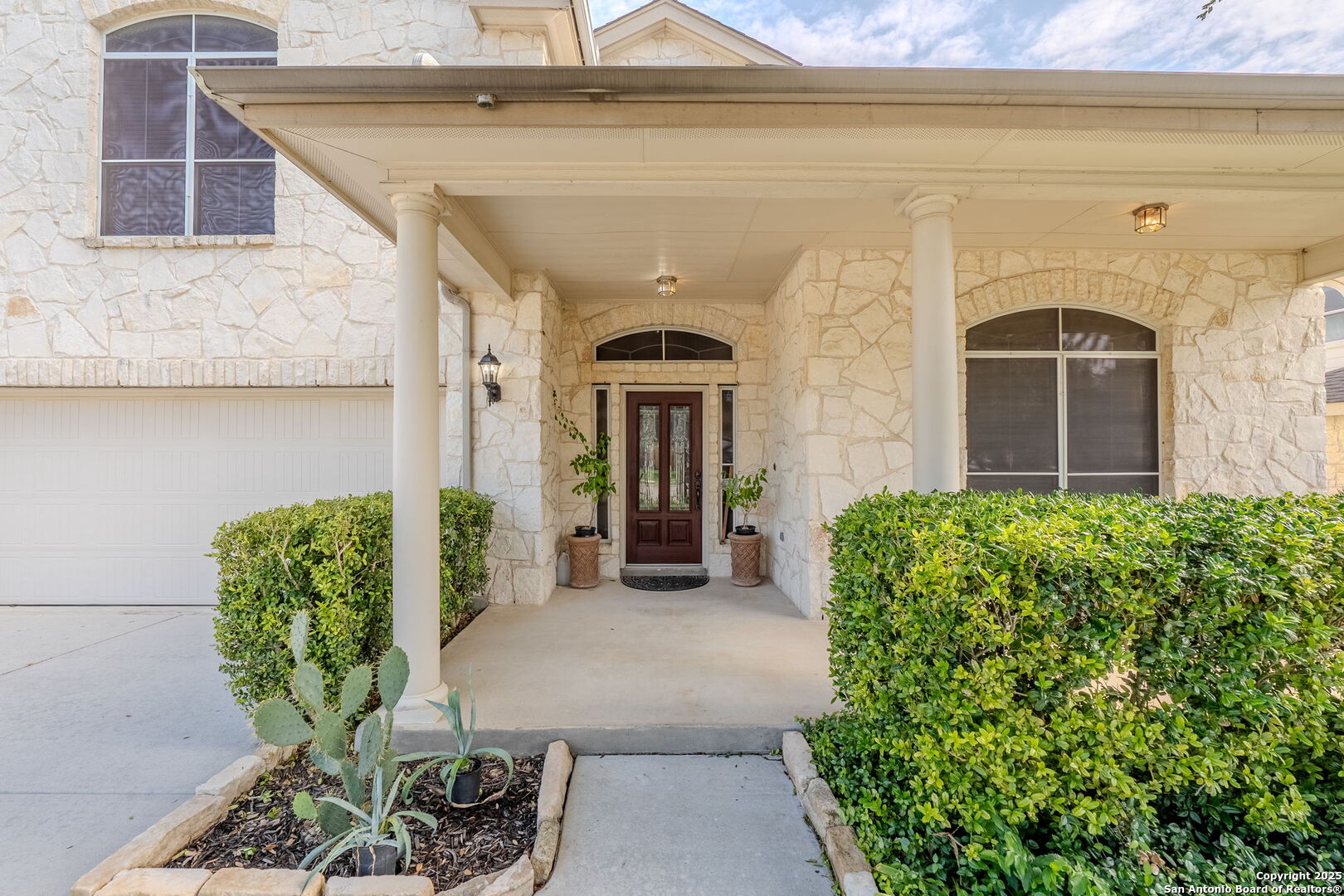 Immaculate Cibolo Home with Modern Upgrades and 3-Car Garage! This beautifully maintained two-story features updated finishes, a stylish wet bar, and an owned water softener. The open-concept layout includes granite countertops, 9-ft ceilings, and a spacious family room with fireplace. Upstairs offers a large game room with office nook and an oversized primary suite with double vanities. Enjoy outdoor living on the covered patio, complete with sprinkler system and solar screens.