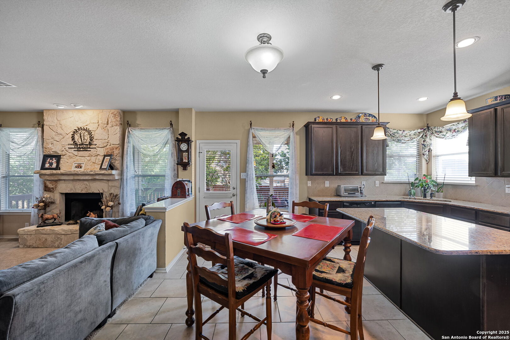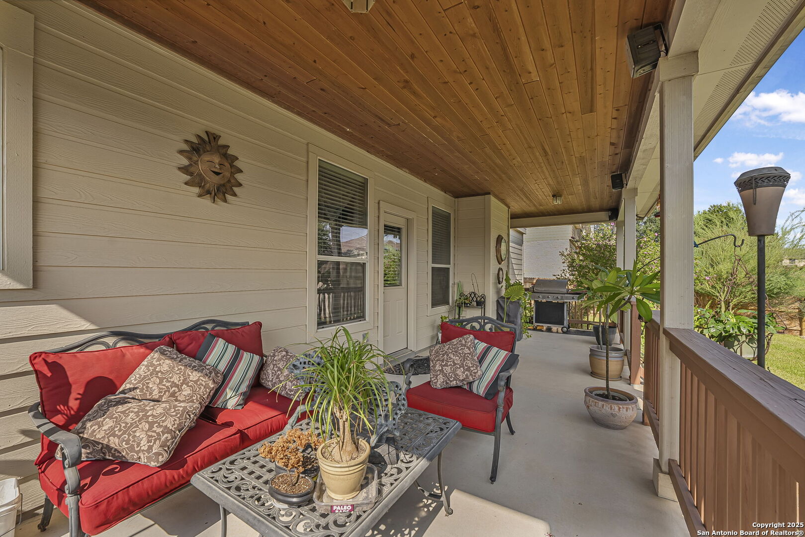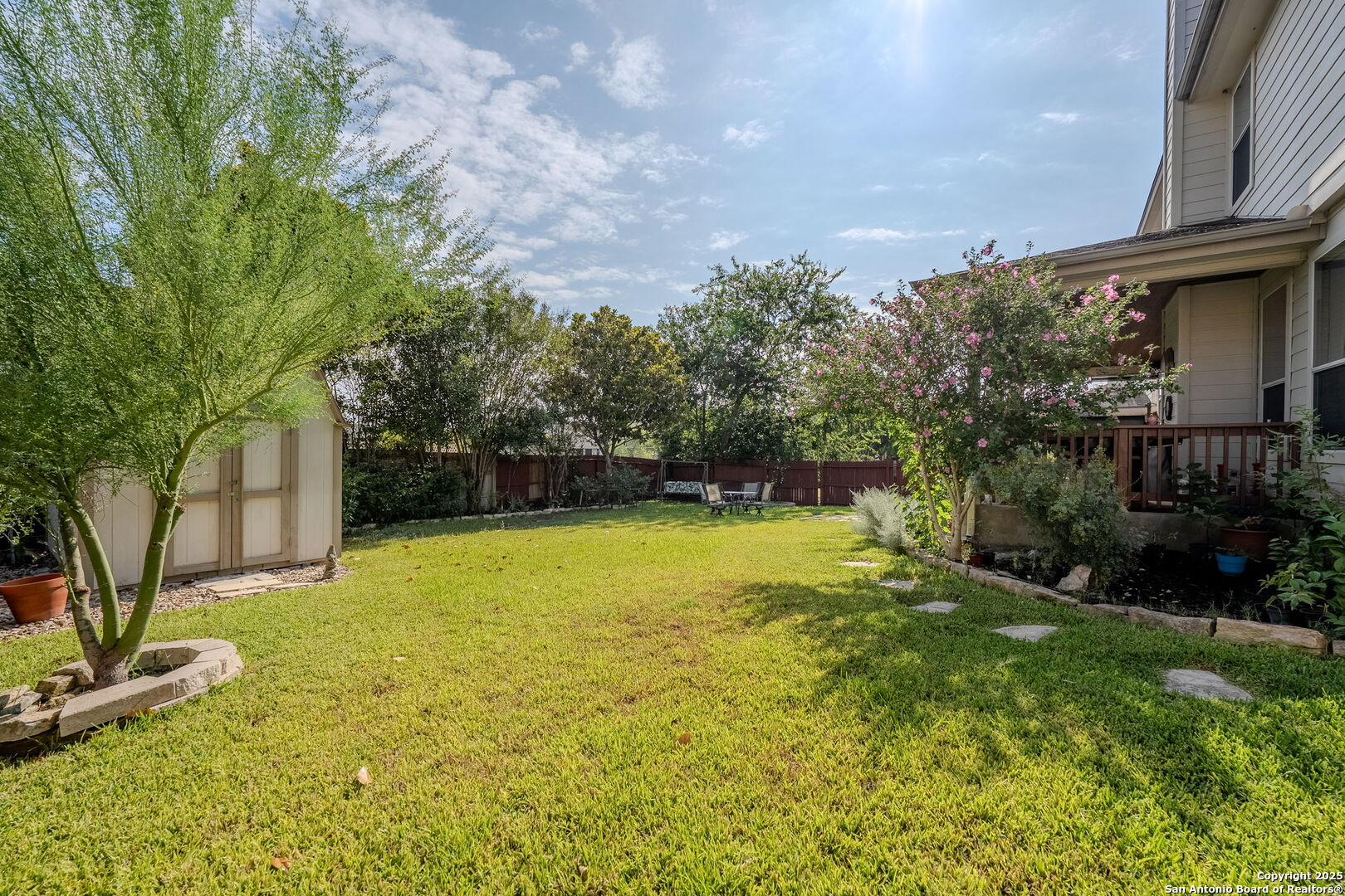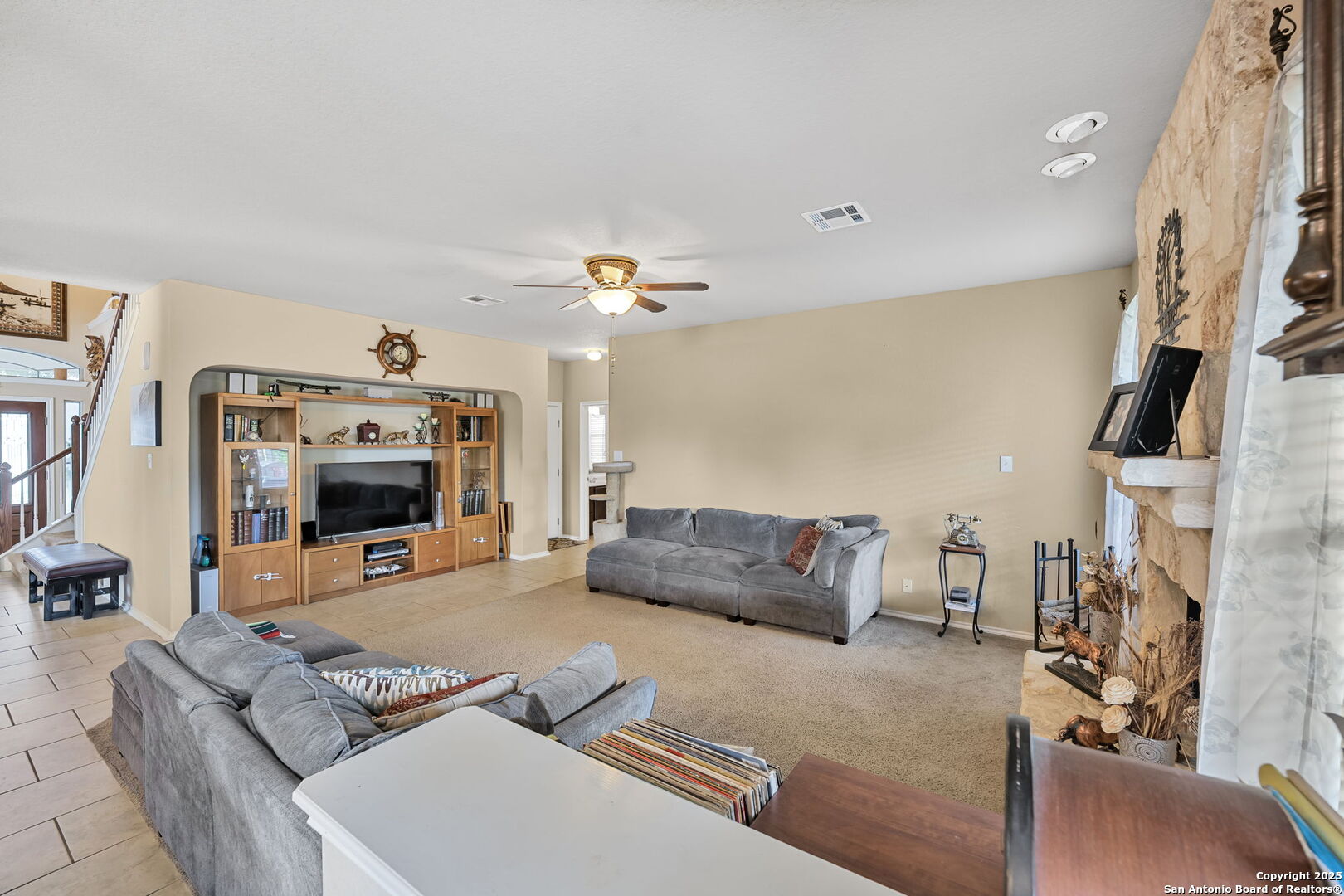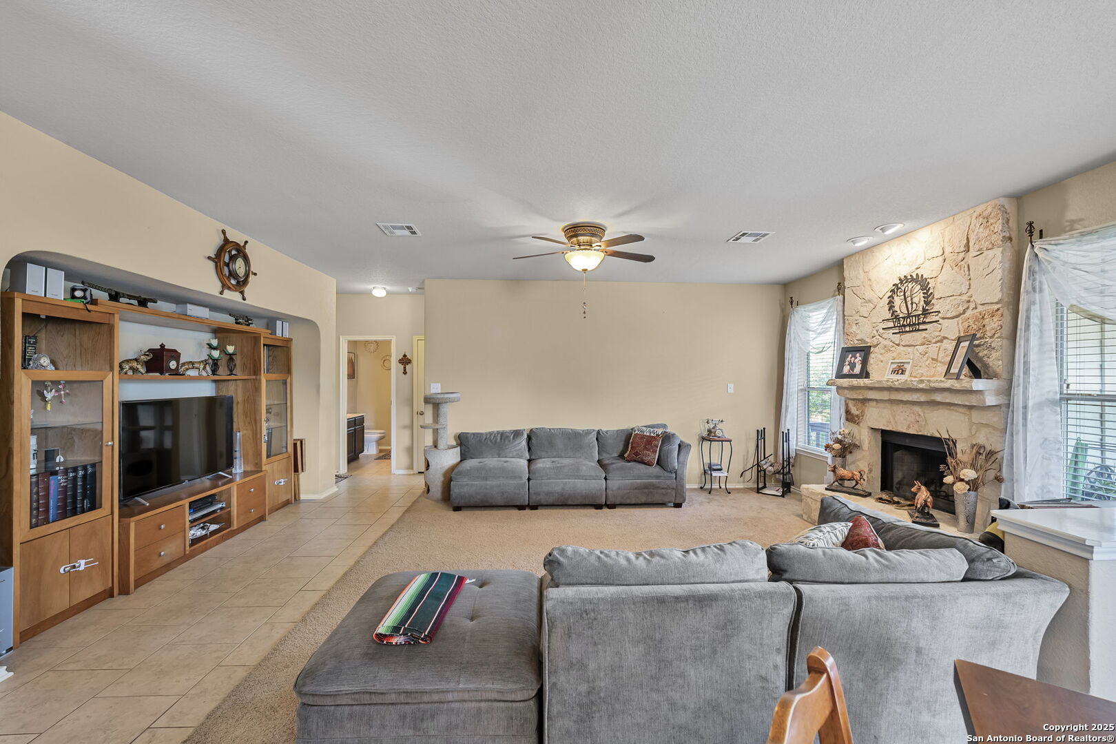 Immaculate Cibolo Home with Modern Upgrades and 3-Car Garage! This beautifully maintained two-story features updated finishes, a stylish wet bar, and an owned water softener. The open-concept layout includes granite countertops, 9-ft ceilings, and a spacious family room with fireplace. Upstairs offers a large game room with office nook and an oversized primary suite with double vanities. Enjoy outdoor living on the covered patio, complete with sprinkler system and solar screens.