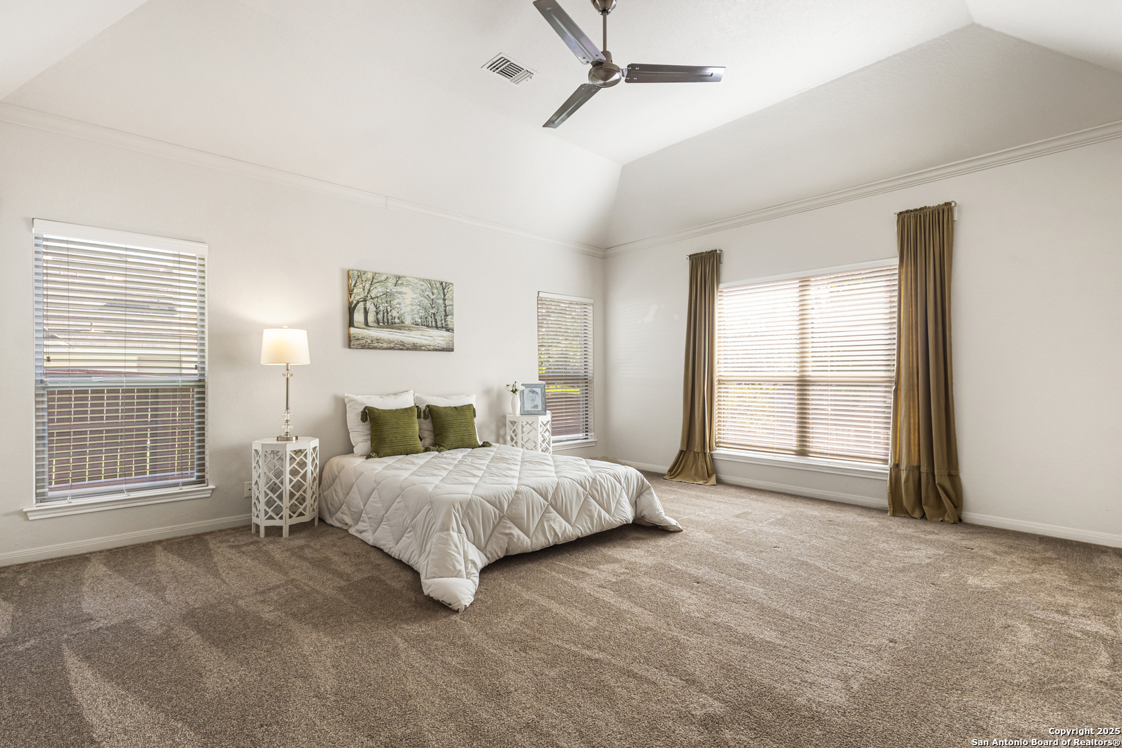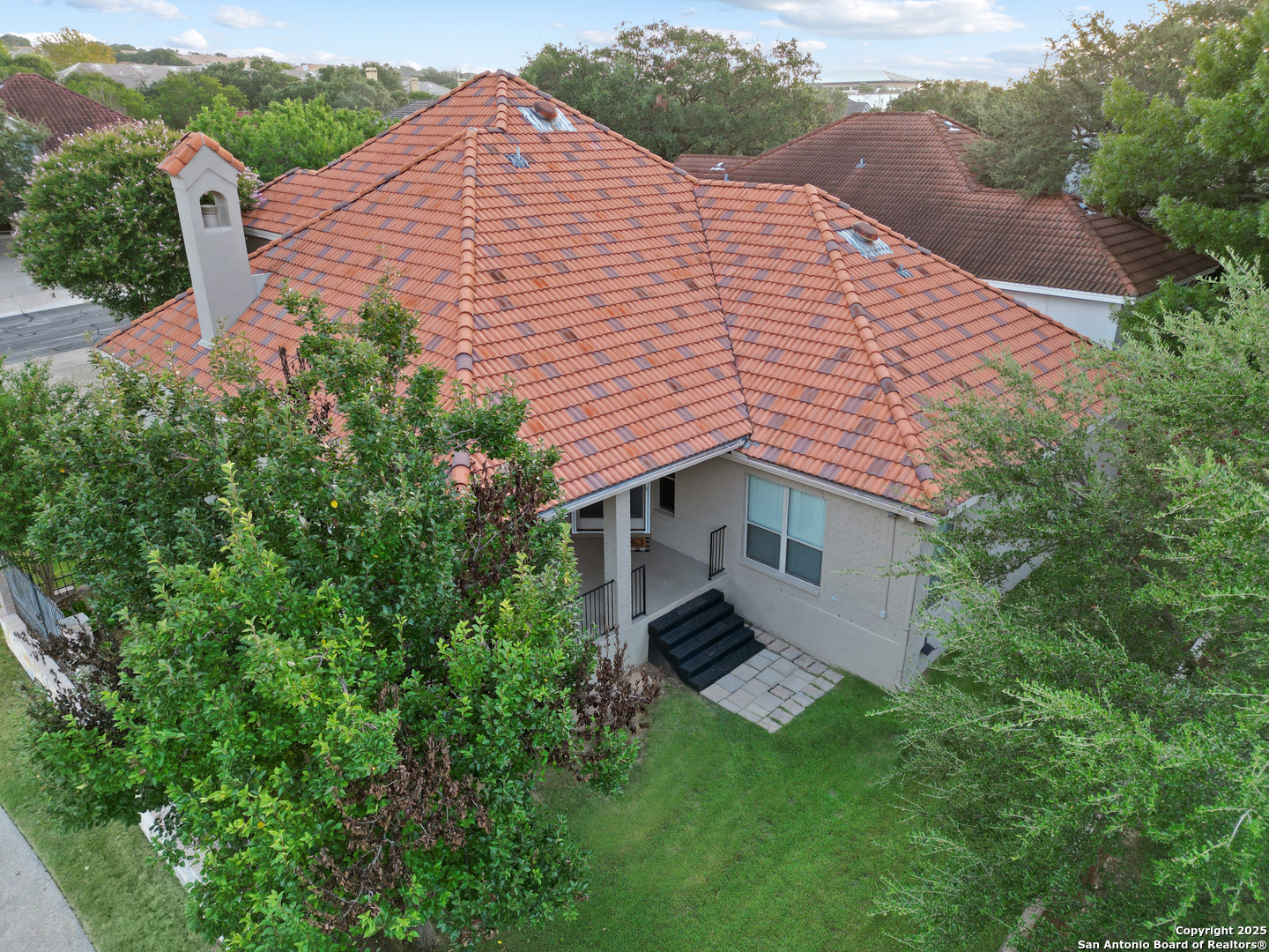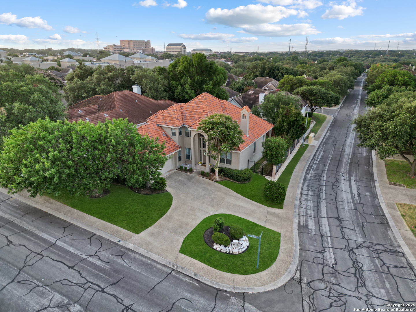 Welcome home to your elegant 2-Story David Anderson Custom Home in the Stone Oak, Meadows of Sonterra gated community. Situated on a corner lot with a circular driveway, this residence offers an inviting open floor plan with soaring ceilings, 3013 SF, 4-sided brick and tile roof. The living room features a wood-burning fireplace, with laminate and tile flooring in open areas. The updated kitchen includes custom cabinetry, quartz countertops, stainless steel appliances, and a refrigerator. All 3 bedrooms are located downstairs along with a private office and formal dining room. Your downstairs, spacious primary suite boasts dual vanities, a garden tub, walk-in shower with bench, and generous walk-in closet. Upstairs FLEX SPACE is being used as a media room, but could be another bedroom, has a full bathroom and elevator access to ensure convenience for all. Additional highlights include a utility room with sink and storage cabinets, plus a covered patio perfect for enjoying sunsets. Money savers: water softener and included Residential Home Warranty through 4/9/2026. Convenient access to Loop 1604 and Hwy 281. Zoned to NEISD schools include Reagan High School, with nearby private school options at Concordia Lutheran and SACS. Make this home yours today!