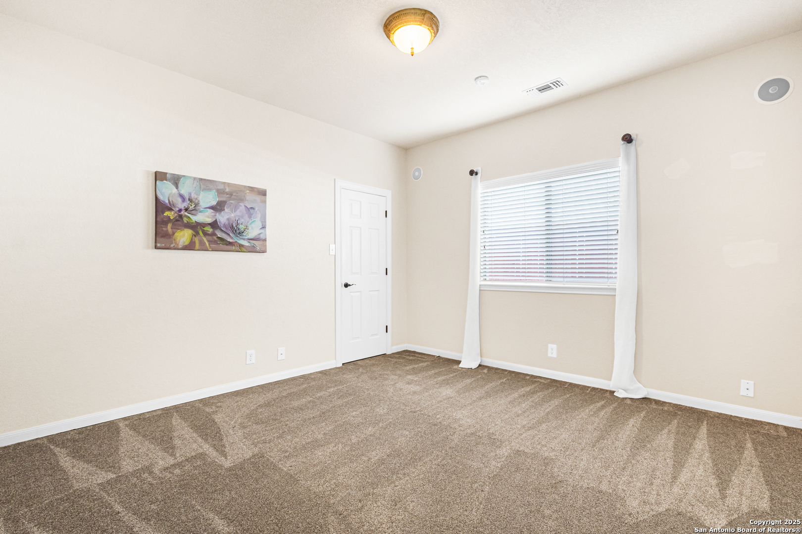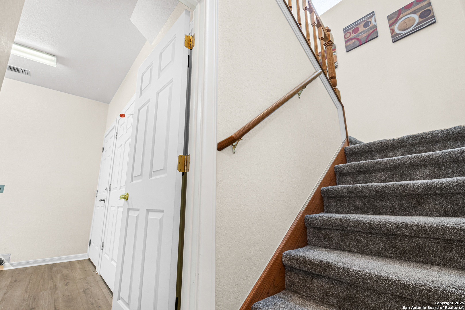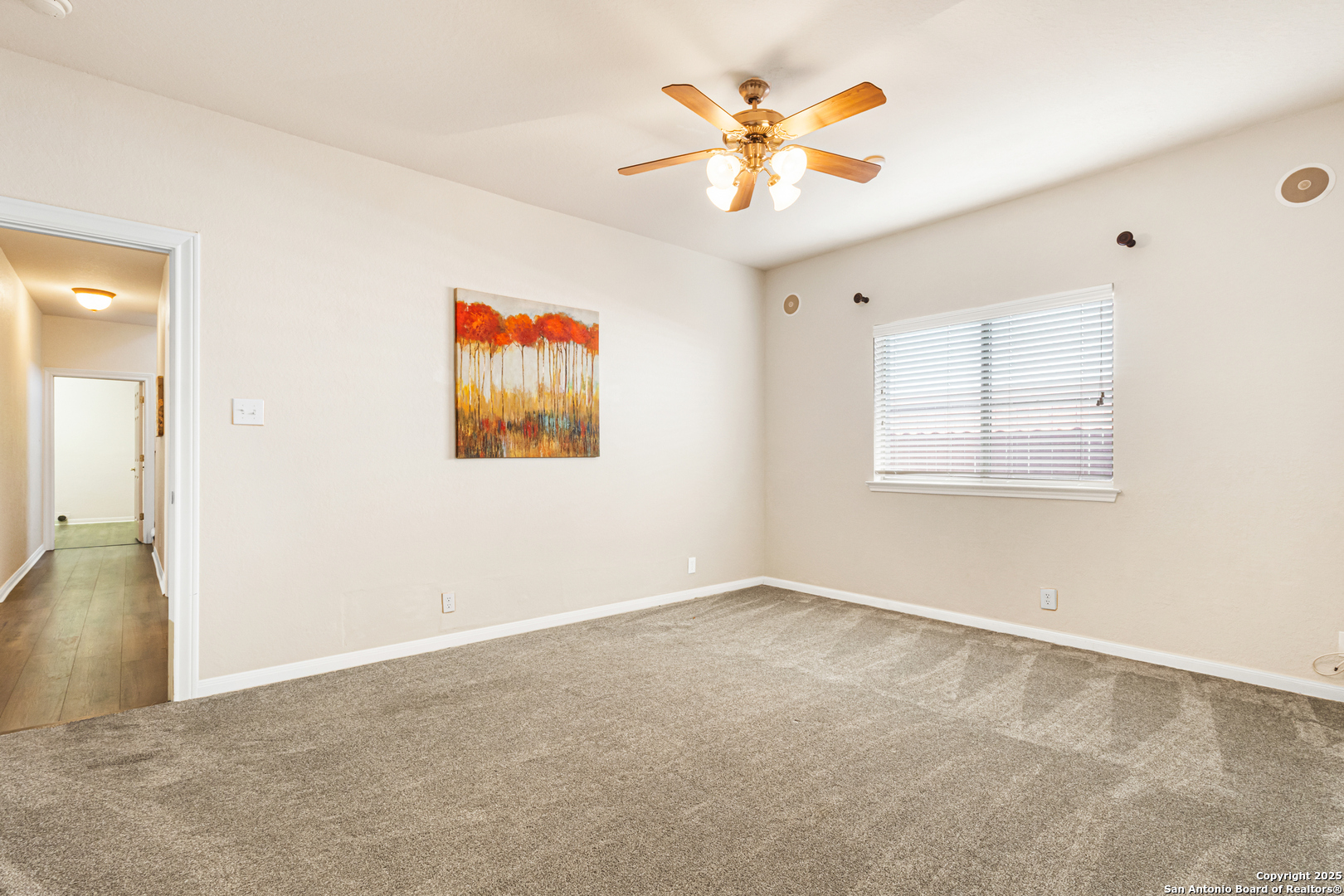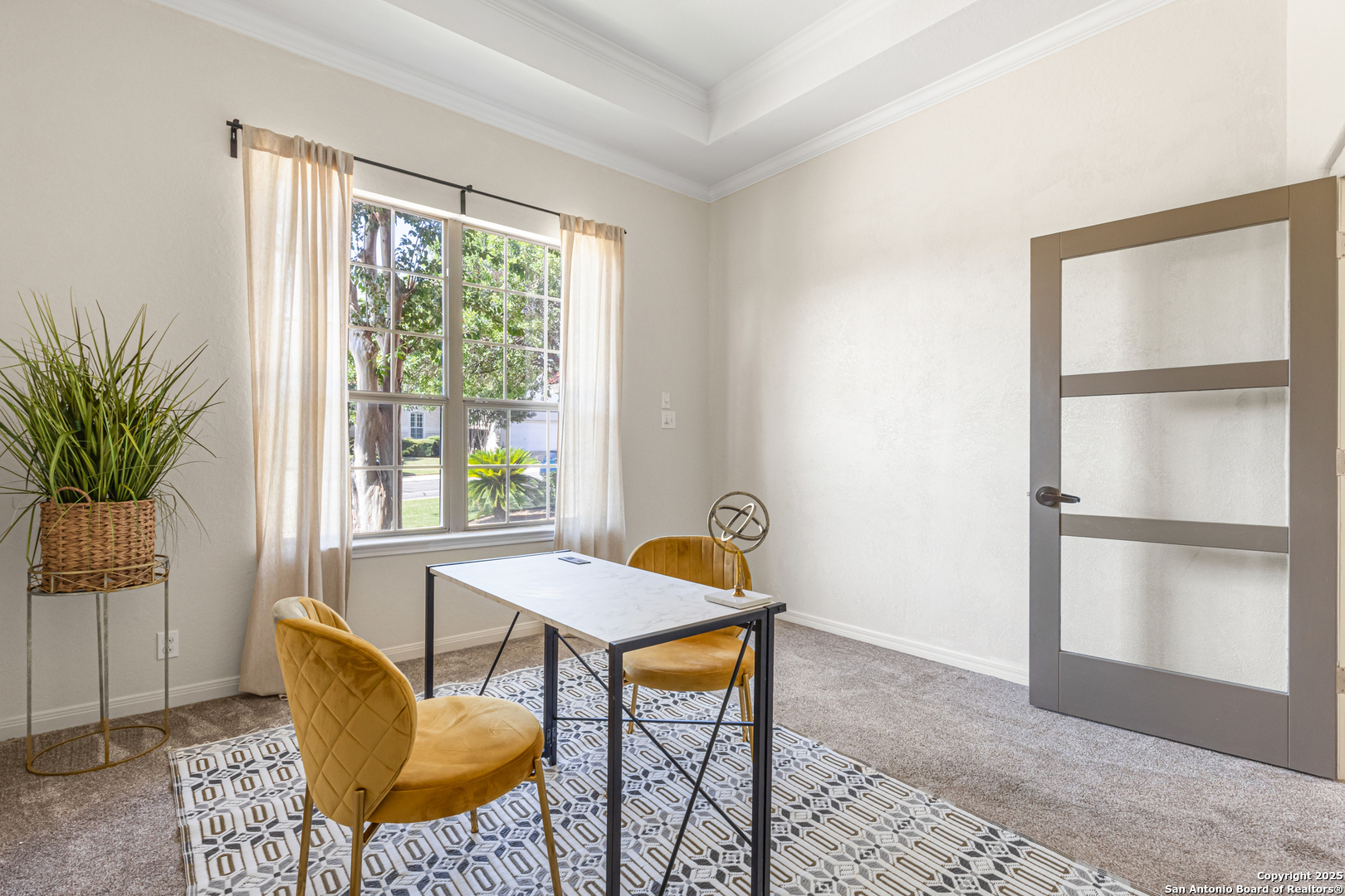 Welcome home to your elegant 2-Story David Anderson Custom Home in the Stone Oak, Meadows of Sonterra gated community. Situated on a corner lot with a circular driveway, this residence offers an inviting open floor plan with soaring ceilings, 3013 SF, 4-sided brick and tile roof. The living room features a wood-burning fireplace, with laminate and tile flooring in open areas. The updated kitchen includes custom cabinetry, quartz countertops, stainless steel appliances, and a refrigerator. All 3 bedrooms are located downstairs along with a private office and formal dining room. Your downstairs, spacious primary suite boasts dual vanities, a garden tub, walk-in shower with bench, and generous walk-in closet. Upstairs FLEX SPACE is being used as a media room, but could be another bedroom, has a full bathroom and elevator access to ensure convenience for all. Additional highlights include a utility room with sink and storage cabinets, plus a covered patio perfect for enjoying sunsets. Money savers: water softener and included Residential Home Warranty through 4/9/2026. Convenient access to Loop 1604 and Hwy 281. Zoned to NEISD schools include Reagan High School, with nearby private school options at Concordia Lutheran and SACS. Make this home yours today!