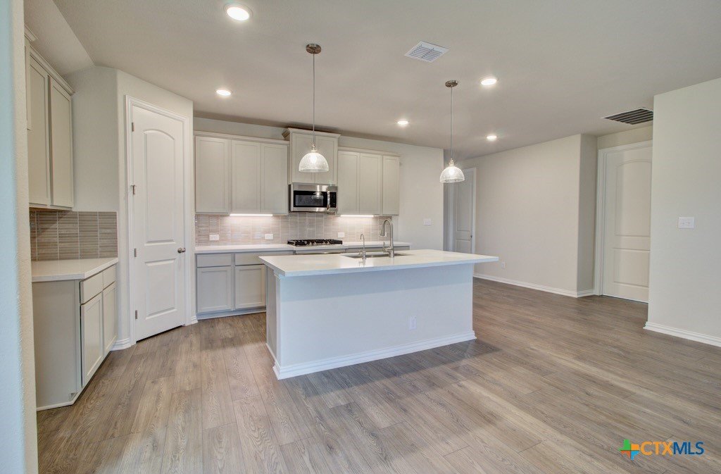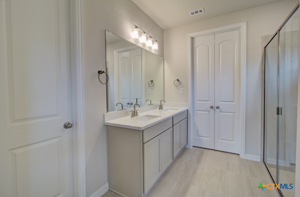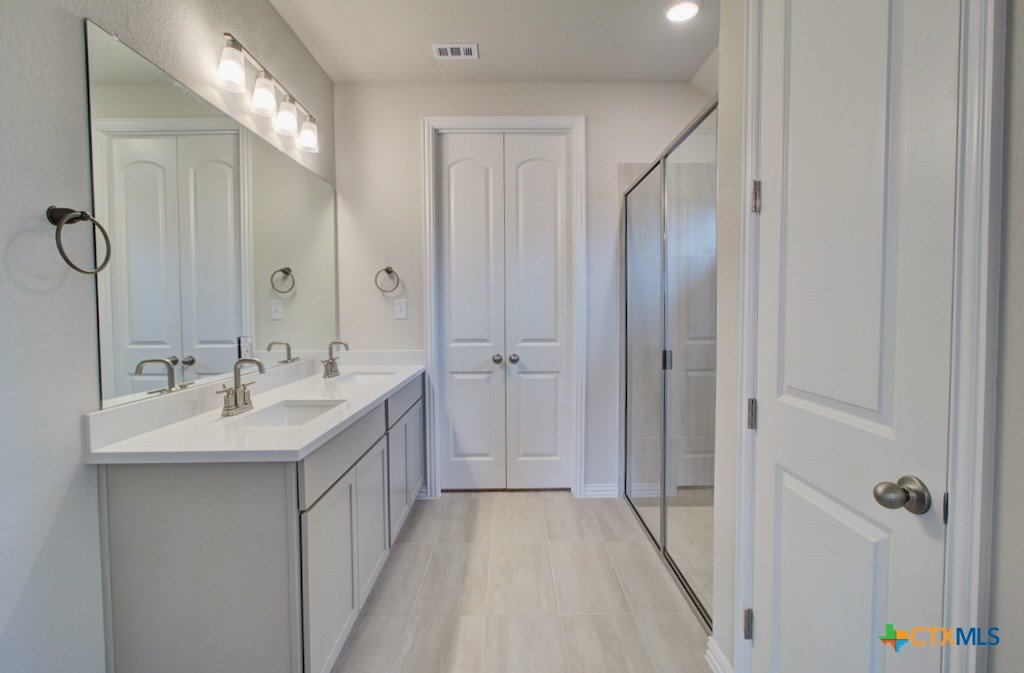 This home displays lovely curb appeal as a single story home consisting of three sided brick, stone on front elevation, and wood shutters on the exterior. Other exterior qualities include the 2 car garage, 1 coach light near the garage, an extended covered patio, and a privacy fence with one gate. The Kitchen opens to Great Room and features a center island with stainless steel undermount sink, 42" Hazelnut countertops, Omega stone countertops, mercury mosaic tile backsplash, and additional buffet/cabinets for additional storage and counterspace. Owner's suite features an enlarged closet, dual vanity, ceramic tile surround shower in the shade Creek Gray arranged in a straight lay rectangular pattern. The nearby Lake Dunlap is a peaceful retreat for fishing and other water activities. Nature enthusiasts will appreciate the proximity to Canyon Lake, where scenic views and outdoor adventures await. Downtown New Braunfels boasts exciting entertainment, boutique shopping, local dining, and events. The Gruene Historic District is a hub for live music, events, and the famous Gruene Hall. Come experience the beauty and convenience of Clear Creek in New Braunfels.