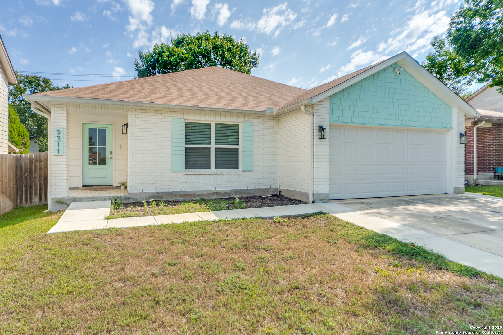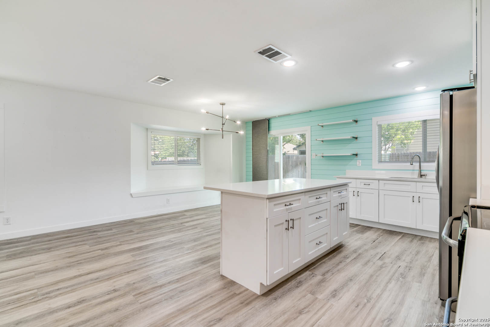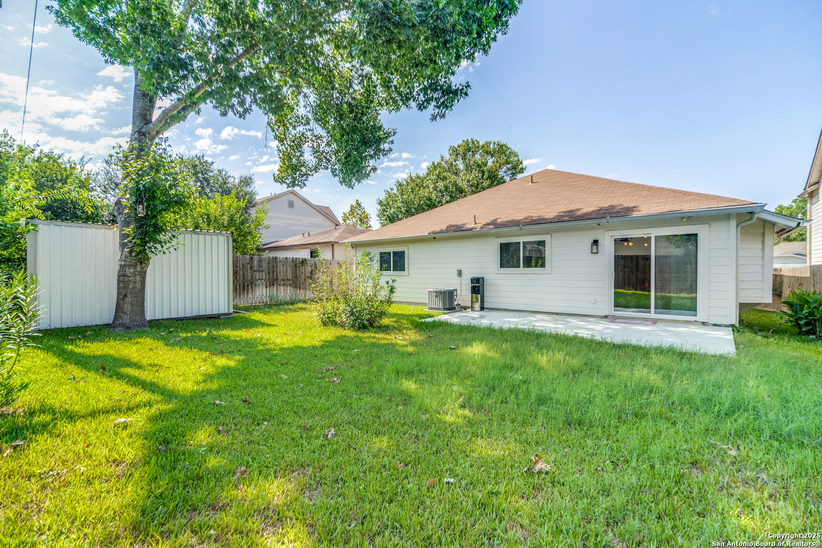 Welcome to this beautifully maintained One-story home! As you step through the front door, you'll be enchanted by the updates and attention to detail. The updated luxury vinyl flooring flows seamlessly throughout, creating a modern and inviting ambiance that will make you feel right at home. The interior and exterior paint add polished sophistication and ensure a move-in ready experience. Prepare to be impressed by the thoughtful upgrades that enhance both comfort and energy efficiency. Details include fully foam-insulated attic! The heart of the home, the kitchen, is an absolute showstopper. Indulge your culinary skills in this open concept kitchen, featuring stunning quartz countertops, sleek all-white shaker cabinets with soft-close drawers, and a generous 6-ft island that offers ample storage and workspace. The modern appliances, including the LG smart Wi-Fi enabled electric range with air fry and easy clean features, cater to the demands of contemporary living and make meal preparation an absolute pleasure. Unwind and rejuvenate in the luxurious bathrooms that exude tranquility and style. The hall bathroom offers a walk-in shower, vanity, and updated lighting. The primary bath provides a personal sanctuary with a blissful rain shower head, and a custom barn door. Thoughtful safety and convenience features include a Ring doorbell, strategically placed floodlights, and security cameras providing peace of mind. The garage has been thoughtfully designed with wall insulation, durable epoxy flooring, and an insulated garage door, as well as a split unit air conditioning and heating system, and two closets with plenty of shelves, ensuring a secure and organized space for your vehicles and/or storage needs. Step outside and be greeted by the 9x12 Mueller shed sitting atop the meticulously landscaped yard, adorned with fresh sod that creates a lush and vibrant setting. The extended driveway and patio offer ample space for outdoor entertaining and relaxation. This location offers unbeatable convenience, just minutes from UTSA, USAA, the Medical Center, La Cantera, and The Rim for plenty of shopping and dining.