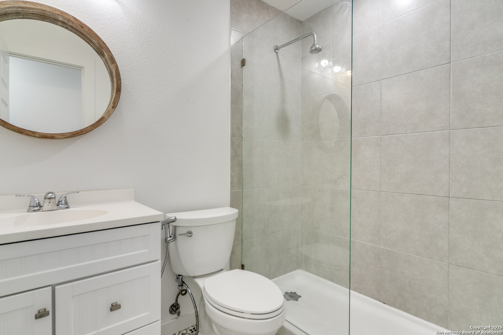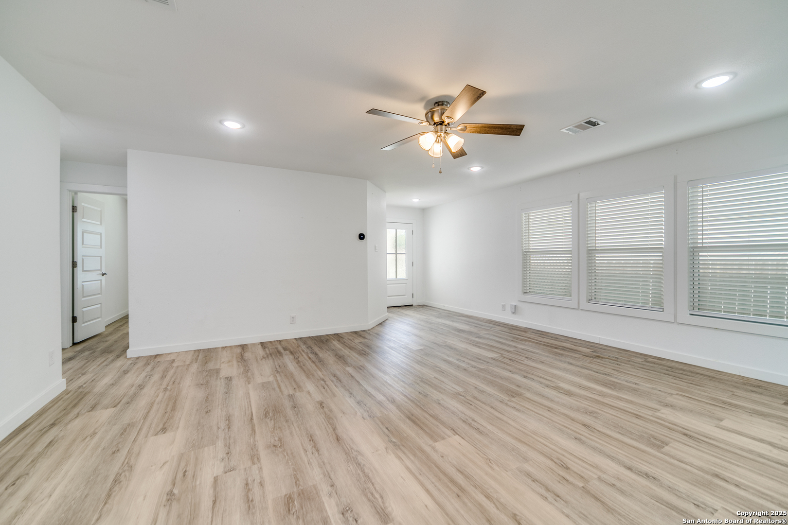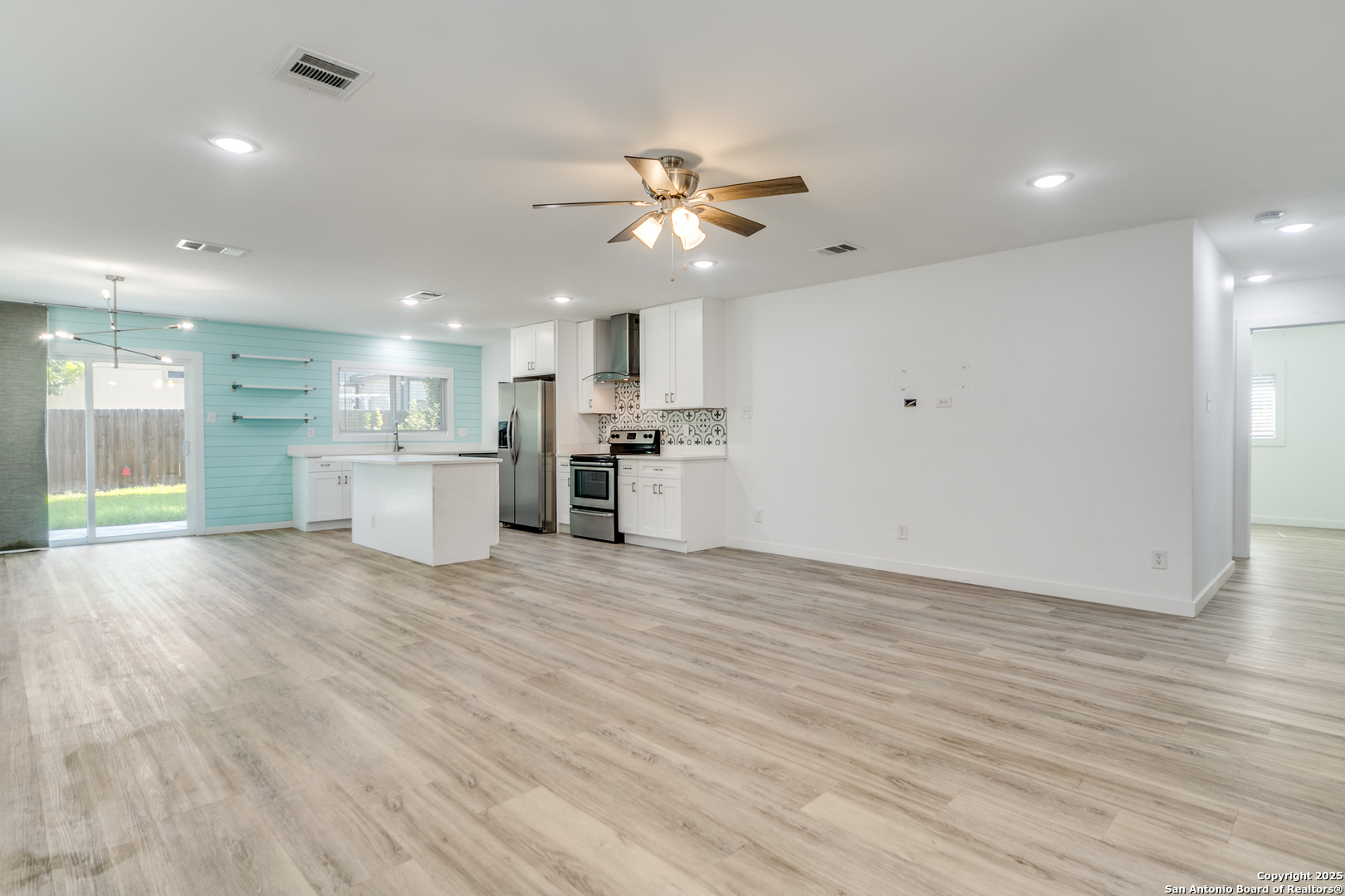 Welcome to this beautifully maintained One-story home! As you step through the front door, you'll be enchanted by the updates and attention to detail. The updated luxury vinyl flooring flows seamlessly throughout, creating a modern and inviting ambiance that will make you feel right at home. The interior and exterior paint add polished sophistication and ensure a move-in ready experience. Prepare to be impressed by the thoughtful upgrades that enhance both comfort and energy efficiency. Details include fully foam-insulated attic! The heart of the home, the kitchen, is an absolute showstopper. Indulge your culinary skills in this open concept kitchen, featuring stunning quartz countertops, sleek all-white shaker cabinets with soft-close drawers, and a generous 6-ft island that offers ample storage and workspace. The modern appliances, including the LG smart Wi-Fi enabled electric range with air fry and easy clean features, cater to the demands of contemporary living and make meal preparation an absolute pleasure. Unwind and rejuvenate in the luxurious bathrooms that exude tranquility and style. The hall bathroom offers a walk-in shower, vanity, and updated lighting. The primary bath provides a personal sanctuary with a blissful rain shower head, and a custom barn door. Thoughtful safety and convenience features include a Ring doorbell, strategically placed floodlights, and security cameras providing peace of mind. The garage has been thoughtfully designed with wall insulation, durable epoxy flooring, and an insulated garage door, as well as a split unit air conditioning and heating system, and two closets with plenty of shelves, ensuring a secure and organized space for your vehicles and/or storage needs. Step outside and be greeted by the 9x12 Mueller shed sitting atop the meticulously landscaped yard, adorned with fresh sod that creates a lush and vibrant setting. The extended driveway and patio offer ample space for outdoor entertaining and relaxation. This location offers unbeatable convenience, just minutes from UTSA, USAA, the Medical Center, La Cantera, and The Rim for plenty of shopping and dining.
