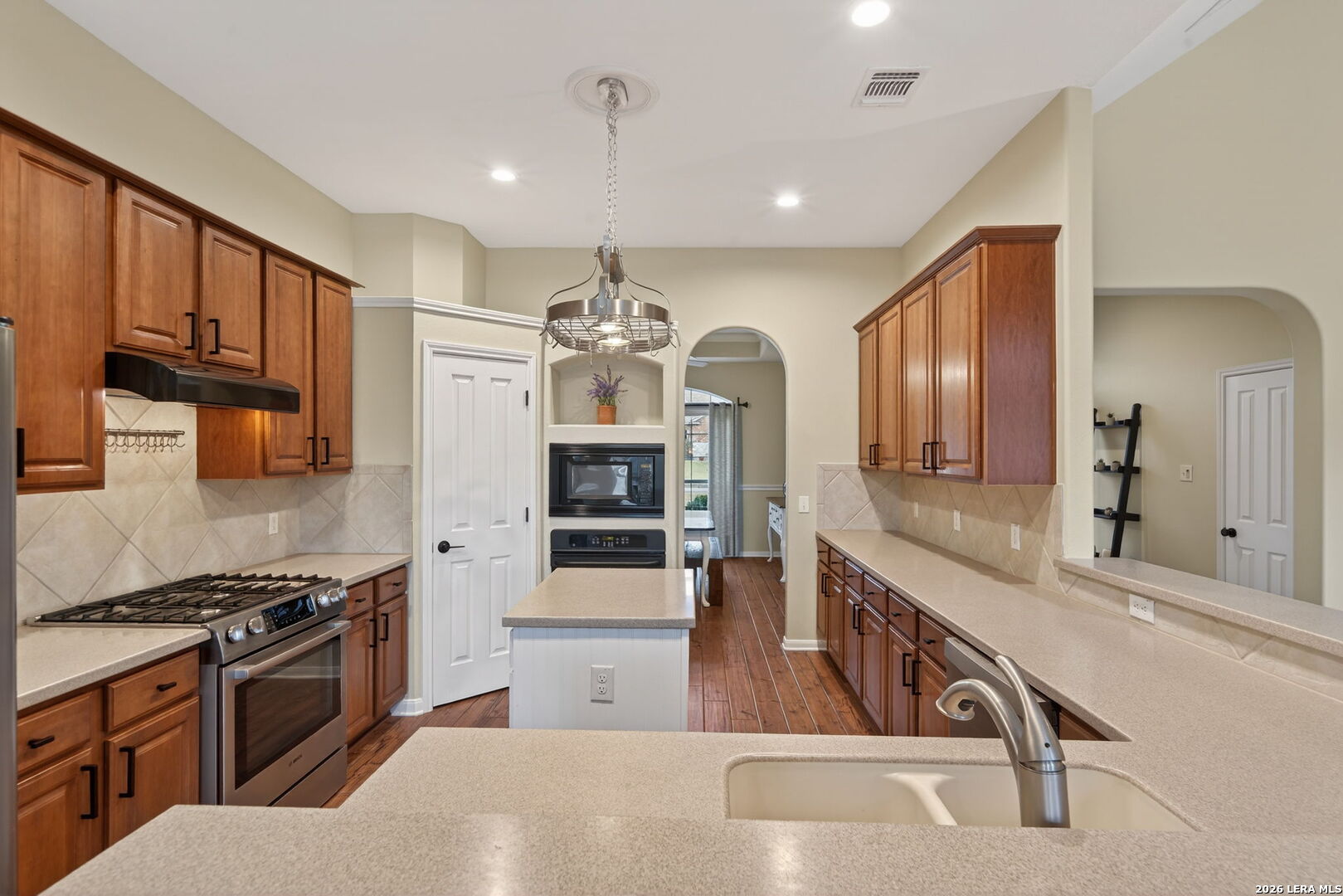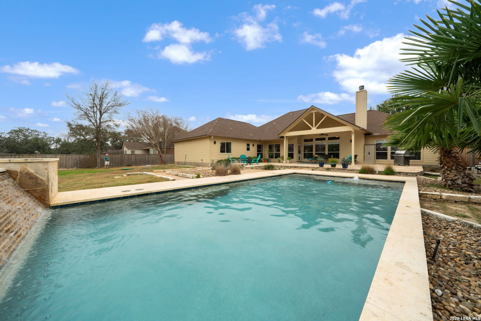 MOVE-IN READY! MUST SEE! Located on a spacious .69-acre lot, almost 3/4 of an acre, in the gated community of Wind Gate Ranch, this move-in ready home offers refined living with privacy and style. Featuring 4 bedrooms, 3 bathrooms, and a 2-car garage, the open-concept layout showcases high ceilings, abundant natural light, elegant porcelain tile flooring, and a statement fireplace. The kitchen is beautifully designed with a large island, walk-in pantry, ample cabinetry, and tiled backsplash, flowing seamlessly into the dining area. The private primary suite is thoughtfully separated and features dual oversized walk-in closets, expansive vanities, and a walk-in shower. Enjoy a private, fenced backyard with lush green space, a resort-style pool with waterfall, and multiple seating areas, perfect for entertaining or relaxing under the Texas sky. Conveniently located near shopping, dining, and major highways.