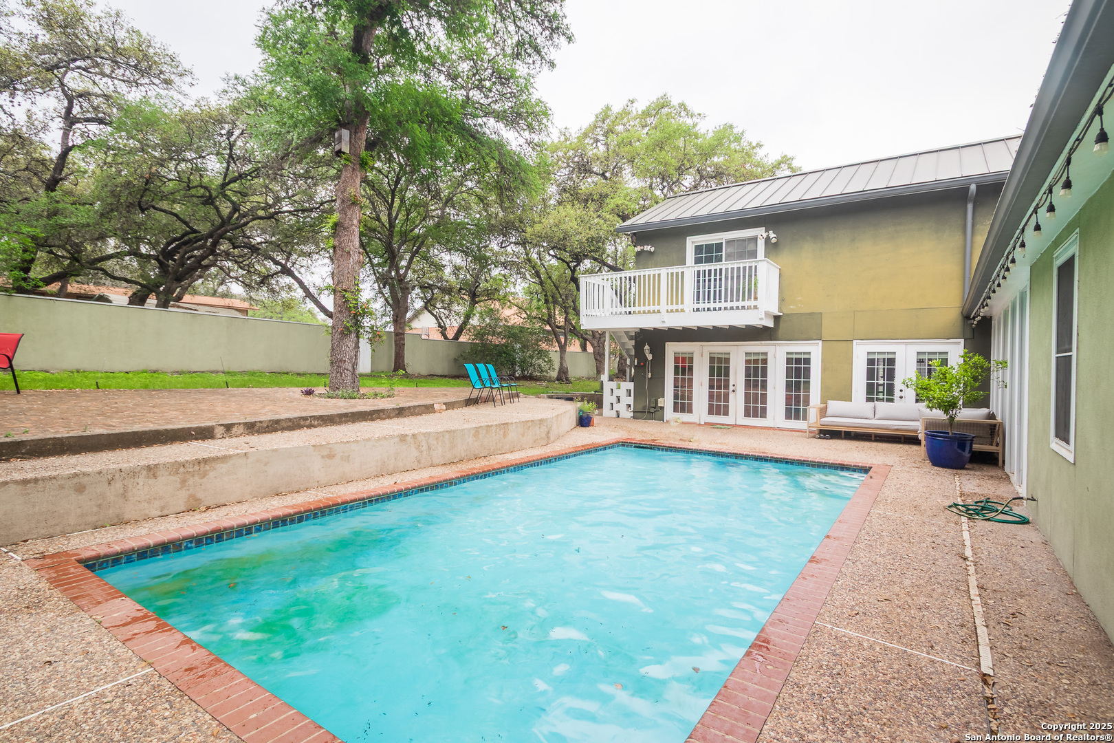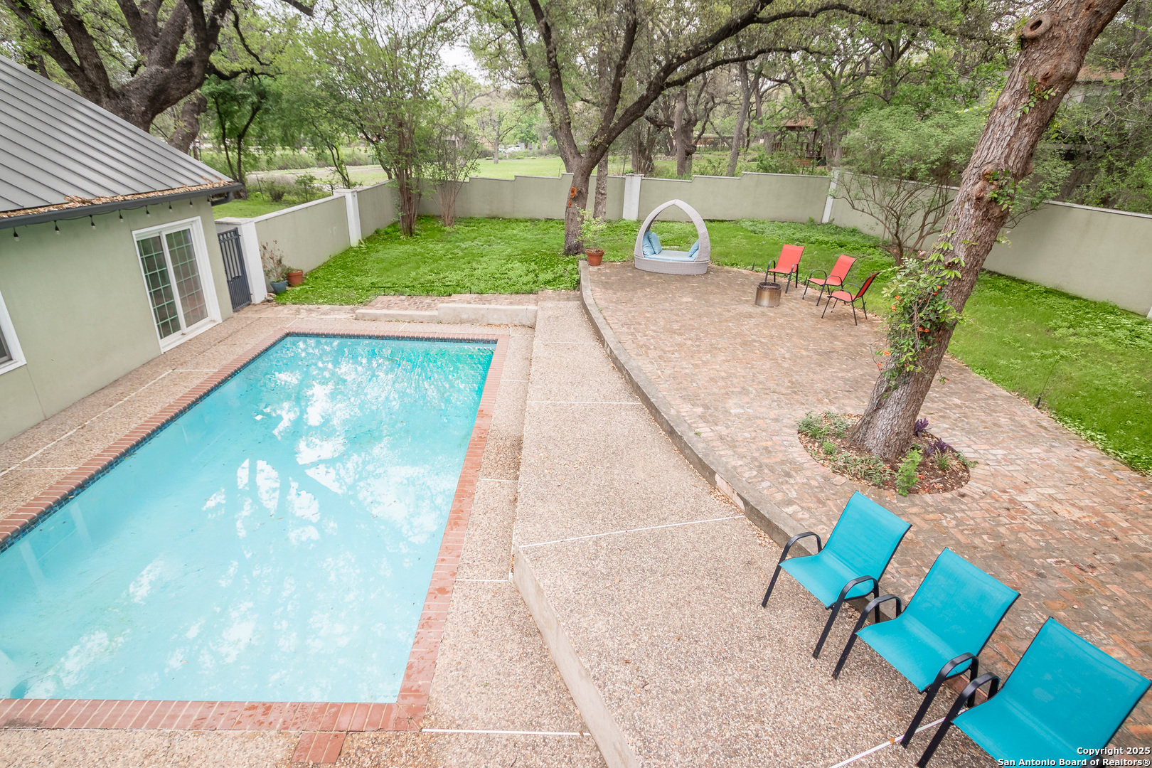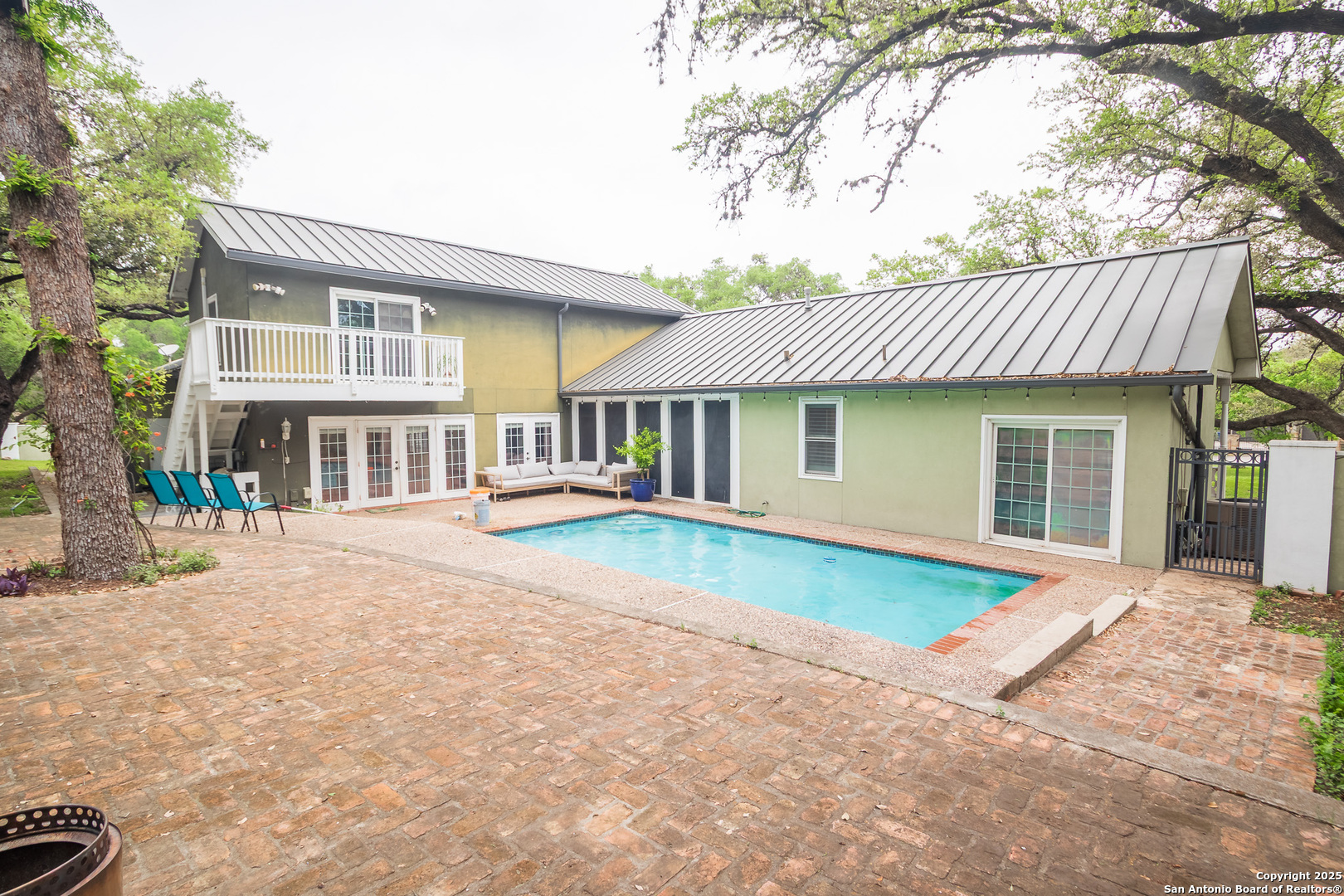 Located in the desirable Forest Oaks neighborhood, this beautifully designed custom home offers a perfect blend of style and functionality. The expansive front porch sets the tone for what's inside, providing a welcoming entry into this meticulously maintained 4-bedroom, 4-bath home. Upon entering, you'll be greeted by a spacious open floor plan featuring gorgeous Saltillo tiles throughout. The gourmet kitchen is a chef's dream with an island, granite countertops, stainless steel appliances, a built-in oven, and a breakfast area-ideal for family meals and entertaining. The luxurious master suite, conveniently located on the main floor, boasts a cozy sitting area, his and hers dressing areas, and a massive walk-in closet. Two secondary bedrooms downstairs adjacent to a full bath, with an additional bedroom and bathroom upstairs located just off the spiral staircase. Step outside to your private backyard oasis, perfect for relaxing and entertaining. Enjoy the sparkling in-ground pool, beautifully manicured landscaping, and mature trees offering both beauty and privacy. A side yard with a sliding gate provides convenient storage for a boat or RV, while the fully fenced and walled backyard ensures privacy and security. Additionally, the home comes with off-site solar panels to offset the monthly electrical expenses. Also, home is within walking distance of the Salado Creek Trail, offering access to miles of greenways for walking, running, and cycling, with links to other San Antonio trails. This home combines luxury living with the beauty of nature, making it a truly special place to call home.