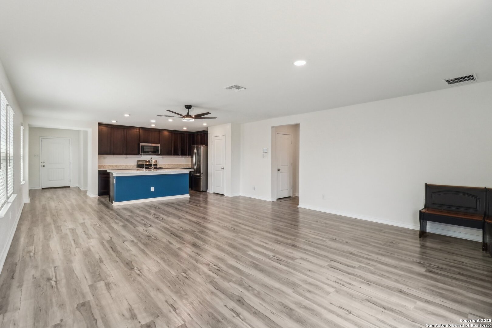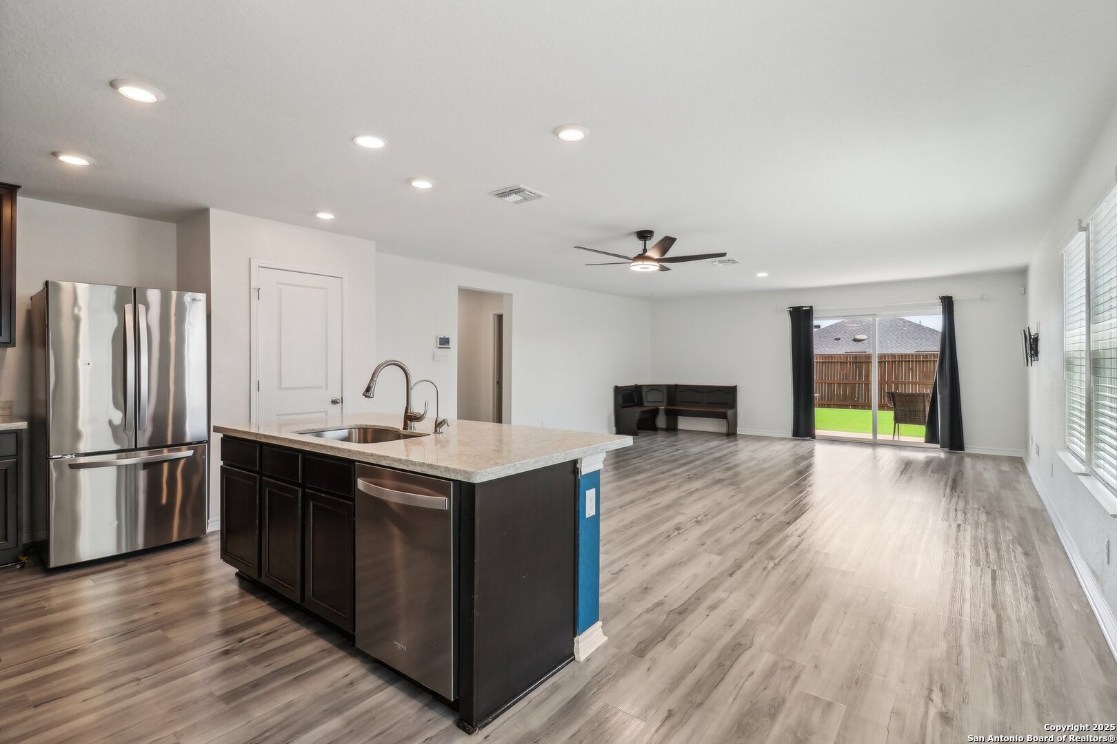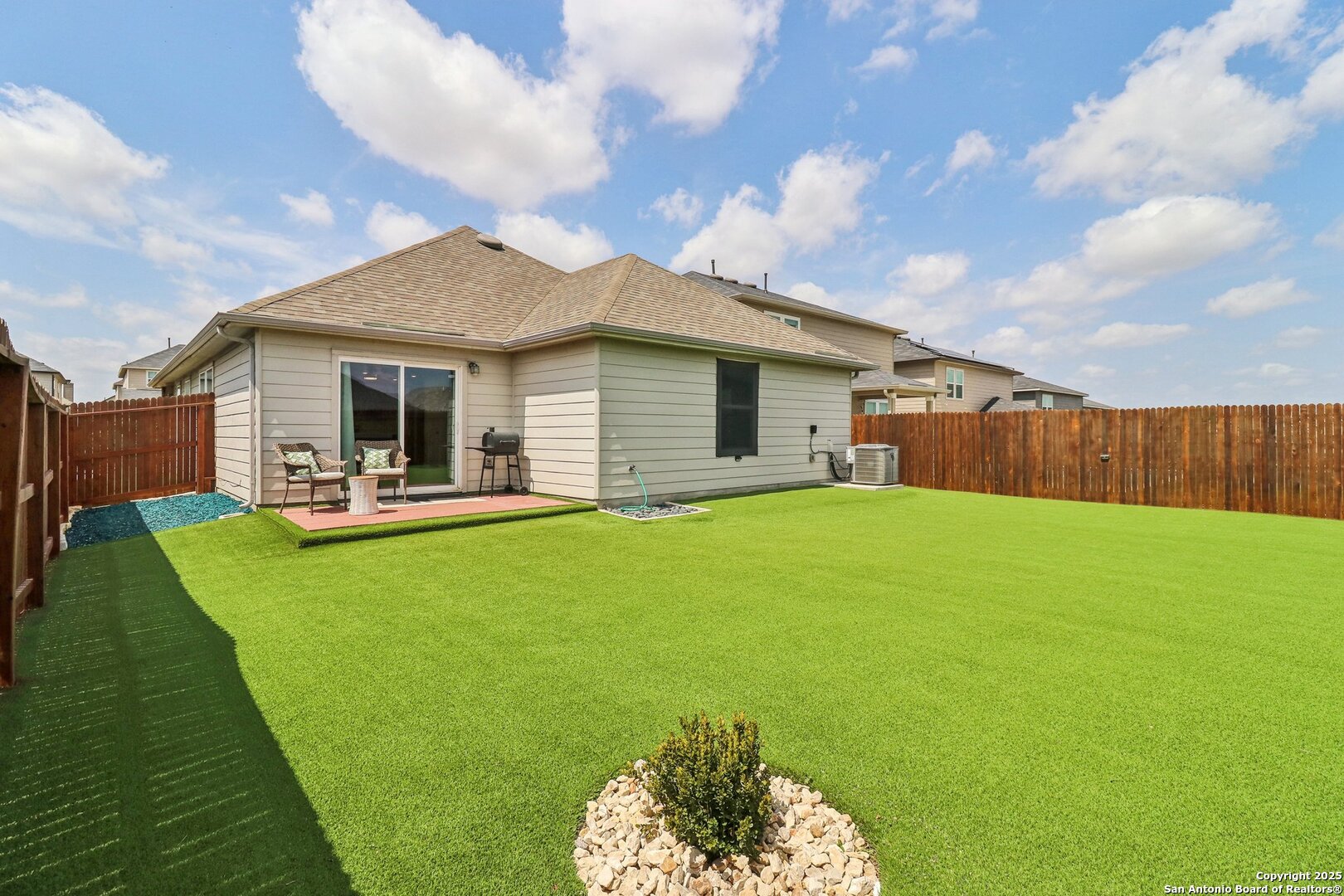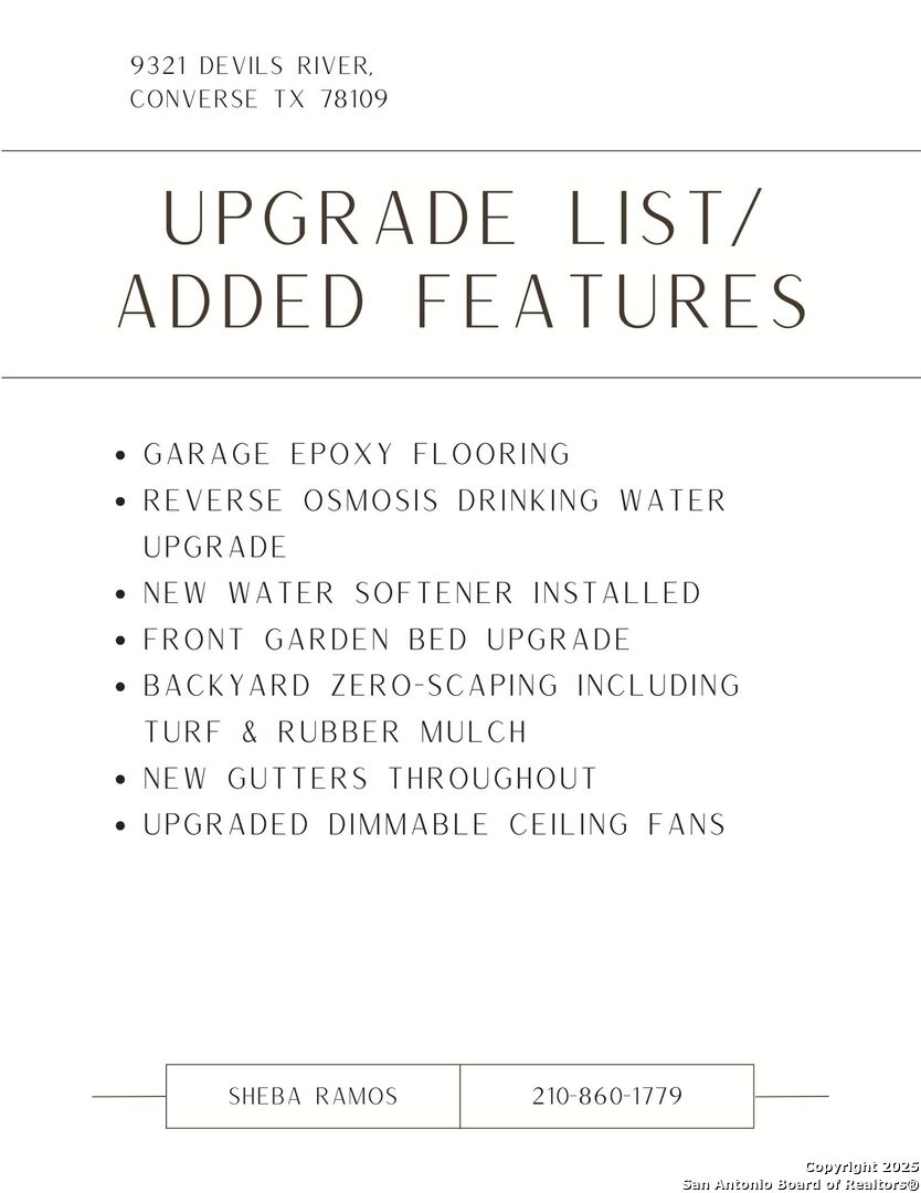 Motivated Seller! Price change. All appliances convey* Welcome to this beautifully upgraded one-story home that perfectly blends style, comfort, and function. The open-concept layout is bathed in natural light, creating a bright, airy feel from the upgraded kitchen to the spacious living area. The kitchen itself is just as inviting-featuring a large eat-in island that's perfect for casual dining, gathering, or meal prep. The primary suite offers a quiet retreat, complete with a renovated bathroom featuring a double vanity, upgraded tiled shower, and large walk-in closet. Throughout the home, upgraded flooring and remote-controlled dimmable ceiling fans add a sleek, modern touch. Three additional bedrooms-each with walk-in closets-give you the space you need, along with a full secondary bathroom. Smart thermostats and a water softener system add convenience, while the two-car garage features built-in shelving and upgraded epoxy flooring for added utility and polish. Outside, enjoy low-maintenance landscaping with turf across the backyard, rubber mulch along the sides, and fresh garden beds in the front. This move-in ready gem is conveniently located near Randolph AFB, with nearby shopping and entertainment. Schedule your showing today!