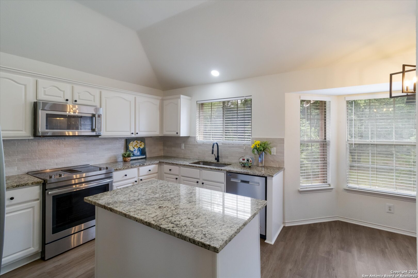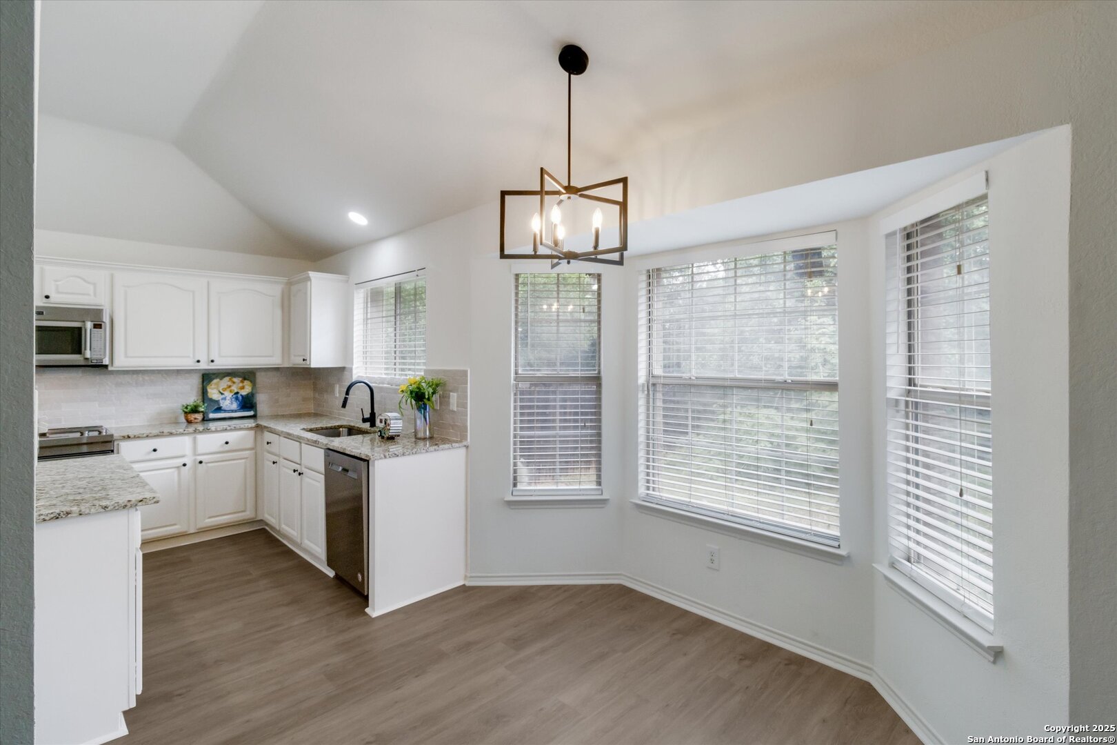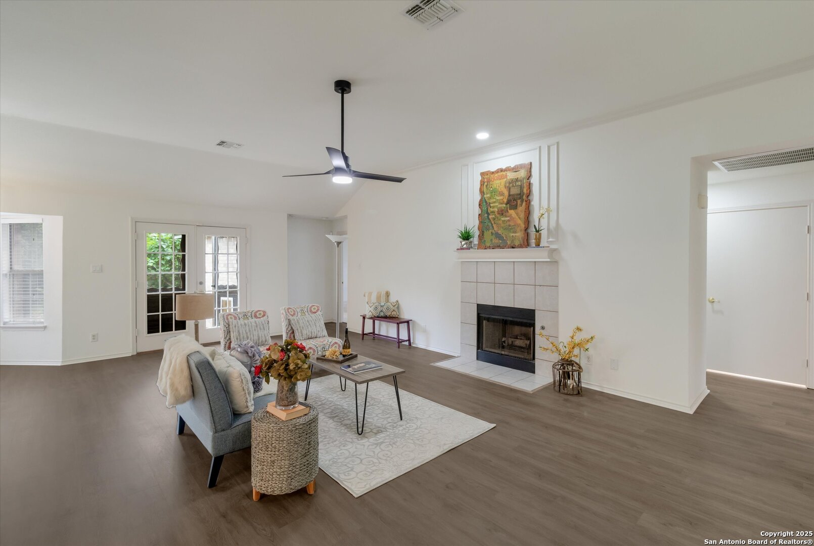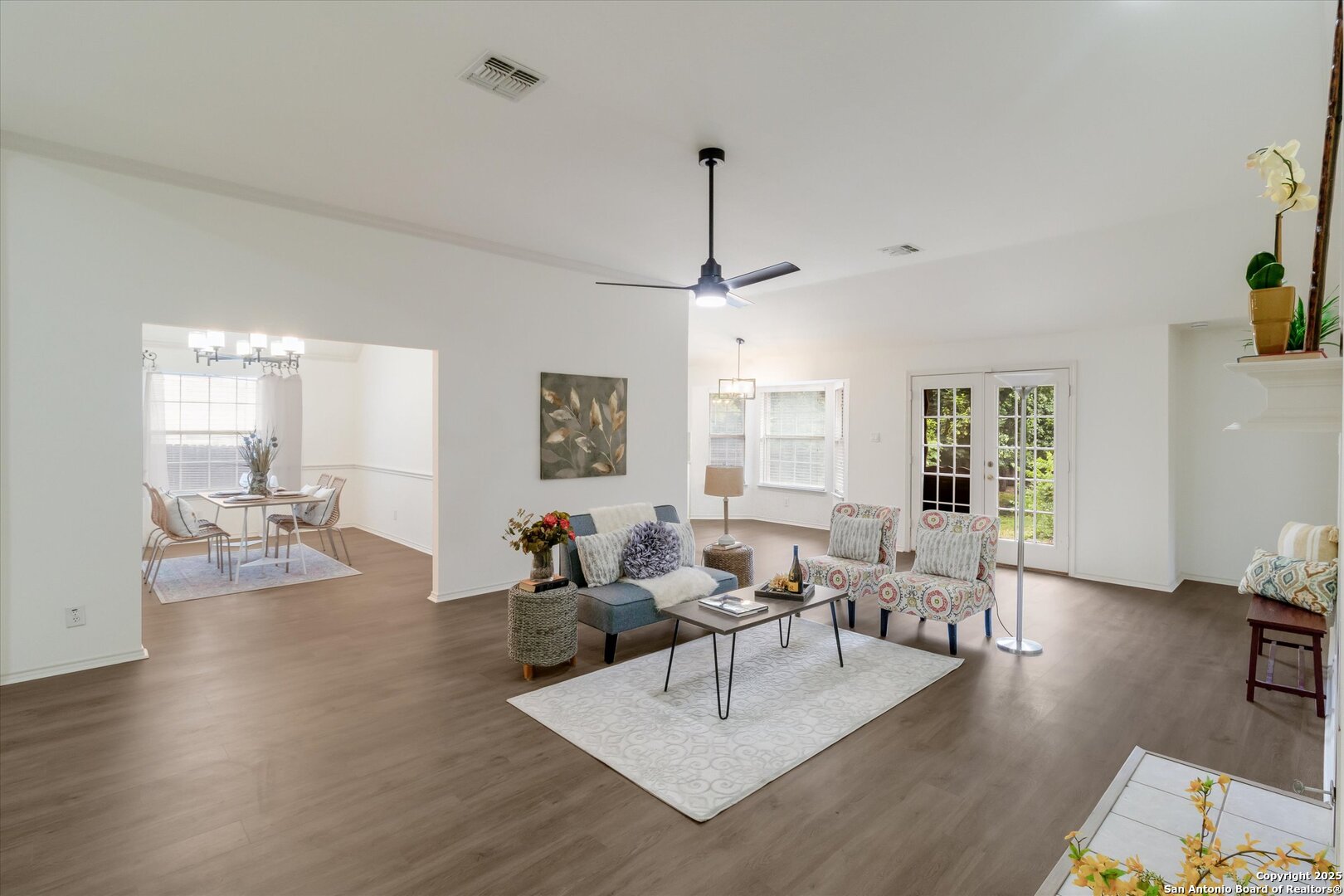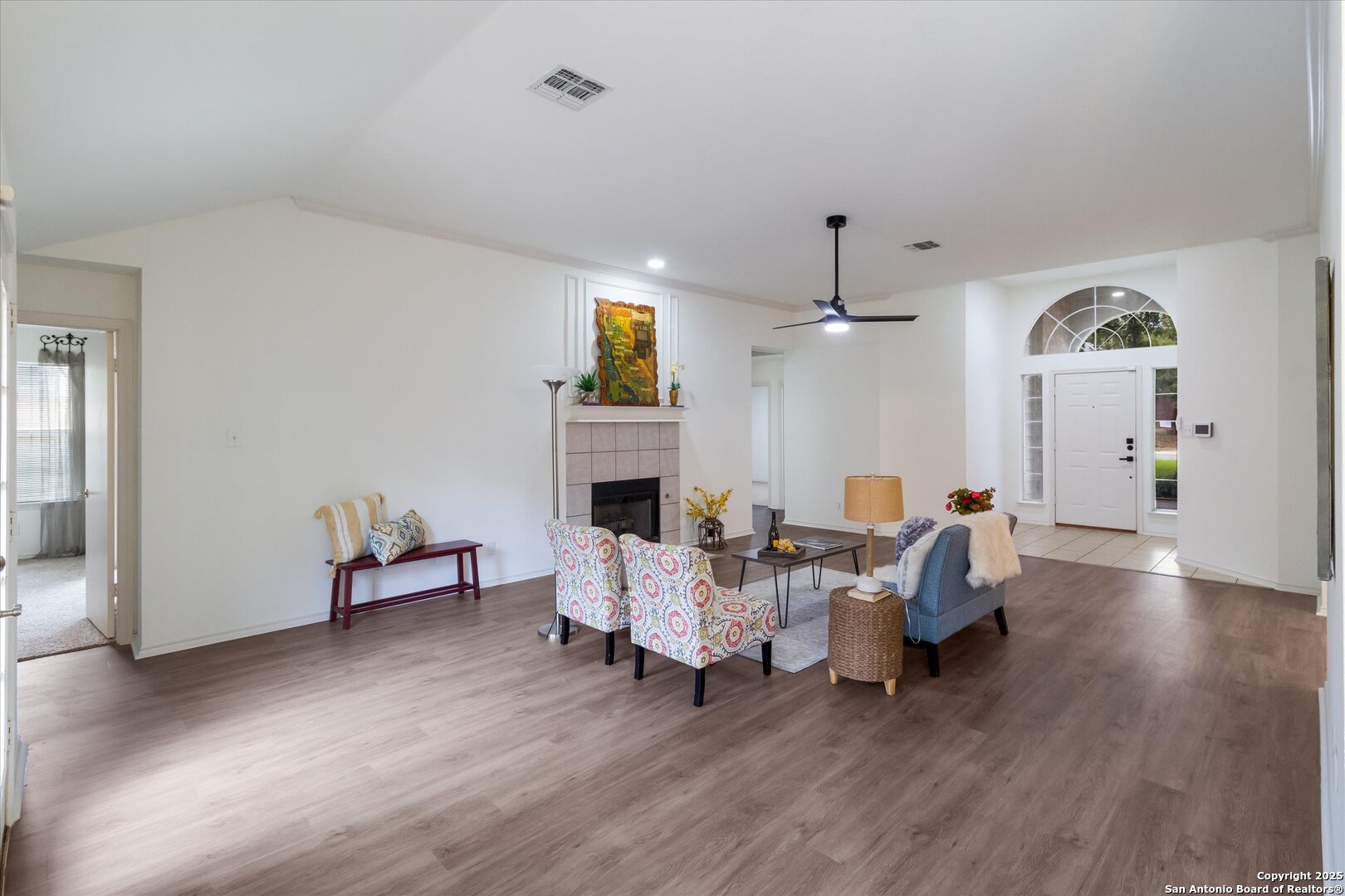 Welcome to 9326 Camino Venado, a beautifully updated traditional home nestled in a gated community on the Northside of San Antonio. This thoughtfully designed single-story home offers 2,083 square feet of living space with 3 bedrooms, 2 full baths, and a versatile study/flex space that could easily serve as a fourth bedroom. From the moment you arrive, the curb appeal is undeniable. Mature trees frame the brick exterior, creating a warm and inviting setting. Inside, you'll find fresh interior paint, new luxury vinyl plank flooring throughout the main living areas, and plush new carpet in the bedrooms. The open-concept layout is anchored by a light-filled living room with a cozy fireplace, seamlessly connecting to the dining area and updated kitchen. Featuring granite counters, painted cabinetry, and stainless-steel appliances, the kitchen is a perfect blend of style and function. The spacious primary suite offers a private retreat, complete with a walk-in closet and an updated bath boasting granite counters, dual vanities, and a soaking tub. Secondary bedrooms are generously sized, and the flexible bonus room adds even more versatility to the floorplan. Outdoors, the property truly shines. Set on a rare double lot totaling .39 acres, the backyard is a peaceful oasis dotted with mature shade trees-ideal for gatherings, play, or even adding a pool. With quick access to Loop 1604 and close proximity to top-rated Northside ISD schools, shopping, dining, and entertainment, this home offers both convenience and comfort. This is where your next chapter begins!
