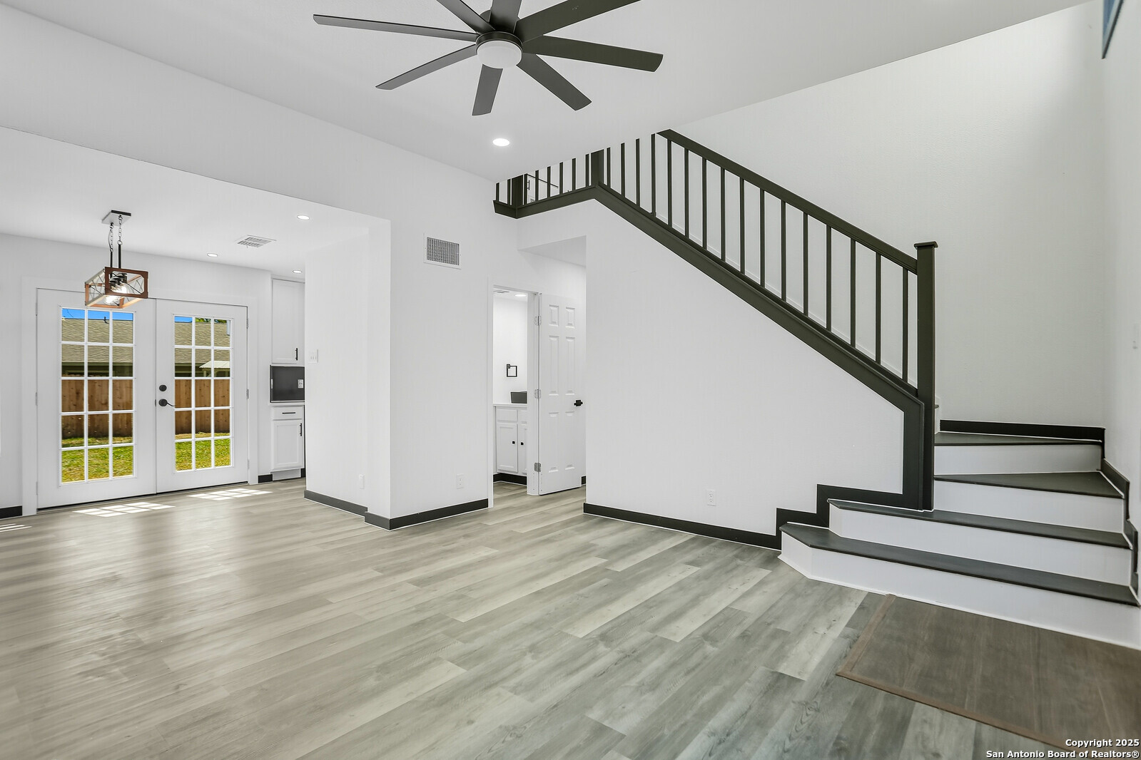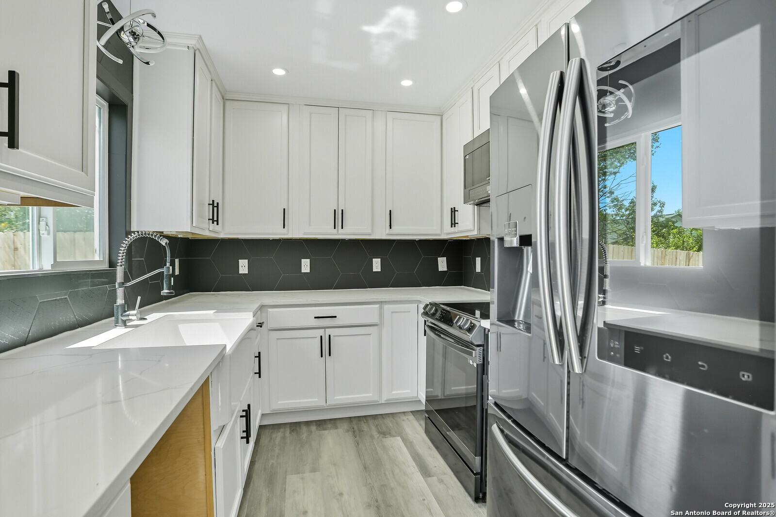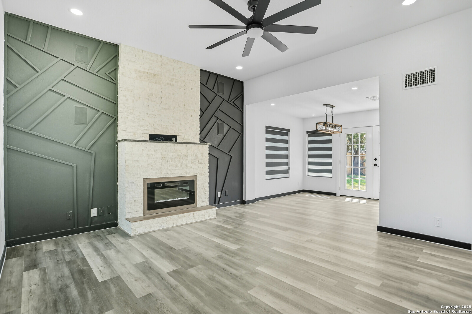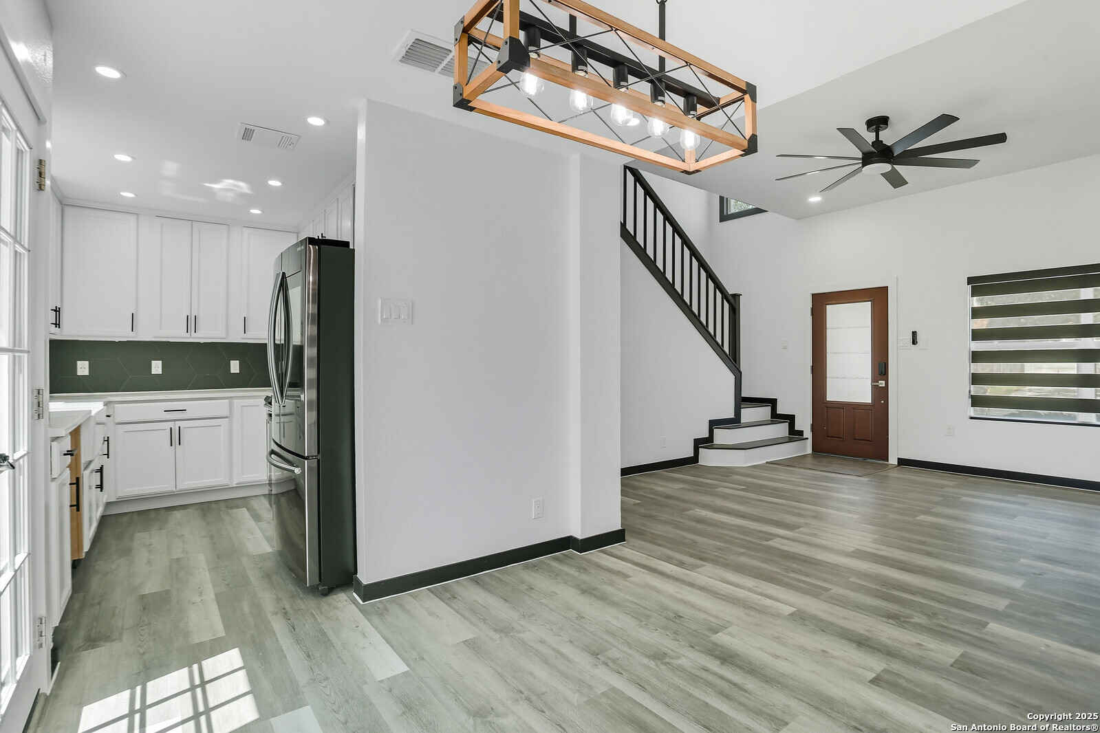 Updated to perfection, this stunning 4-bedroom, 2.5-bath home is move-in ready and perfectly situated in Northwest San Antonio with quick access to Loop 1604 and Hwy 151. Step inside to an inviting open-concept layout filled with natural light, featuring sleek laminate and tile flooring and a cozy fireplace that anchors the living space. The kitchen has been beautifully remodeled with modern cabinetry, designer backsplash, stainless steel appliances, and a seamless flow into the dining and living areas perfect for entertaining or everyday living. The spacious primary suite is tucked away downstairs with a walk-in closet and a freshly updated bath while upstairs two additional bedrooms and a full bath, giving everyone their own space. The garage has been thoughtfully converted into a huge second living area or optional 4th bedroom, giving this home incredible flexibility for your needs. A convenient indoor utility room and fresh interior paint add to the appeal, while the fully fenced backyard offers privacy and room to relax or entertain. With stylish updates throughout and a prime location near Alamo Ranch shopping, dining, and major highways, this home is ready to welcome its new owners.