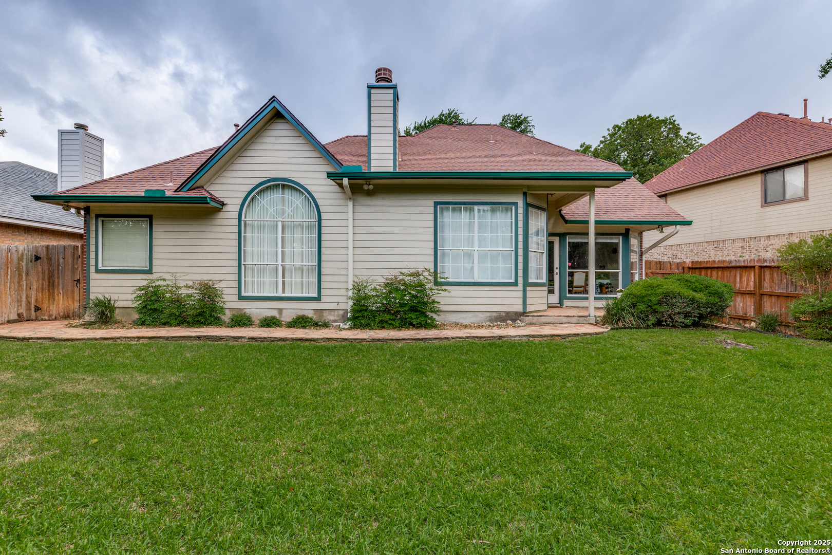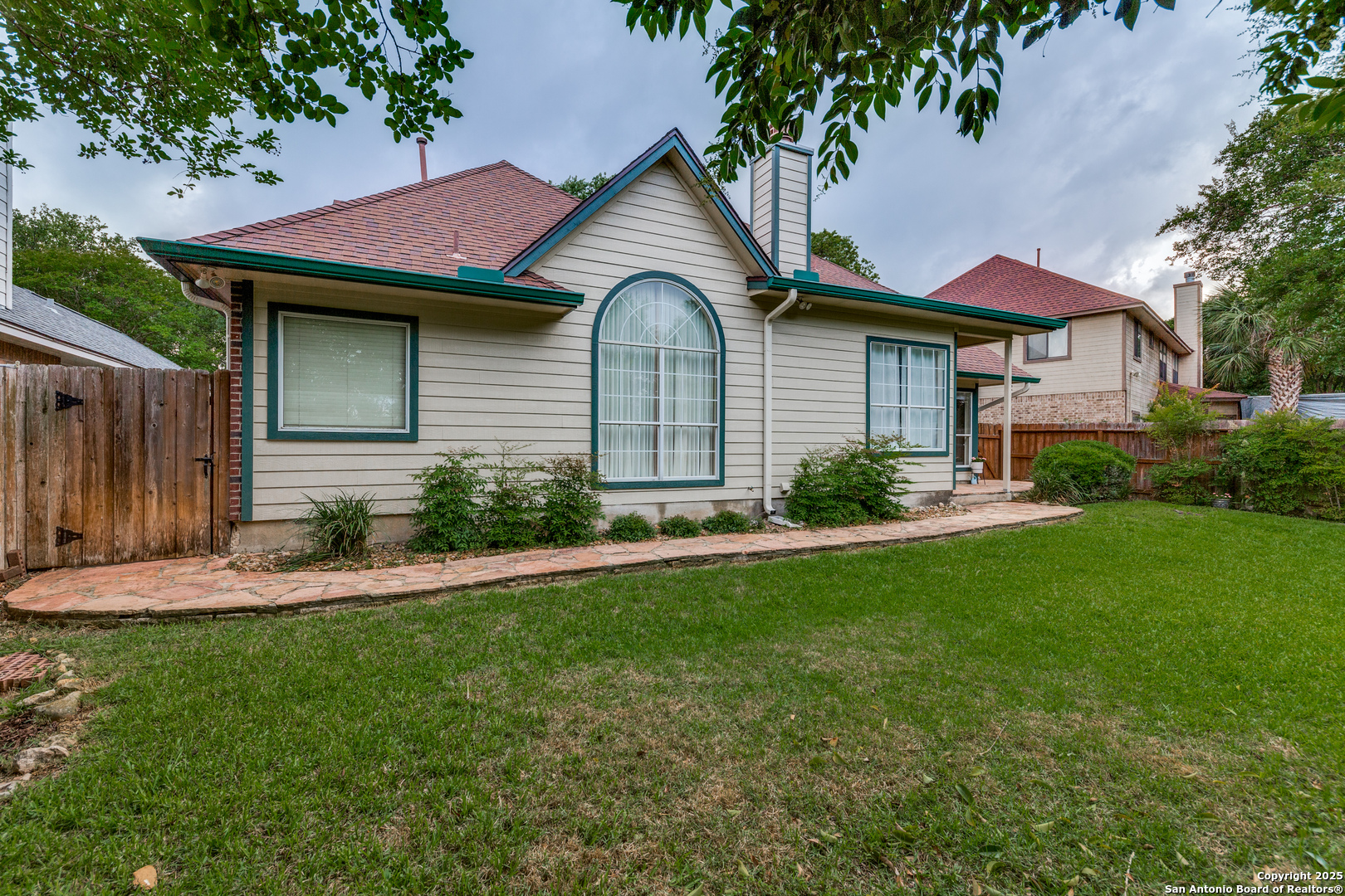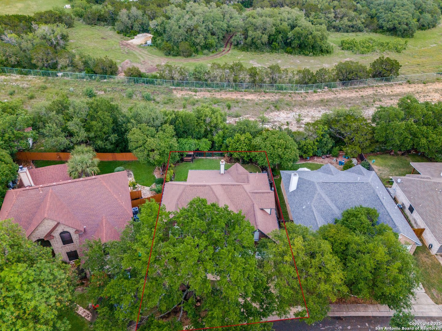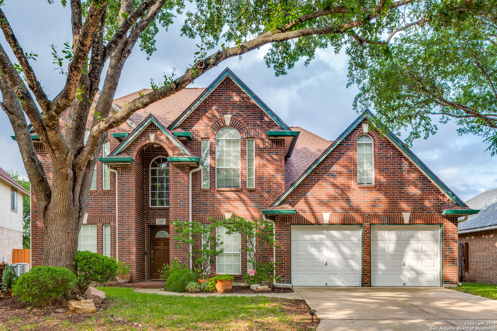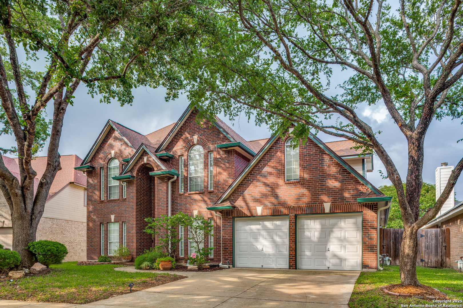 Nestled in the gated community of Cedar Springs in Helotes, this beautiful two-story 2628 sq. ft. home offers 4 bedrooms and 2.5 baths on a greenbelt lot. The spacious layout includes a formal dining room, a dedicated office, and a generous family room with stone fireplace-perfect for entertaining. The kitchen features granite countertops and overlooks the main living space with rich hardwood flooring. The primary bedroom is conveniently located downstairs and boasts a stunning remodeled en-suite bath with updated shower, tub, countertops, tile, and fixtures. Upstairs, you'll find three large bedrooms and a full bathroom. One of the bedrooms includes attic access and is already plumbed for a potential additional bathroom. The fenced backyard provides a serene retreat, with the lot extending to the creek bed for added privacy and space. Enjoy the fantastic neighborhood amenities, including a pool, tennis courts, clubhouse, and a park/playground. Located just minutes from H-E-B, Home Depot, and nearby shopping centers, this home combines comfort, convenience, and community. ** swing in backyard does not convey**