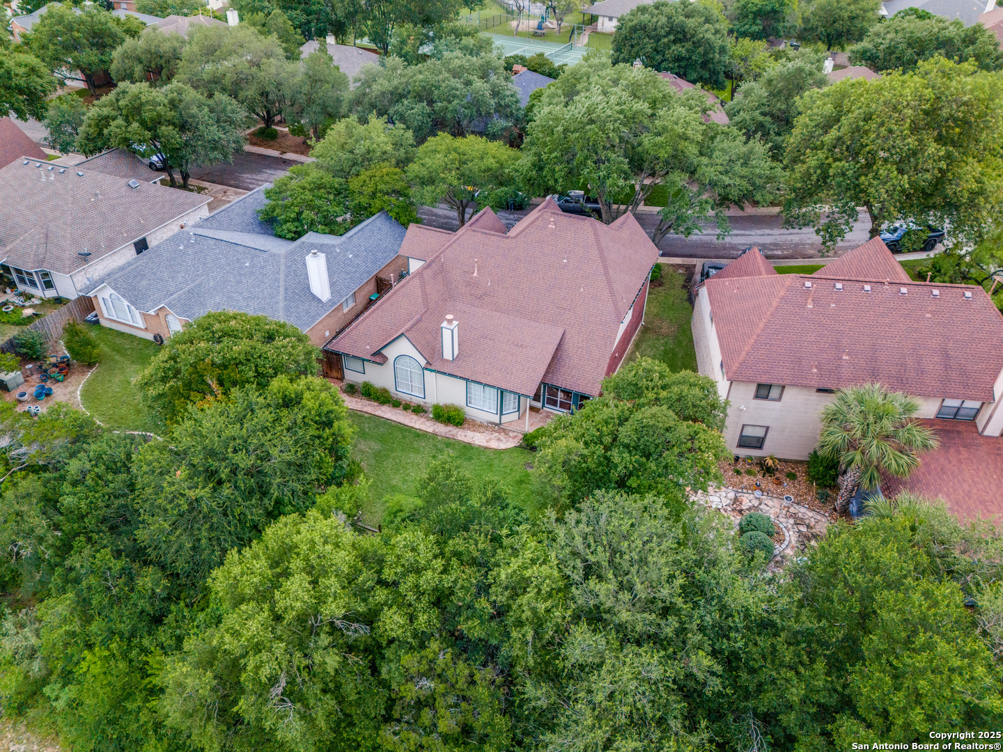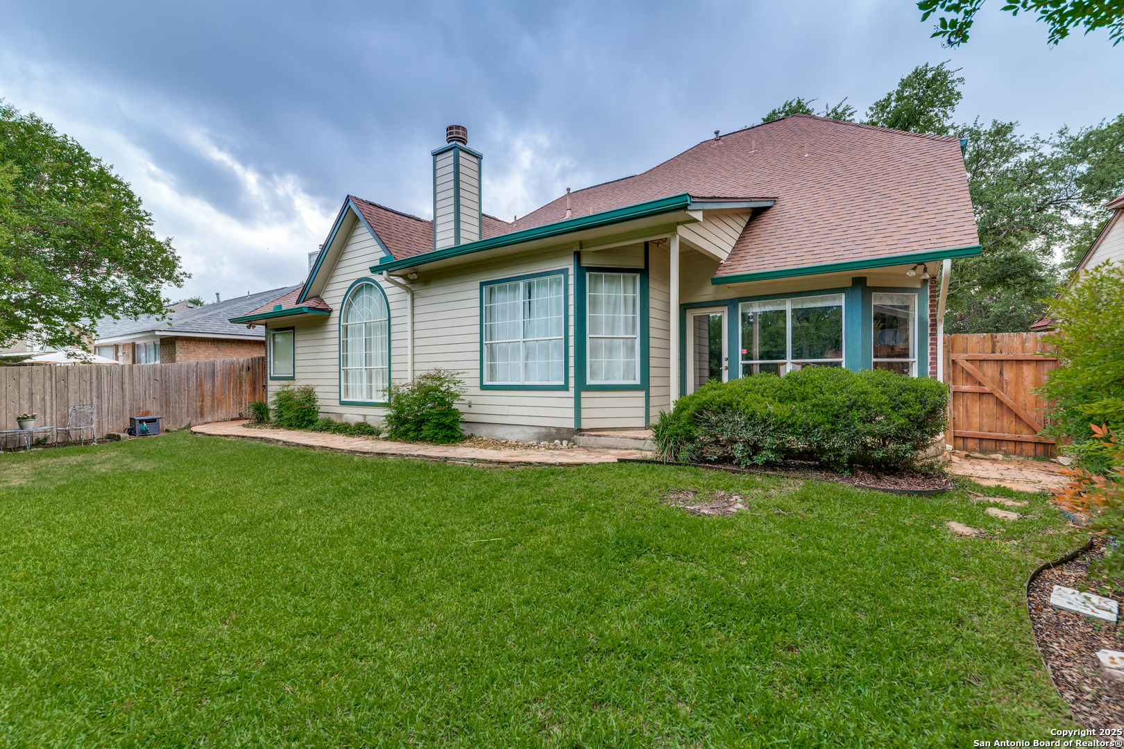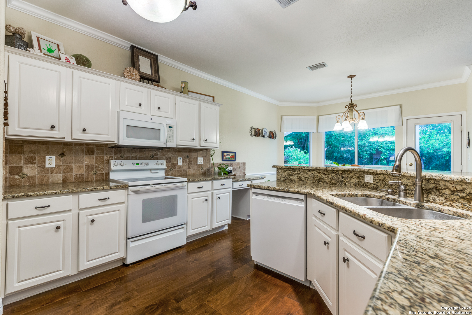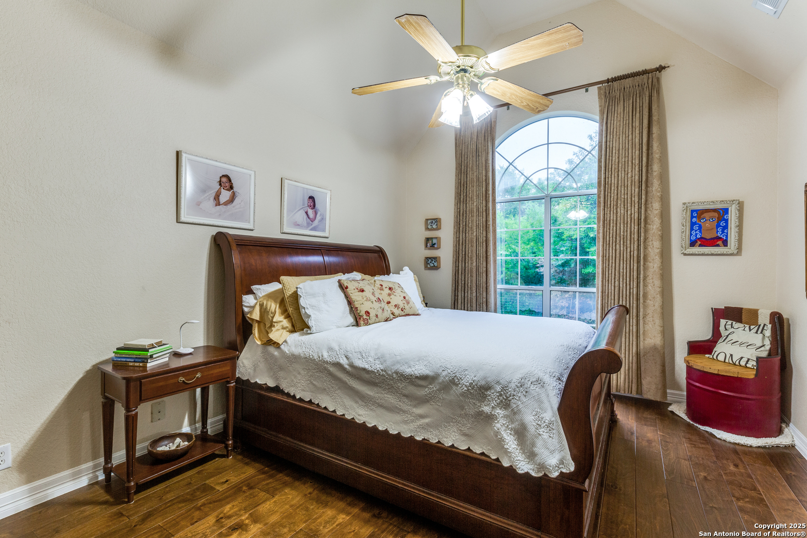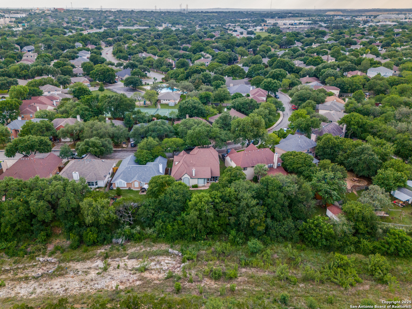 Nestled in the gated community of Cedar Springs in Helotes, this beautiful two-story 2628 sq. ft. home offers 4 bedrooms and 2.5 baths on a greenbelt lot. The spacious layout includes a formal dining room, a dedicated office, and a generous family room with stone fireplace-perfect for entertaining. The kitchen features granite countertops and overlooks the main living space with rich hardwood flooring. The primary bedroom is conveniently located downstairs and boasts a stunning remodeled en-suite bath with updated shower, tub, countertops, tile, and fixtures. Upstairs, you'll find three large bedrooms and a full bathroom. One of the bedrooms includes attic access and is already plumbed for a potential additional bathroom. The fenced backyard provides a serene retreat, with the lot extending to the creek bed for added privacy and space. Enjoy the fantastic neighborhood amenities, including a pool, tennis courts, clubhouse, and a park/playground. Located just minutes from H-E-B, Home Depot, and nearby shopping centers, this home combines comfort, convenience, and community. ** swing in backyard does not convey**