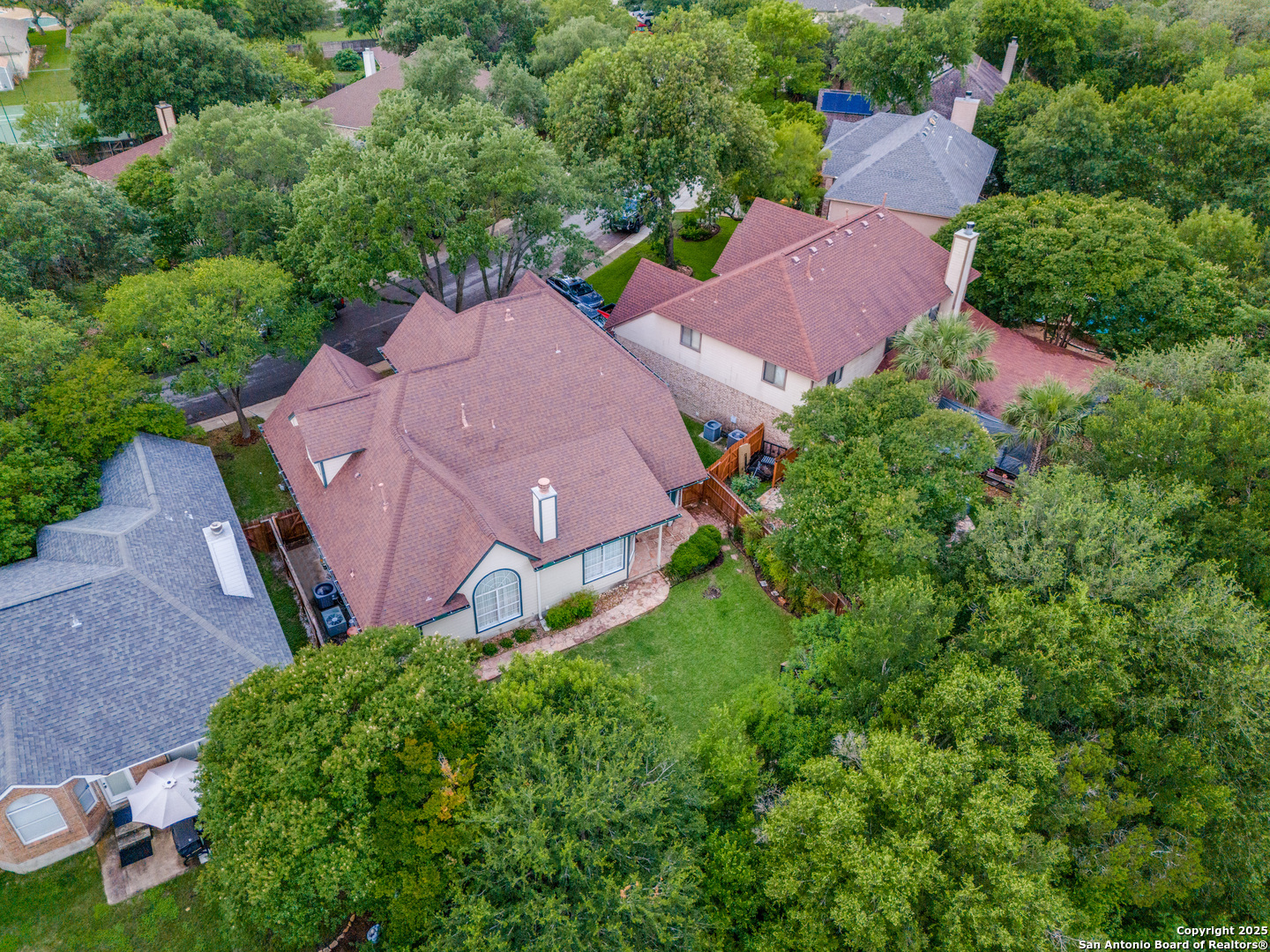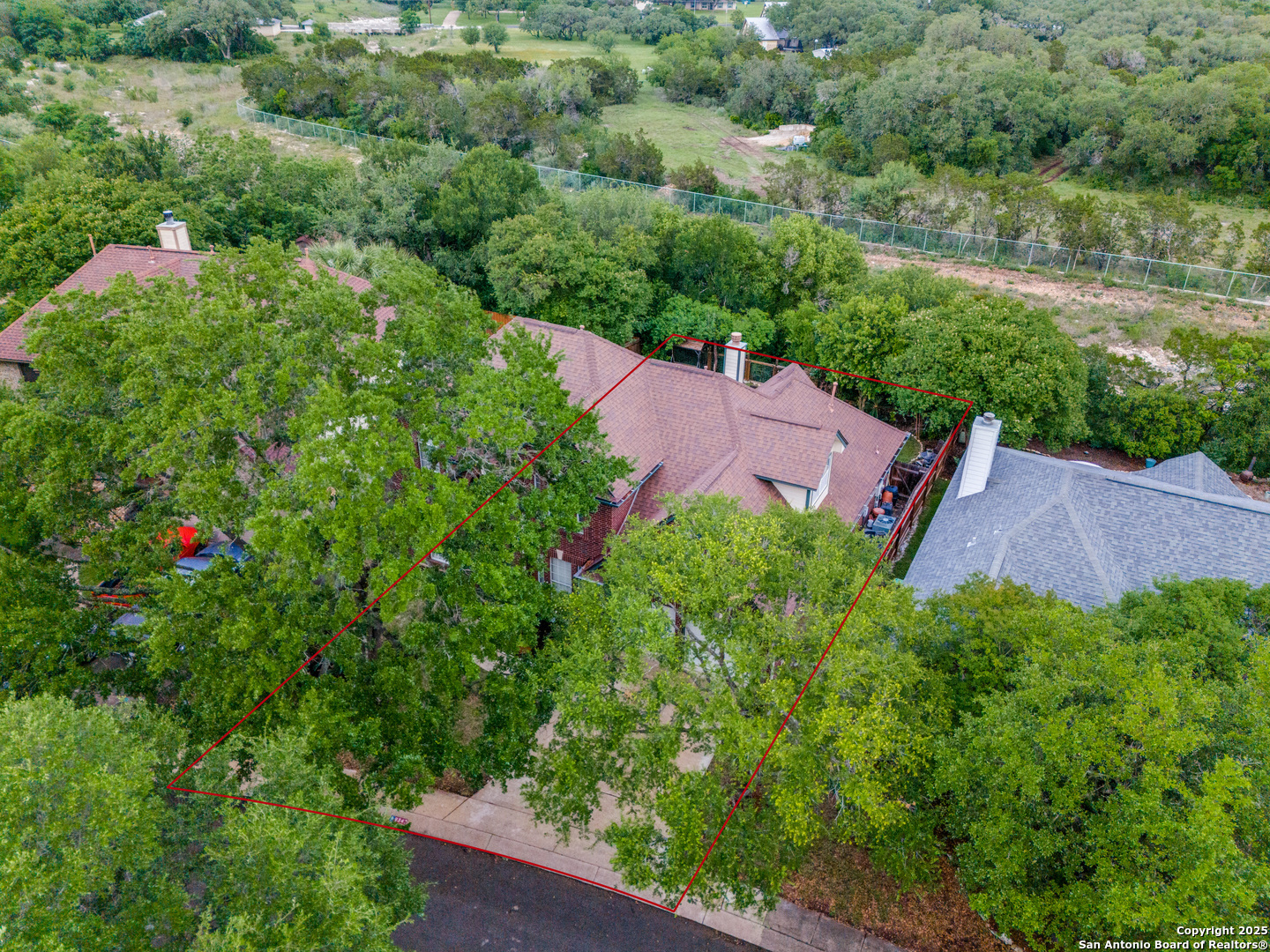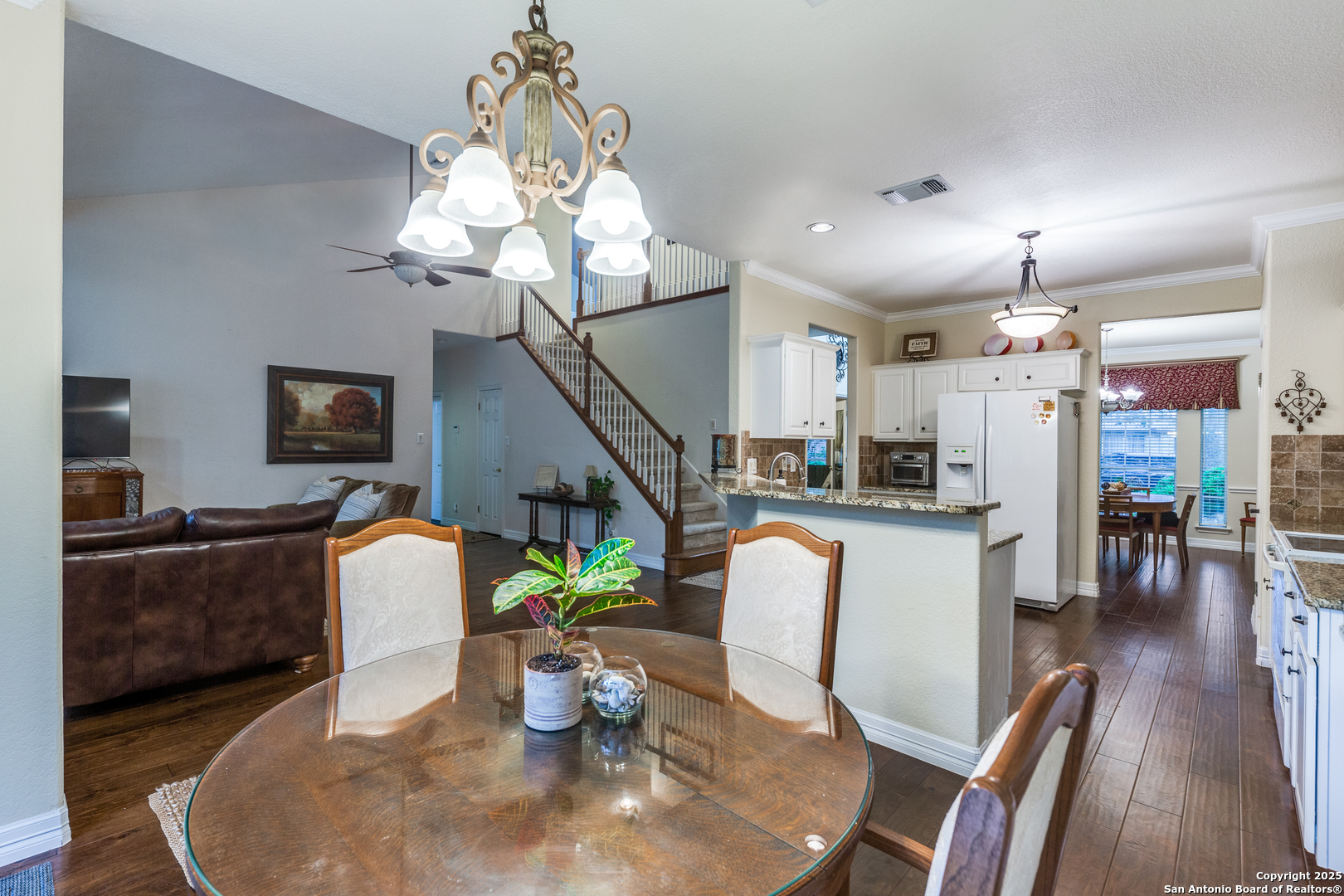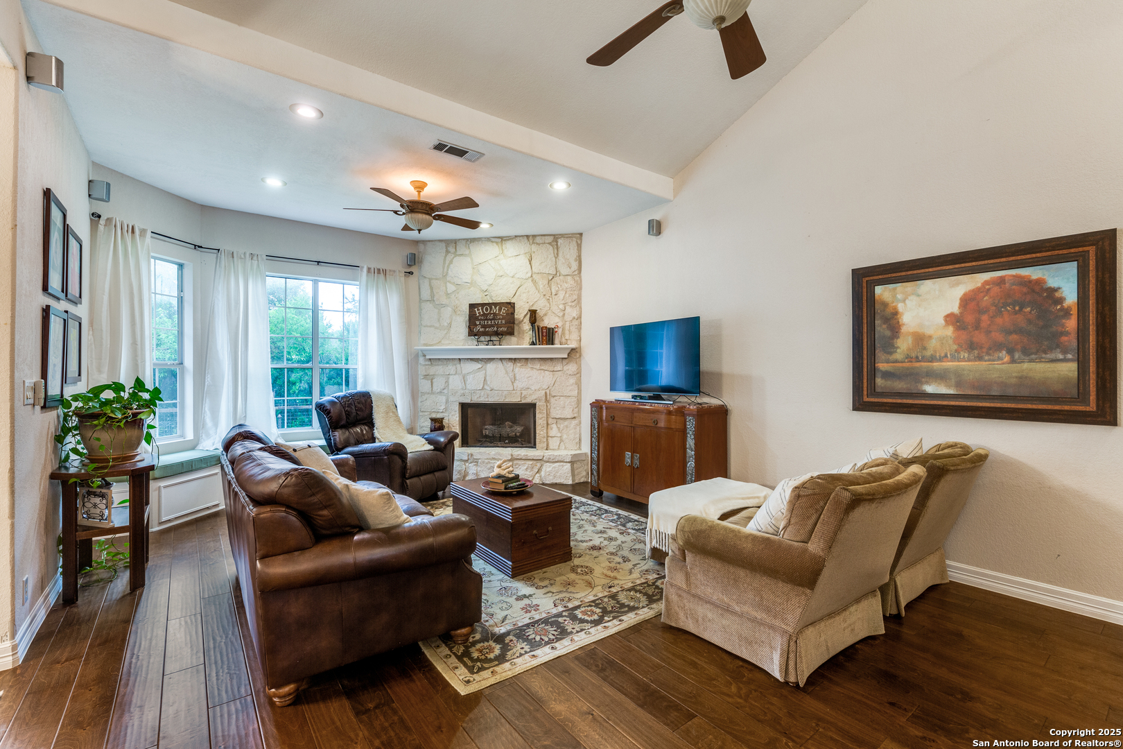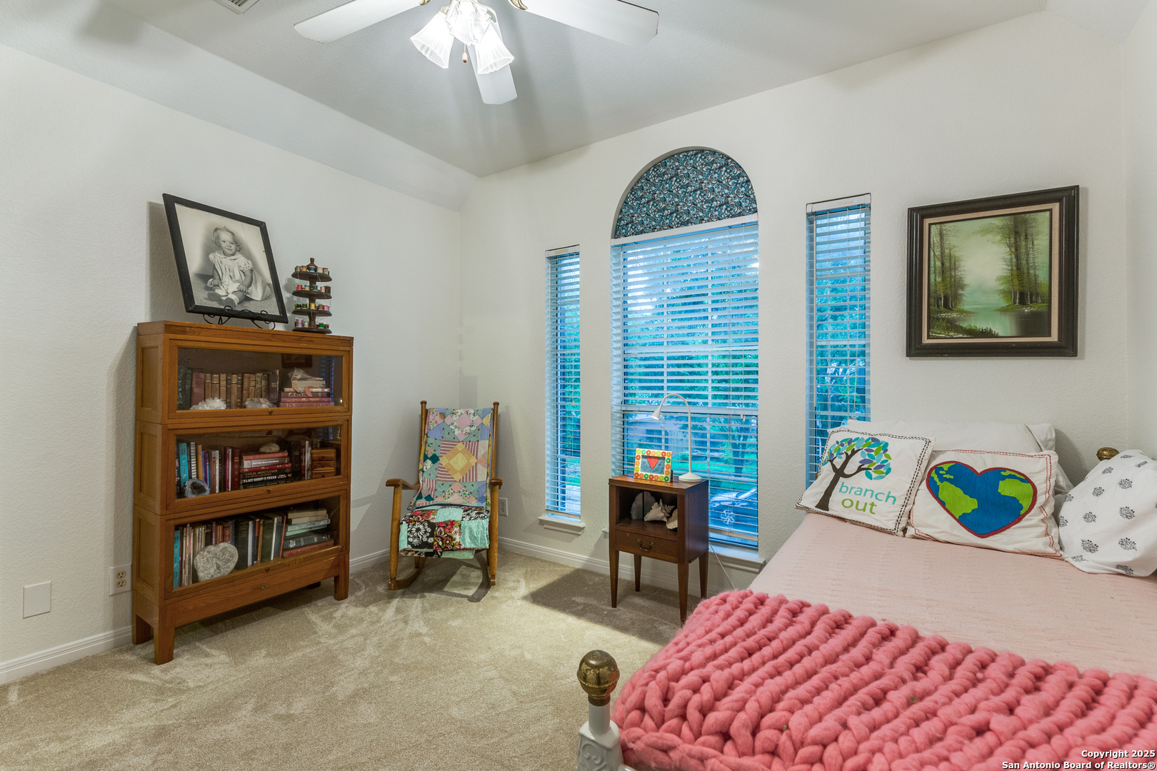Nestled in the gated community of Cedar Springs in Helotes, this beautiful two-story 2628 sq. ft. home offers 4 bedrooms and 2.5 baths on a greenbelt lot. The spacious layout includes a formal dining room, a dedicated office, and a generous family room with stone fireplace-perfect for entertaining. The kitchen features granite countertops and overlooks the main living space with rich hardwood flooring. The primary bedroom is conveniently located downstairs and boasts a stunning remodeled en-suite bath with updated shower, tub, countertops, tile, and fixtures. Upstairs, you'll find three large bedrooms and a full bathroom. One of the bedrooms includes attic access and is already plumbed for a potential additional bathroom. The fenced backyard provides a serene retreat, with the lot extending to the creek bed for added privacy and space. Enjoy the fantastic neighborhood amenities, including a pool, tennis courts, clubhouse, and a park/playground. Located just minutes from H-E-B, Home Depot, and nearby shopping centers, this home combines comfort, convenience, and community. ** swing in backyard does not convey**