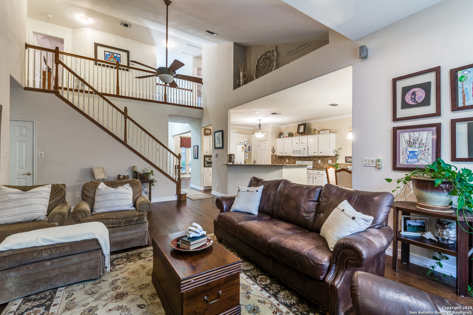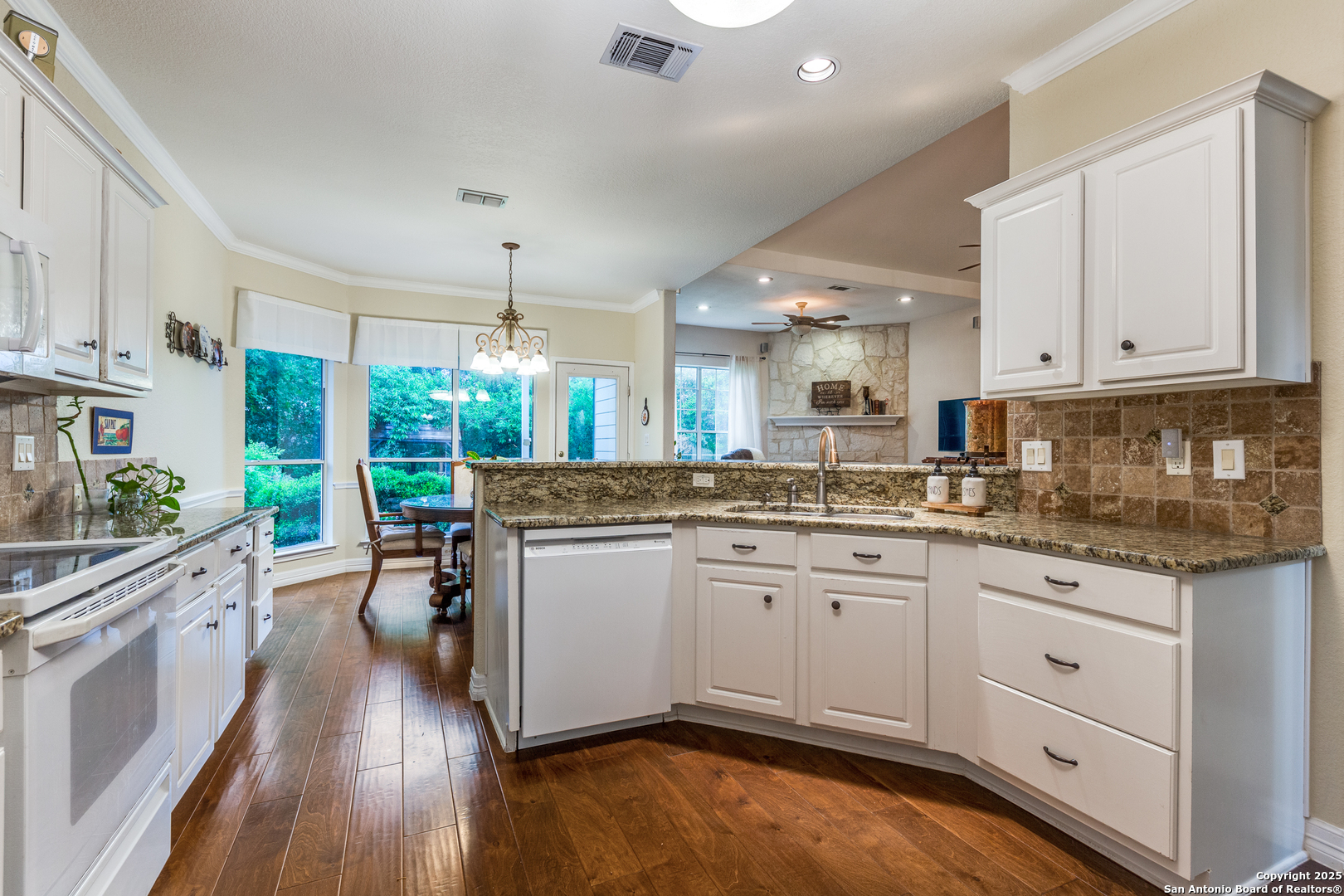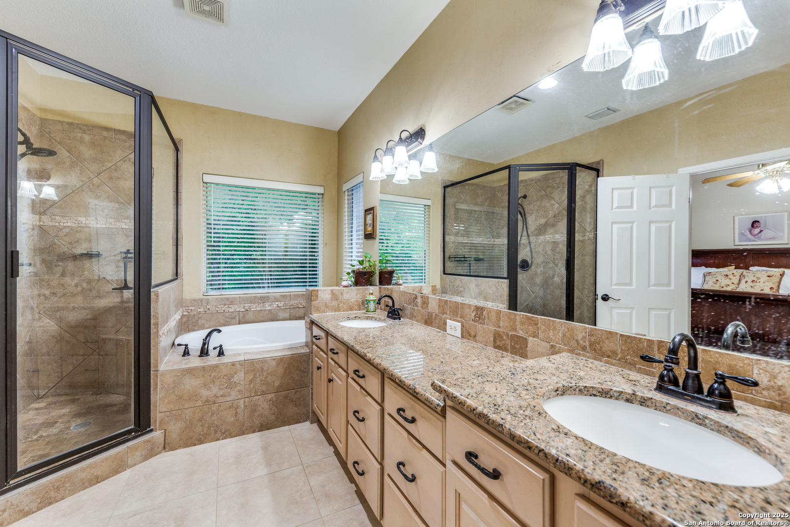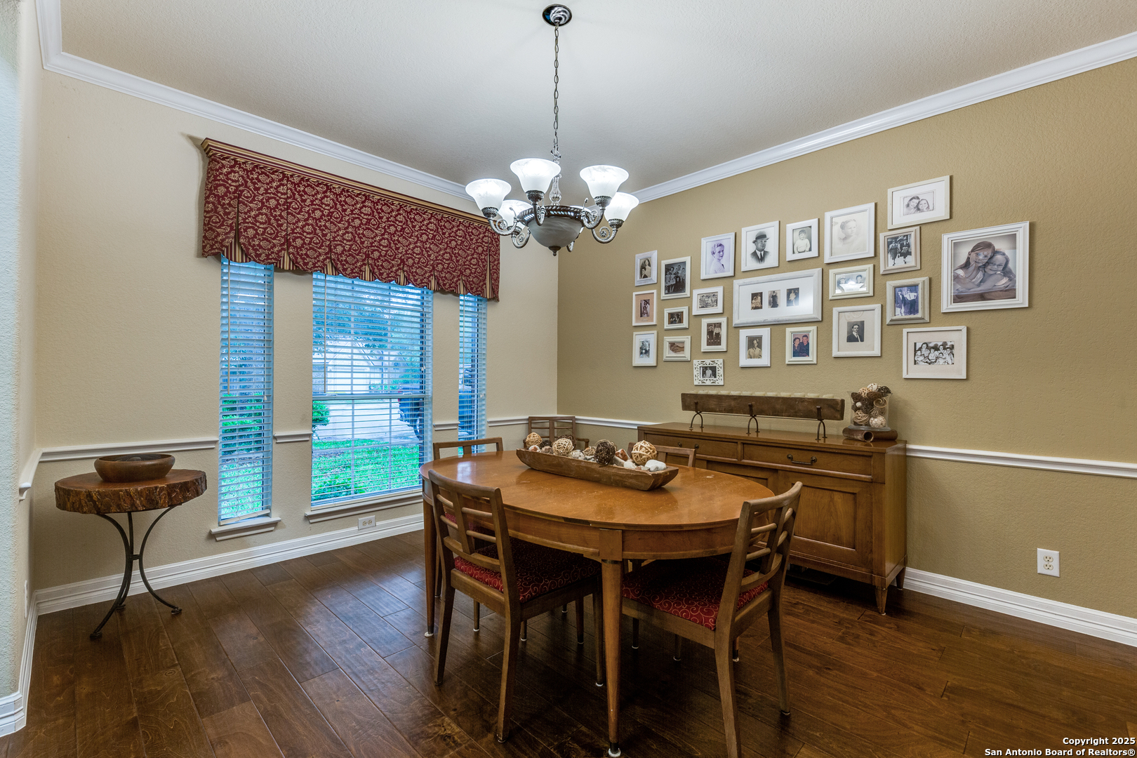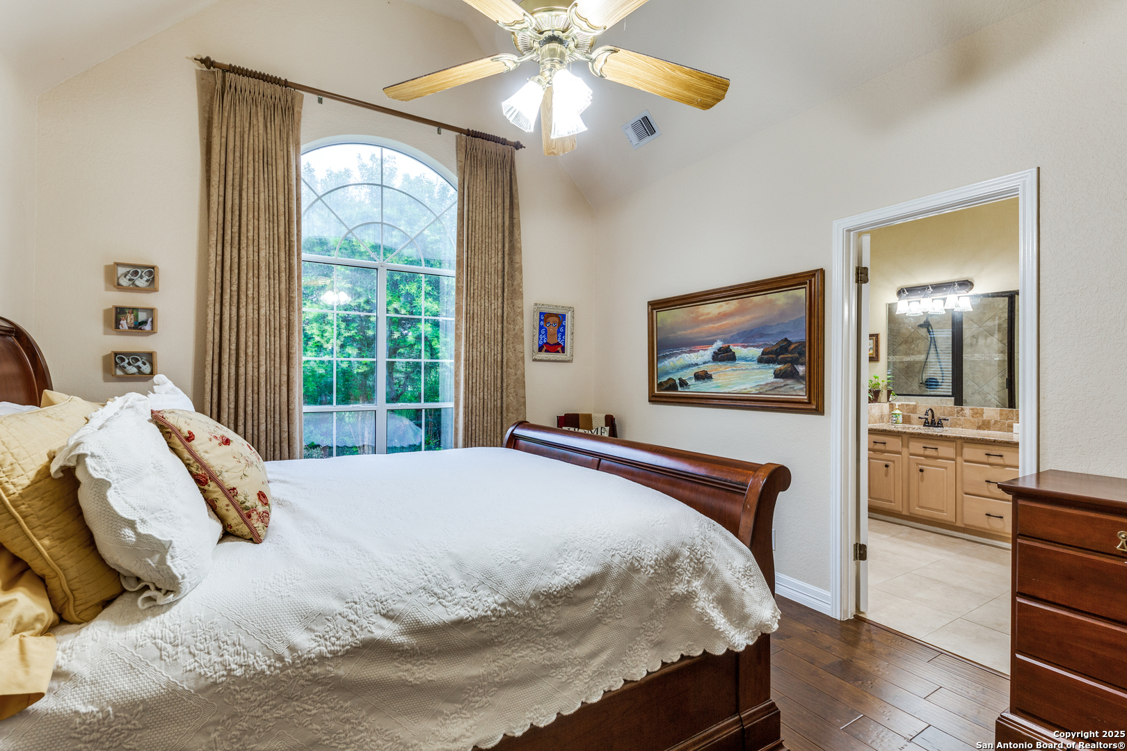 Nestled in the gated community of Cedar Springs in Helotes, this beautiful two-story 2628 sq. ft. home offers 4 bedrooms and 2.5 baths on a greenbelt lot. The spacious layout includes a formal dining room, a dedicated office, and a generous family room with stone fireplace-perfect for entertaining. The kitchen features granite countertops and overlooks the main living space with rich hardwood flooring. The primary bedroom is conveniently located downstairs and boasts a stunning remodeled en-suite bath with updated shower, tub, countertops, tile, and fixtures. Upstairs, you'll find three large bedrooms and a full bathroom. One of the bedrooms includes attic access and is already plumbed for a potential additional bathroom. The fenced backyard provides a serene retreat, with the lot extending to the creek bed for added privacy and space. Enjoy the fantastic neighborhood amenities, including a pool, tennis courts, clubhouse, and a park/playground. Located just minutes from H-E-B, Home Depot, and nearby shopping centers, this home combines comfort, convenience, and community. ** swing in backyard does not convey**
