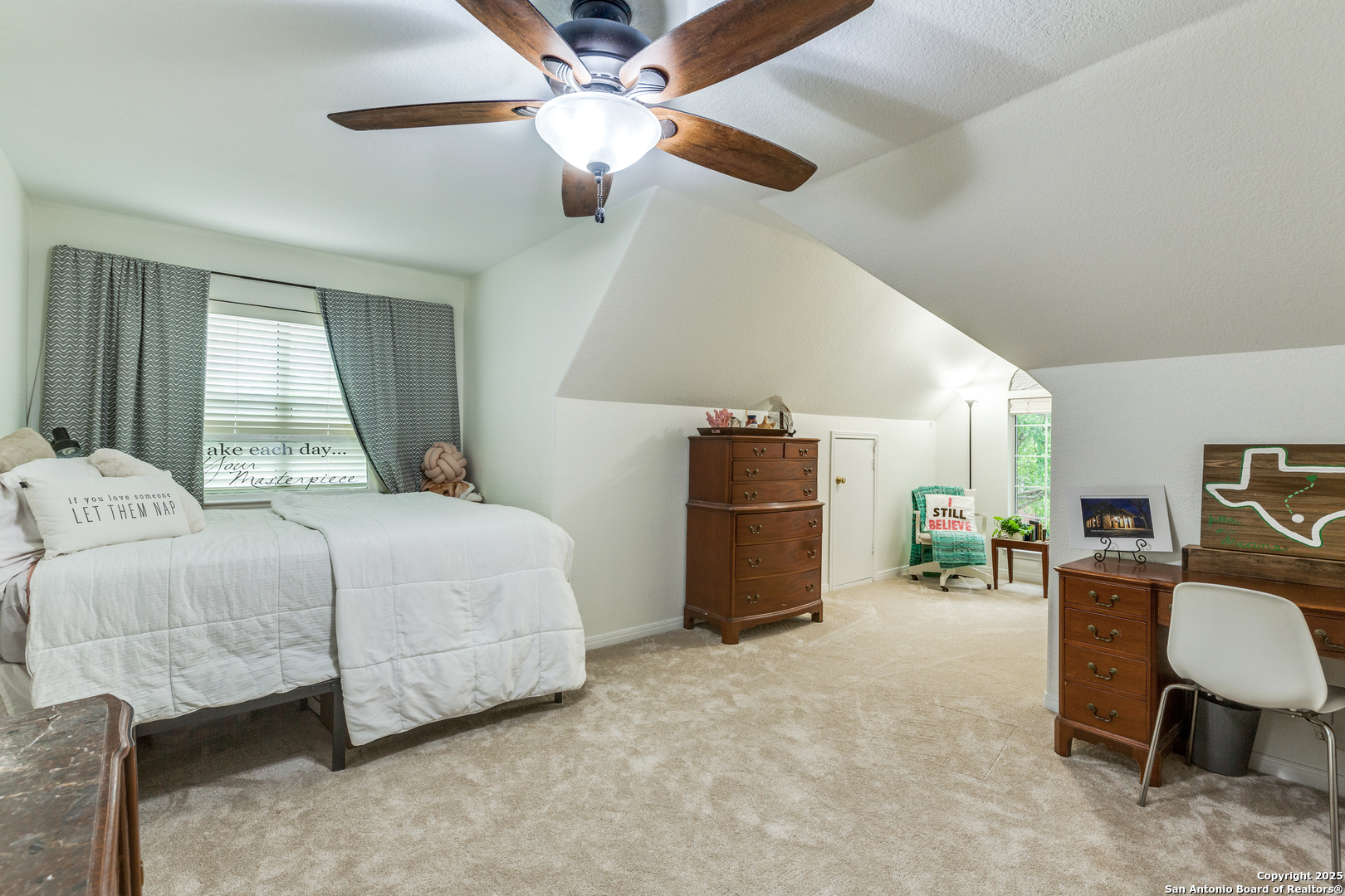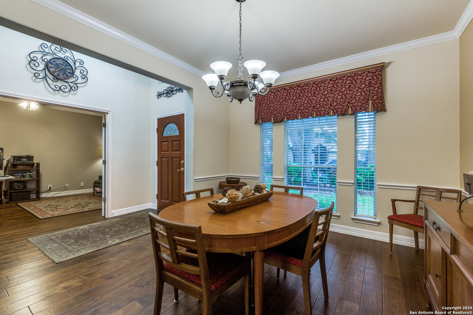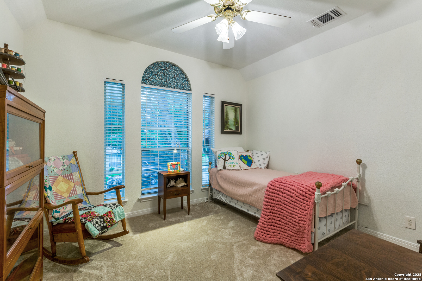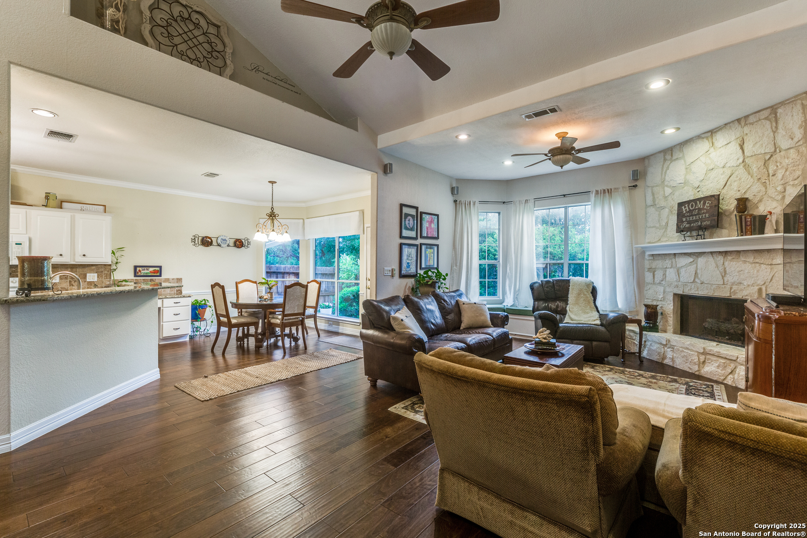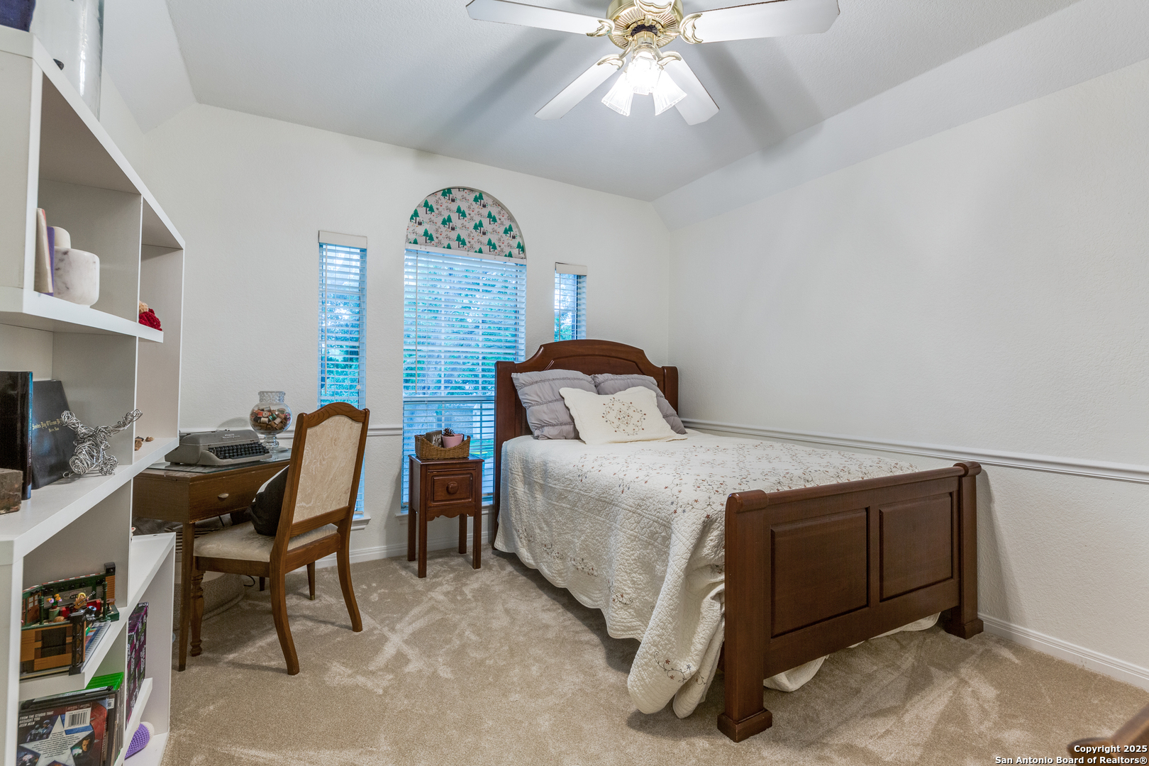 Nestled in the gated community of Cedar Springs in Helotes, this beautiful two-story 2628 sq. ft. home offers 4 bedrooms and 2.5 baths on a greenbelt lot. The spacious layout includes a formal dining room, a dedicated office, and a generous family room with stone fireplace-perfect for entertaining. The kitchen features granite countertops and overlooks the main living space with rich hardwood flooring. The primary bedroom is conveniently located downstairs and boasts a stunning remodeled en-suite bath with updated shower, tub, countertops, tile, and fixtures. Upstairs, you'll find three large bedrooms and a full bathroom. One of the bedrooms includes attic access and is already plumbed for a potential additional bathroom. The fenced backyard provides a serene retreat, with the lot extending to the creek bed for added privacy and space. Enjoy the fantastic neighborhood amenities, including a pool, tennis courts, clubhouse, and a park/playground. Located just minutes from H-E-B, Home Depot, and nearby shopping centers, this home combines comfort, convenience, and community. ** swing in backyard does not convey**