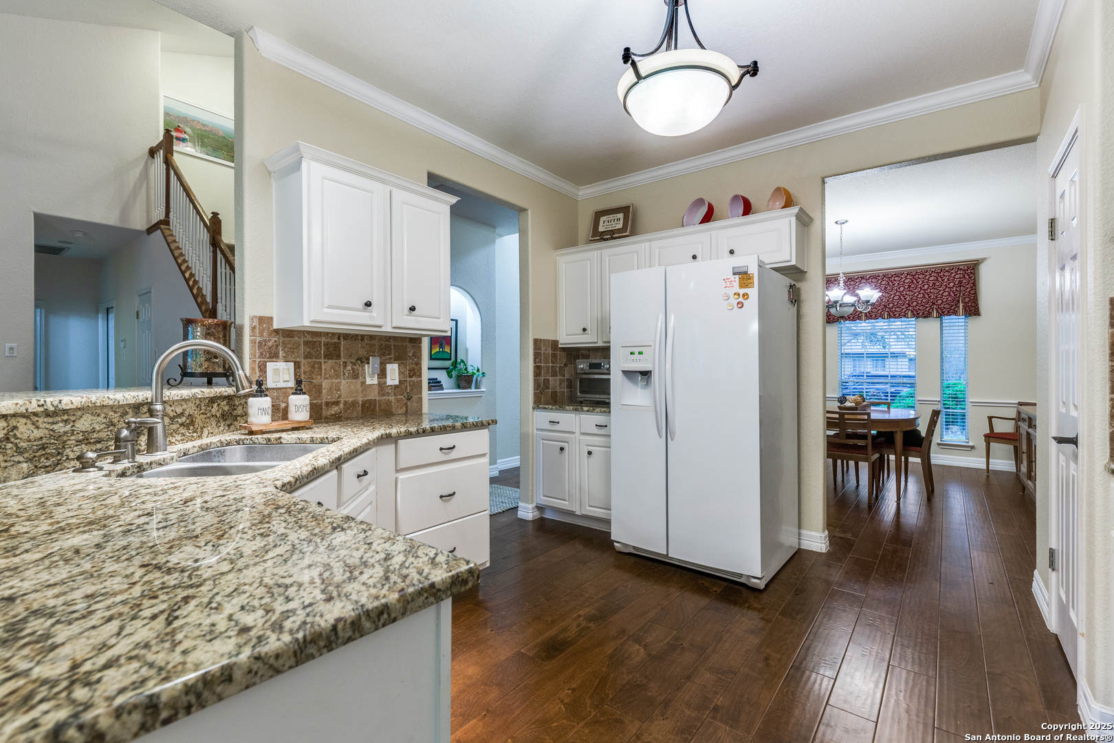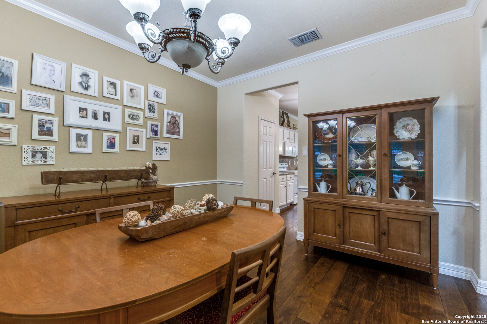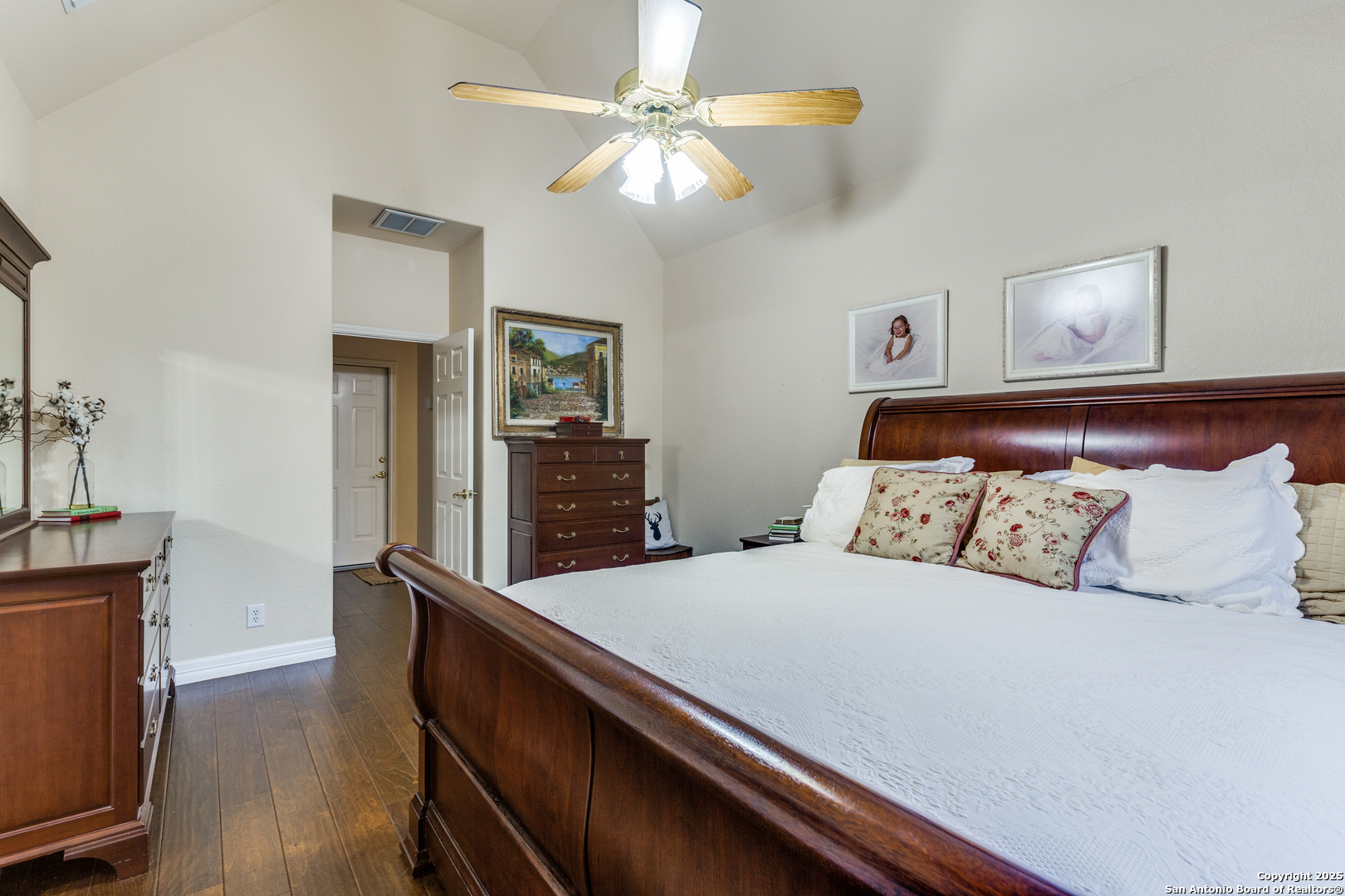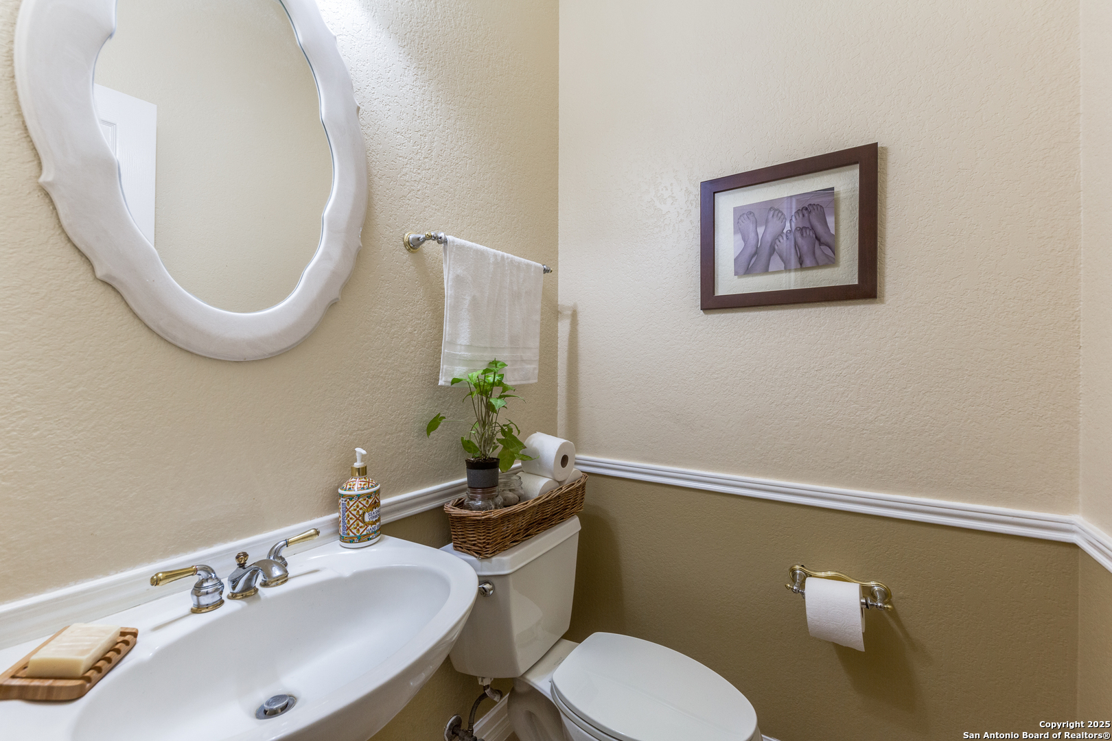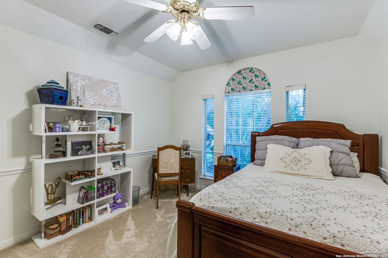 Nestled in the gated community of Cedar Springs in Helotes, this beautiful two-story 2628 sq. ft. home offers 4 bedrooms and 2.5 baths on a greenbelt lot. The spacious layout includes a formal dining room, a dedicated office, and a generous family room with stone fireplace-perfect for entertaining. The kitchen features granite countertops and overlooks the main living space with rich hardwood flooring. The primary bedroom is conveniently located downstairs and boasts a stunning remodeled en-suite bath with updated shower, tub, countertops, tile, and fixtures. Upstairs, you'll find three large bedrooms and a full bathroom. One of the bedrooms includes attic access and is already plumbed for a potential additional bathroom. The fenced backyard provides a serene retreat, with the lot extending to the creek bed for added privacy and space. Enjoy the fantastic neighborhood amenities, including a pool, tennis courts, clubhouse, and a park/playground. Located just minutes from H-E-B, Home Depot, and nearby shopping centers, this home combines comfort, convenience, and community. ** swing in backyard does not convey**