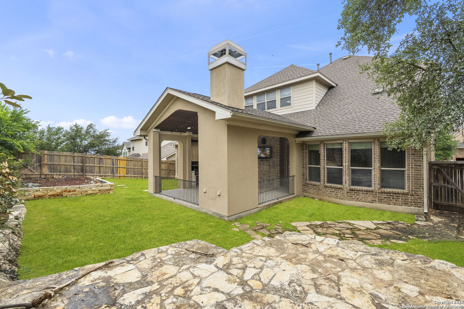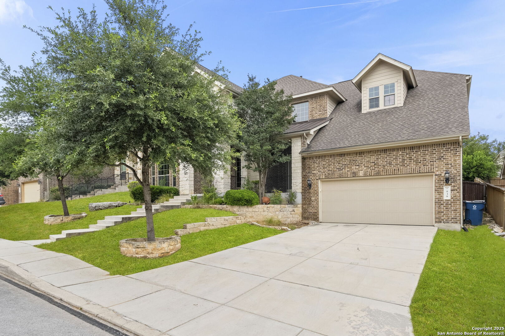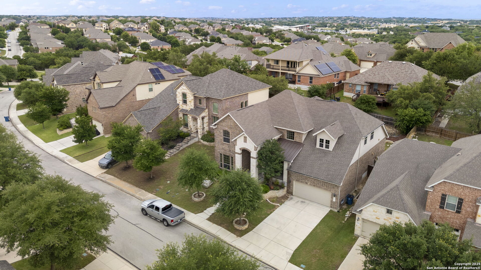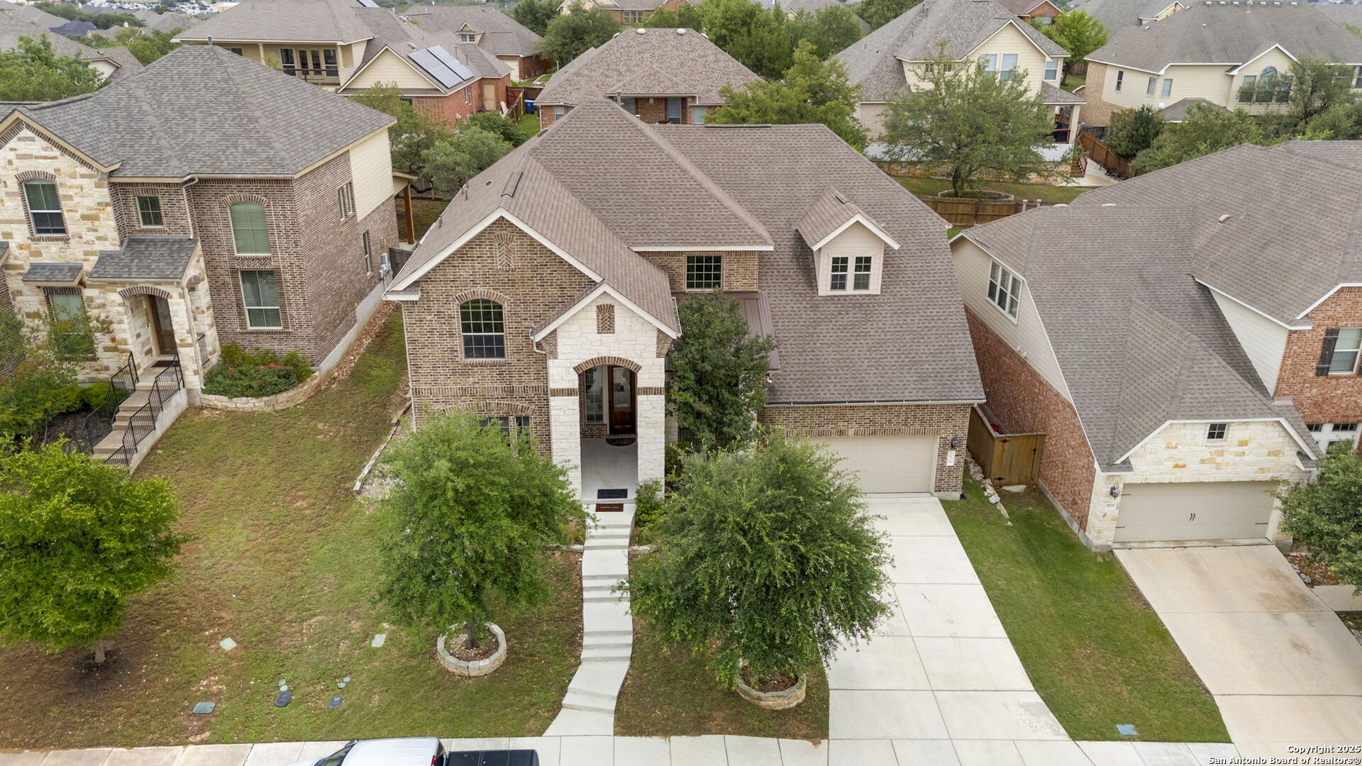Stunning executive home in the prestigious gated community of Terra Bella! This spacious 4-bed, 3.5-bath residence offers over 4,000 sq. ft. of luxurious living space with a grand two-story entry, Juliet balconies, and an elegant stone/brick exterior. Enjoy a chef's kitchen featuring granite countertops, built-in stainless steel appliances, gas cooking, large island, and upgraded cabinetry with crown molding and under-cabinet lighting. The spacious primary suite is located downstairs and includes his-and-hers closets and an upgraded walk-in shower. Upstairs, find a large game room, media room, and two bedrooms with a Jack-and-Jill bath. Another spacious bedroom separate from the others. A dedicated study, formal dining room with courtyard access, and open-concept living areas complete the interior. Outdoor living shines with a 15x19 covered patio with fireplace, sink, stainless steel grill, and cedar ceiling-plus a large 17x14 exterior storage area. Additional features include Elfa shelving in closets, pre-wired surround sound, water softener with reverse osmosis, two fireplaces, high ceilings, and a two-car garage. Located in highly rated NEISD and fantastic neighborhood amenities: pool, clubhouse, park & playground. Welcome home!