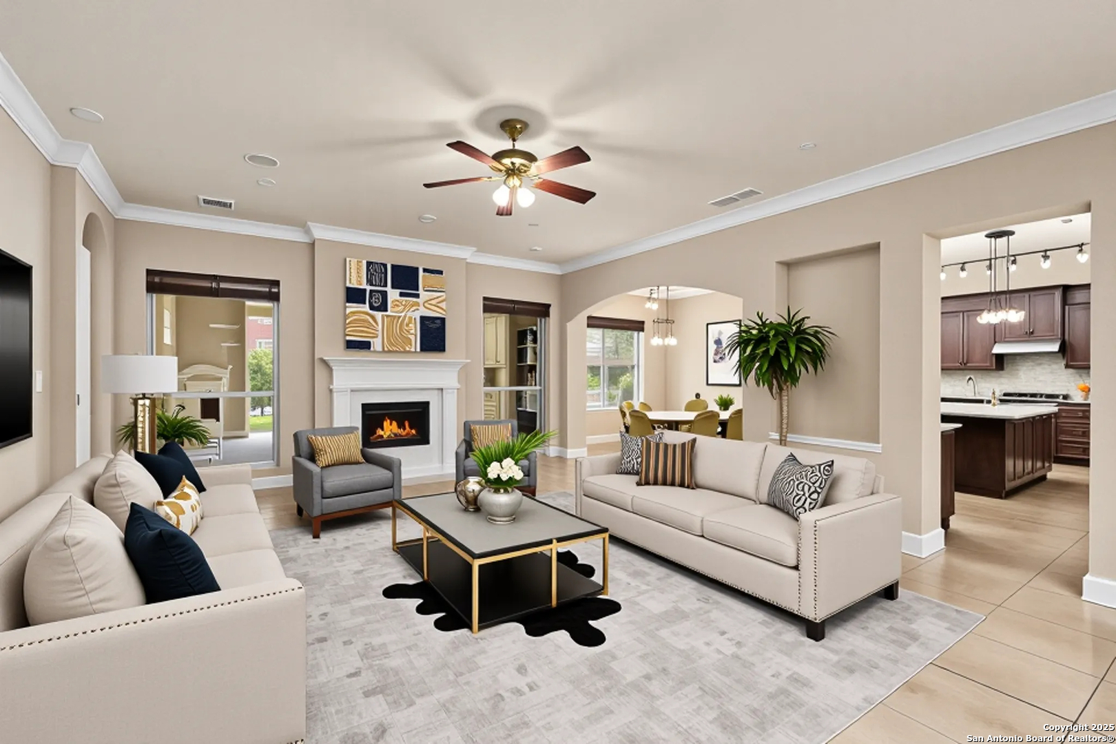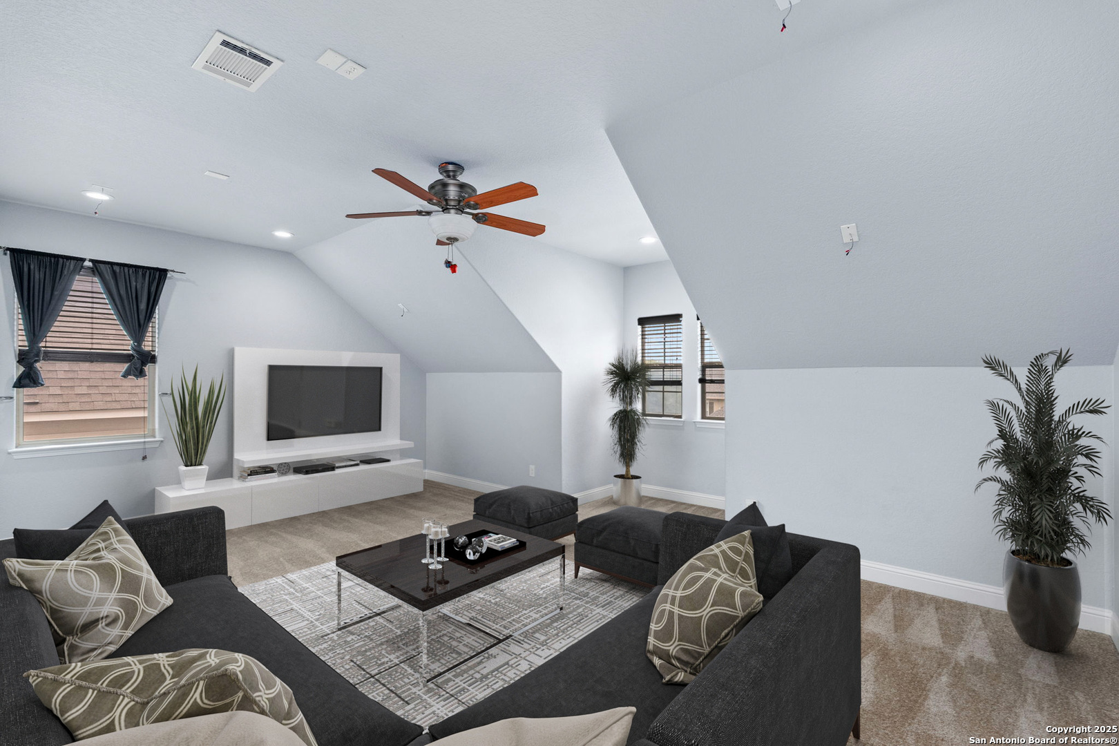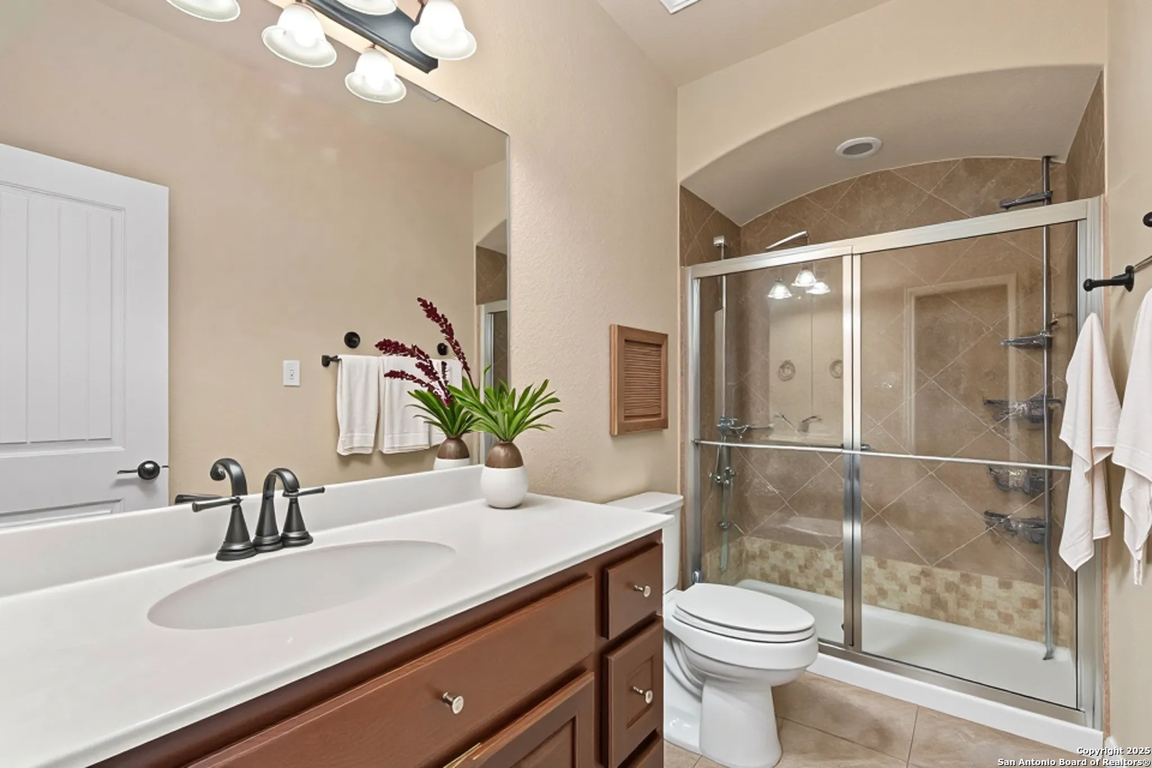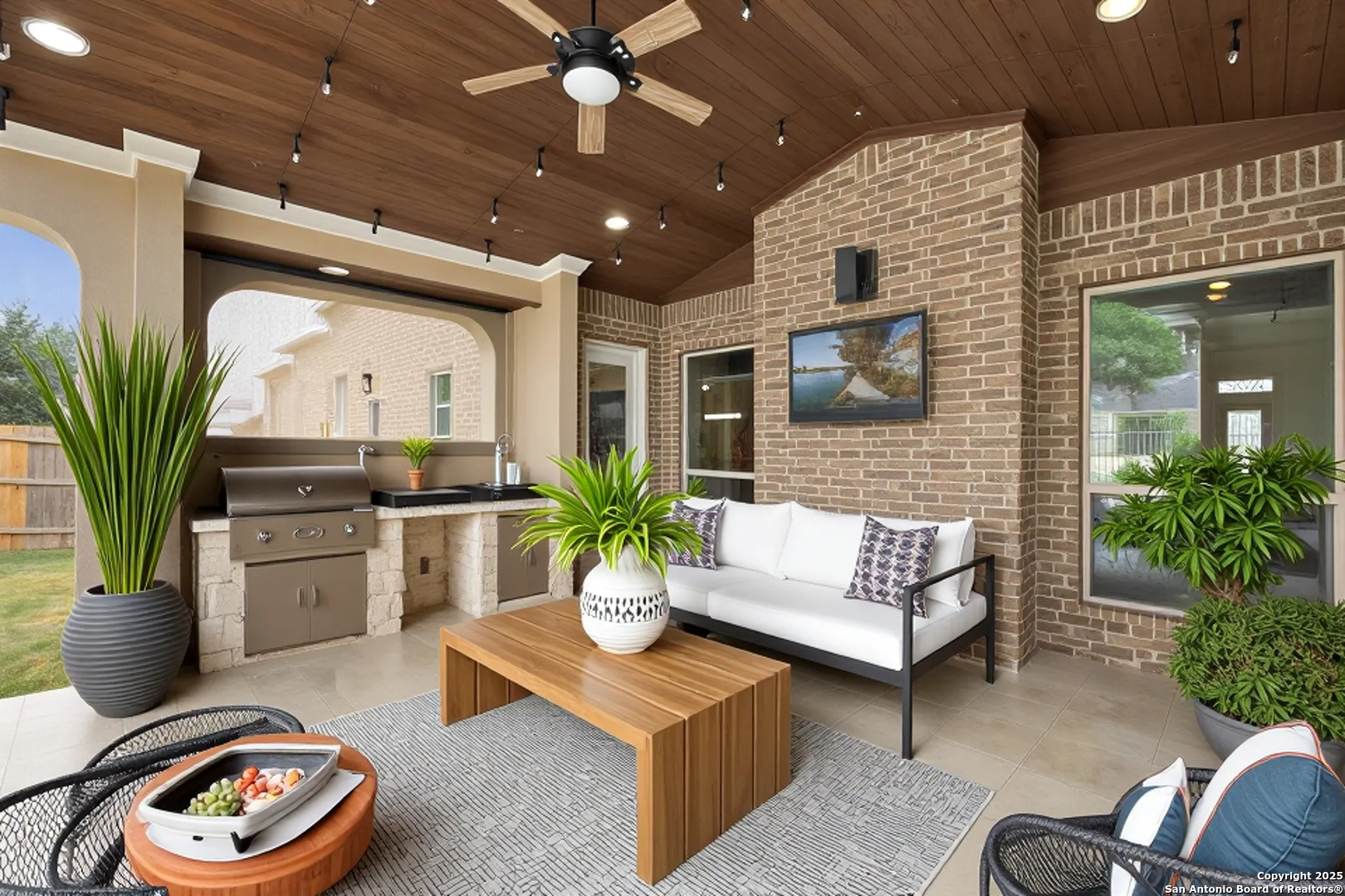 Stunning executive home in the prestigious gated community of Terra Bella! This spacious 4-bed, 3.5-bath residence offers over 4,000 sq. ft. of luxurious living space with a grand two-story entry, Juliet balconies, and an elegant stone/brick exterior. Enjoy a chef's kitchen featuring granite countertops, built-in stainless steel appliances, gas cooking, large island, and upgraded cabinetry with crown molding and under-cabinet lighting. The spacious primary suite is located downstairs and includes his-and-hers closets and an upgraded walk-in shower. Upstairs, find a large game room, media room, and two bedrooms with a Jack-and-Jill bath. Another spacious bedroom separate from the others. A dedicated study, formal dining room with courtyard access, and open-concept living areas complete the interior. Outdoor living shines with a 15x19 covered patio with fireplace, sink, stainless steel grill, and cedar ceiling-plus a large 17x14 exterior storage area. Additional features include Elfa shelving in closets, pre-wired surround sound, water softener with reverse osmosis, two fireplaces, high ceilings, and a two-car garage. Located in highly rated NEISD and fantastic neighborhood amenities: pool, clubhouse, park & playground. Welcome home!