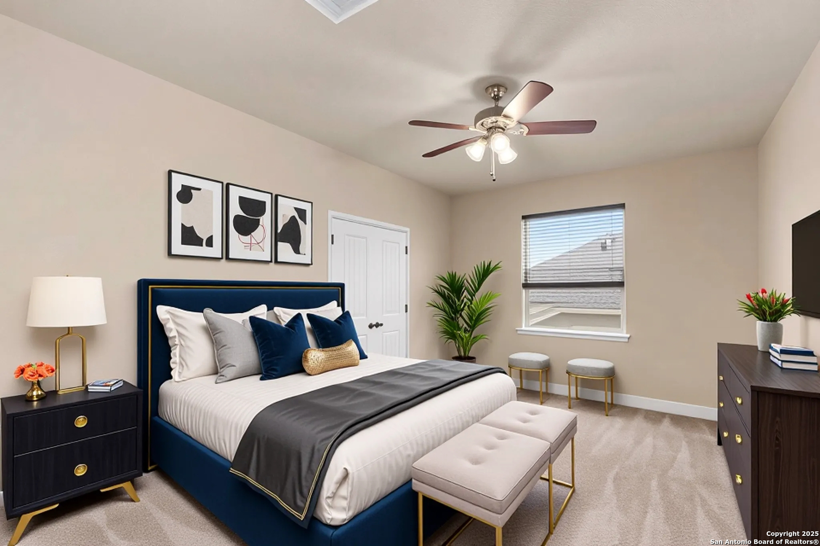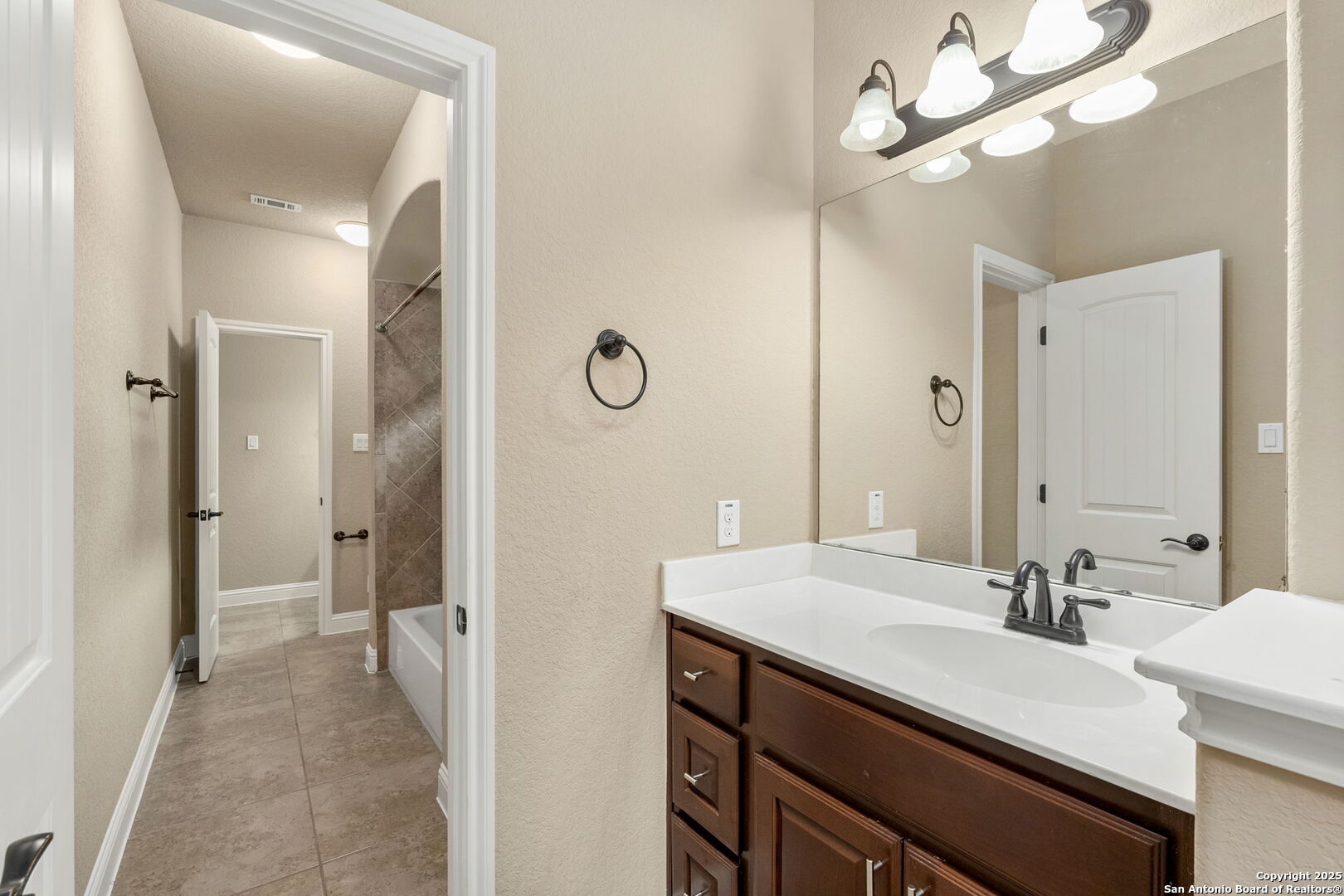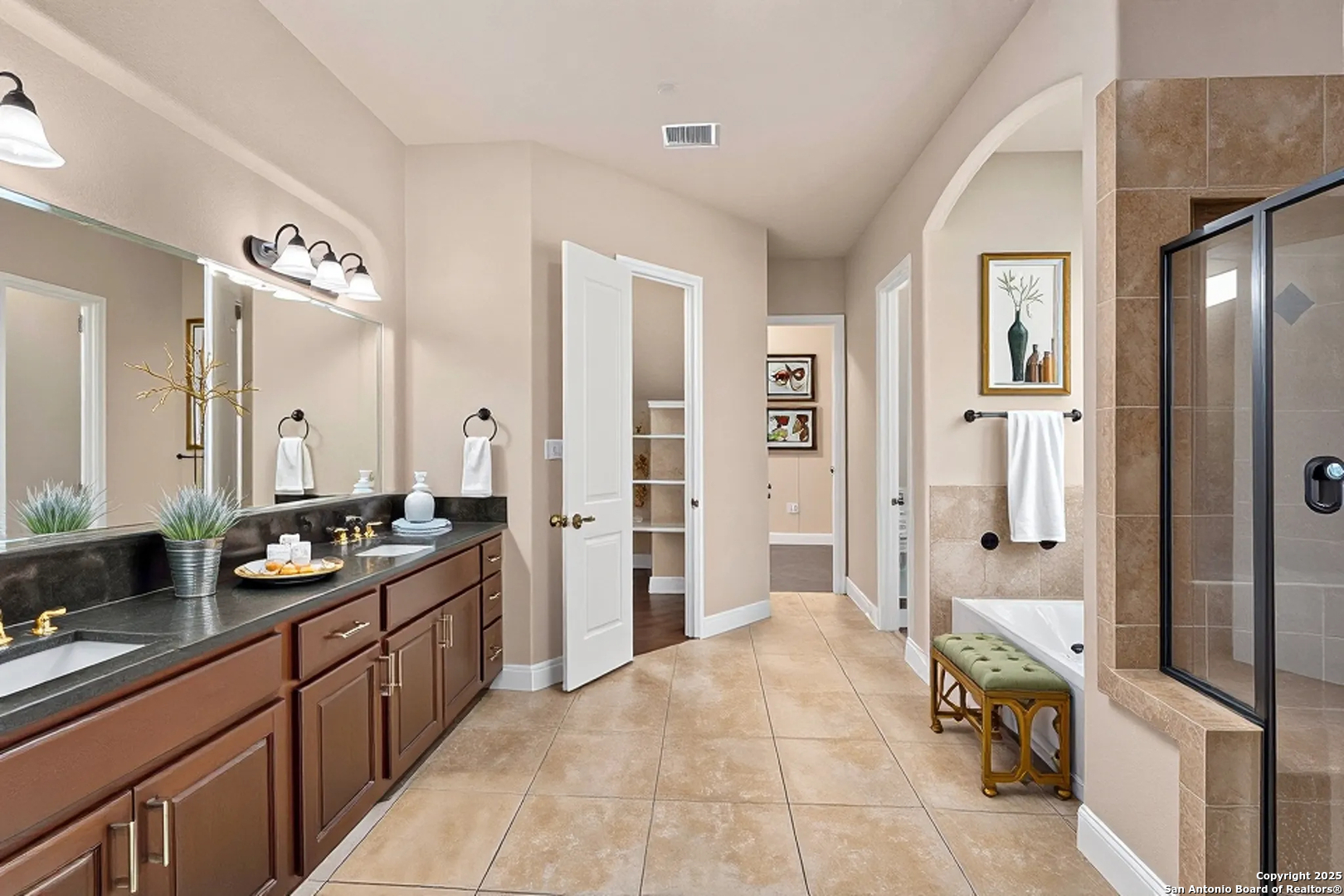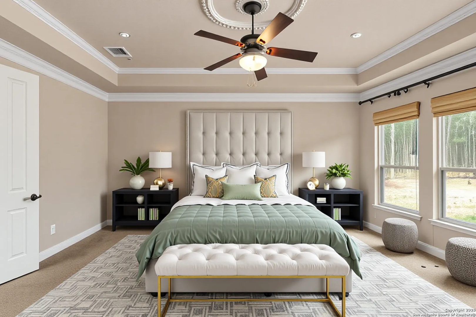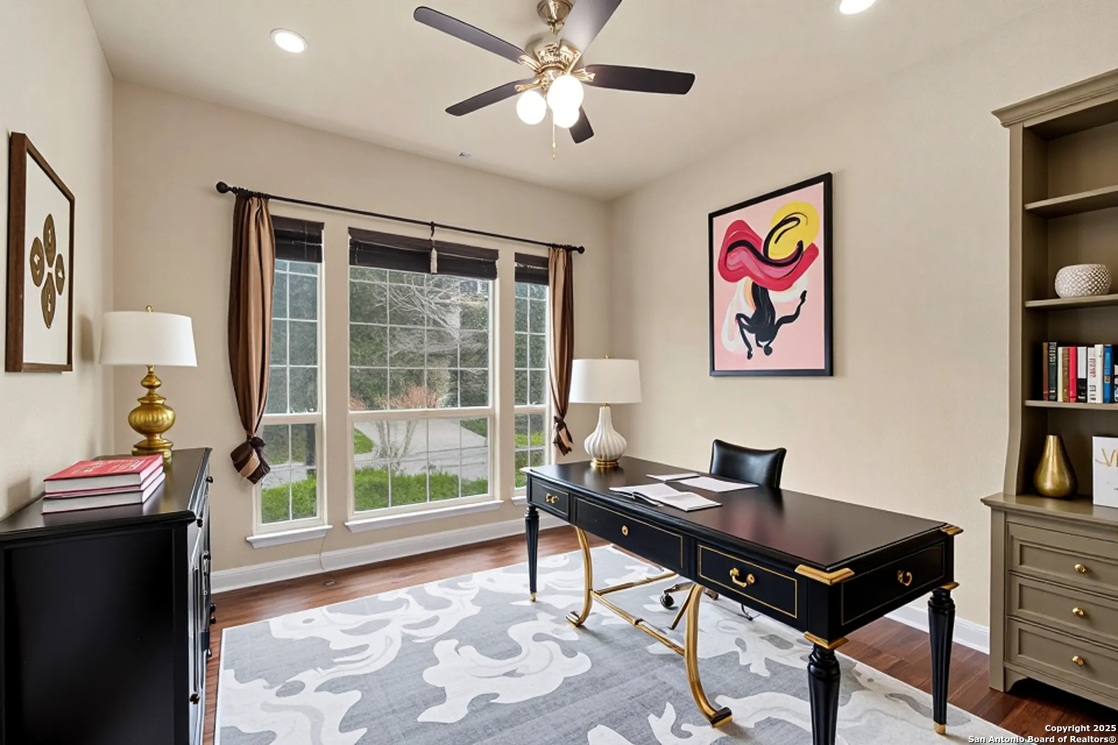 Stunning executive home in the prestigious gated community of Terra Bella! This spacious 4-bed, 3.5-bath residence offers over 4,000 sq. ft. of luxurious living space with a grand two-story entry, Juliet balconies, and an elegant stone/brick exterior. Enjoy a chef's kitchen featuring granite countertops, built-in stainless steel appliances, gas cooking, large island, and upgraded cabinetry with crown molding and under-cabinet lighting. The spacious primary suite is located downstairs and includes his-and-hers closets and an upgraded walk-in shower. Upstairs, find a large game room, media room, and two bedrooms with a Jack-and-Jill bath. Another spacious bedroom separate from the others. A dedicated study, formal dining room with courtyard access, and open-concept living areas complete the interior. Outdoor living shines with a 15x19 covered patio with fireplace, sink, stainless steel grill, and cedar ceiling-plus a large 17x14 exterior storage area. Additional features include Elfa shelving in closets, pre-wired surround sound, water softener with reverse osmosis, two fireplaces, high ceilings, and a two-car garage. Located in highly rated NEISD and fantastic neighborhood amenities: pool, clubhouse, park & playground. Welcome home!