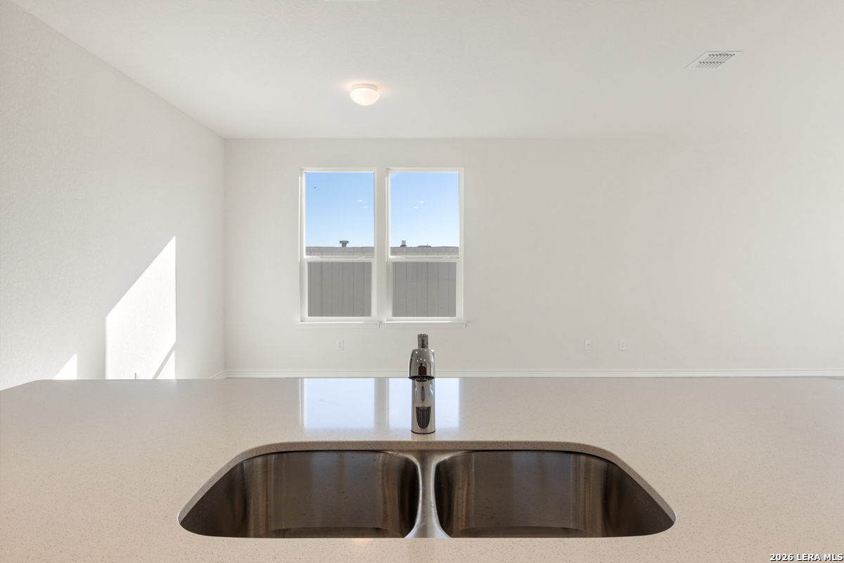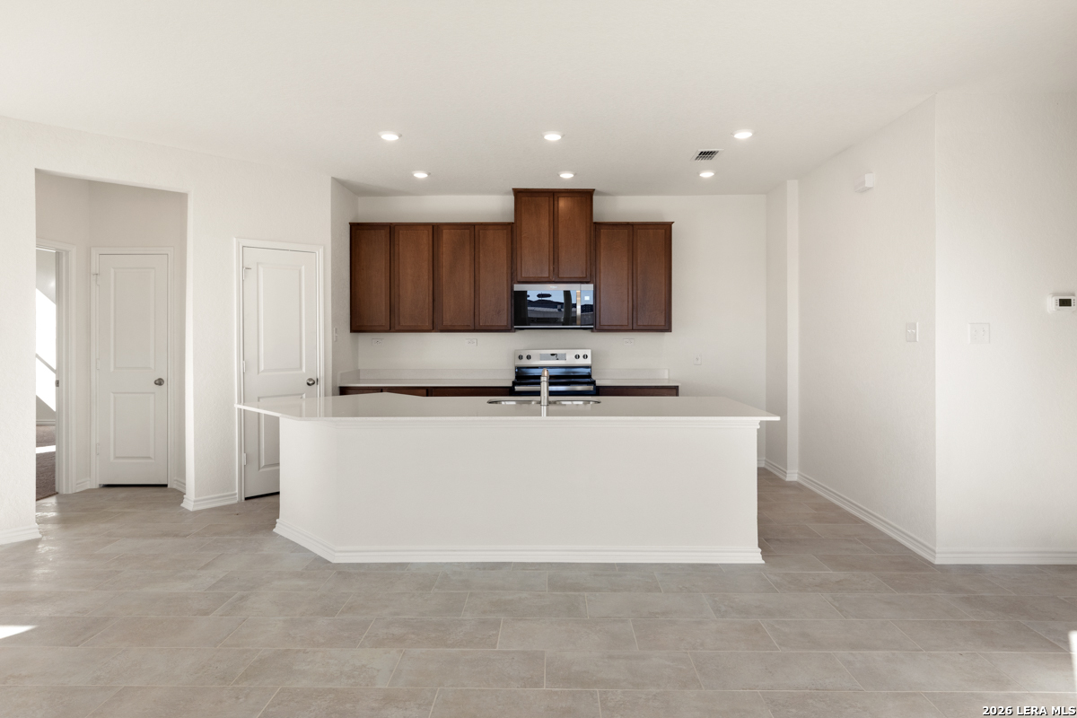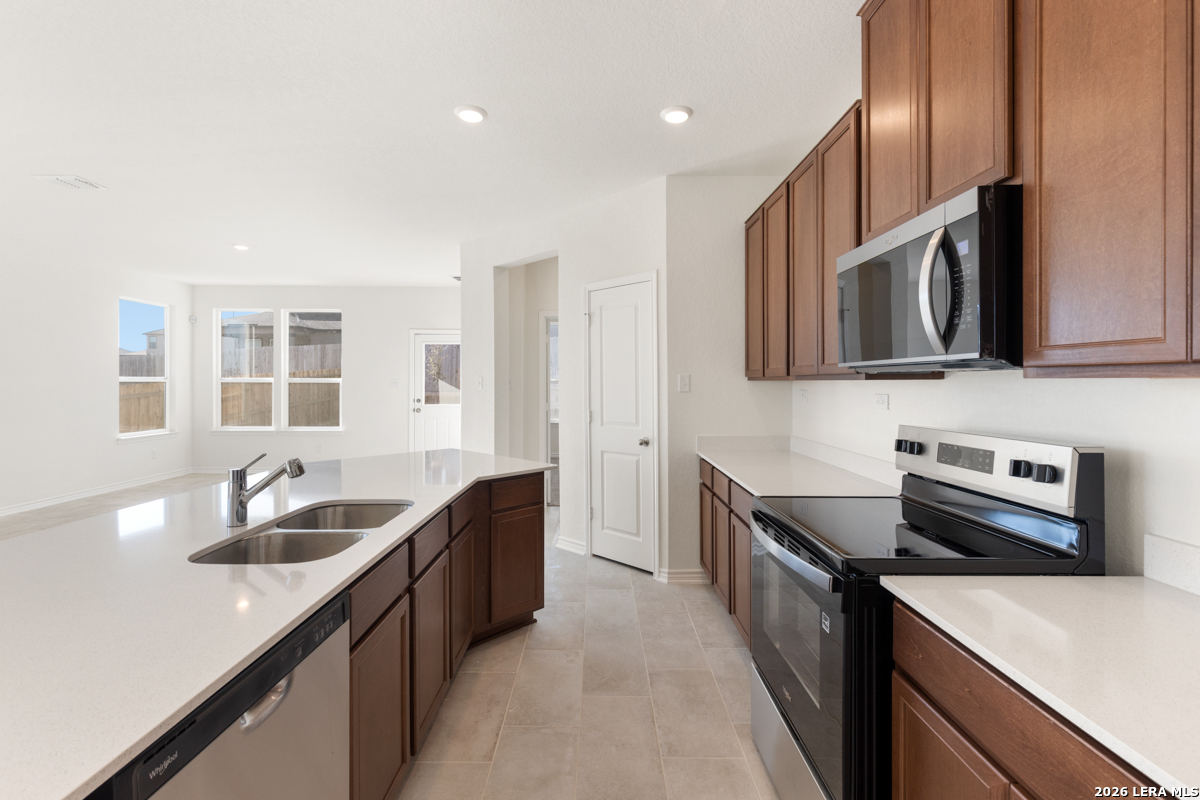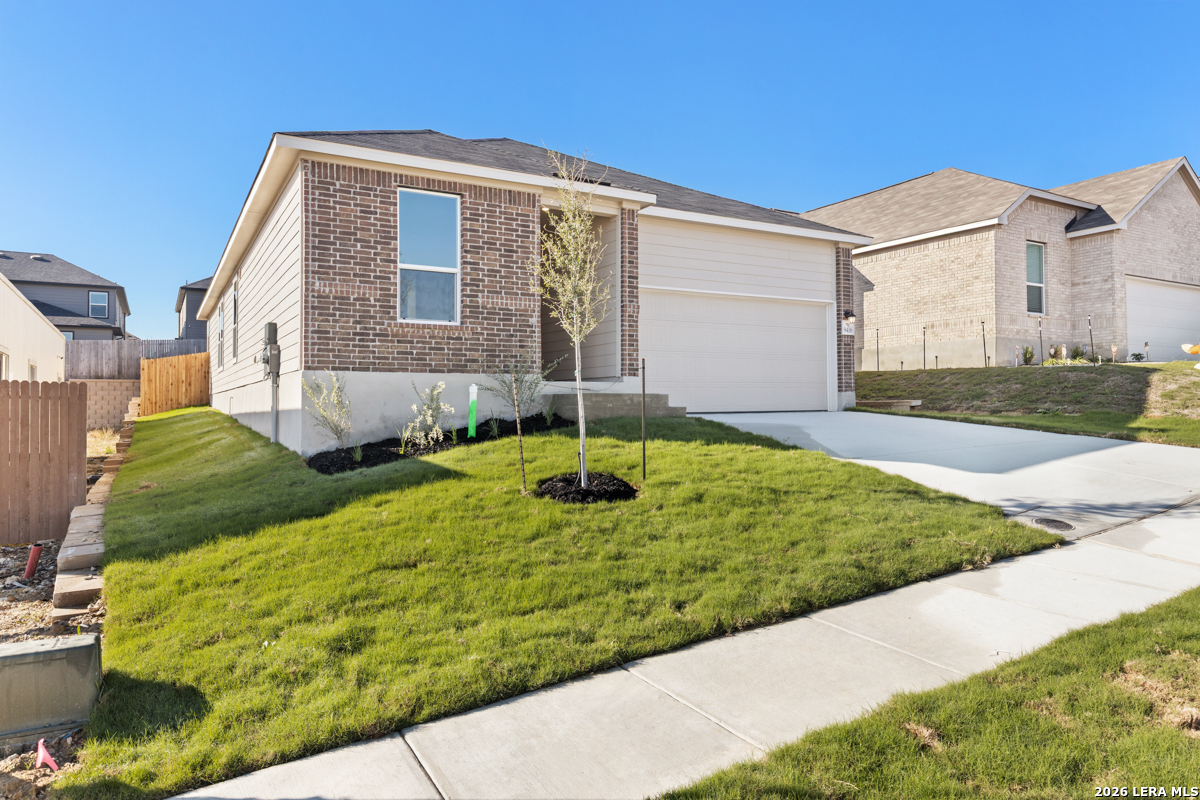 This thoughtfully designed home features 9-ft. ceilings on the first floor, creating a bright and open atmosphere. The modern kitchen includes Whirlpool stainless steel appliances, a Moen faucet, Silestone Blanco Maple countertops, an undermount sink, and an extended breakfast bar for casual dining. The primary bath offers a relaxing 42-in. garden tub and a separate shower with a stylish Daltile tile surround. Finishing touches like Kwikset Polo interior door hardware add a touch of elegance. Enjoy added peace of mind with a wireless security system and outdoor perks like a fully sodded yard and automatic sprinkler system.