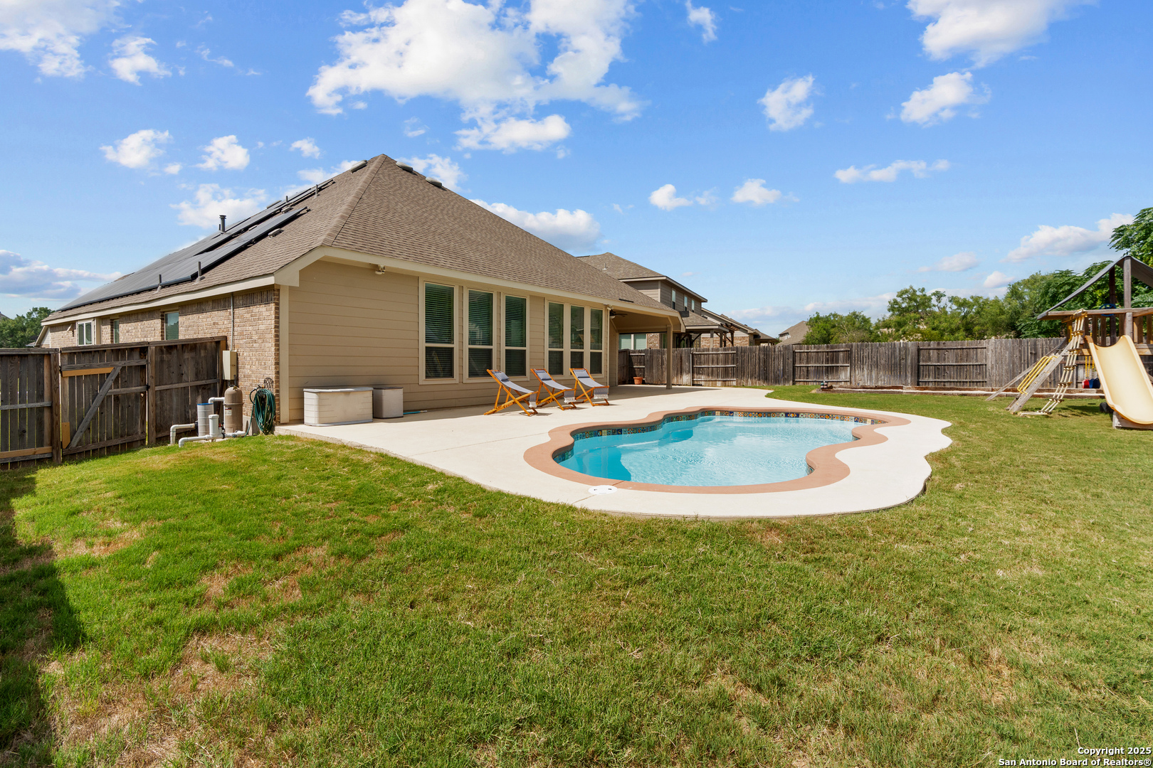 **Up to $5k in concessions available**Encompassing the perfect blend of relaxation, energy-efficiency and practicality, this spacious home nestled on a generous .23-acre lot with a sparkling pool provides it all. As you enter, you're immediately captivated by the high ceilings, natural light and an airy open floor plan. The kitchen is a chef's dream boasting granite counter tops, SS appliances, gas cooking and tons of cabinet & counter top space. Offering 4 bedrooms, 2.5 bathrooms and an office/study, the master suite with dual closets and walk-in shower, creates the ideal retreat. Escape to your private backyard oasis, where you'll find a 14' x 30' Laguna pool, extended patio slab, playground set, bocce ball court & storage shed, making it the perfect outdoor living space. Last but surely not least, benefit greatly from the solar panels, double pane windows, tank-less water heater & Nest thermostat, providing energy-efficiency that's second to none, which makes this home "THE ONE" that is not to be missed!